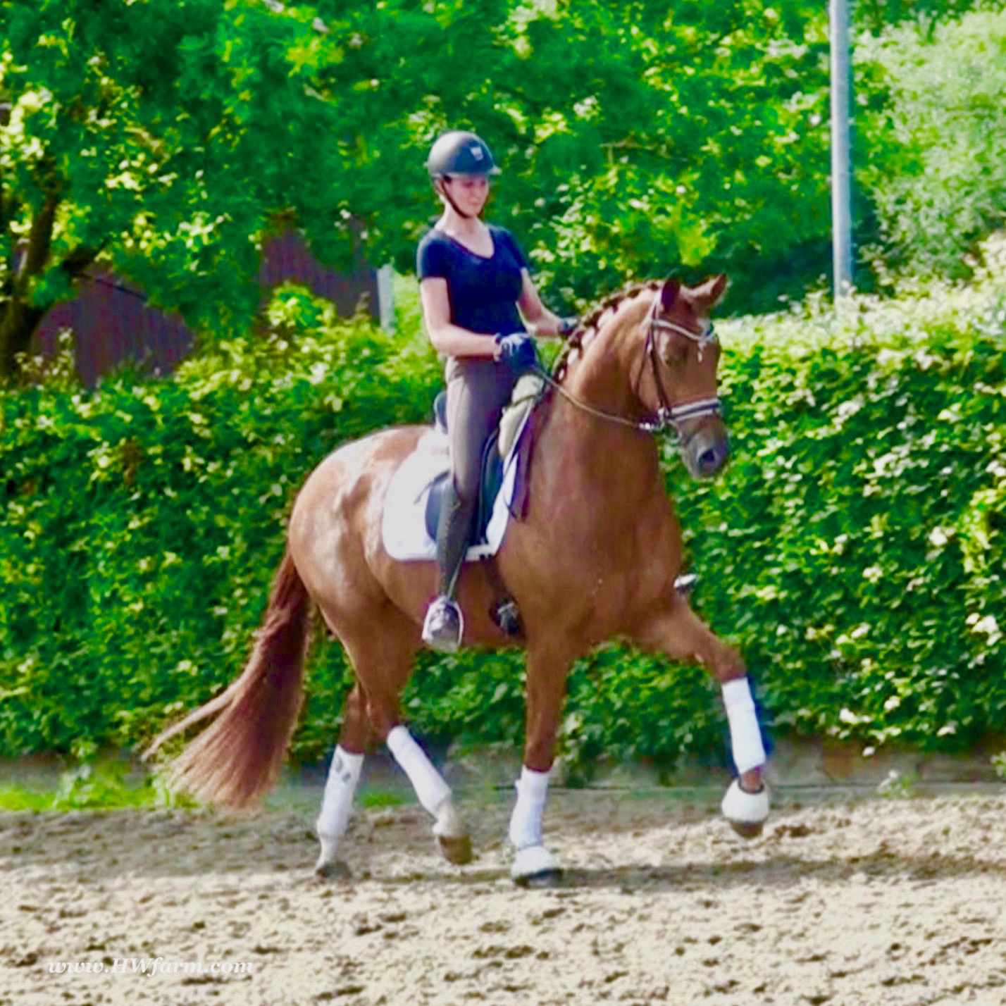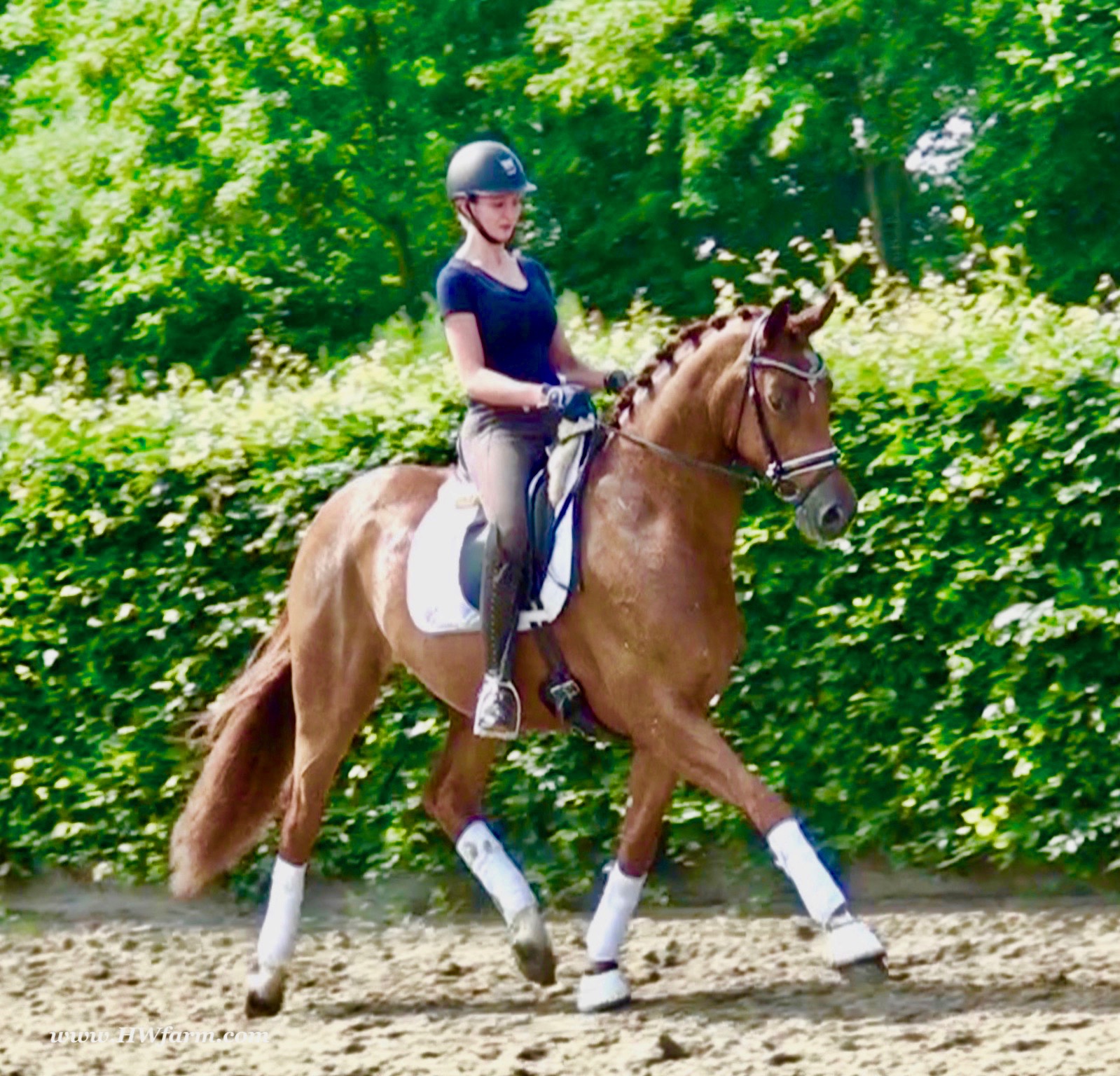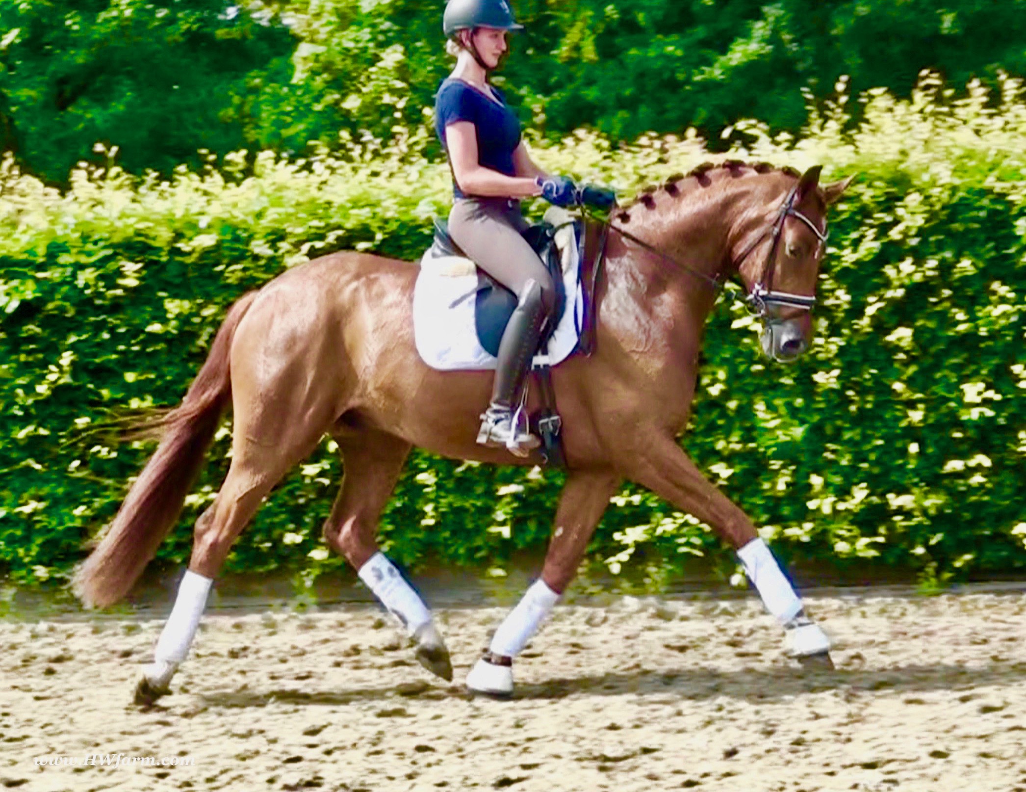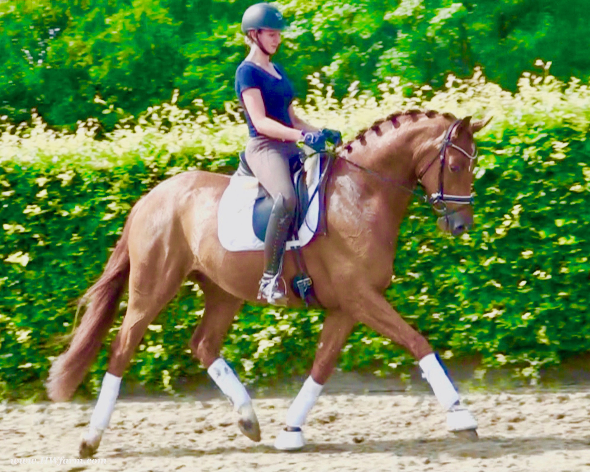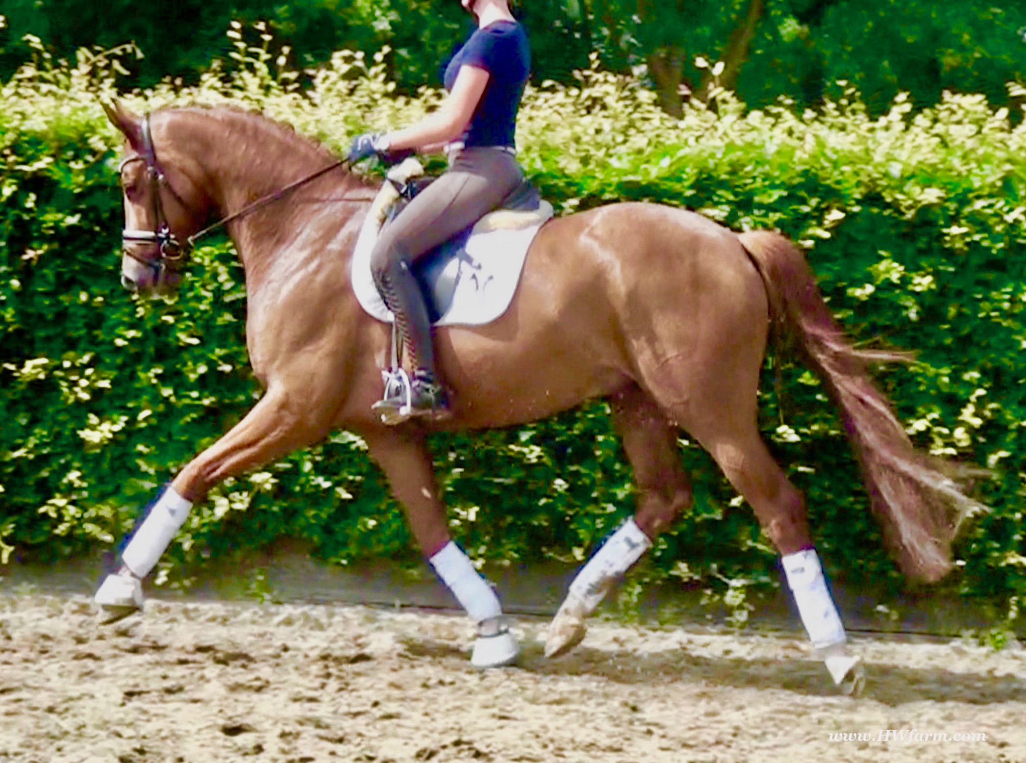 ForFun HW, chestnut Westphalian gelding, by For Romance (Fuerst Romancier / Sir Donnerhall II)/Bundeschampion Dresemann, born in 2014, standing approximately 169 cm or 16.2 hands. ForFun HW is by the famous stallion For Romance - the epitome of a model sire - and from a Voltaire dam line that has been accorded great success. Blessed with three excellent gaits, his canter and trot can only be described with superlatives and his character is also noteworthy. He stood out brilliantly in the strong lot of stallions at the 2011 Oldenburg Verband licensing and the enthusiastic spectators in Vechta gave him standing ovations. As expected, For Romance passed his 30-day test in Schlieckau with super scores. He received a 9.25 for his trot and rideability, a 9.0 for his canter and an 8.88 for character. In the third generation of his pedigree you find Don Schufro who took the Danish Champion title and won team bronze at the 2008 Olympic Games in Hong Kong under Andreas Helgstrand/DEN. He is also the sire of many champions. For Romance's dam line goes back to Voltaire, a Furioso II son who was well-known in breeding and sport the world over. This line is also the origin of the licensed stallions Dusty, Furinos and Platino as well as many international sport horses that were highly successful in show jumping as well as dressage. His sire, Fürst Romancier, was licensed in 2007 and made headlines just two years later when he took fourth place in the World Championships for young dressage horses in the class for five year olds and also fourth place at the Bundeschampionate in Warendorf. Matthias Alexander Rath has taken over Fürst Romancier's training, in 2012. For Romance's full sister Fasine took the Oldenburg Champion Mare title - a feat that is so far unique in the history of the Oldenburg Verband. The dam's sire, Sir Donnerhall I, gained trademark status early on in his career. He was the 2nd Reserve Champion at his licensing, State Champion, the record-breaking winner of his stallion performance test, Vice World Champion of young dressage horses and Bundeschampion as well as the main premium winner of stallions with emphasis on dressage. More than 50 of his sons have been licensed. In 2010, three of his progeny took Vice Bundeschampion titles in Warendorf: Silbermond - the NRW Champion Stallion, Appassionata and the licensed Snap Shot. He has also siree numerous top auction horses. Dresemann is ForFun HW's dam sire, a pitch black dance master, with fascinating in and exterior. He won the Bundeschampionate with the highest points (four 10's) ever given by judges at that show. An elegant gentleman, with an near unmatched movement. His bloodlines combine the famous Donnerhall and Weltmeyer lines, the most influential and important genes of the presence. The black sire Daidalos was Landesridinghorse Champion in Hanover/Bremen. He was successful in Dressage classes, winning under Heiner Schiergen all the way to the Bundeschampionat. Dresemann was the sensation at the Bundeschampionat 2002: Dresemann, under Elisabeth Niehues-Rembeck, a sight that will be unforgettable. He qualified already with the highest scores of 8.8 and it was obvious, that he would be in the finale. This dream in black, got the highest scores ever given out at the Bundeschamiopnat by the guest riders and was totally the sensation of the year: - Trot 10,0 - Canter 10,0 - Walk 8,5 - Conformation 9,5 - Overall Impression 9,5 - Guest Rider I 10,0 - Guest Rider II 10,0 After this perfect performance, he was named Bundeschampion of the 3 year old riding horse stallions, with a total of 67.5, followed by 2nd place with 63. What an obvious victory that was. His dam St. Pr. St. Whitney had a stellar mare performance test. Dam sire Wolkenstein II was the Bundeschampion and stallion performance test winner. His breeding index is the most successful of all Weltmeyer sons. The picture per-fect beautiful black Dresemann in third Generation was educated up to Grand Prix and a very highly sought after stallion in Celle as well as in France. The grand dam Gina is a sister to the famous Dillenburg stallion Grafenberg. Via Grenadier, Lugano I, Wöhler, Poet xx, Jason ox, he has the best genes you could be looking for. Keuring in NRW December Münster Handorf. This stellar stallion came in with a score of 8.33 as 3rd place out of 33 participants. His ride ability, trot and canter, were 1st place, no doubt. In the year 2003, he was victorious in many dressage horse classes. In 2004, Dresemann participated at the world young horse championships in Verden as well as being in the finale of the Bundeschampionat 5 year olds. In 2005 as well, Dreseman was able to continue his successful career, finale of the world championships of the young dressage horses in Verden as well as finale of the Bundeschampionships for 6 year old dressage horses. Dreseman then was highly placed all the way up to dressage horse classes Intermediare I. In 2007, his breeding index of 160 was one of the best in the riding horse books. In the meantime he was trained all the way to Grand Prix, there is no limit to what this horse can do. ForFun HW himself, is a stunning horse has all the personality a person could ever hope for, he's easy to ride and handle, no wonder with these bloodlines!!! ForFun HW is already at second level, with fluent counter canter and the flying changes will be easy for him. This boy is far advanced in his training and he shows super nice extensions and airtime. Check out his amazing hind leg, reaching far under his body and lifting it up in the air with ease. He just glides and barely touches the ground. Ridden inside and outside, always giving 100%, no matter what he's asked to do. He loves to please his handler and rider, to learn new things is his hobby. This sweet boy, enjoys to work eagerly under saddle. All concentrated on his job in the dressage arena and with his quick hind leg, passage and piaffe will come naturally to him. ForFun HW is supple and