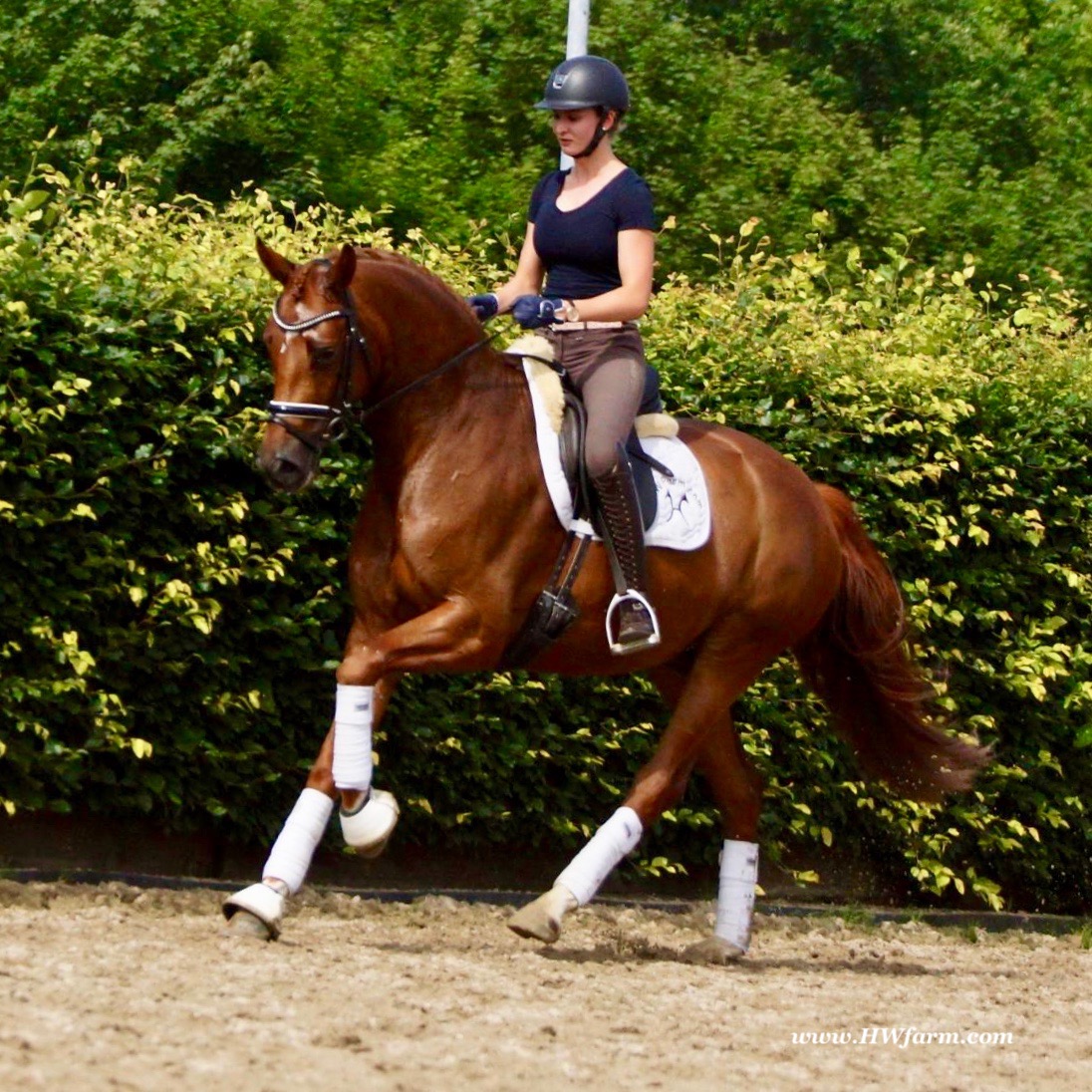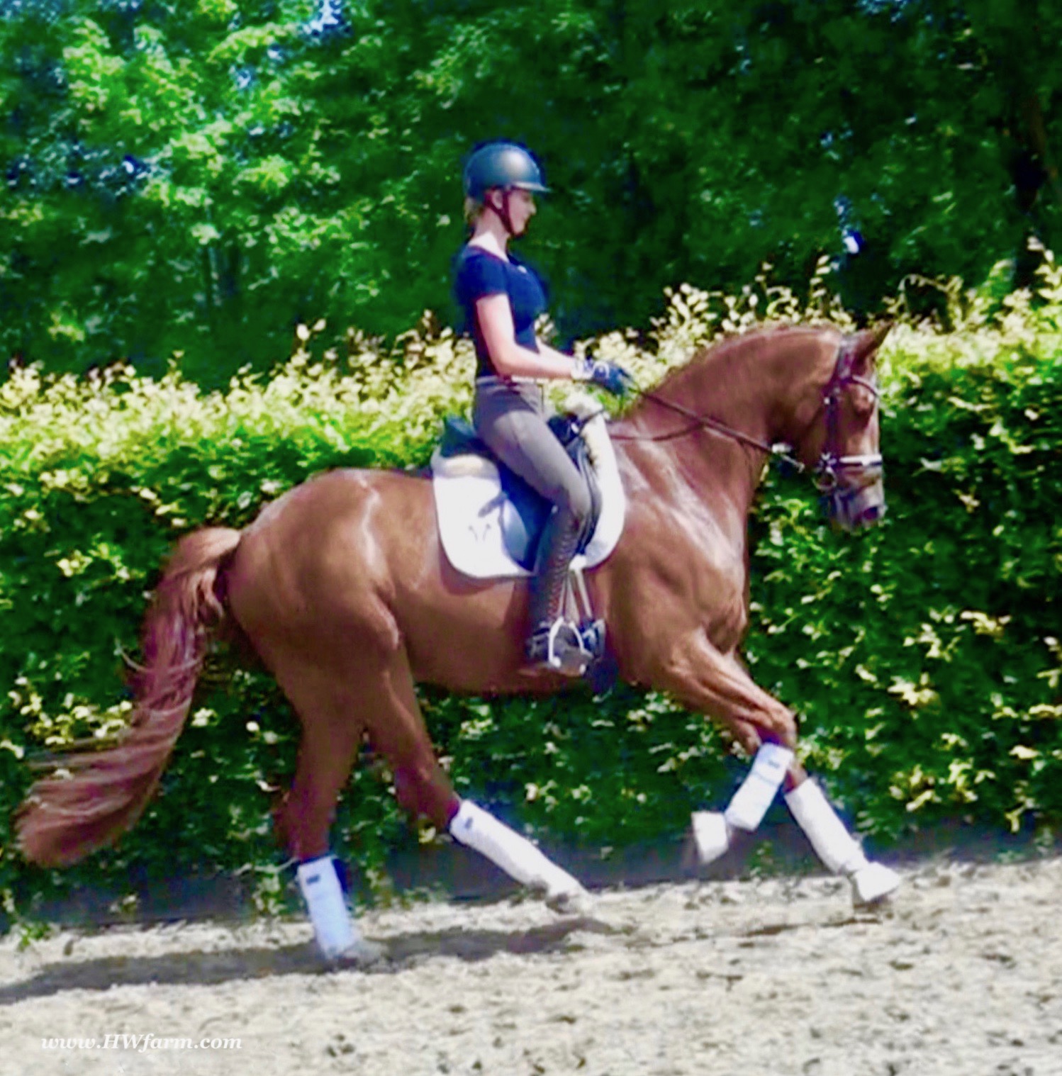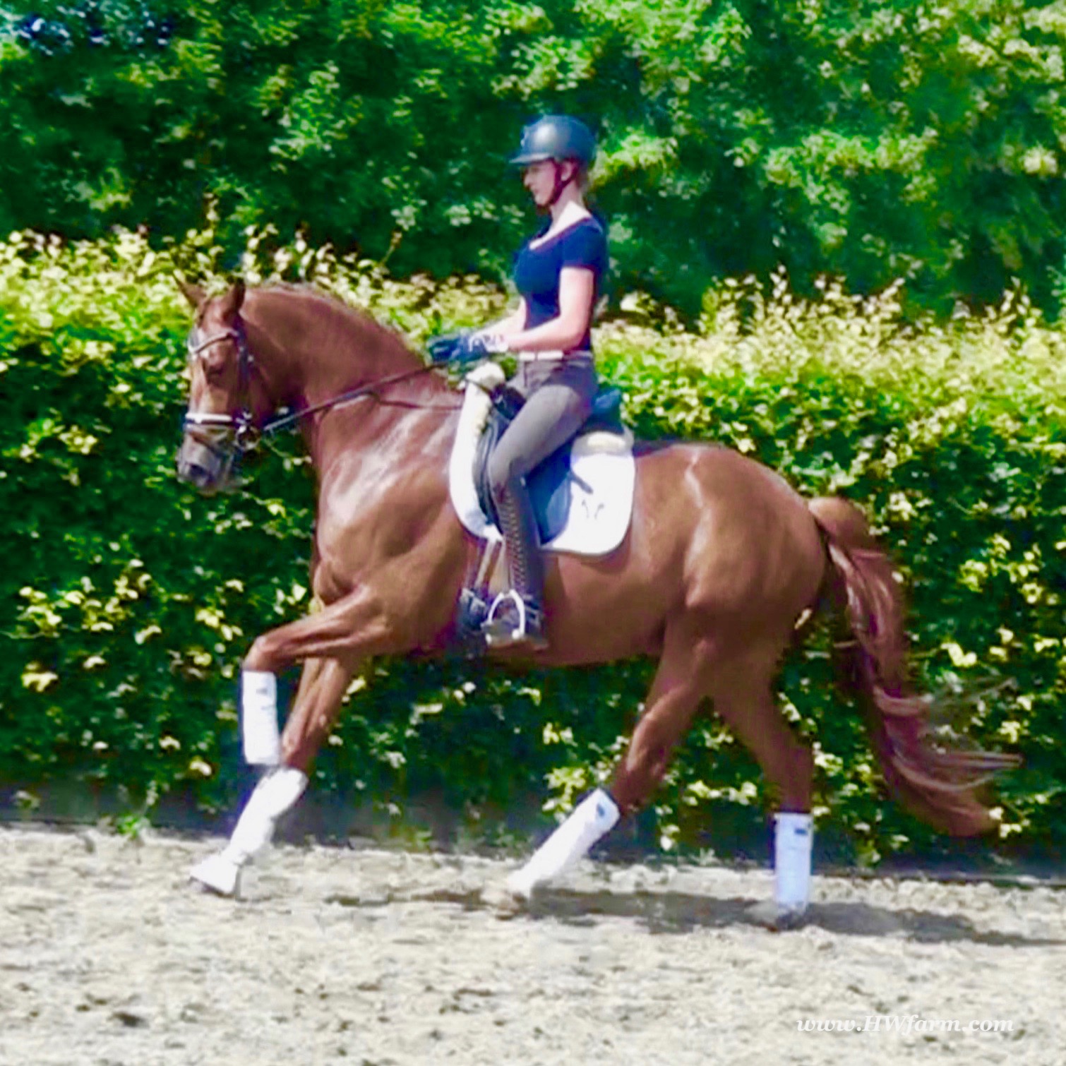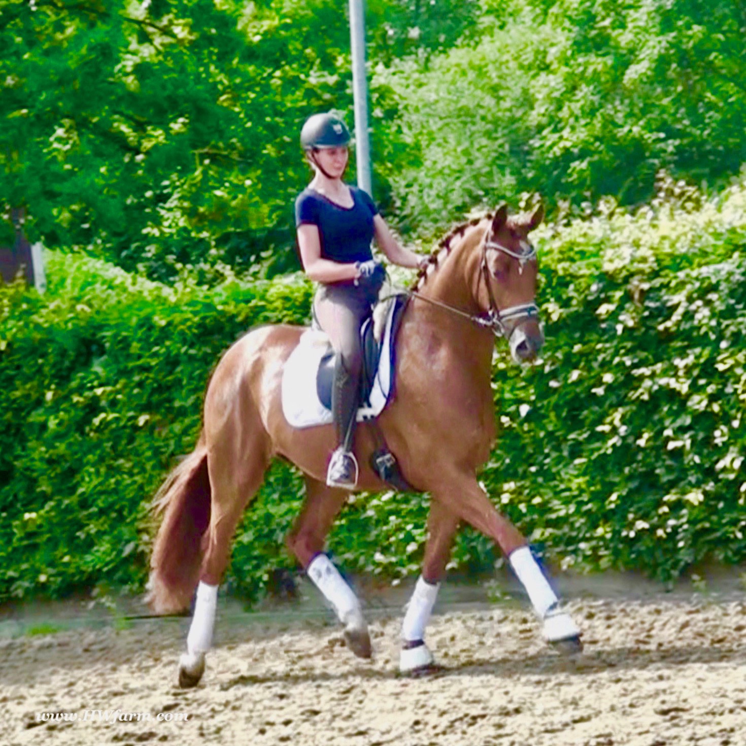 ForFun HW, chestnut Westphalian gelding, by For Romance (Fuerst Romancier / Sir Donnerhall II)/Bundeschampion Dresemann, born in 2014, standing approximately 169 cm or 16.2 hands. ForFun HW is by the famous stallion For Romance - the epitome of a model sire - and from a Voltaire dam line that has been accorded great success. Blessed with three excellent gaits, his canter and trot can only be described with superlatives and his character is also noteworthy. He stood out brilliantly in the strong lot of stallions at the 2011 Oldenburg Verband licensing and the enthusiastic spectators in Vechta gave him standing ovations. As expected, For Romance passed his 30-day test in Schlieckau with super scores. He received a 9.25 for his trot and rideability, a 9.0 for his canter and an 8.88 for character. In the third generation of his pedigree you find Don Schufro who took the Danish Champion title and won team bronze at the 2008 Olympic Games in Hong Kong under Andreas Helgstrand/DEN. He is also the sire of many champions. For Romance's dam line goes back to Voltaire, a Furioso II son who was well-known in breeding and sport the world over. This line is also the origin of the licensed stallions Dusty, Furinos and Platino as well as many international sport horses that were highly successful in show jumping as well as dressage. His sire, Fürst Romancier, was licensed in 2007 and made headlines just two years later when he took fourth place in the World Championships for young dressage horses in the class for five year olds and also fourth place at the Bundeschampionate in Warendorf. Matthias Alexander Rath has taken over Fürst Romancier's training, in 2012. For Romance's full sister Fasine took the Oldenburg Champion Mare title - a feat that is so far unique in the history of the Oldenburg Verband. The dam's sire, Sir Donnerhall I, gained trademark status early on in his career. He was the 2nd Reserve Champion at his licensing, State Champion, the record-breaking winner of his stallion performance test, Vice World Champion of young dressage horses and Bundeschampion as well as the main premium winner of stallions with emphasis on dressage. More than 50 of his sons have been licensed. In 2010, three of his progeny took Vice Bundeschampion titles in Warendorf: Silbermond - the NRW Champion Stallion, Appassionata and the licensed Snap Shot. He has also siree numerous top auction horses. Dresemann is ForFun HW's dam sire, a pitch black dance master, with fascinating in and exterior. He won the Bundeschampionate with the highest points (four 10's) ever given by judges at that show. An elegant gentleman, with an near unmatched movement. His bloodlines combine the famous Donnerhall and Weltmeyer lines, the most influential and important genes of the presence. The black sire Daidalos was Landesridinghorse Champion in Hanover/Bremen. He was successful in Dressage classes, winning under Heiner Schiergen all the way to the Bundeschampionat. Dresemann was the sensation at the Bundeschampionat 2002: Dresemann, under Elisabeth Niehues-Rembeck, a sight that will be unforgettable. He qualified already with the highest scores of 8.8 and it was obvious, that he would be in the finale. This dream in black, got the highest scores ever given out at the Bundeschamiopnat by the guest riders and was totally the sensation of the year: - Trot 10,0 - Canter 10,0 - Walk 8,5 - Conformation 9,5 - Overall Impression 9,5 - Guest Rider I 10,0 - Guest Rider II 10,0 After this perfect performance, he was named Bundeschampion of the 3 year old riding horse stallions, with a total of 67.5, followed by 2nd place with 63. What an obvious victory that was. His dam St. Pr. St. Whitney had a stellar mare performance test. Dam sire Wolkenstein II was the Bundeschampion and stallion performance test winner. His breeding index is the most successful of all Weltmeyer sons. The picture per-fect beautiful black Dresemann in third Generation was educated up to Grand Prix and a very highly sought after stallion in Celle as well as in France. The grand dam Gina is a sister to the famous Dillenburg stallion Grafenberg. Via Grenadier, Lugano I, Wöhler, Poet xx, Jason ox, he has the best genes you could be looking for. Keuring in NRW December Münster Handorf. This stellar stallion came in with a score of 8.33 as 3rd place out of 33 participants. His ride ability, trot and canter, were 1st place, no doubt. In the year 2003, he was victorious in many dressage horse classes. In 2004, Dresemann participated at the world young horse championships in Verden as well as being in the finale of the Bundeschampionat 5 year olds. In 2005 as well, Dreseman was able to continue his successful career, finale of the world championships of the young dressage horses in Verden as well as finale of the Bundeschampionships for 6 year old dressage horses. Dreseman then was highly placed all the way up to dressage horse classes Intermediare I. In 2007, his breeding index of 160 was one of the best in the riding horse books. In the meantime he was trained all the way to Grand Prix, there is no limit to what this horse can do. ForFun HW himself, is a stunning horse has all the personality a person could ever hope for, he's easy to ride and handle, no wonder with these bloodlines!!! ForFun HW is already at second level, with fluent counter canter and the flying changes will be easy for him. This boy is far advanced in his training and he shows super nice extensions and airtime. Check out his amazing hind leg, reaching far under his body and lifting it up in the air with ease. He just glides and barely touches the ground. Ridden inside and outside, always giving 100%, no matter what he's asked to do. He loves to please his handler and rider, to learn new things is his hobby. This sweet boy, enjoys to work eagerly under saddle. All concentrated on his job in the dressage arena and with his quick hind leg, passage and piaffe will come naturally to him. ForFun HW is supple and