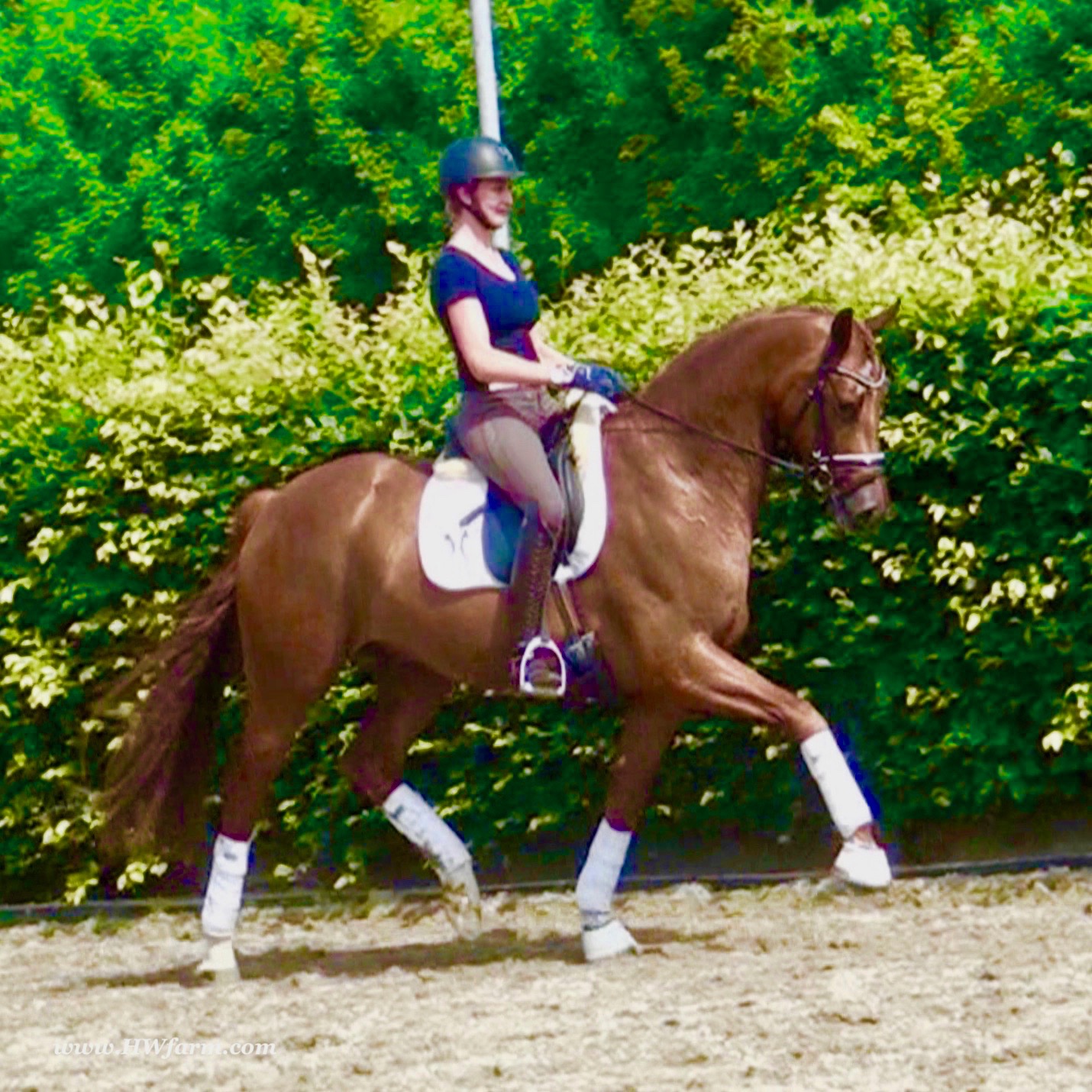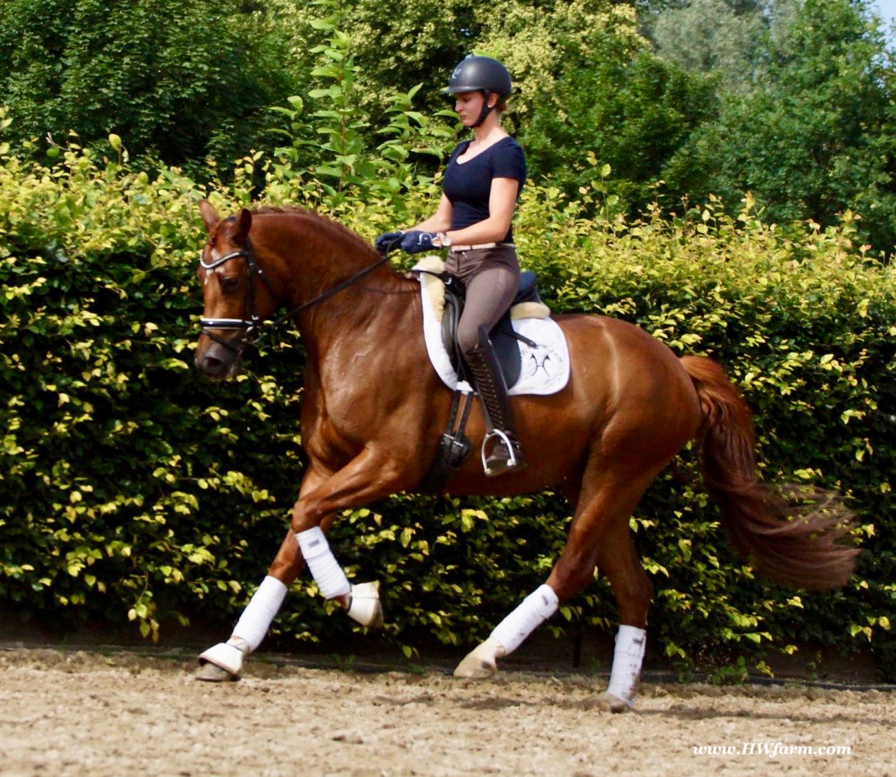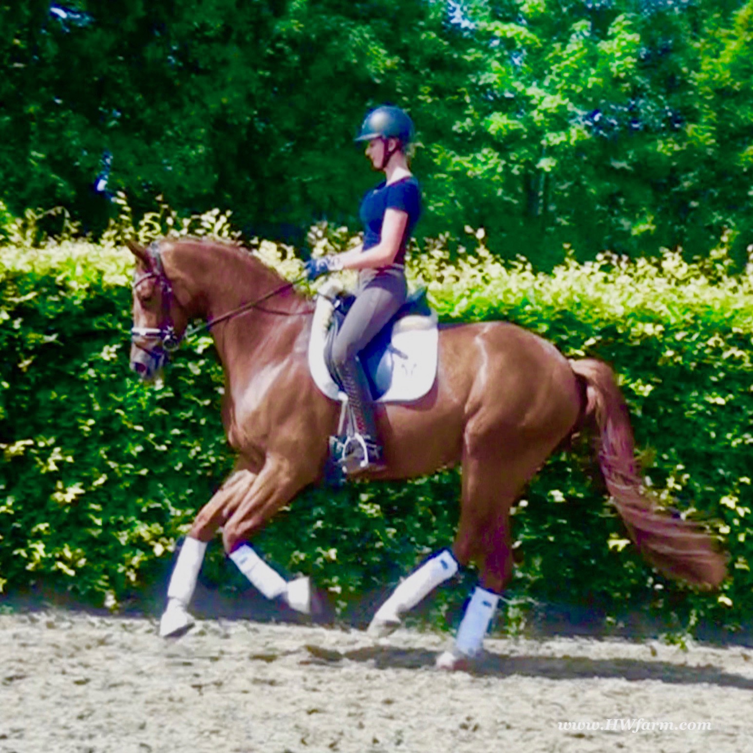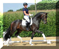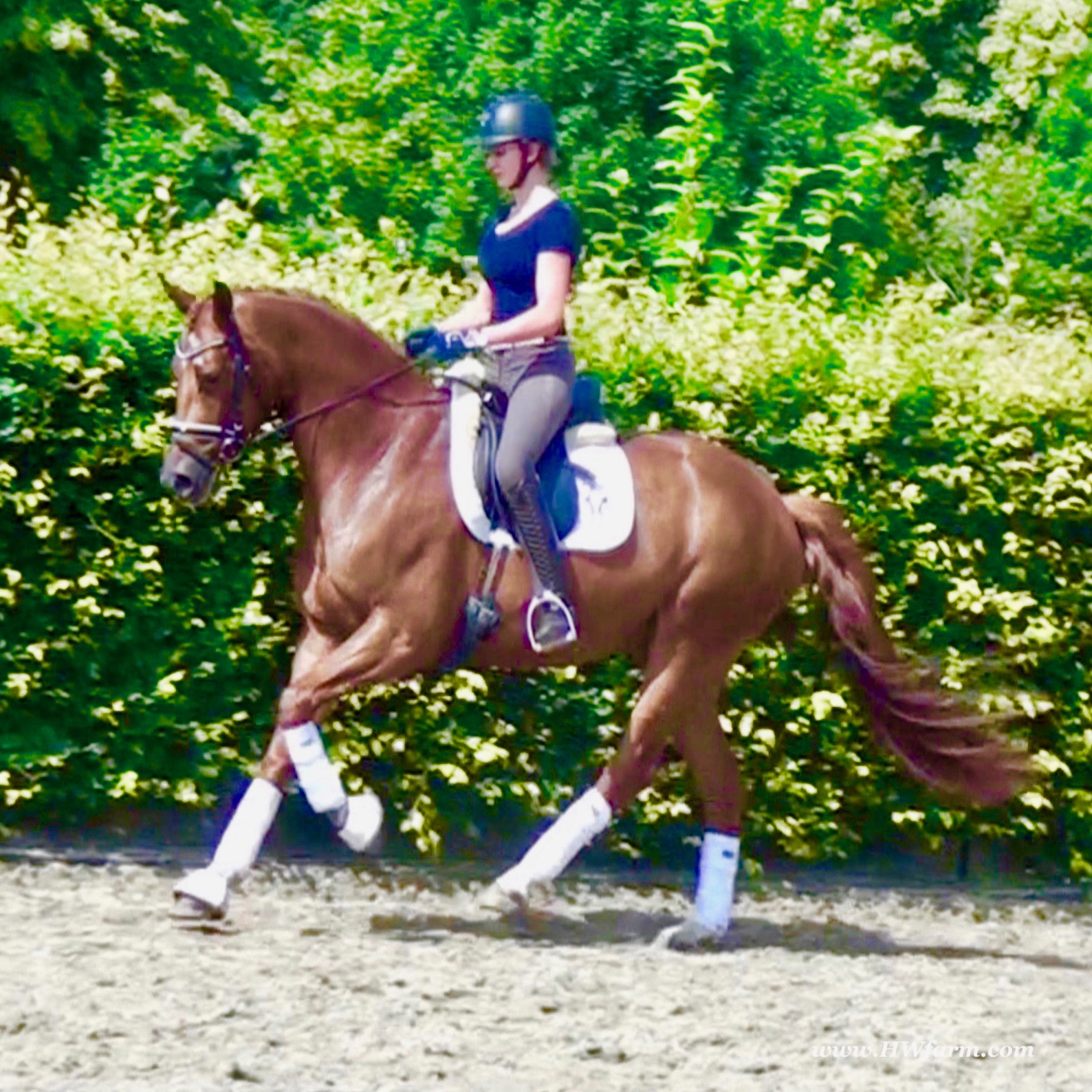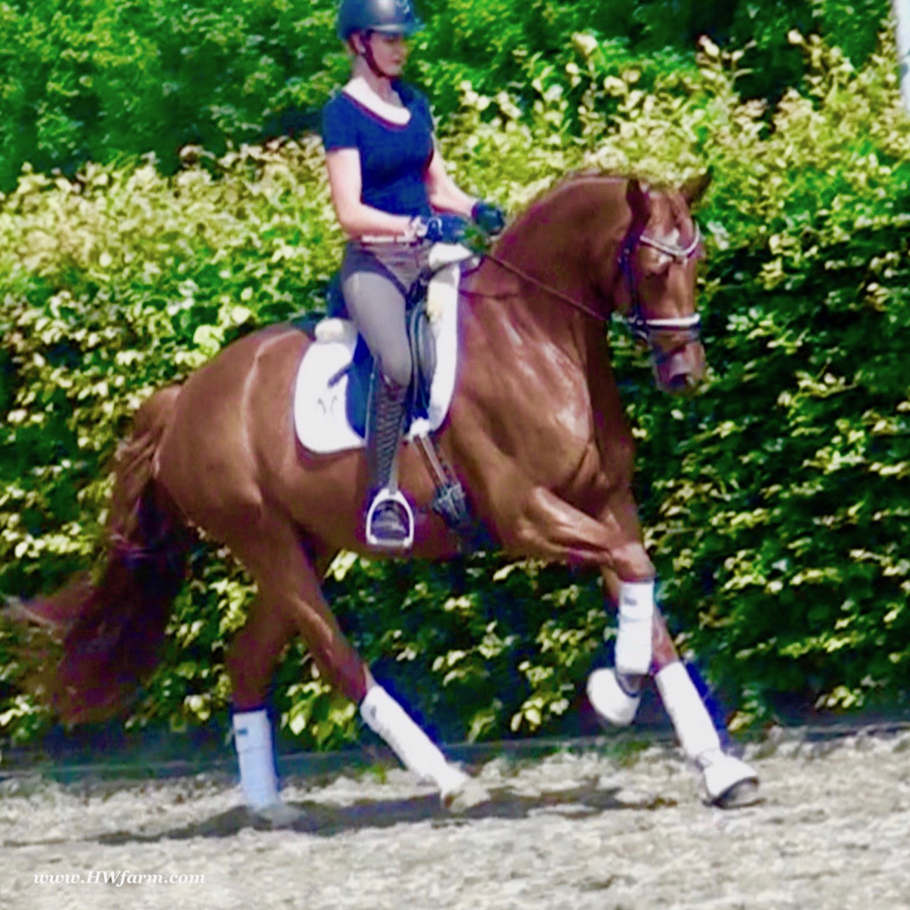 ForFun HW, chestnut Westphalian gelding, by For Romance (Fuerst Romancier / Sir Donnerhall II)/Bundeschampion Dresemann, born in 2014, standing approximately 169 cm or 16.2 hands. ForFun HW is by the famous stallion For Romance - the epitome of a model sire - and from a Voltaire dam line that has been accorded great success. Blessed with three excellent gaits, his canter and trot can only be described with superlatives and his character is also noteworthy. He stood out brilliantly in the strong lot of stallions at the 2011 Oldenburg Verband licensing and the enthusiastic spectators in Vechta gave him standing ovations. As expected, For Romance passed his 30-day test in Schlieckau with super scores. He received a 9.25 for his trot and rideability, a 9.0 for his canter and an 8.88 for character. In the third generation of his pedigree you find Don Schufro who took the Danish Champion title and won team bronze at the 2008 Olympic Games in Hong Kong under Andreas Helgstrand/DEN. He is also the sire of many champions. For Romance's dam line goes back to Voltaire, a Furioso II son who was well-known in breeding and sport the world over. This line is also the origin of the licensed stallions Dusty, Furinos and Platino as well as many international sport horses that were highly successful in show jumping as well as dressage. His sire, Fürst Romancier, was licensed in 2007 and made headlines just two years later when he took fourth place in the World Championships for young dressage horses in the class for five year olds and also fourth place at the Bundeschampionate in Warendorf. Matthias Alexander Rath has taken over Fürst Romancier's training, in 2012. For Romance's full sister Fasine took the Oldenburg Champion Mare title - a feat that is so far unique in the history of the Oldenburg Verband. The dam's sire, Sir Donnerhall I, gained trademark status early on in his career. He was the 2nd Reserve Champion at his licensing, State Champion, the record-breaking winner of his stallion performance test, Vice World Champion of young dressage horses and Bundeschampion as well as the main premium winner of stallions with emphasis on dressage. More than 50 of his sons have been licensed. In 2010, three of his progeny took Vice Bundeschampion titles in Warendorf: Silbermond - the NRW Champion Stallion, Appassionata and the licensed Snap Shot. He has also siree numerous top auction horses. Dresemann is ForFun HW's dam sire, a pitch black dance master, with fascinating in and exterior. He won the Bundeschampionate with the highest points (four 10's) ever given by judges at that show. An elegant gentleman, with an near unmatched movement. His bloodlines combine the famous Donnerhall and Weltmeyer lines, the most influential and important genes of the presence. The black sire Daidalos was Landesridinghorse Champion in Hanover/Bremen. He was successful in Dressage classes, winning under Heiner Schiergen all the way to the Bundeschampionat. Dresemann was the sensation at the Bundeschampionat 2002: Dresemann, under Elisabeth Niehues-Rembeck, a sight that will be unforgettable. He qualified already with the highest scores of 8.8 and it was obvious, that he would be in the finale. This dream in black, got the highest scores ever given out at the Bundeschamiopnat by the guest riders and was totally the sensation of the year: - Trot 10,0 - Canter 10,0 - Walk 8,5 - Conformation 9,5 - Overall Impression 9,5 - Guest Rider I 10,0 - Guest Rider II 10,0 After this perfect performance, he was named Bundeschampion of the 3 year old riding horse stallions, with a total of 67.5, followed by 2nd place with 63. What an obvious victory that was. His dam St. Pr. St. Whitney had a stellar mare performance test. Dam sire Wolkenstein II was the Bundeschampion and stallion performance test winner. His breeding index is the most successful of all Weltmeyer sons. The picture per-fect beautiful black Dresemann in third Generation was educated up to Grand Prix and a very highly sought after stallion in Celle as well as in France. The grand dam Gina is a sister to the famous Dillenburg stallion Grafenberg. Via Grenadier, Lugano I, Wöhler, Poet xx, Jason ox, he has the best genes you could be looking for. Keuring in NRW December Münster Handorf. This stellar stallion came in with a score of 8.33 as 3rd place out of 33 participants. His ride ability, trot and canter, were 1st place, no doubt. In the year 2003, he was victorious in many dressage horse classes. In 2004, Dresemann participated at the world young horse championships in Verden as well as being in the finale of the Bundeschampionat 5 year olds. In 2005 as well, Dreseman was able to continue his successful career, finale of the world championships of the young dressage horses in Verden as well as finale of the Bundeschampionships for 6 year old dressage horses. Dreseman then was highly placed all the way up to dressage horse classes Intermediare I. In 2007, his breeding index of 160 was one of the best in the riding horse books. In the meantime he was trained all the way to Grand Prix, there is no limit to what this horse can do. ForFun HW himself, is a stunning horse has all the personality a person could ever hope for, he's easy to ride and handle, no wonder with these bloodlines!!! ForFun HW is already at second level, with fluent counter canter and the flying changes will be easy for him. This boy is far advanced in his training and he shows super nice extensions and airtime. Check out his amazing hind leg, reaching far under his body and lifting it up in the air with ease. He just glides and barely touches the ground. Ridden inside and outside, always giving 100%, no matter what he's asked to do. He loves to please his handler and rider, to learn new things is his hobby. This sweet boy, enjoys to work eagerly under saddle. All concentrated on his job in the dressage arena and with his quick hind leg, passage and piaffe will come naturally to him. ForFun HW is supple and