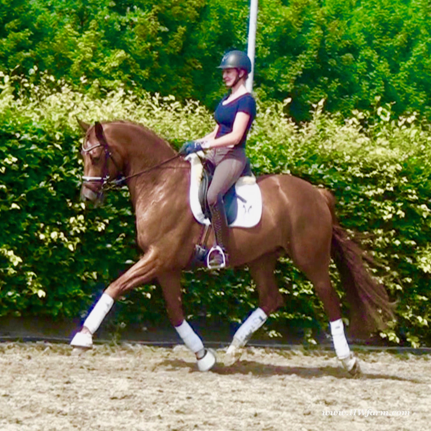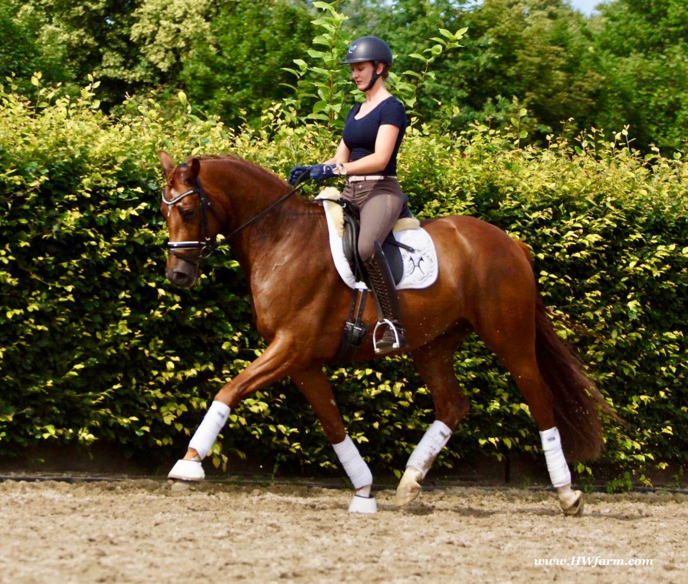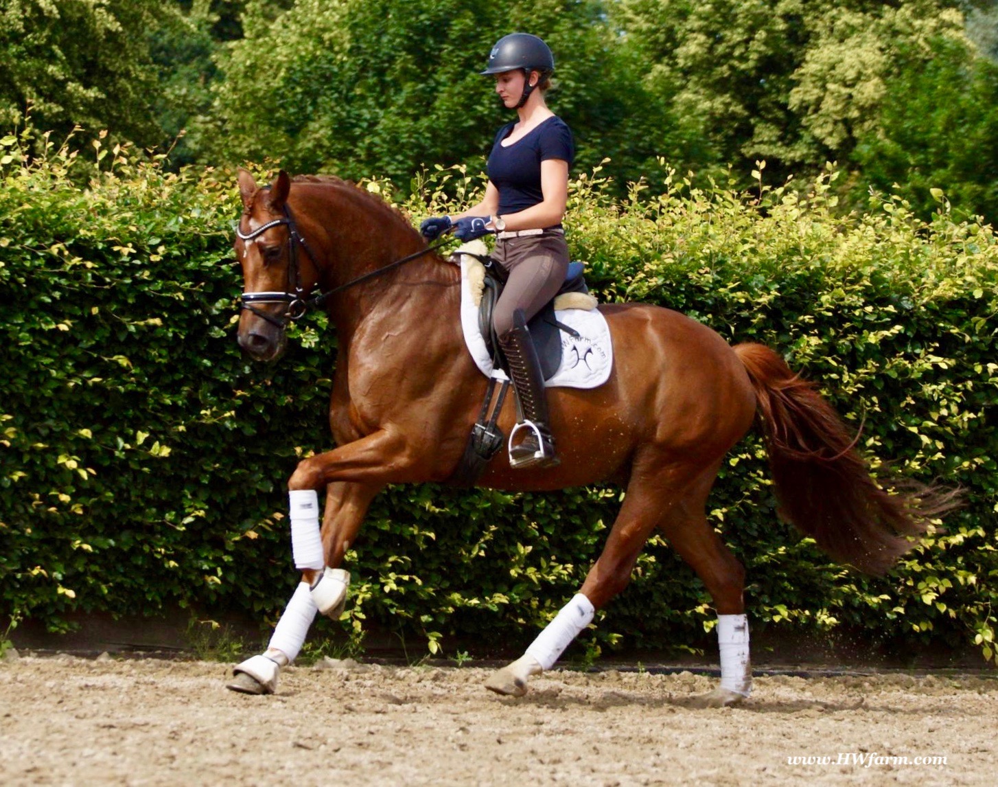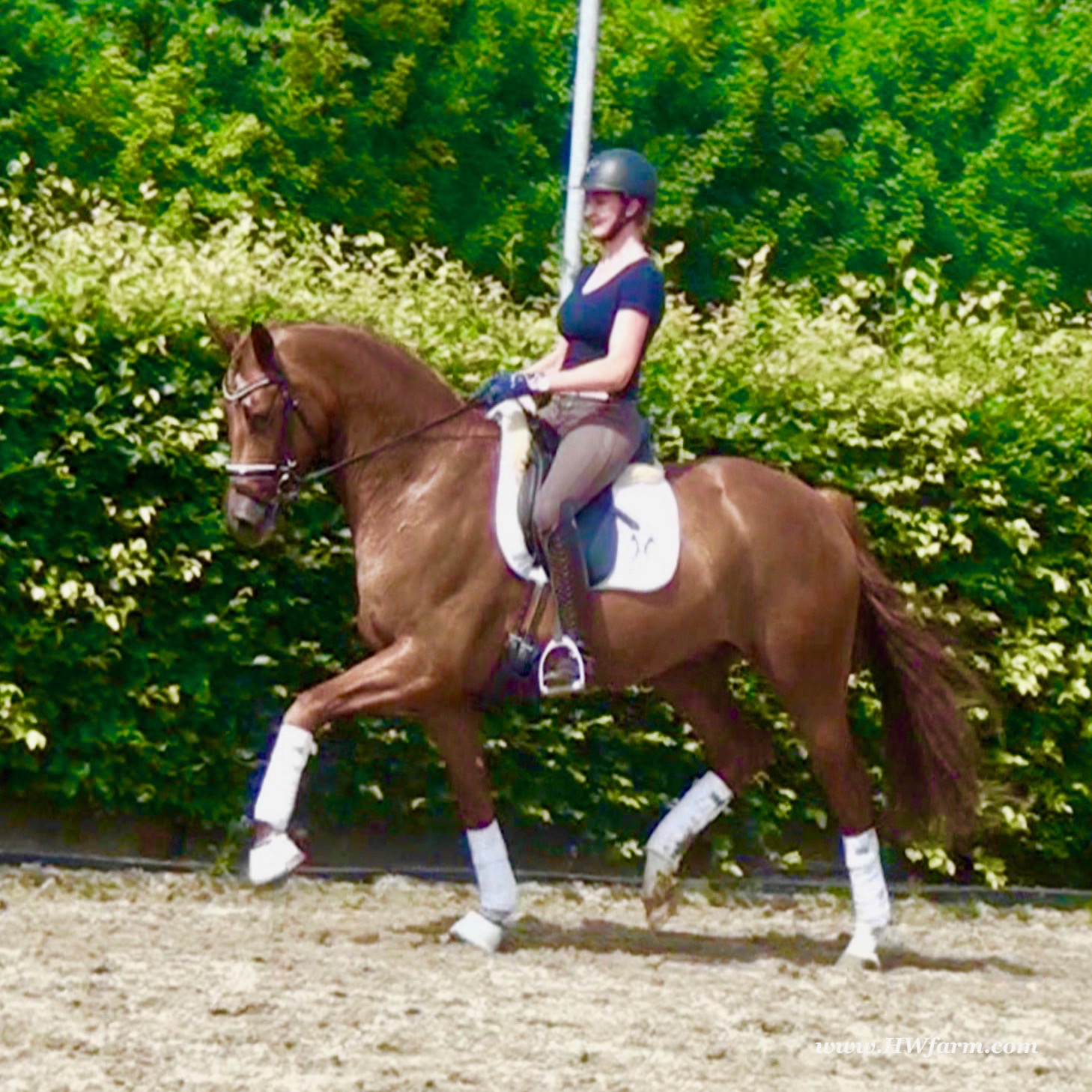 ForFun HW, chestnut Westphalian gelding, by For Romance (Fuerst Romancier / Sir Donnerhall II)/Bundeschampion Dresemann, born in 2014, standing approximately 169 cm or 16.2 hands. ForFun HW is by the famous stallion For Romance - the epitome of a model sire - and from a Voltaire dam line that has been accorded great success. Blessed with three excellent gaits, his canter and trot can only be described with superlatives and his character is also noteworthy. He stood out brilliantly in the strong lot of stallions at the 2011 Oldenburg Verband licensing and the enthusiastic spectators in Vechta gave him standing ovations. As expected, For Romance passed his 30-day test in Schlieckau with super scores. He received a 9.25 for his trot and rideability, a 9.0 for his canter and an 8.88 for character. In the third generation of his pedigree you find Don Schufro who took the Danish Champion title and won team bronze at the 2008 Olympic Games in Hong Kong under Andreas Helgstrand/DEN. He is also the sire of many champions. For Romance's dam line goes back to Voltaire, a Furioso II son who was well-known in breeding and sport the world over. This line is also the origin of the licensed stallions Dusty, Furinos and Platino as well as many international sport horses that were highly successful in show jumping as well as dressage. His sire, Fürst Romancier, was licensed in 2007 and made headlines just two years later when he took fourth place in the World Championships for young dressage horses in the class for five year olds and also fourth place at the Bundeschampionate in Warendorf. Matthias Alexander Rath has taken over Fürst Romancier's training, in 2012. For Romance's full sister Fasine took the Oldenburg Champion Mare title - a feat that is so far unique in the history of the Oldenburg Verband. The dam's sire, Sir Donnerhall I, gained trademark status early on in his career. He was the 2nd Reserve Champion at his licensing, State Champion, the record-breaking winner of his stallion performance test, Vice World Champion of young dressage horses and Bundeschampion as well as the main premium winner of stallions with emphasis on dressage. More than 50 of his sons have been licensed. In 2010, three of his progeny took Vice Bundeschampion titles in Warendorf: Silbermond - the NRW Champion Stallion, Appassionata and the licensed Snap Shot. He has also siree numerous top auction horses. Dresemann is ForFun HW's dam sire, a pitch black dance master, with fascinating in and exterior. He won the Bundeschampionate with the highest points (four 10's) ever given by judges at that show. An elegant gentleman, with an near unmatched movement. His bloodlines combine the famous Donnerhall and Weltmeyer lines, the most influential and important genes of the presence. The black sire Daidalos was Landesridinghorse Champion in Hanover/Bremen. He was successful in Dressage classes, winning under Heiner Schiergen all the way to the Bundeschampionat. Dresemann was the sensation at the Bundeschampionat 2002: Dresemann, under Elisabeth Niehues-Rembeck, a sight that will be unforgettable. He qualified already with the highest scores of 8.8 and it was obvious, that he would be in the finale. This dream in black, got the highest scores ever given out at the Bundeschamiopnat by the guest riders and was totally the sensation of the year: - Trot 10,0 - Canter 10,0 - Walk 8,5 - Conformation 9,5 - Overall Impression 9,5 - Guest Rider I 10,0 - Guest Rider II 10,0 After this perfect performance, he was named Bundeschampion of the 3 year old riding horse stallions, with a total of 67.5, followed by 2nd place with 63. What an obvious victory that was. His dam St. Pr. St. Whitney had a stellar mare performance test. Dam sire Wolkenstein II was the Bundeschampion and stallion performance test winner. His breeding index is the most successful of all Weltmeyer sons. The picture per-fect beautiful black Dresemann in third Generation was educated up to Grand Prix and a very highly sought after stallion in Celle as well as in France. The grand dam Gina is a sister to the famous Dillenburg stallion Grafenberg. Via Grenadier, Lugano I, Wöhler, Poet xx, Jason ox, he has the best genes you could be looking for. Keuring in NRW December Münster Handorf. This stellar stallion came in with a score of 8.33 as 3rd place out of 33 participants. His ride ability, trot and canter, were 1st place, no doubt. In the year 2003, he was victorious in many dressage horse classes. In 2004, Dresemann participated at the world young horse championships in Verden as well as being in the finale of the Bundeschampionat 5 year olds. In 2005 as well, Dreseman was able to continue his successful career, finale of the world championships of the young dressage horses in Verden as well as finale of the Bundeschampionships for 6 year old dressage horses. Dreseman then was highly placed all the way up to dressage horse classes Intermediare I. In 2007, his breeding index of 160 was one of the best in the riding horse books. In the meantime he was trained all the way to Grand Prix, there is no limit to what this horse can do. ForFun HW himself, is a stunning horse has all the personality a person could ever hope for, he's easy to ride and handle, no wonder with these bloodlines!!! ForFun HW is already at second level, with fluent counter canter and the flying changes will be easy for him. This boy is far advanced in his training and he shows super nice extensions and airtime. Check out his amazing hind leg, reaching far under his body and lifting it up in the air with ease. He just glides and barely touches the ground. Ridden inside and outside, always giving 100%, no matter what he's asked to do. He loves to please his handler and rider, to learn new things is his hobby. This sweet boy, enjoys to work eagerly under saddle. All concentrated on his job in the dressage arena and with his quick hind leg, passage and piaffe will come naturally to him. ForFun HW is supple and