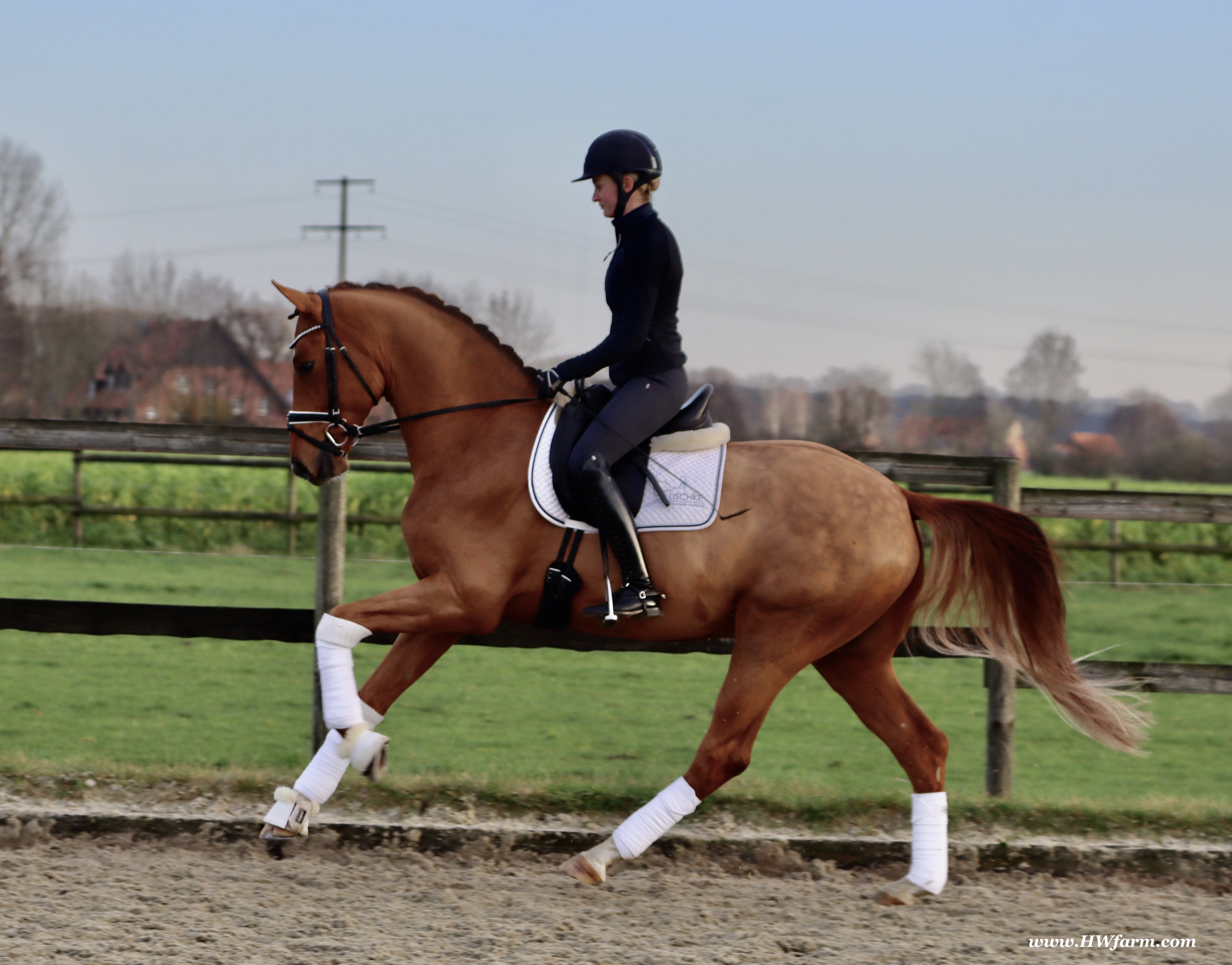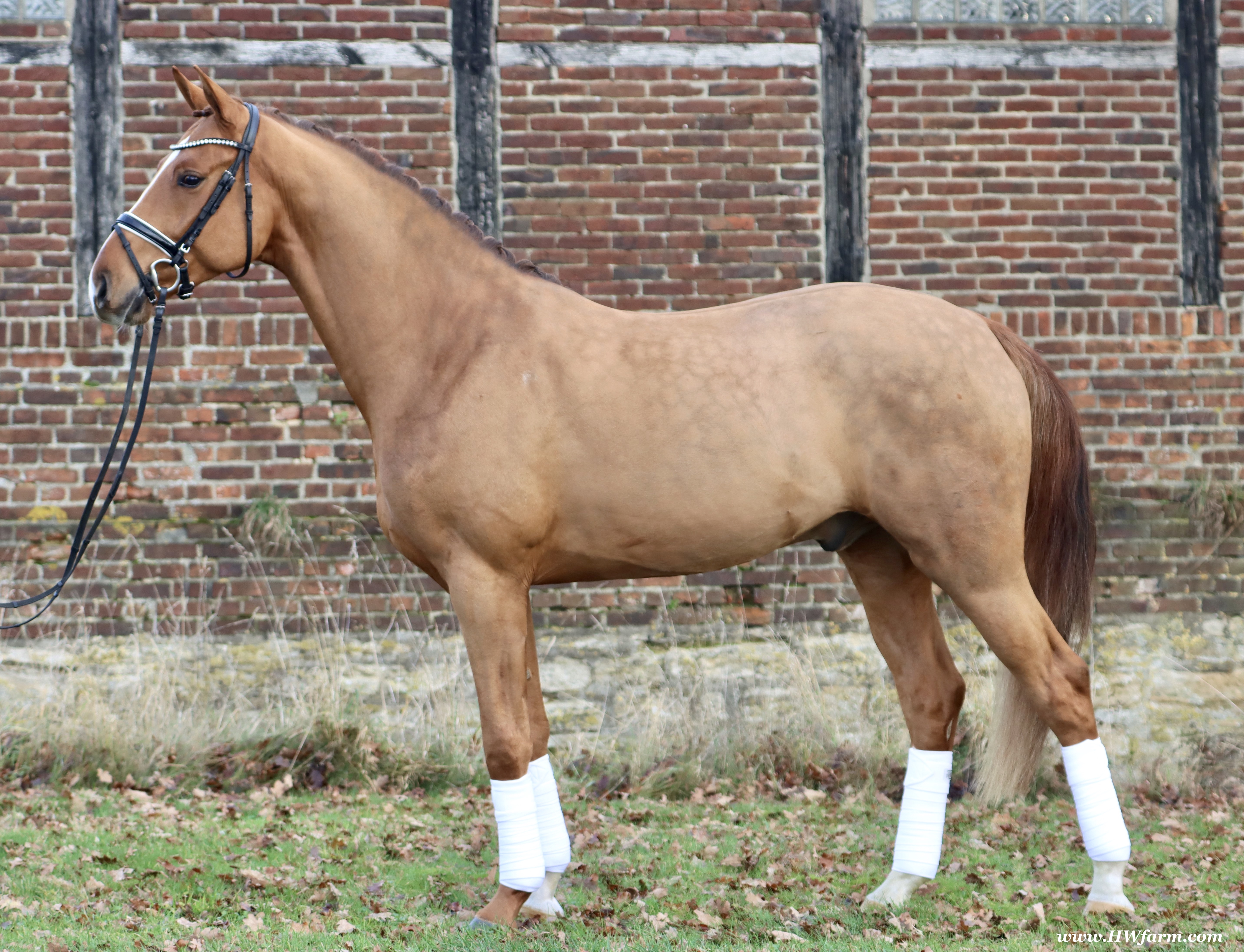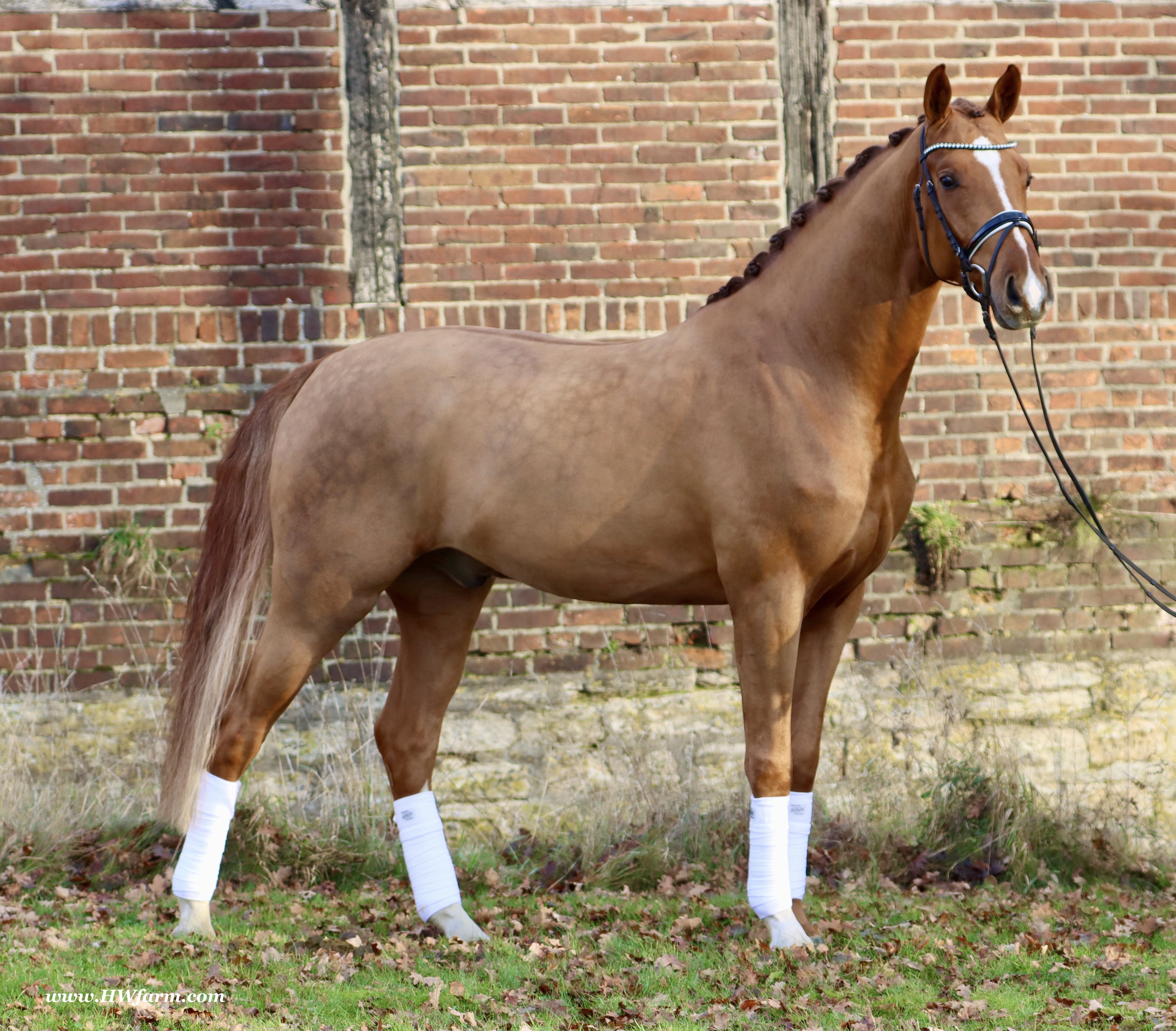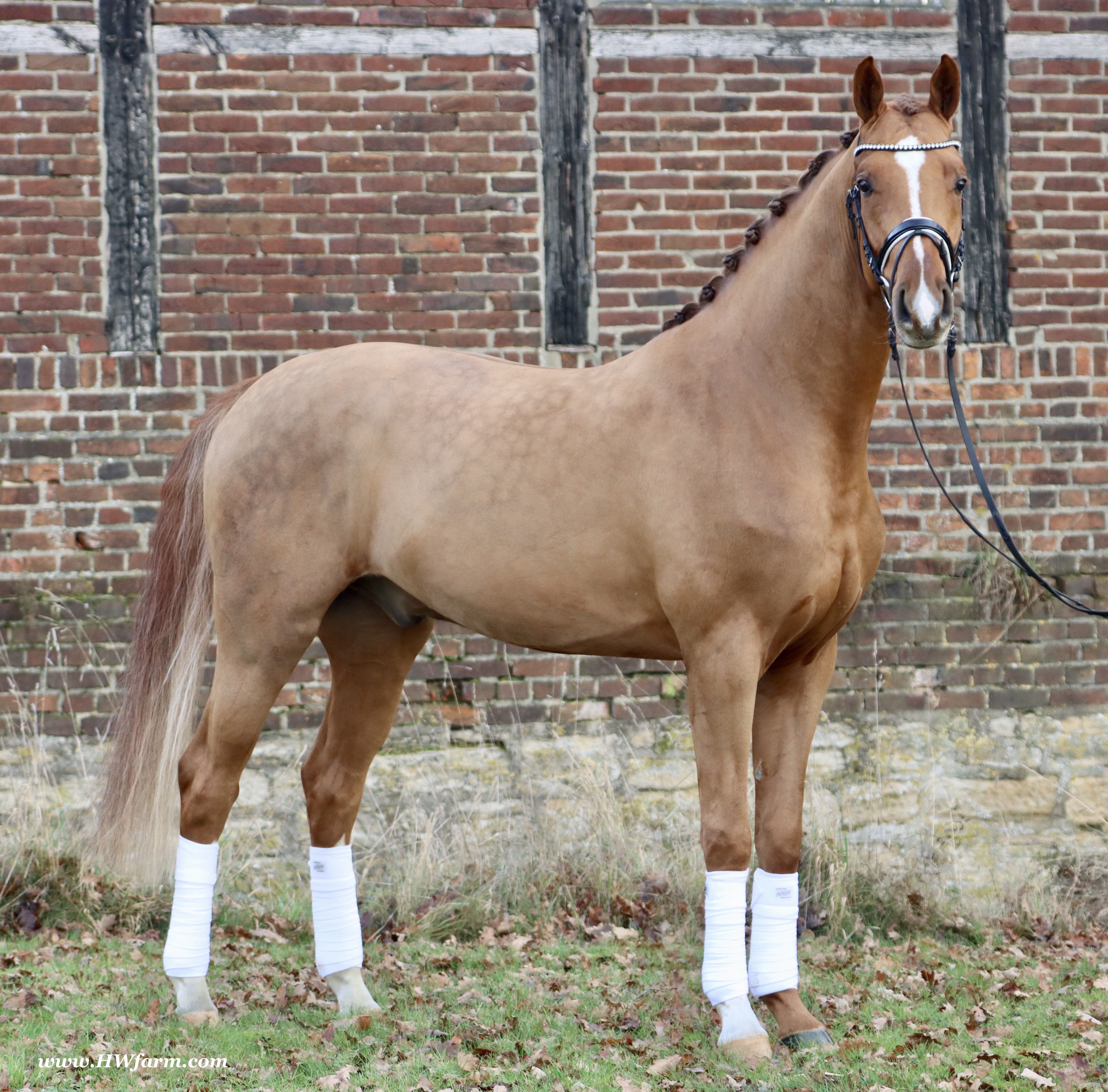 Frankly HW, chestnut Westphalian gelding, Franziskus/Dimension born in 2017, standing approximately 168 cm or 16.2 hands. Frankly HW's sire is the premium stallion Franziskus, he impressed the spectators at the Westphalian licensing in 2010. He has a brilliant type, a perfect frame as well as a harmonious and correct exterior. His basic gaits are perfect: He walks with diligence and beat, he trots with impulsion and forward thrust and he canters uphill. Franziskus was already very good as a foal. He won the qualification to the German foal-championships. In 2011 Franziskus absolved the 30-days-test in Münster-Handorf successfully: He got a score of 9.0 for trot, canter and rideability in the training and 9.5 for his character. The test rider gave him even 9.5 points for rideability. Continuing his life of success, Franziskus soon became Bundeschampion of the 4-year-old riding stallions with top marks when he was presented by both his own and by foreign riders in 2012. The Olympic rider Ingrid Klimke began riding Franziskus at the end of 2013 and was victorious with him in his first dressage class for young horses, at "M-level" (the highest class 6-year-olds can compete in Germany). Franziskus is victorious in dressage tests of KL S ** and has been 15 licensed sons. 2015 and 2016, victorious in dressage horse Kl. S ** Inter I under Ingrid Klimke and was a finalist in the Nuernberg Burgpokals/cup. Franziskus' sire Fidertanz began his career by winning the Westphalian licensing and the 30-days-test in Neustadt/Dosse. He was runner up at the "Bundeschampionat" and was the main premium award winner in 2006. Since then, Fidertanz has placed in many advanced dressage classes. His dam, Antara, has also produced the licensed stallion Dementi, who is successful in advanced dressage competitions as well. His Dam's sire, Alabaster, was "Bundeschampion" of young dressage horses. In the third and fourth generation, there are the international sport horses, and important stallions, Rubinstein I and Grundstein. I. The basis of the dam line is the Irish thoroughbred mare Daffy Toban xx (by Go Tobann xx-Mustang xx, family 2). That line produced the sires Count on Me, Grafenstein and Winston hervor, as well as the international sport horses Grand Giraud (Alexandra Simons-de Ridder) and Calman, who won the Grand Prix of Nörten-Hardenberg with Rolf Moormann. Franziskus' sire, Fidertanz, started his phenomenal career in the year 2004 as NRW-Champion Stallion in Münster-Handorf. In 2005, Fidertanz won his 30-day-test in Neustadt/Dosse with excellent results, and became Vice Bundeschampion with a top score of 9.5 in test-riding. In the year 2006, Fidertanz won the High Premium award for dressage-stallions at the Oldenburg-licensing in Vechta. In the meantime, Fidertanz has been trained up to the advanced level in dressage. Franziskus' dam, Antara, produced with De Niro the licensed stallion Dementi, who is successful at the advanced dressage S Level. The dam's sire is the former Bundeschampion of German Dressage Horses, Alabaster. The third and fourth generation of the pedigree is refined by the internationally successful top-stallions Rubinstein I and Grundstein I. The dam line is based on the Irish thoroughbred-mare Daffy Toban xx (v. Go Tabann xx-Mustang xx-Flamenco xx etc,, thoroughbred-familiy 2). Some of the stallions out of this line (which is followed by the breeding-familiy Albers since the mid 1970's) are e.g. Count on Me (PB Denmark), Grafenstein (PB Oldenburg, State Stud Redefin and Marbach), Winston (PB Hannover, State Stud Celle), as well as the international sport horses Grand Giraud/Alexandra Simons-de Ridder and Calman, who won the "Goldene Peitsche" in Nörten-Hardenberg under the saddle of Rolf Moormann. Ingrid Klimke and Franziskus: Frankly HW's dam is by Dimension, a full brother to De Niro! De Niro's sire, Donnerhall, holds the highest dressage breeding value index (271) of all stallions. He placed second among 70 stallions at his performance test and went on to be-come DLG Champion in 1986. Donnerhall won more than 65 FEI Level and Grand Prix competitions and competed successfully until he was retired at 17-years of age. De Niro's dam was a successful dressage competitor producing an Approved stallion in Westfalia. His dam's sire, Akzent II, is regarded as one of the best sires of rideability in modern sport horse breeding producing many Approved stallions and expensive auction horses.