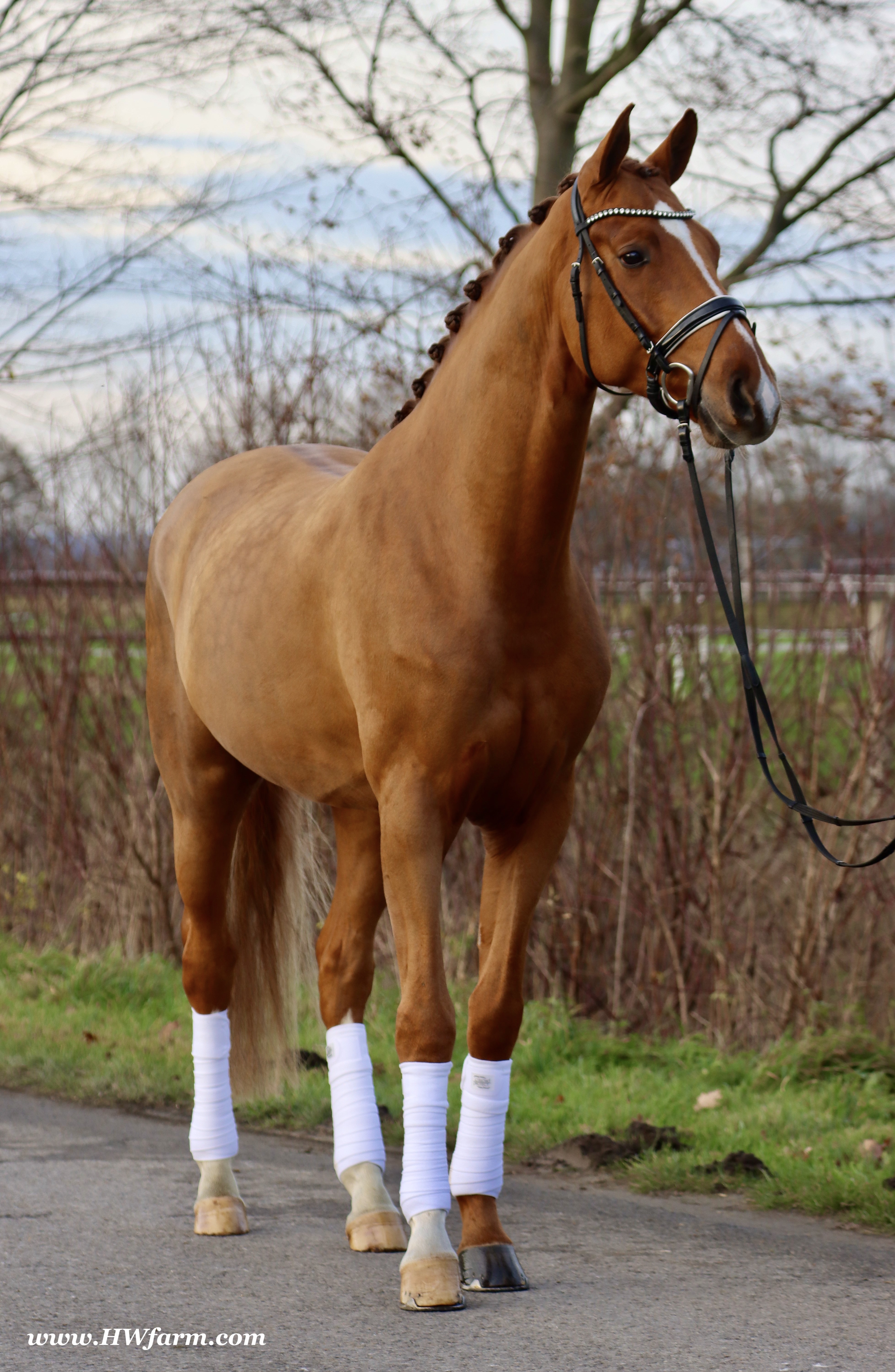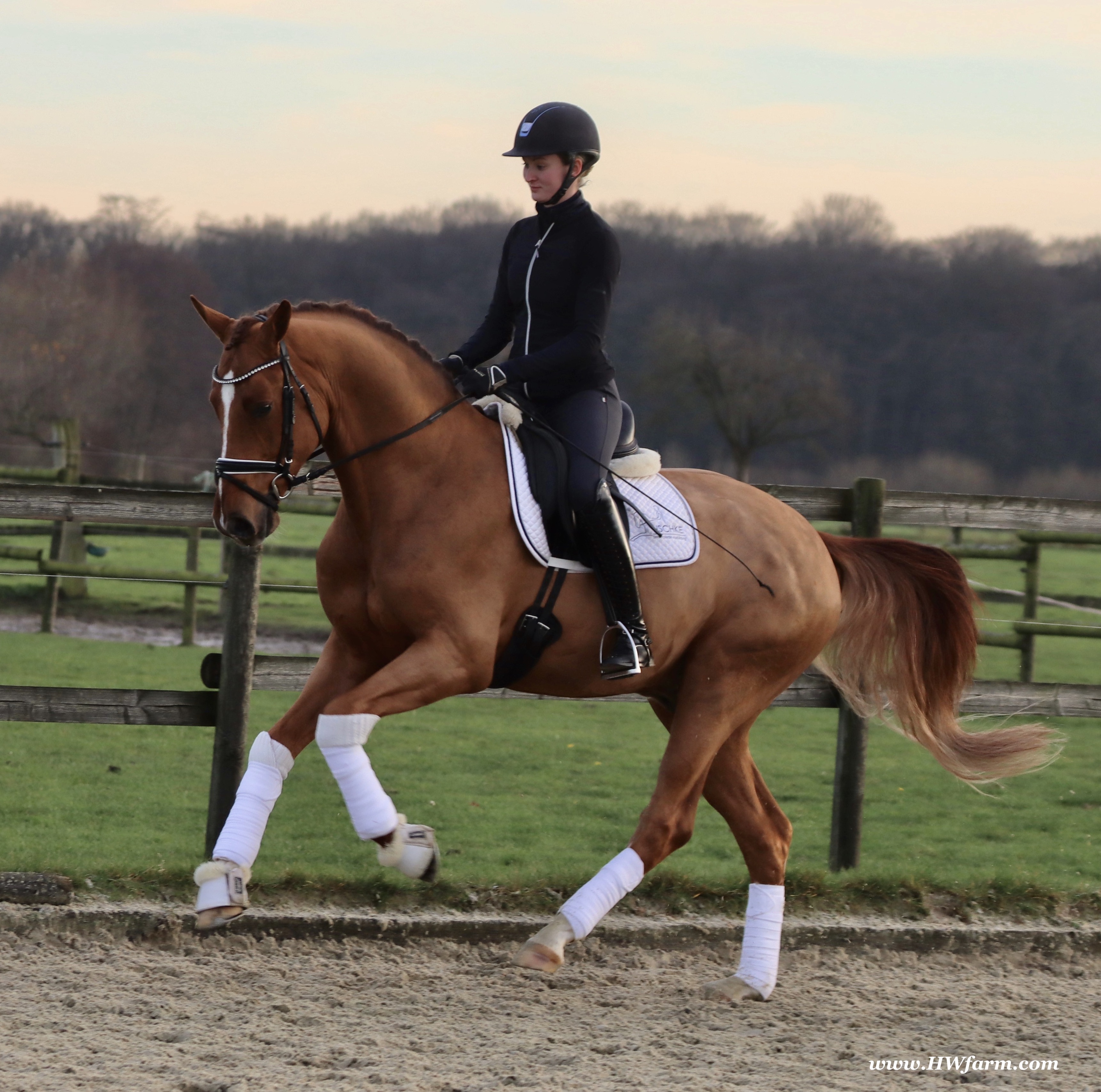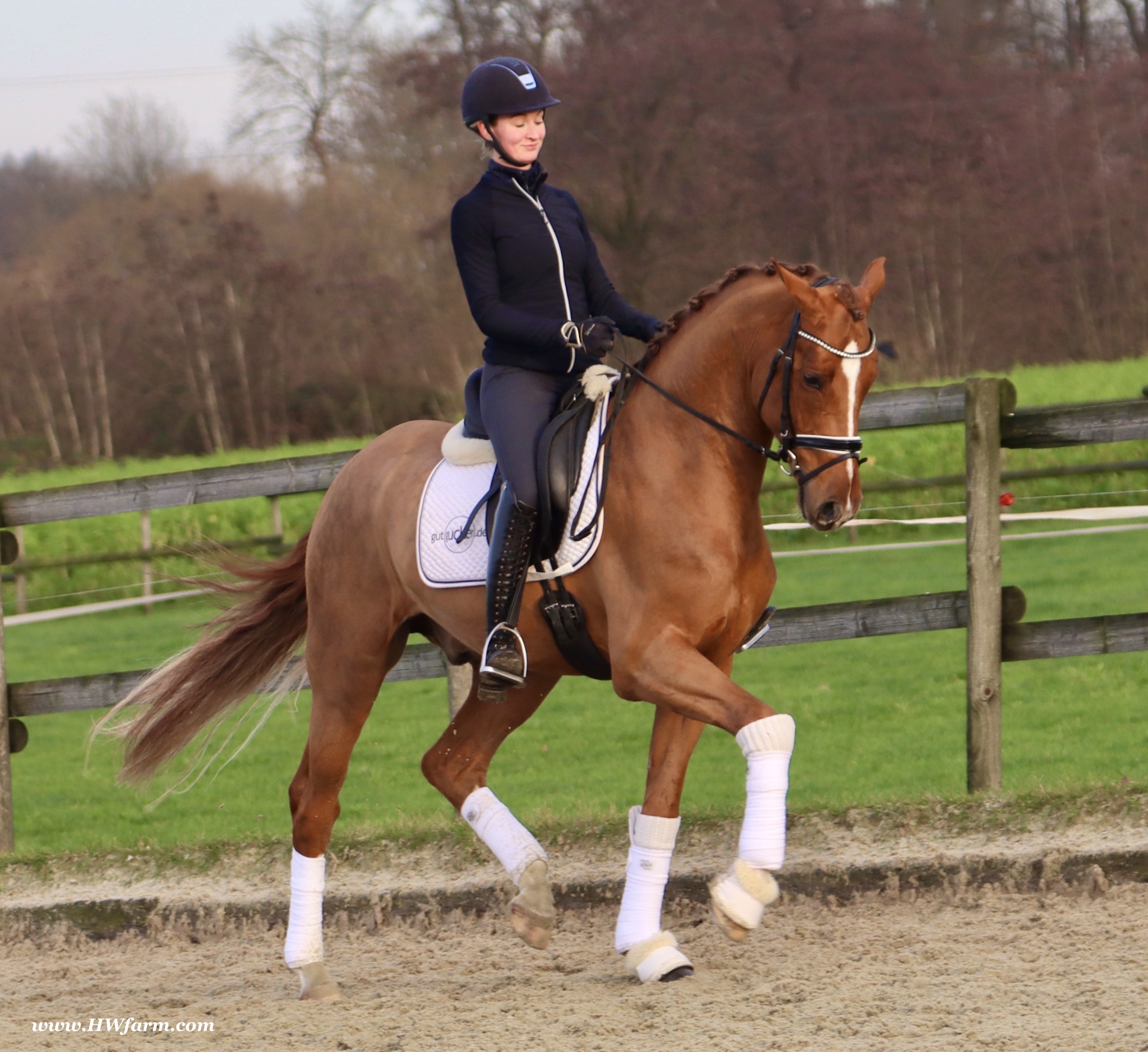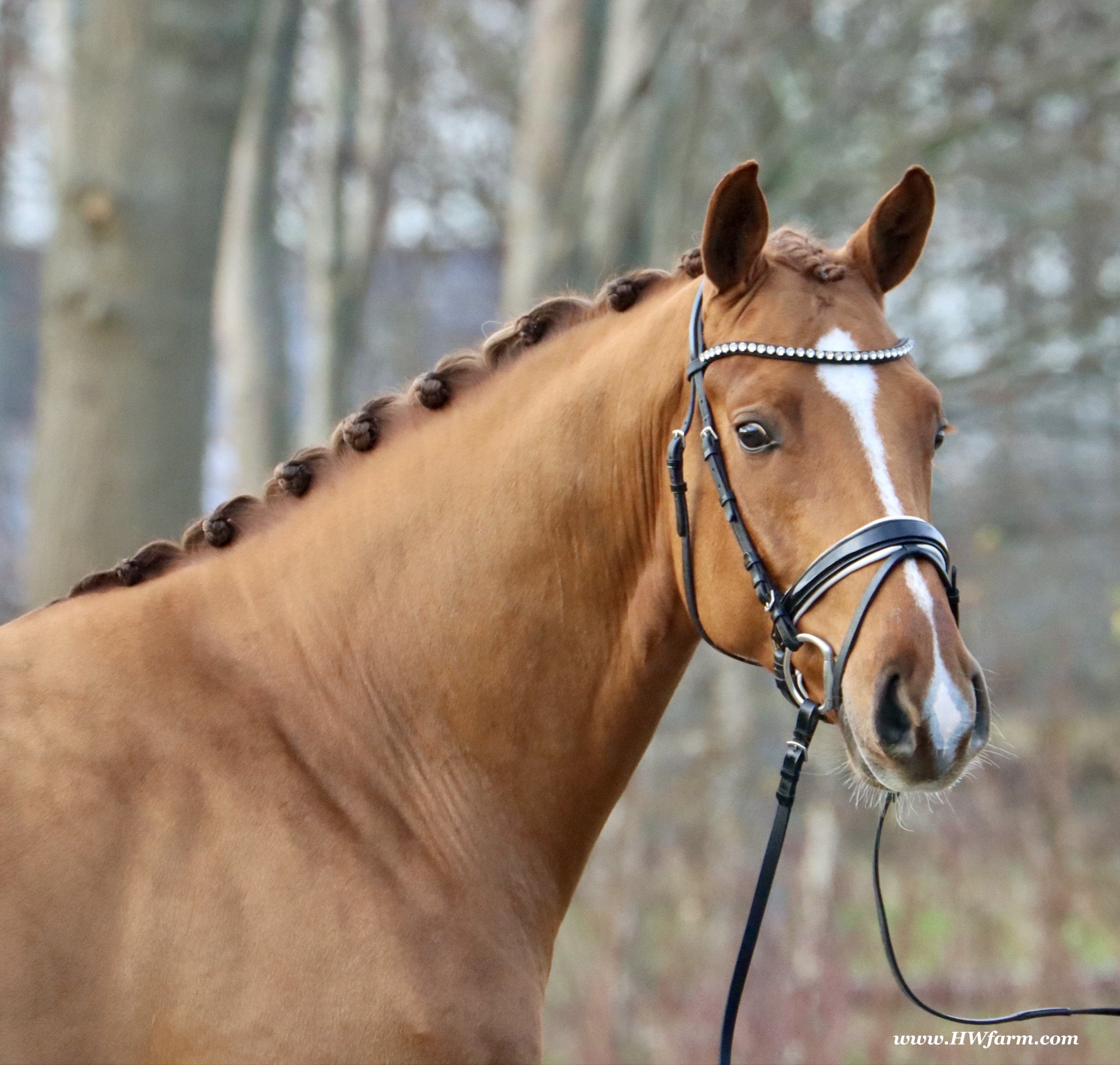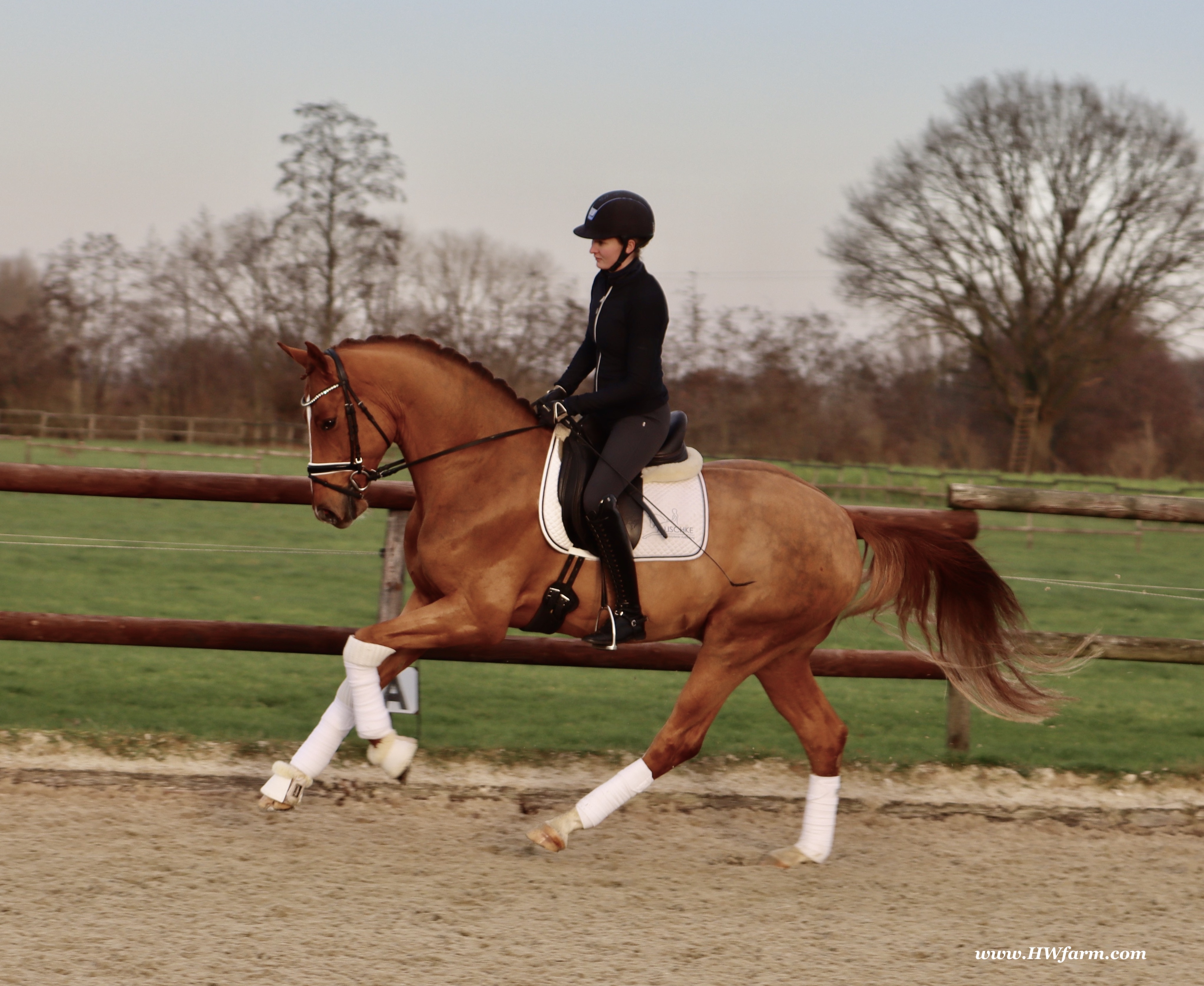 Frankly HW, chestnut Westphalian gelding, Franziskus/Dimension born in 2017, standing approximately 168 cm or 16.2 hands. Frankly HW's sire is the premium stallion Franziskus, he impressed the spectators at the Westphalian licensing in 2010. He has a brilliant type, a perfect frame as well as a harmonious and correct exterior. His basic gaits are perfect: He walks with diligence and beat, he trots with impulsion and forward thrust and he canters uphill. Franziskus was already very good as a foal. He won the qualification to the German foal-championships. In 2011 Franziskus absolved the 30-days-test in Münster-Handorf successfully: He got a score of 9.0 for trot, canter and rideability in the training and 9.5 for his character. The test rider gave him even 9.5 points for rideability. Continuing his life of success, Franziskus soon became Bundeschampion of the 4-year-old riding stallions with top marks when he was presented by both his own and by foreign riders in 2012. The Olympic rider Ingrid Klimke began riding Franziskus at the end of 2013 and was victorious with him in his first dressage class for young horses, at "M-level" (the highest class 6-year-olds can compete in Germany). Franziskus is victorious in dressage tests of KL S ** and has been 15 licensed sons. 2015 and 2016, victorious in dressage horse Kl. S ** Inter I under Ingrid Klimke and was a finalist in the Nuernberg Burgpokals/cup. Franziskus' sire Fidertanz began his career by winning the Westphalian licensing and the 30-days-test in Neustadt/Dosse. He was runner up at the "Bundeschampionat" and was the main premium award winner in 2006. Since then, Fidertanz has placed in many advanced dressage classes. His dam, Antara, has also produced the licensed stallion Dementi, who is successful in advanced dressage competitions as well. His Dam's sire, Alabaster, was "Bundeschampion" of young dressage horses. In the third and fourth generation, there are the international sport horses, and important stallions, Rubinstein I and Grundstein. I. The basis of the dam line is the Irish thoroughbred mare Daffy Toban xx (by Go Tobann xx-Mustang xx, family 2). That line produced the sires Count on Me, Grafenstein and Winston hervor, as well as the international sport horses Grand Giraud (Alexandra Simons-de Ridder) and Calman, who won the Grand Prix of Nörten-Hardenberg with Rolf Moormann. Franziskus' sire, Fidertanz, started his phenomenal career in the year 2004 as NRW-Champion Stallion in Münster-Handorf. In 2005, Fidertanz won his 30-day-test in Neustadt/Dosse with excellent results, and became Vice Bundeschampion with a top score of 9.5 in test-riding. In the year 2006, Fidertanz won the High Premium award for dressage-stallions at the Oldenburg-licensing in Vechta. In the meantime, Fidertanz has been trained up to the advanced level in dressage. Franziskus' dam, Antara, produced with De Niro the licensed stallion Dementi, who is successful at the advanced dressage S Level. The dam's sire is the former Bundeschampion of German Dressage Horses, Alabaster. The third and fourth generation of the pedigree is refined by the internationally successful top-stallions Rubinstein I and Grundstein I. The dam line is based on the Irish thoroughbred-mare Daffy Toban xx (v. Go Tabann xx-Mustang xx-Flamenco xx etc,, thoroughbred-familiy 2). Some of the stallions out of this line (which is followed by the breeding-familiy Albers since the mid 1970's) are e.g. Count on Me (PB Denmark), Grafenstein (PB Oldenburg, State Stud Redefin and Marbach), Winston (PB Hannover, State Stud Celle), as well as the international sport horses Grand Giraud/Alexandra Simons-de Ridder and Calman, who won the "Goldene Peitsche" in Nörten-Hardenberg under the saddle of Rolf Moormann. Ingrid Klimke and Franziskus: Frankly HW's dam is by Dimension, a full brother to De Niro! De Niro's sire, Donnerhall, holds the highest dressage breeding value index (271) of all stallions. He placed second among 70 stallions at his performance test and went on to be-come DLG Champion in 1986. Donnerhall won more than 65 FEI Level and Grand Prix competitions and competed successfully until he was retired at 17-years of age. De Niro's dam was a successful dressage competitor producing an Approved stallion in Westfalia. His dam's sire, Akzent II, is regarded as one of the best sires of rideability in modern sport horse breeding producing many Approved stallions and expensive auction horses.