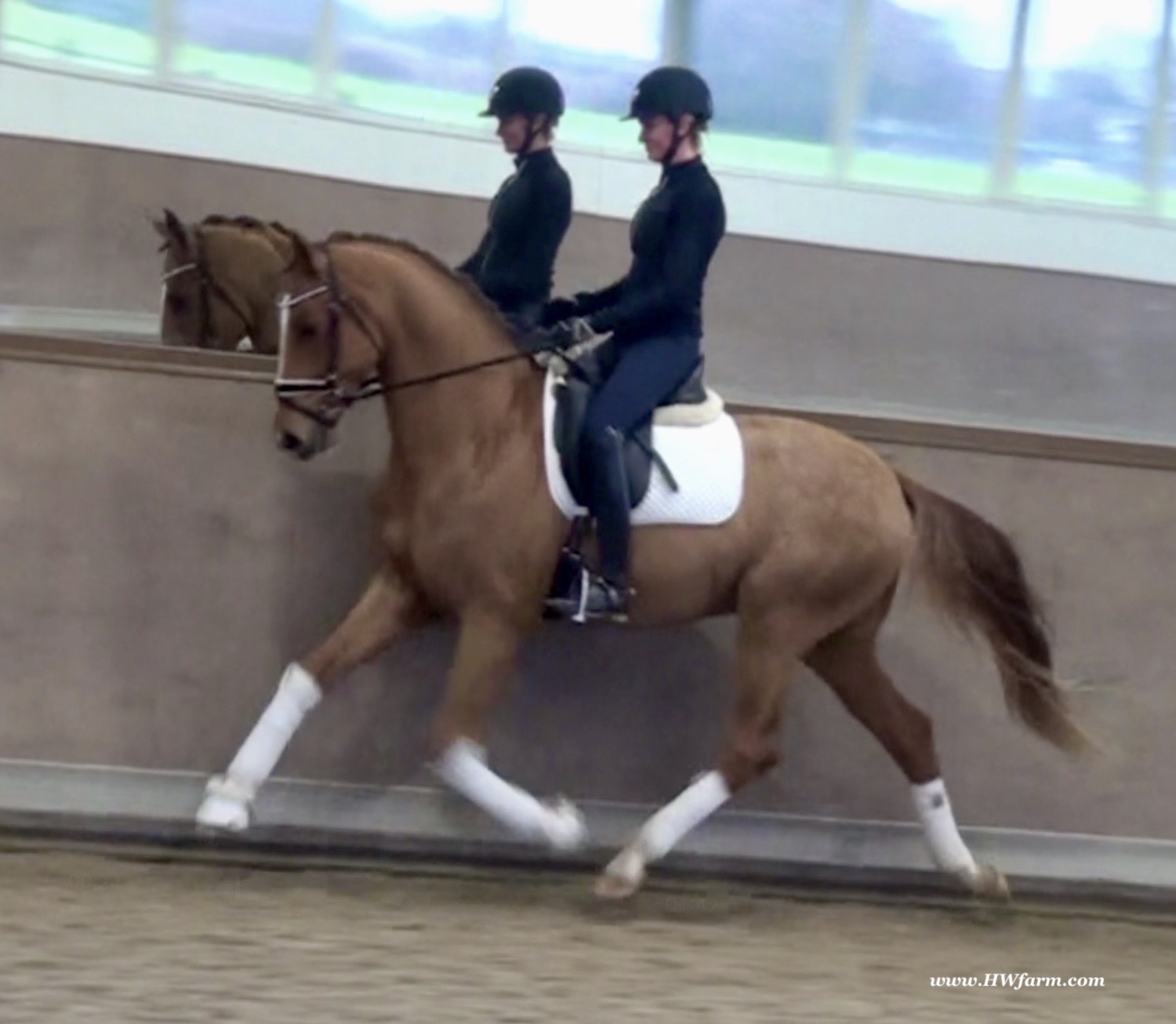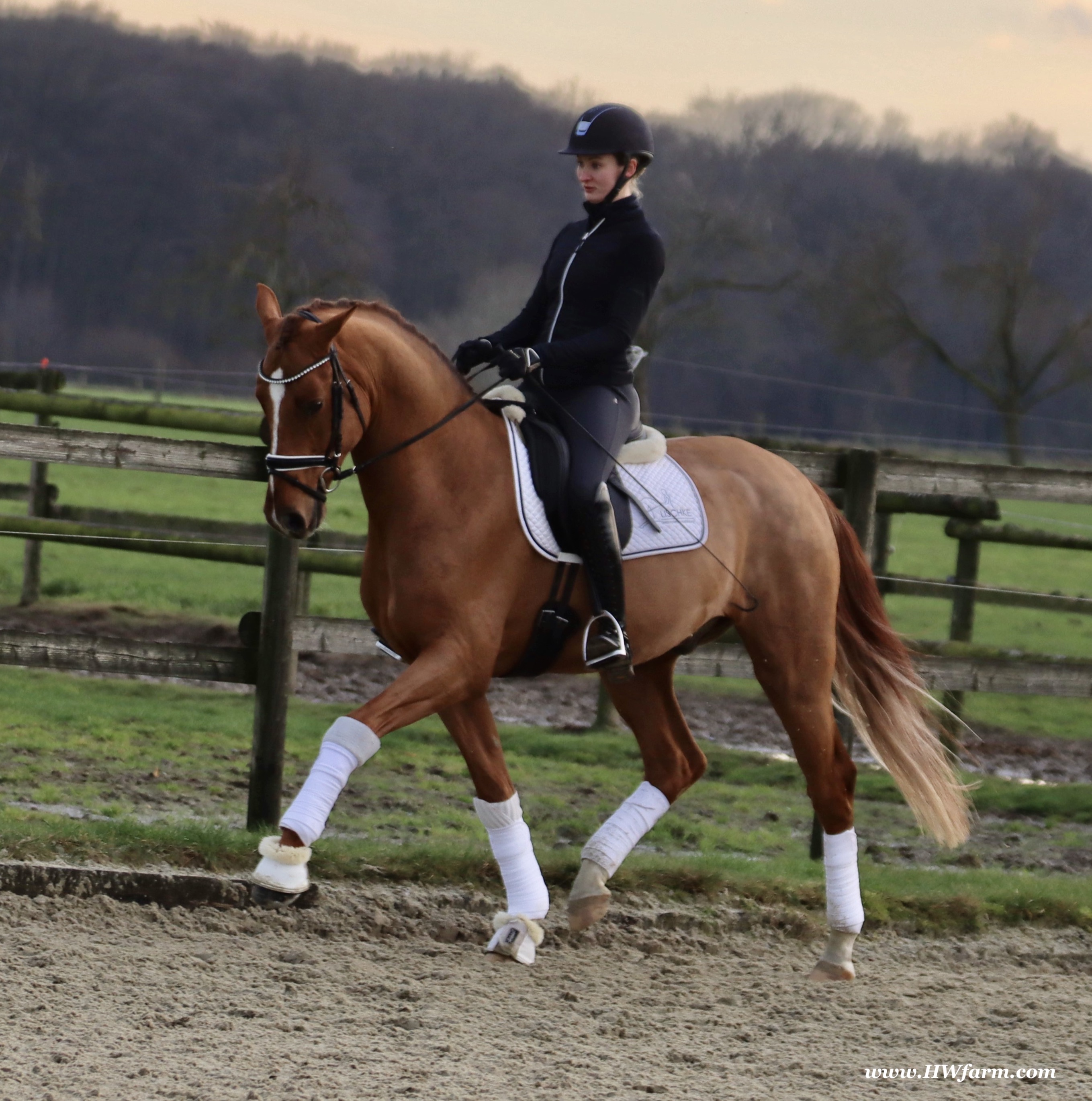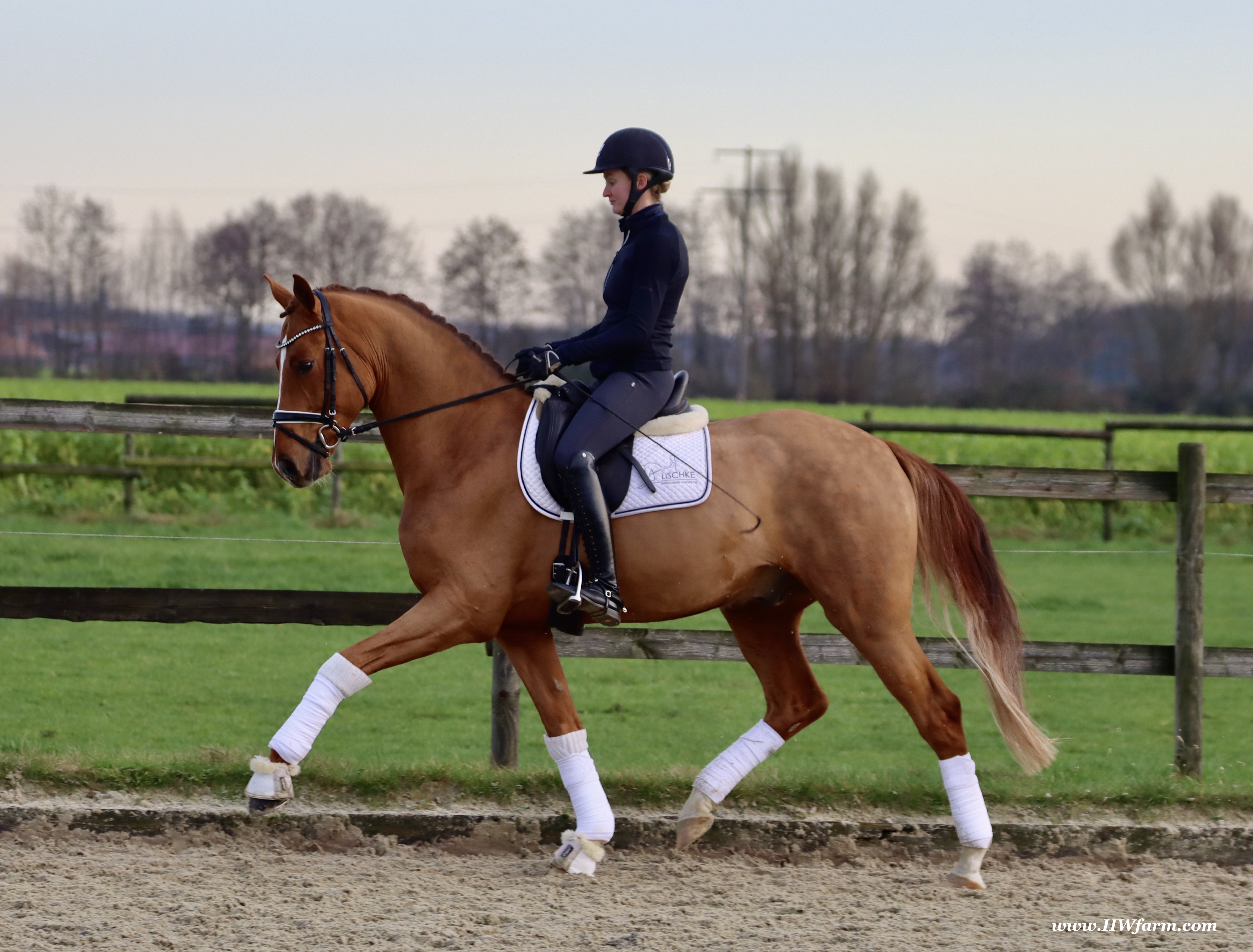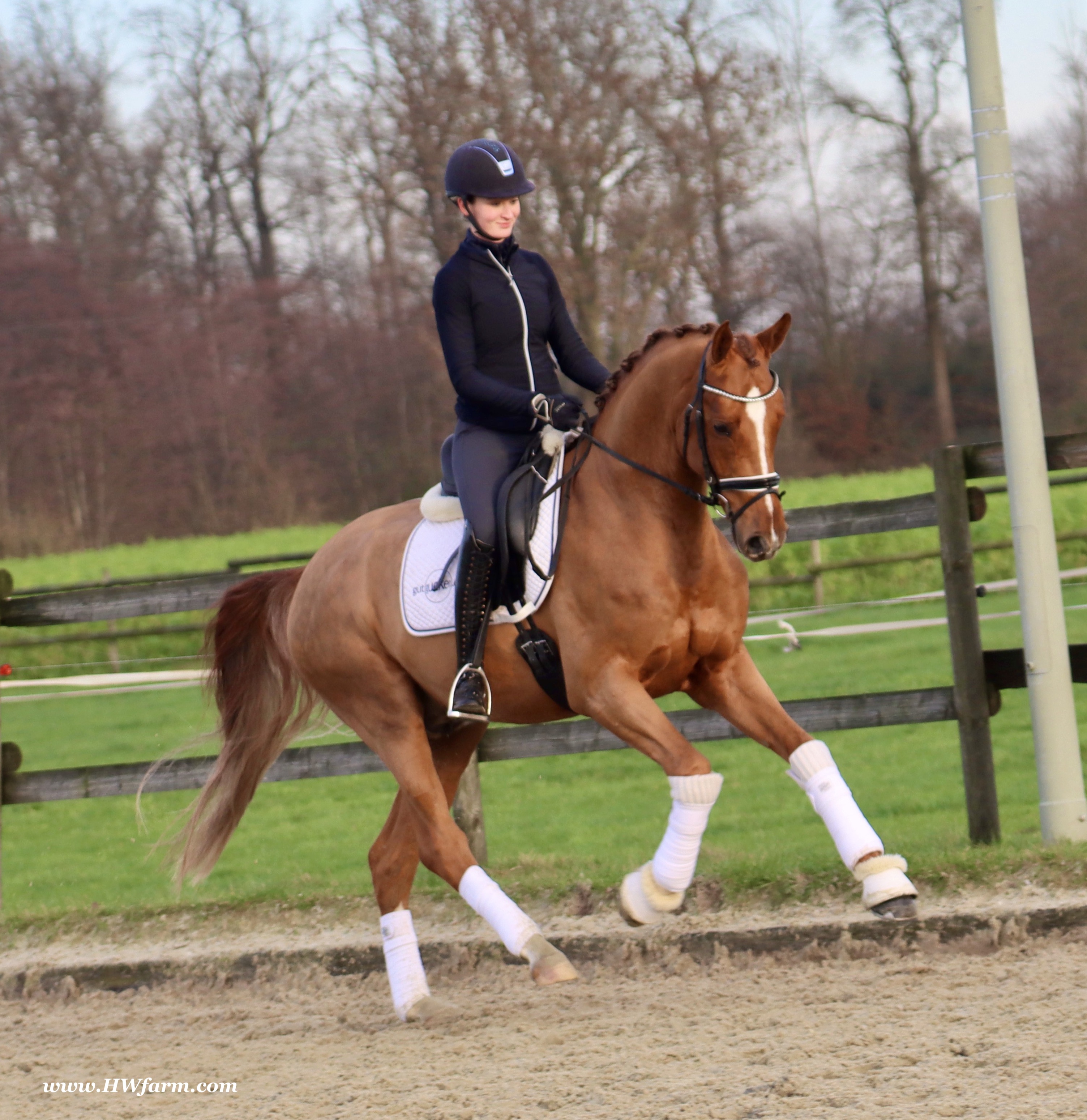Frankly HW, chestnut Westphalian gelding, Franziskus/Dimension born in 2017, standing approximately 168 cm or 16.2 hands. Frankly HW's sire is the premium stallion Franziskus, he impressed the spectators at the Westphalian licensing in 2010. He has a brilliant type, a perfect frame as well as a harmonious and correct exterior. His basic gaits are perfect: He walks with diligence and beat, he trots with impulsion and forward thrust and he canters uphill. Franziskus was already very good as a foal. He won the qualification to the German foal-championships. In 2011 Franziskus absolved the 30-days-test in Münster-Handorf successfully: He got a score of 9.0 for trot, canter and rideability in the training and 9.5 for his character. The test rider gave him even 9.5 points for rideability. Continuing his life of success, Franziskus soon became Bundeschampion of the 4-year-old riding stallions with top marks when he was presented by both his own and by foreign riders in 2012. The Olympic rider Ingrid Klimke began riding Franziskus at the end of 2013 and was victorious with him in his first dressage class for young horses, at "M-level" (the highest class 6-year-olds can compete in Germany). Franziskus is victorious in dressage tests of KL S ** and has been 15 licensed sons. 2015 and 2016, victorious in dressage horse Kl. S ** Inter I under Ingrid Klimke and was a finalist in the Nuernberg Burgpokals/cup. Franziskus' sire Fidertanz began his career by winning the Westphalian licensing and the 30-days-test in Neustadt/Dosse. He was runner up at the "Bundeschampionat" and was the main premium award winner in 2006. Since then, Fidertanz has placed in many advanced dressage classes. His dam, Antara, has also produced the licensed stallion Dementi, who is successful in advanced dressage competitions as well. His Dam's sire, Alabaster, was "Bundeschampion" of young dressage horses. In the third and fourth generation, there are the international sport horses, and important stallions, Rubinstein I and Grundstein. I. The basis of the dam line is the Irish thoroughbred mare Daffy Toban xx (by Go Tobann xx-Mustang xx, family 2). That line produced the sires Count on Me, Grafenstein and Winston hervor, as well as the international sport horses Grand Giraud (Alexandra Simons-de Ridder) and Calman, who won the Grand Prix of Nörten-Hardenberg with Rolf Moormann. Franziskus' sire, Fidertanz, started his phenomenal career in the year 2004 as NRW-Champion Stallion in Münster-Handorf. In 2005, Fidertanz won his 30-day-test in Neustadt/Dosse with excellent results, and became Vice Bundeschampion with a top score of 9.5 in test-riding. In the year 2006, Fidertanz won the High Premium award for dressage-stallions at the Oldenburg-licensing in Vechta. In the meantime, Fidertanz has been trained up to the advanced level in dressage. Franziskus' dam, Antara, produced with De Niro the licensed stallion Dementi, who is successful at the advanced dressage S Level. The dam's sire is the former Bundeschampion of German Dressage Horses, Alabaster. The third and fourth generation of the pedigree is refined by the internationally successful top-stallions Rubinstein I and Grundstein I. The dam line is based on the Irish thoroughbred-mare Daffy Toban xx (v. Go Tabann xx-Mustang xx-Flamenco xx etc,, thoroughbred-familiy 2). Some of the stallions out of this line (which is followed by the breeding-familiy Albers since the mid 1970's) are e.g. Count on Me (PB Denmark), Grafenstein (PB Oldenburg, State Stud Redefin and Marbach), Winston (PB Hannover, State Stud Celle), as well as the international sport horses Grand Giraud/Alexandra Simons-de Ridder and Calman, who won the "Goldene Peitsche" in Nörten-Hardenberg under the saddle of Rolf Moormann. Ingrid Klimke and Franziskus: Frankly HW's dam is by Dimension, a full brother to De Niro! De Niro's sire, Donnerhall, holds the highest dressage breeding value index (271) of all stallions. He placed second among 70 stallions at his performance test and went on to be-come DLG Champion in 1986. Donnerhall won more than 65 FEI Level and Grand Prix competitions and competed successfully until he was retired at 17-years of age. De Niro's dam was a successful dressage competitor producing an Approved stallion in Westfalia. His dam's sire, Akzent II, is regarded as one of the best sires of rideability in modern sport horse breeding producing many Approved stallions and expensive auction horses.