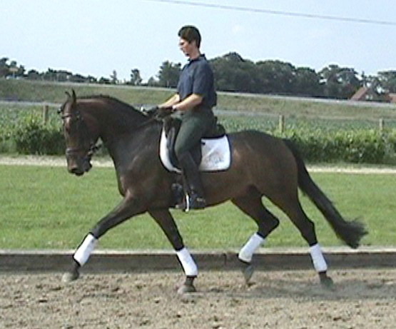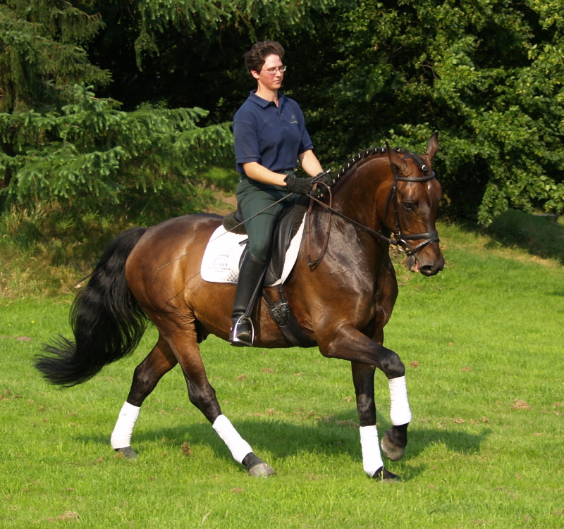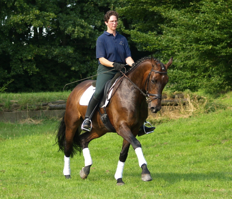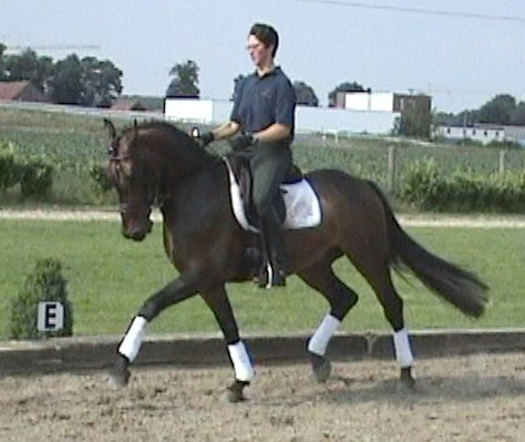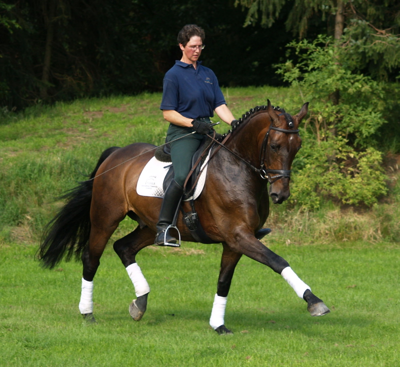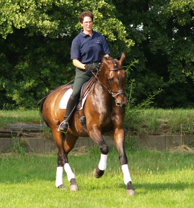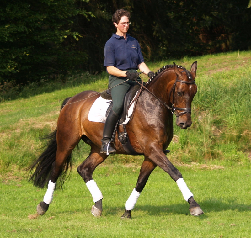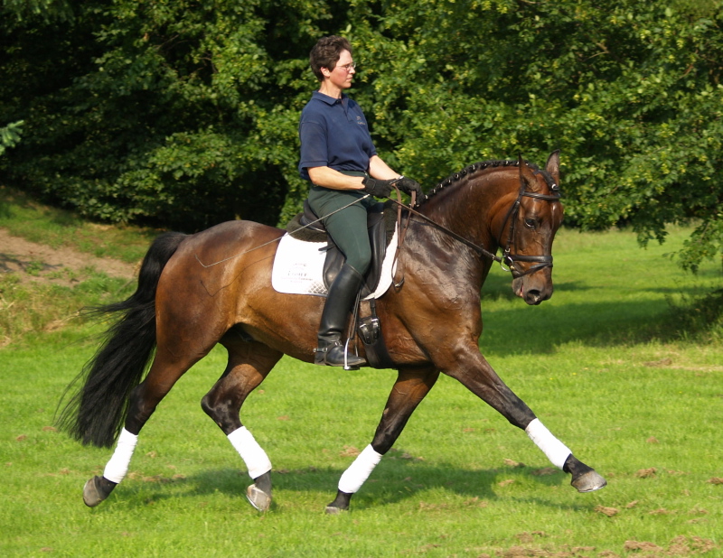 Freedancer, bay Westphalian gelding by Florestan x Rubinstein, born in 2001, standing approximately 16.1 ½ hands Florestan bloodlines are highly desirable, here even combined with Rubinstein, genetics at their best, bred for the dressage ring and athletic enough to go other disciplines as well. His gaits are having the schwung which is needed to be successful and attract the onlookers and he has a good hind leg as well. His flying changes are started and will be confirmed very soon. He is ridden at 2nd level right now, training 3rd. He is a sweet boy, easy to handle and manage and attractive as well as elegant. Freedancer is ready to go to his new owner and impress with his looks and potential for the upper level. This is a horse for everybody alike and for sure a great addition to a show barn as he will collect ribbons for you with his great attitudes and judges will remember him. He has a very good rhythm and is uphill. This boy will continue to learn and compete with ease and fun, hopefully you will be the one guiding him there and getting all the nice compliments you are looking for.