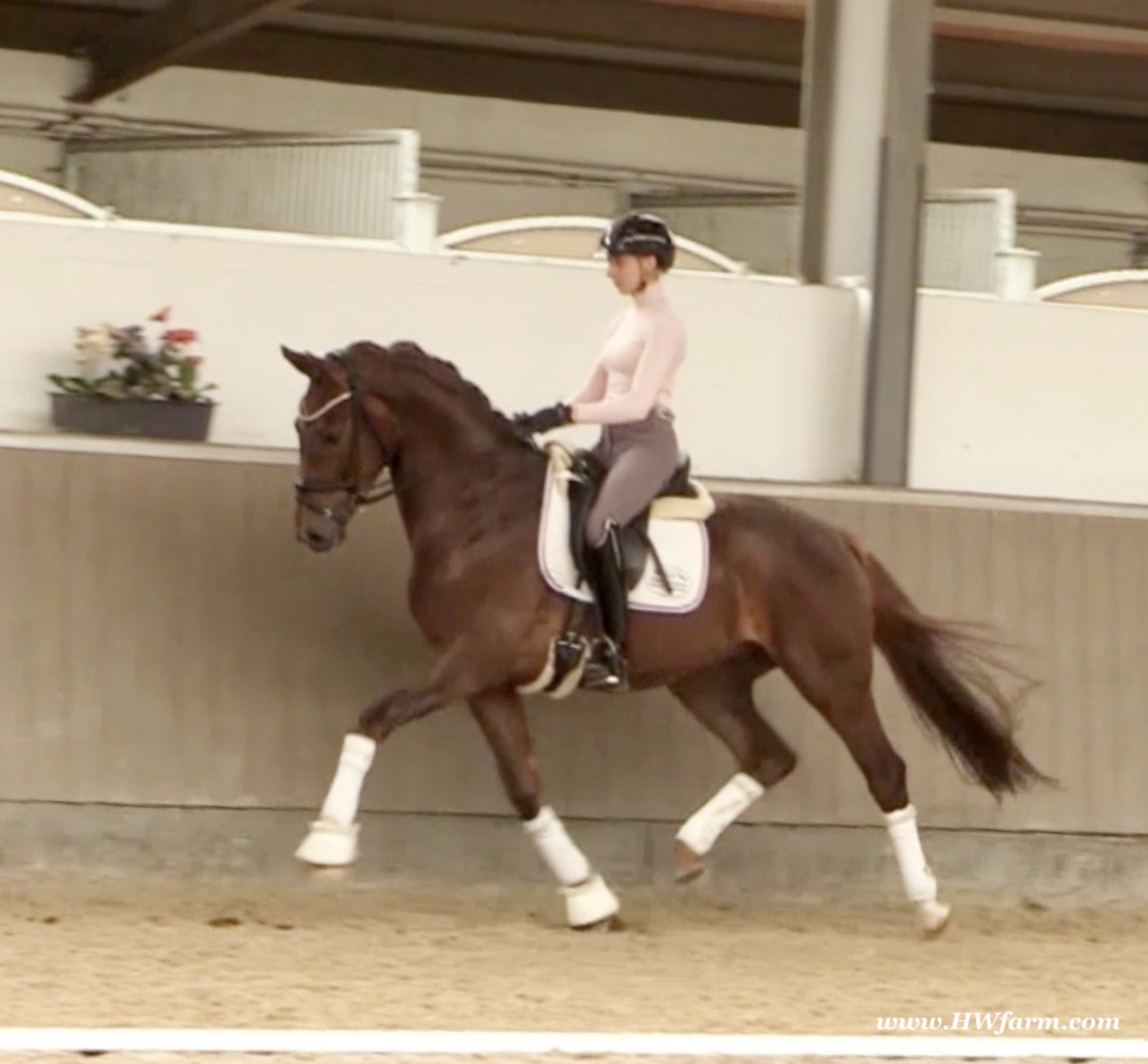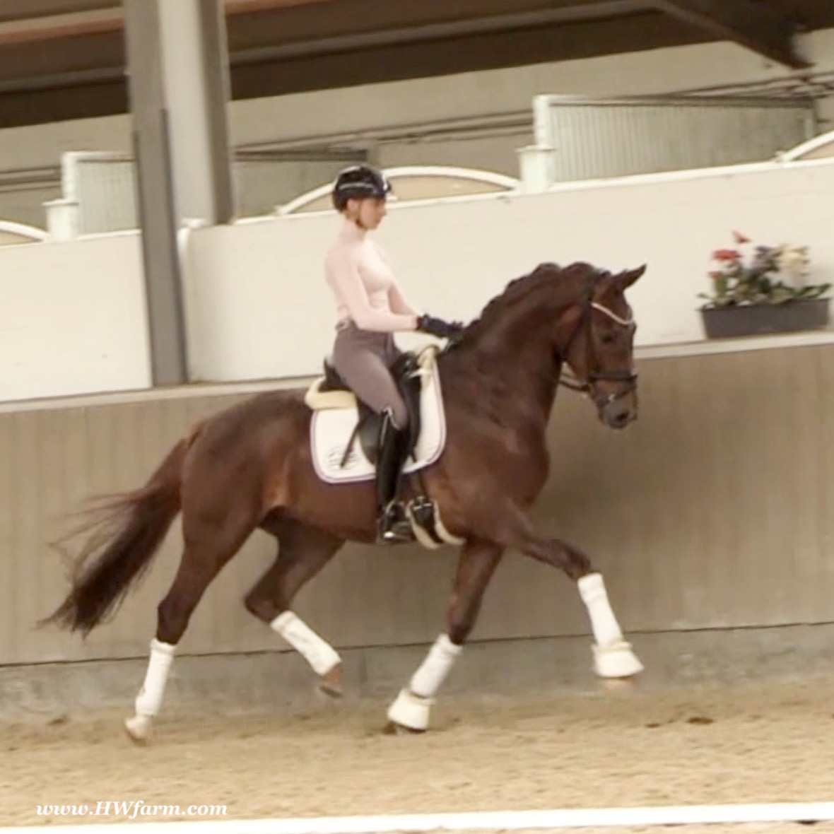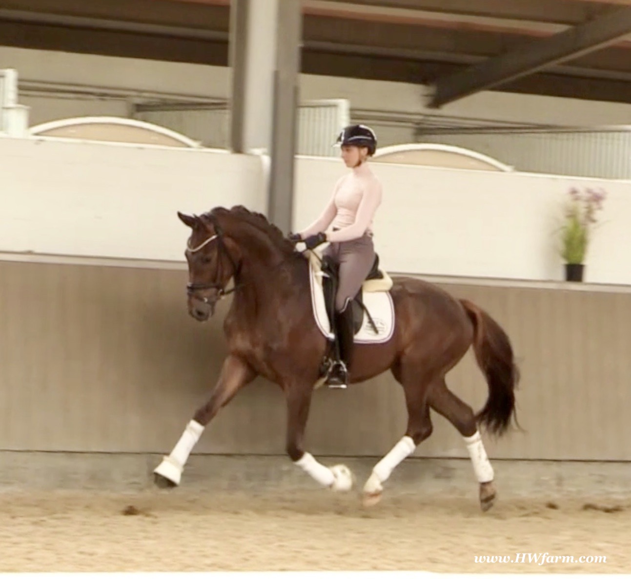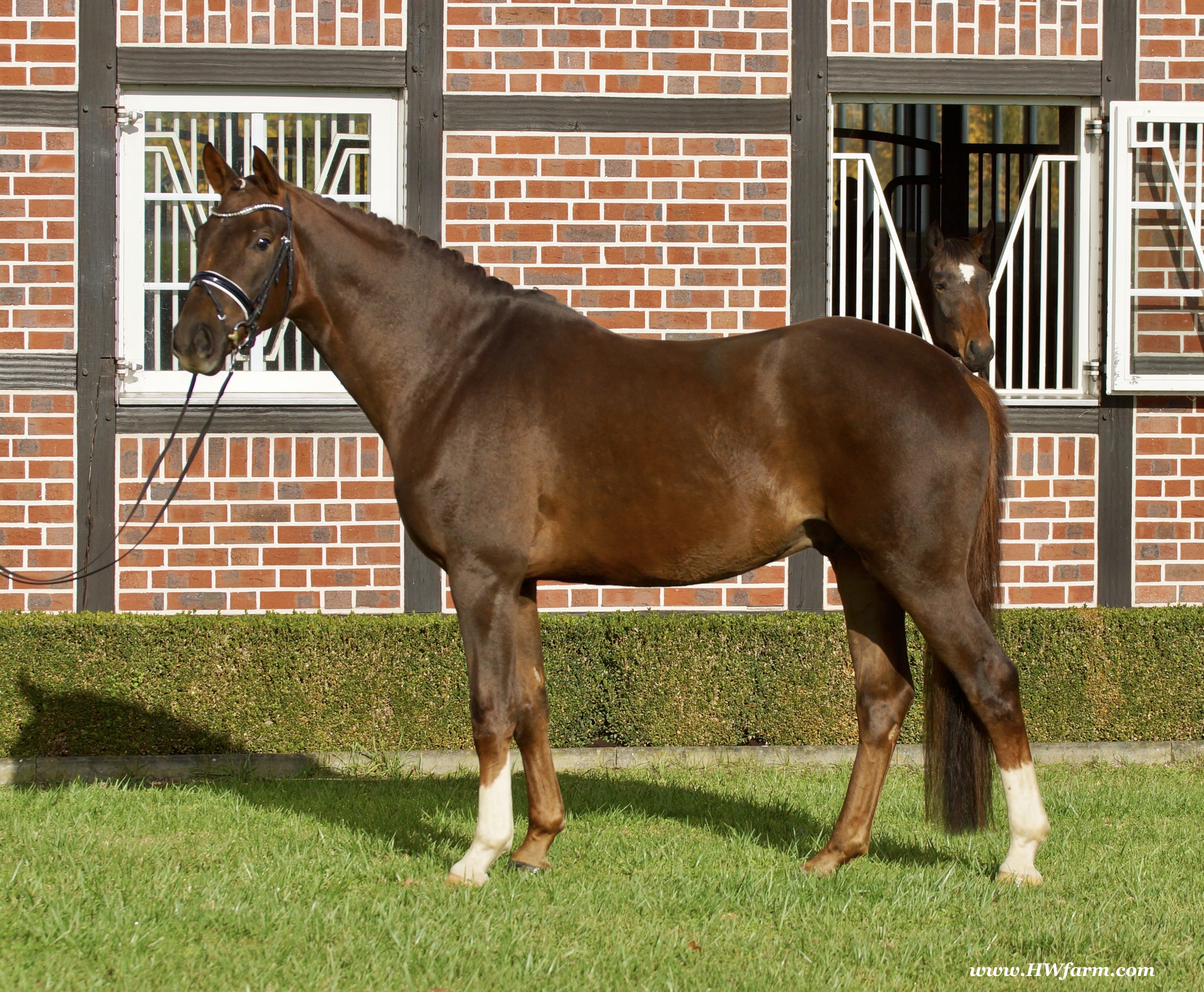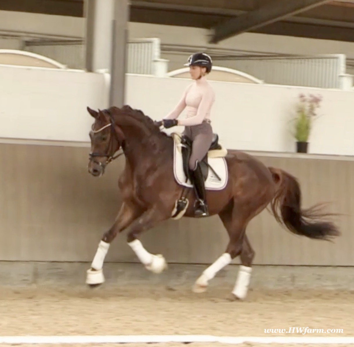 FrontMan HW, chestnut Westphalian gelding, Franziskus/Sir Heinrich born in 2019, standing approximately 167 cm or 16.1 hands. FrontMan HW's sire is the premium stallion Franziskus, he impressed the spectators at the Westphalian licensing in 2010. He has a brilliant type, a perfect frame as well as a harmonious and correct exterior. His basic gaits are perfect: He walks with diligence and beat, he trots with impulsion and forward thrust and he canters uphill. Franziskus was already very good as a foal. He won the qualification to the German foal-championships. In 2011 Franziskus absolved the 30-days-test in Münster-Handorf successfully: He got a score of 9.0 for trot, canter and rideability in the training and 9.5 for his character. The test rider gave him even 9.5 points for rideability. Continuing his life of success, Franziskus soon became Bundeschampion of the 4-year-old riding stallions with top marks when he was presented by both his own and by foreign riders in 2012. The Olympic rider Ingrid Klimke began riding Franziskus at the end of 2013 and was victorious with him in his first dressage class for young horses, at "M-level" (the highest class 6-year-olds can compete in Germany). Franziskus is victorious in dressage tests of KL S ** and has been 15 licensed sons. 2015 and 2016, victorious in dressage horse Kl. S ** Inter I under Ingrid Klimke and was a finalist in the Nuernberg Burgpokals/cup. •