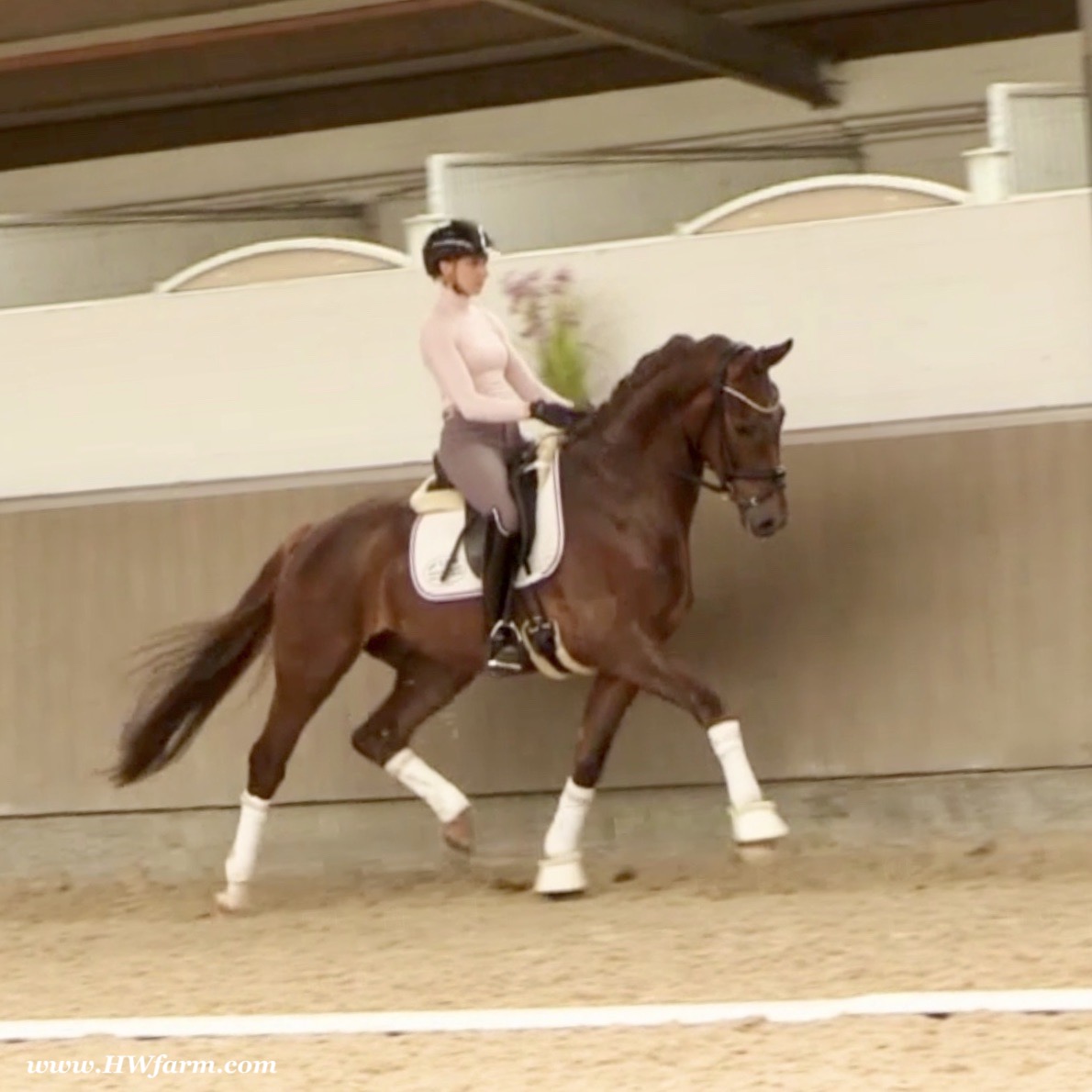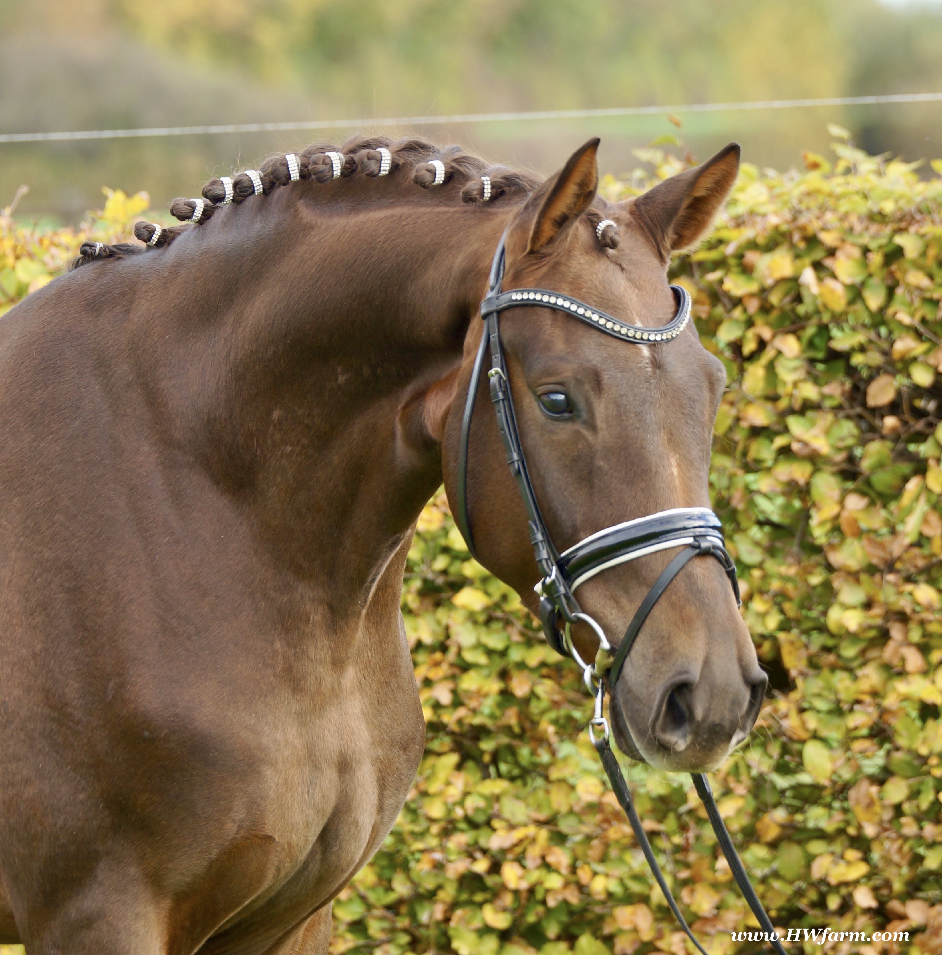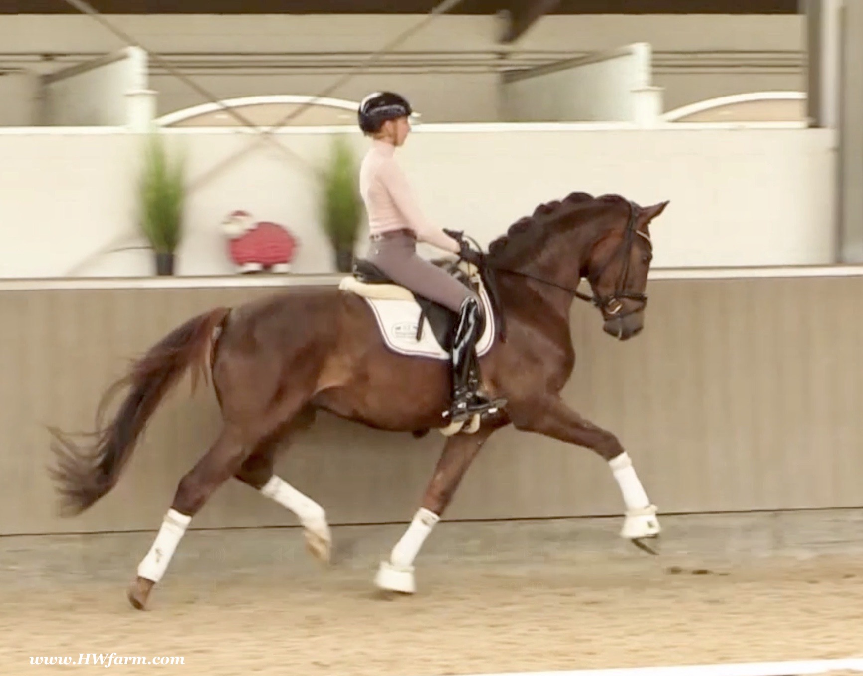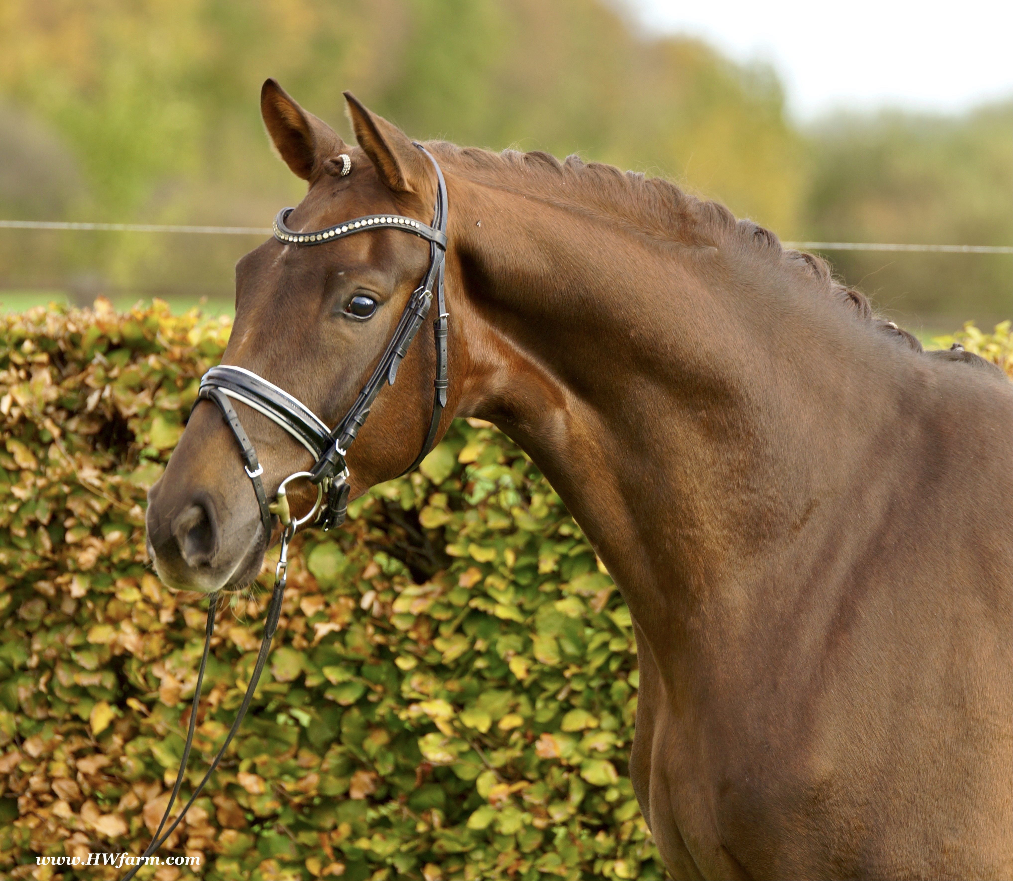 FrontMan HW, chestnut Westphalian gelding, Franziskus/Sir Heinrich born in 2019, standing approximately 167 cm or 16.1 hands. FrontMan HW's sire is the premium stallion Franziskus, he impressed the spectators at the Westphalian licensing in 2010. He has a brilliant type, a perfect frame as well as a harmonious and correct exterior. His basic gaits are perfect: He walks with diligence and beat, he trots with impulsion and forward thrust and he canters uphill. Franziskus was already very good as a foal. He won the qualification to the German foal-championships. In 2011 Franziskus absolved the 30-days-test in Münster-Handorf successfully: He got a score of 9.0 for trot, canter and rideability in the training and 9.5 for his character. The test rider gave him even 9.5 points for rideability. Continuing his life of success, Franziskus soon became Bundeschampion of the 4-year-old riding stallions with top marks when he was presented by both his own and by foreign riders in 2012. The Olympic rider Ingrid Klimke began riding Franziskus at the end of 2013 and was victorious with him in his first dressage class for young horses, at "M-level" (the highest class 6-year-olds can compete in Germany). Franziskus is victorious in dressage tests of KL S ** and has been 15 licensed sons. 2015 and 2016, victorious in dressage horse Kl. S ** Inter I under Ingrid Klimke and was a finalist in the Nuernberg Burgpokals/cup. •