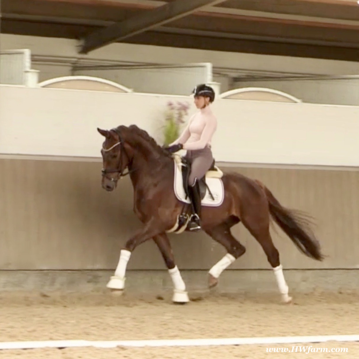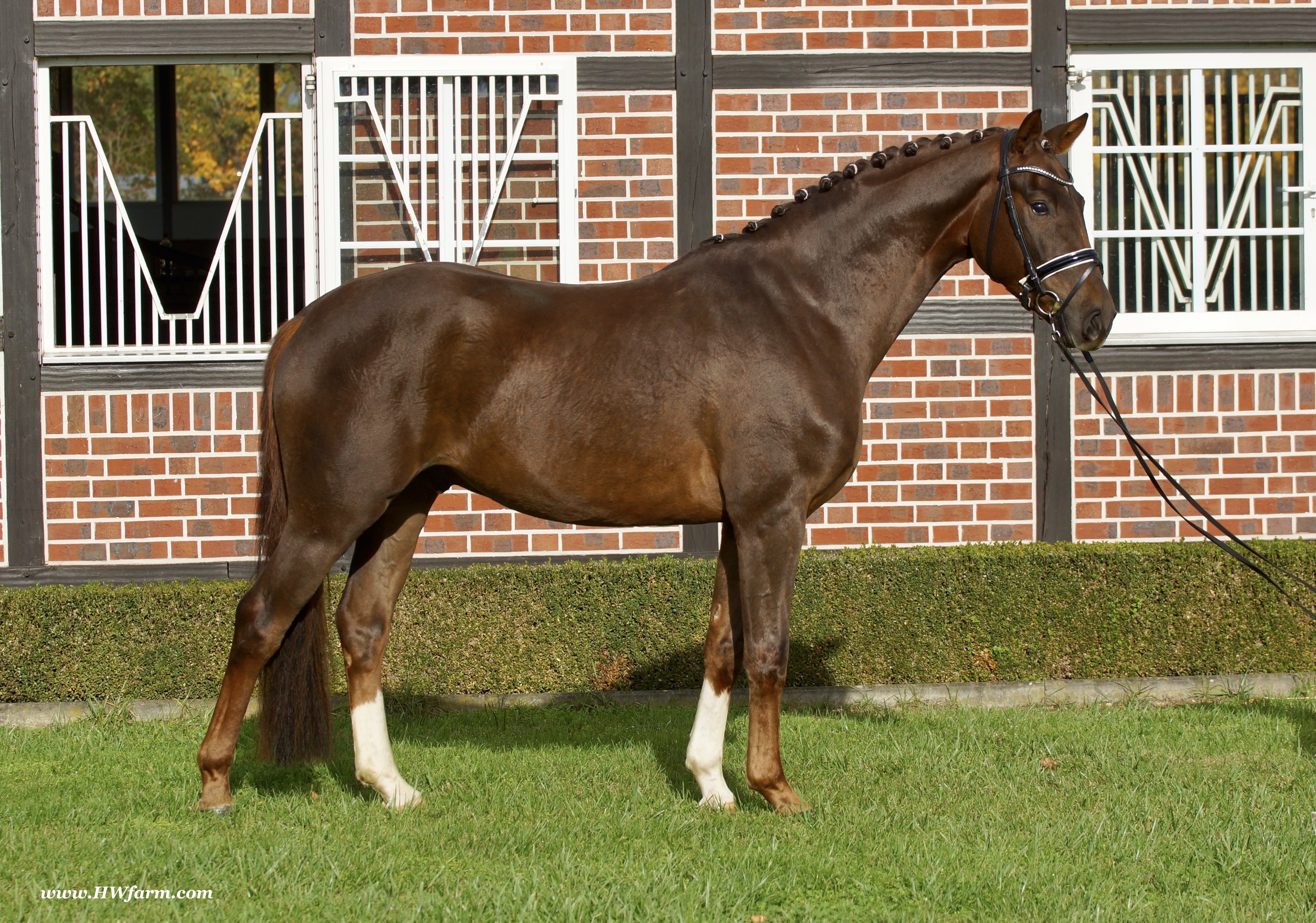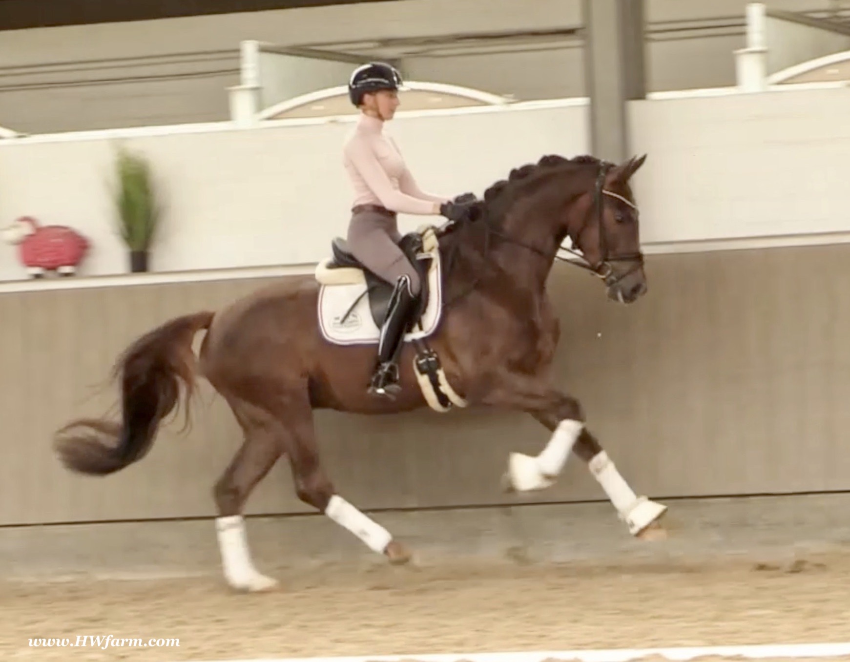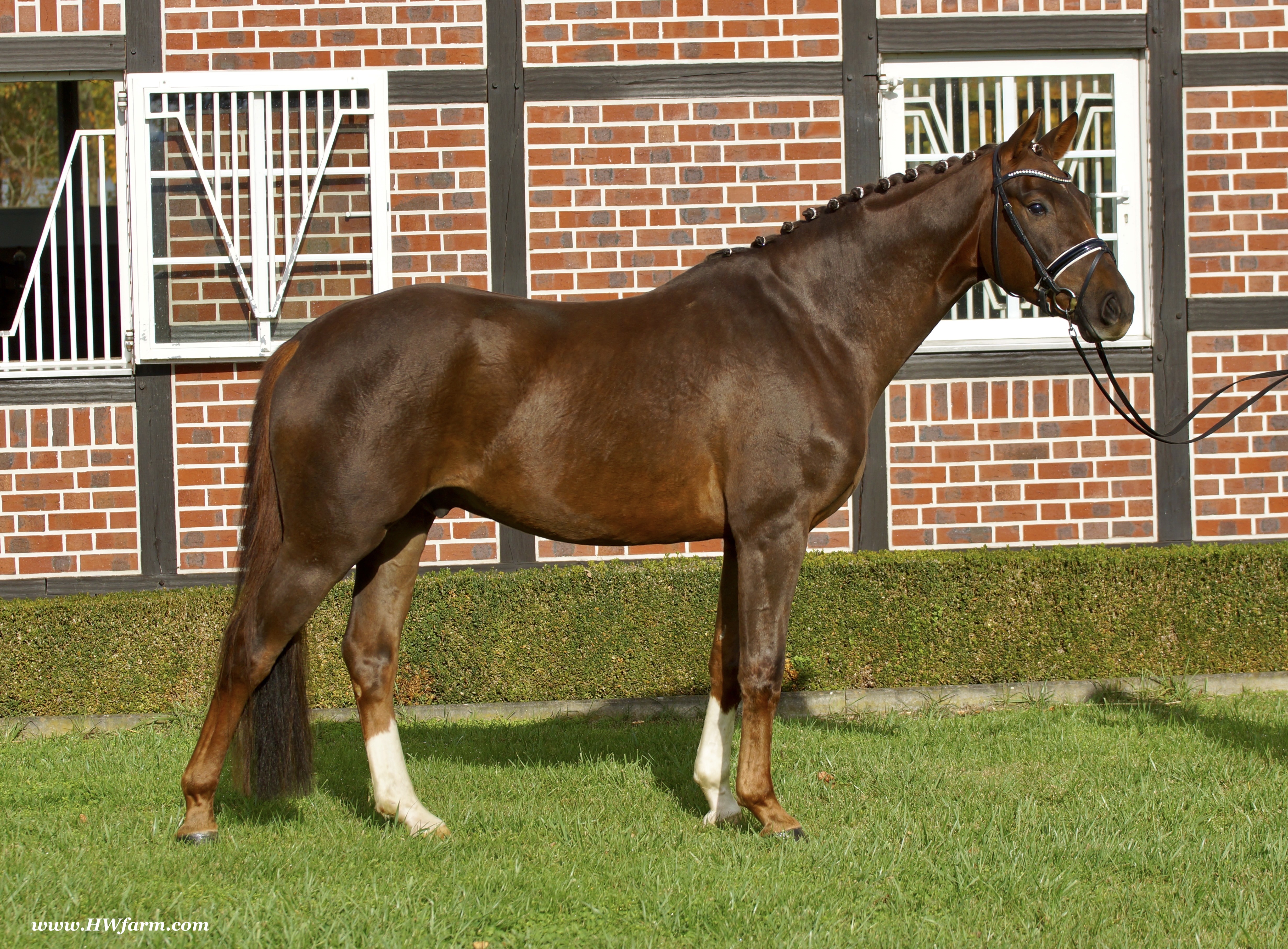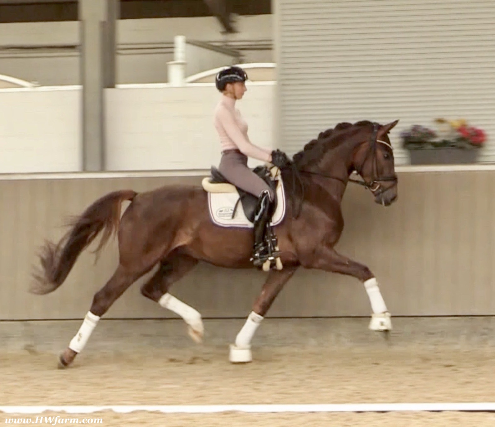 FrontMan HW, chestnut Westphalian gelding, Franziskus/Sir Heinrich born in 2019, standing approximately 167 cm or 16.1 hands. FrontMan HW's sire is the premium stallion Franziskus, he impressed the spectators at the Westphalian licensing in 2010. He has a brilliant type, a perfect frame as well as a harmonious and correct exterior. His basic gaits are perfect: He walks with diligence and beat, he trots with impulsion and forward thrust and he canters uphill. Franziskus was already very good as a foal. He won the qualification to the German foal-championships. In 2011 Franziskus absolved the 30-days-test in Münster-Handorf successfully: He got a score of 9.0 for trot, canter and rideability in the training and 9.5 for his character. The test rider gave him even 9.5 points for rideability. Continuing his life of success, Franziskus soon became Bundeschampion of the 4-year-old riding stallions with top marks when he was presented by both his own and by foreign riders in 2012. The Olympic rider Ingrid Klimke began riding Franziskus at the end of 2013 and was victorious with him in his first dressage class for young horses, at "M-level" (the highest class 6-year-olds can compete in Germany). Franziskus is victorious in dressage tests of KL S ** and has been 15 licensed sons. 2015 and 2016, victorious in dressage horse Kl. S ** Inter I under Ingrid Klimke and was a finalist in the Nuernberg Burgpokals/cup. •