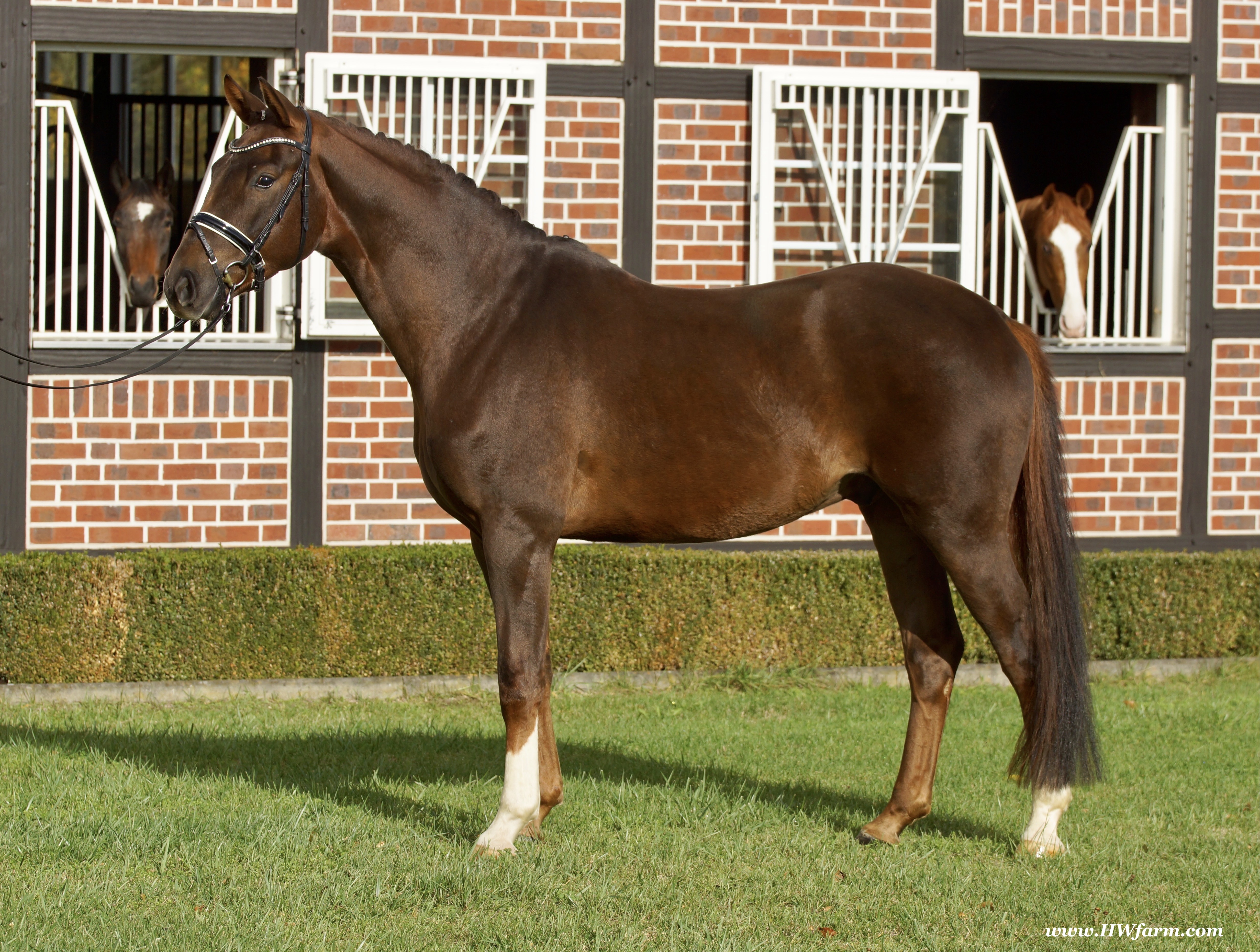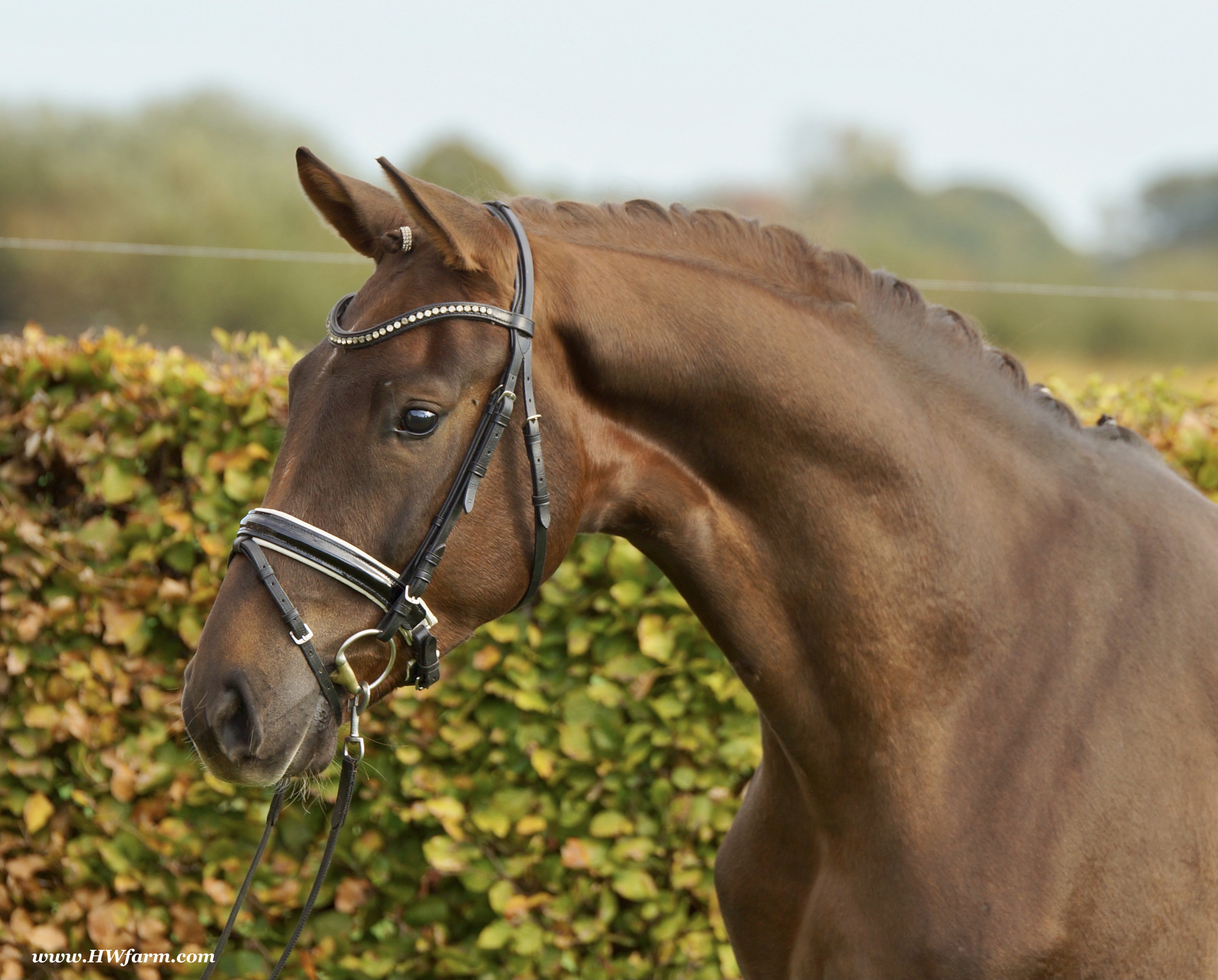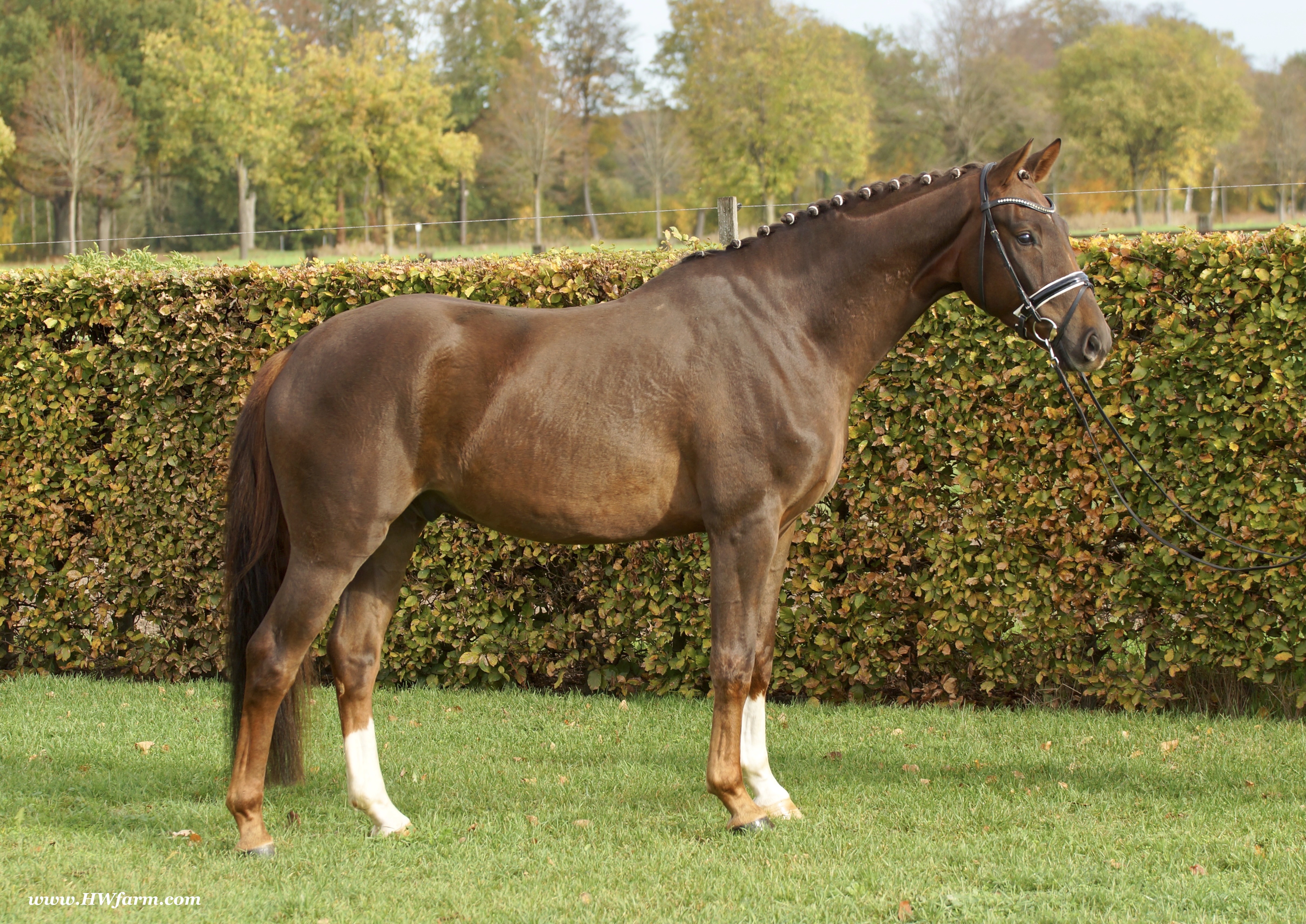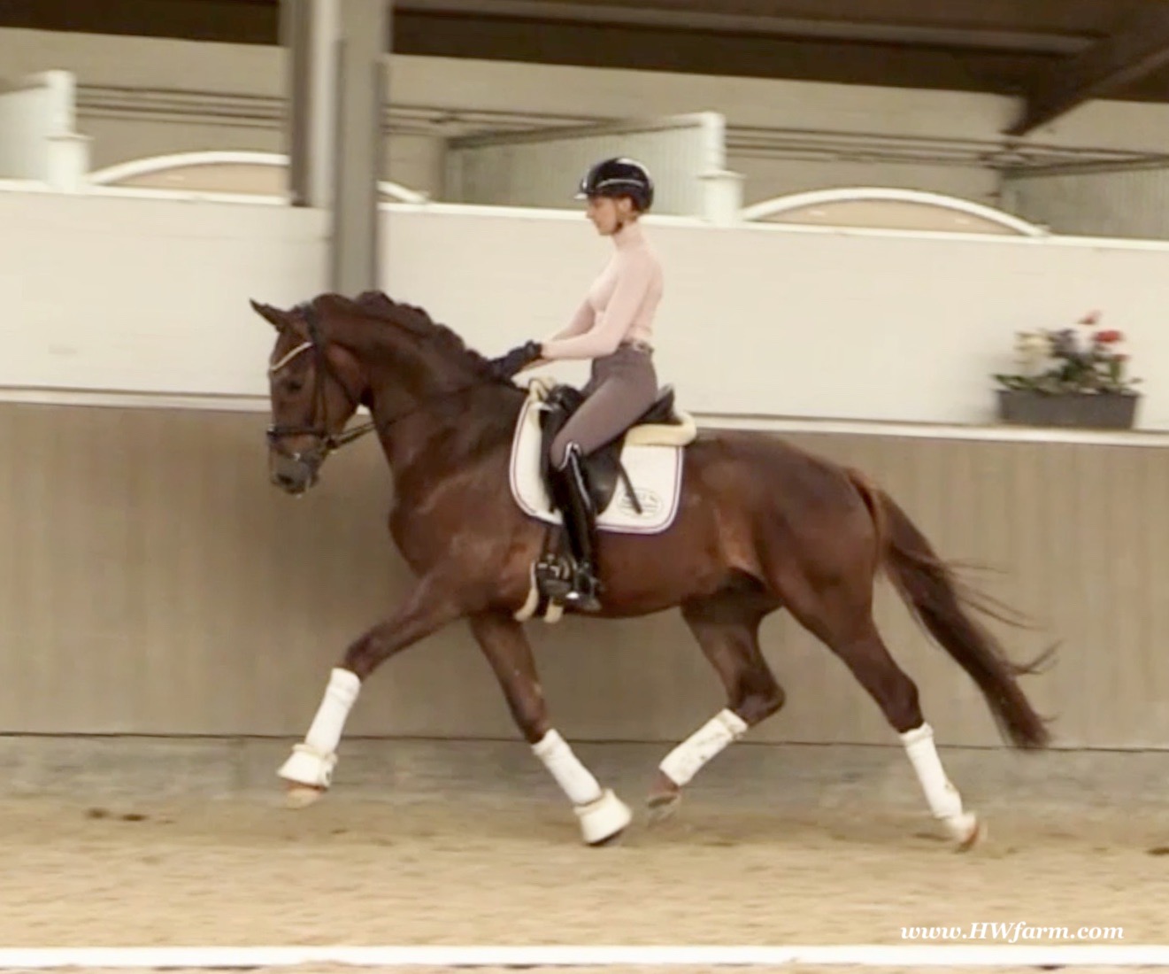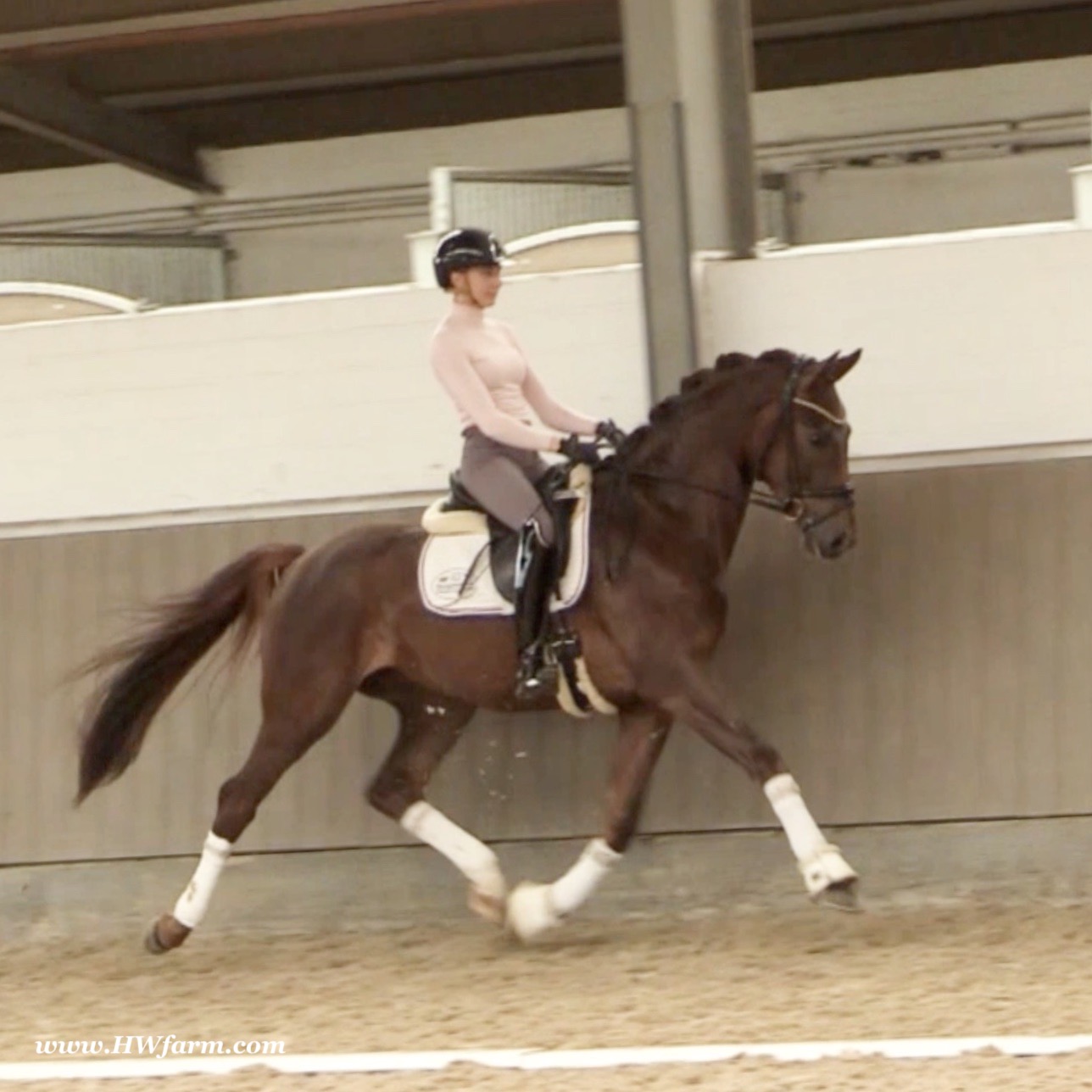 FrontMan HW, chestnut Westphalian gelding, Franziskus/Sir Heinrich born in 2019, standing approximately 167 cm or 16.1 hands. FrontMan HW's sire is the premium stallion Franziskus, he impressed the spectators at the Westphalian licensing in 2010. He has a brilliant type, a perfect frame as well as a harmonious and correct exterior. His basic gaits are perfect: He walks with diligence and beat, he trots with impulsion and forward thrust and he canters uphill. Franziskus was already very good as a foal. He won the qualification to the German foal-championships. In 2011 Franziskus absolved the 30-days-test in Münster-Handorf successfully: He got a score of 9.0 for trot, canter and rideability in the training and 9.5 for his character. The test rider gave him even 9.5 points for rideability. Continuing his life of success, Franziskus soon became Bundeschampion of the 4-year-old riding stallions with top marks when he was presented by both his own and by foreign riders in 2012. The Olympic rider Ingrid Klimke began riding Franziskus at the end of 2013 and was victorious with him in his first dressage class for young horses, at "M-level" (the highest class 6-year-olds can compete in Germany). Franziskus is victorious in dressage tests of KL S ** and has been 15 licensed sons. 2015 and 2016, victorious in dressage horse Kl. S ** Inter I under Ingrid Klimke and was a finalist in the Nuernberg Burgpokals/cup. •