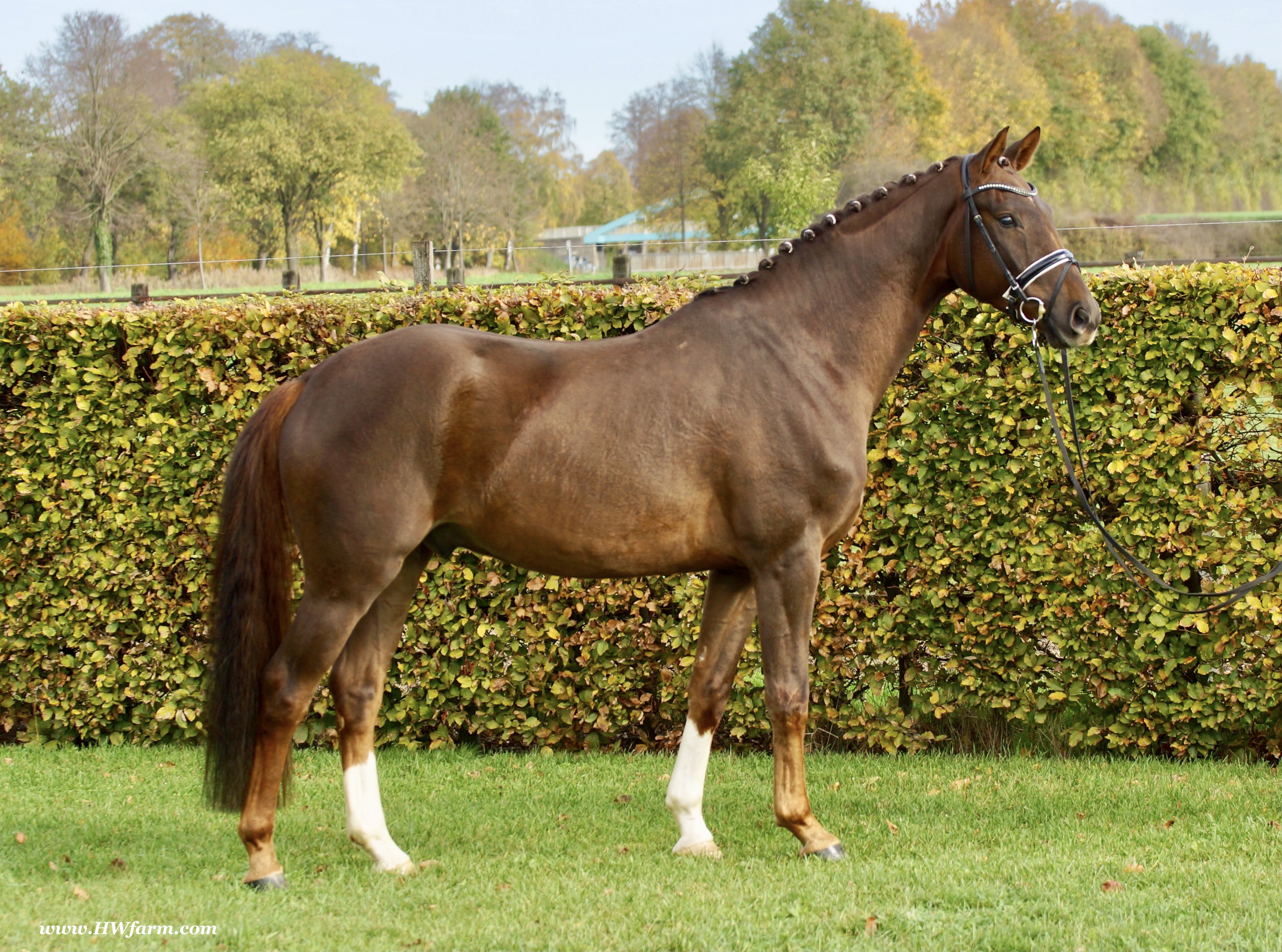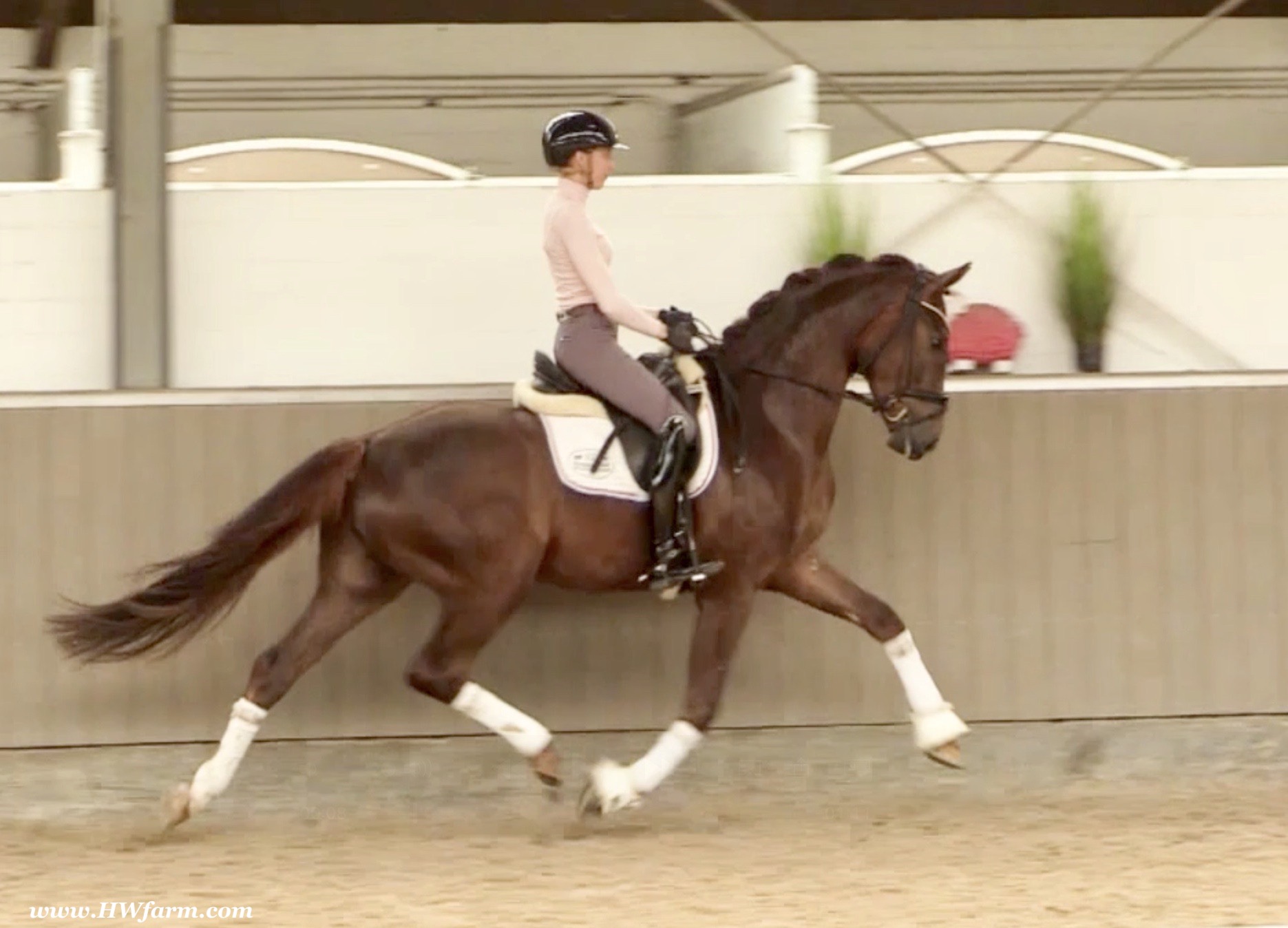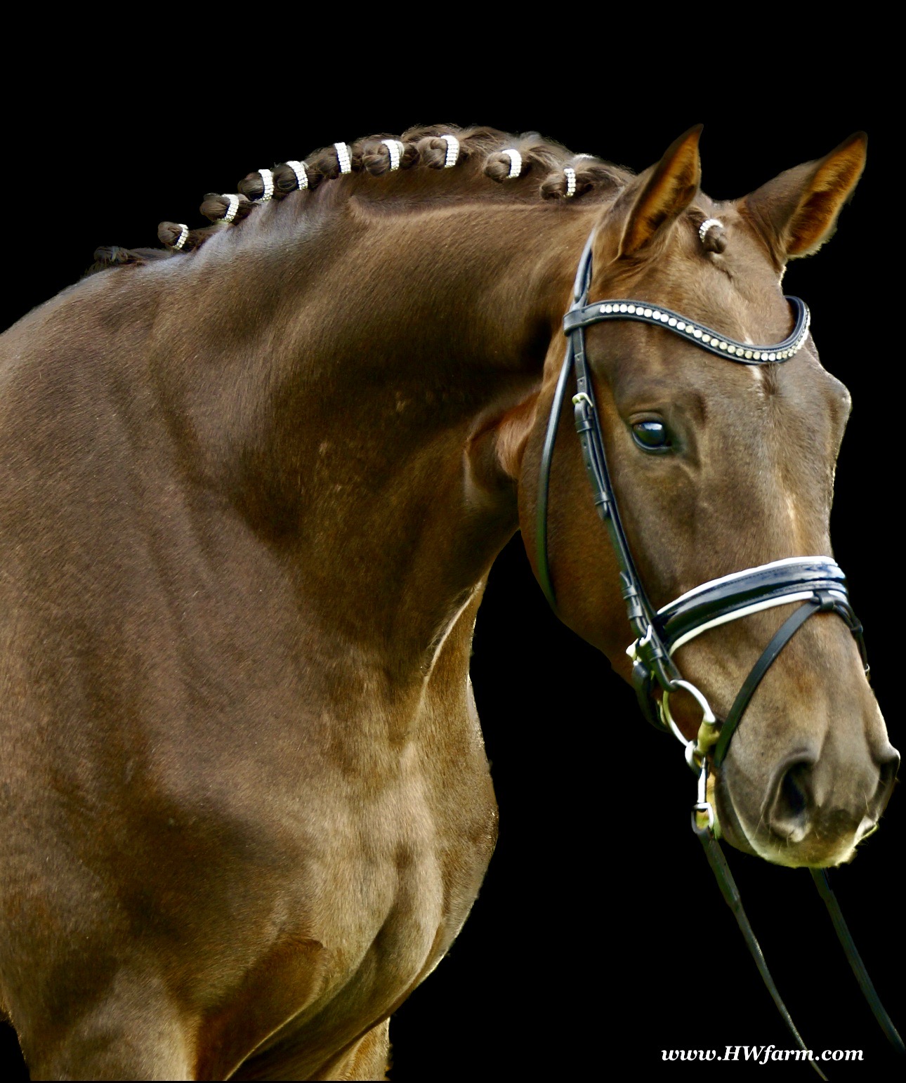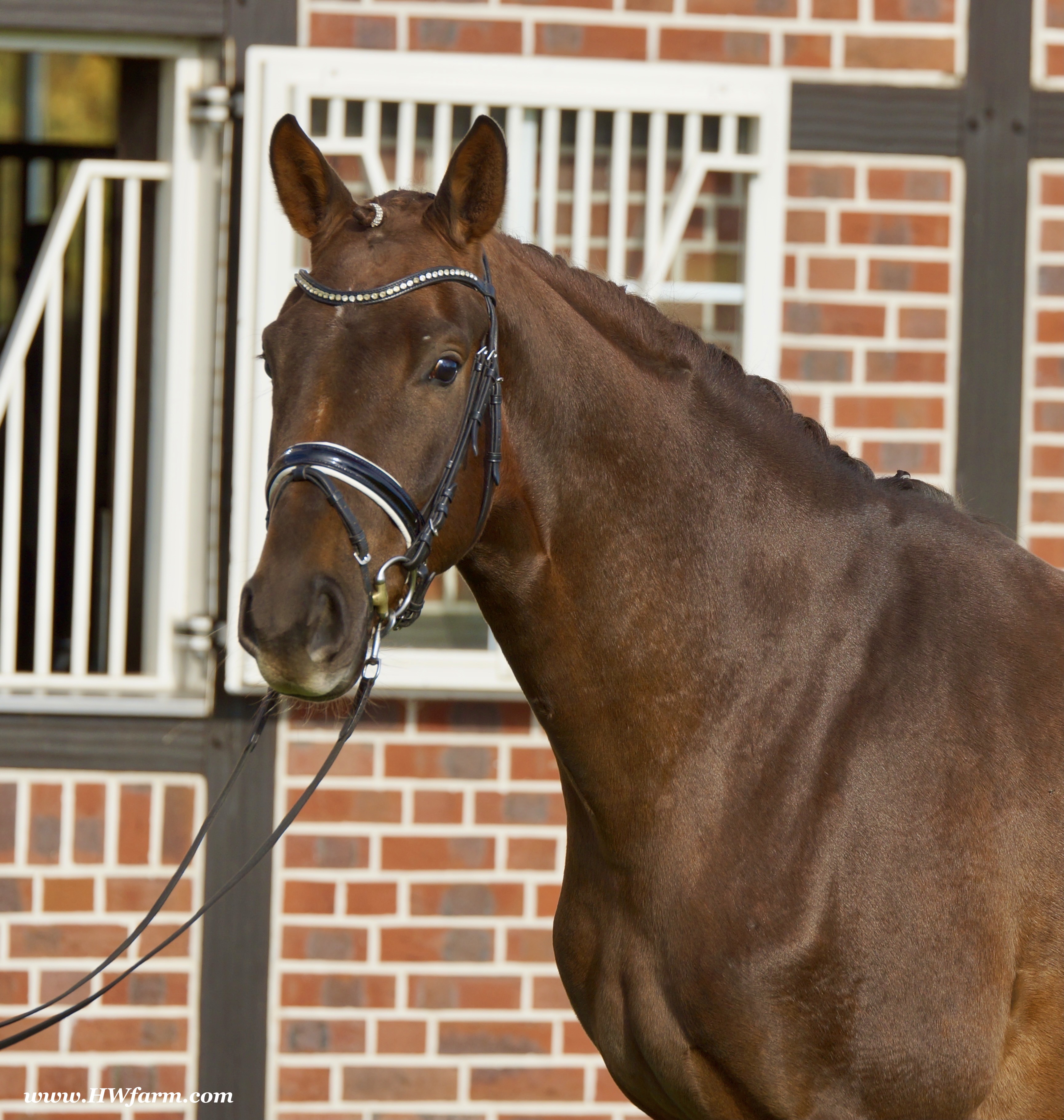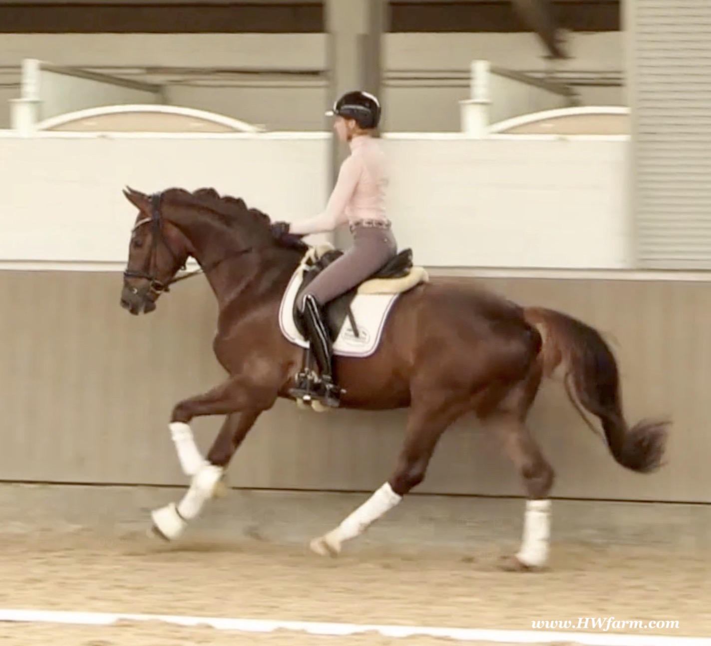 FrontMan HW, chestnut Westphalian gelding, Franziskus/Sir Heinrich born in 2019, standing approximately 167 cm or 16.1 hands. FrontMan HW's sire is the premium stallion Franziskus, he impressed the spectators at the Westphalian licensing in 2010. He has a brilliant type, a perfect frame as well as a harmonious and correct exterior. His basic gaits are perfect: He walks with diligence and beat, he trots with impulsion and forward thrust and he canters uphill. Franziskus was already very good as a foal. He won the qualification to the German foal-championships. In 2011 Franziskus absolved the 30-days-test in Münster-Handorf successfully: He got a score of 9.0 for trot, canter and rideability in the training and 9.5 for his character. The test rider gave him even 9.5 points for rideability. Continuing his life of success, Franziskus soon became Bundeschampion of the 4-year-old riding stallions with top marks when he was presented by both his own and by foreign riders in 2012. The Olympic rider Ingrid Klimke began riding Franziskus at the end of 2013 and was victorious with him in his first dressage class for young horses, at "M-level" (the highest class 6-year-olds can compete in Germany). Franziskus is victorious in dressage tests of KL S ** and has been 15 licensed sons. 2015 and 2016, victorious in dressage horse Kl. S ** Inter I under Ingrid Klimke and was a finalist in the Nuernberg Burgpokals/cup. •