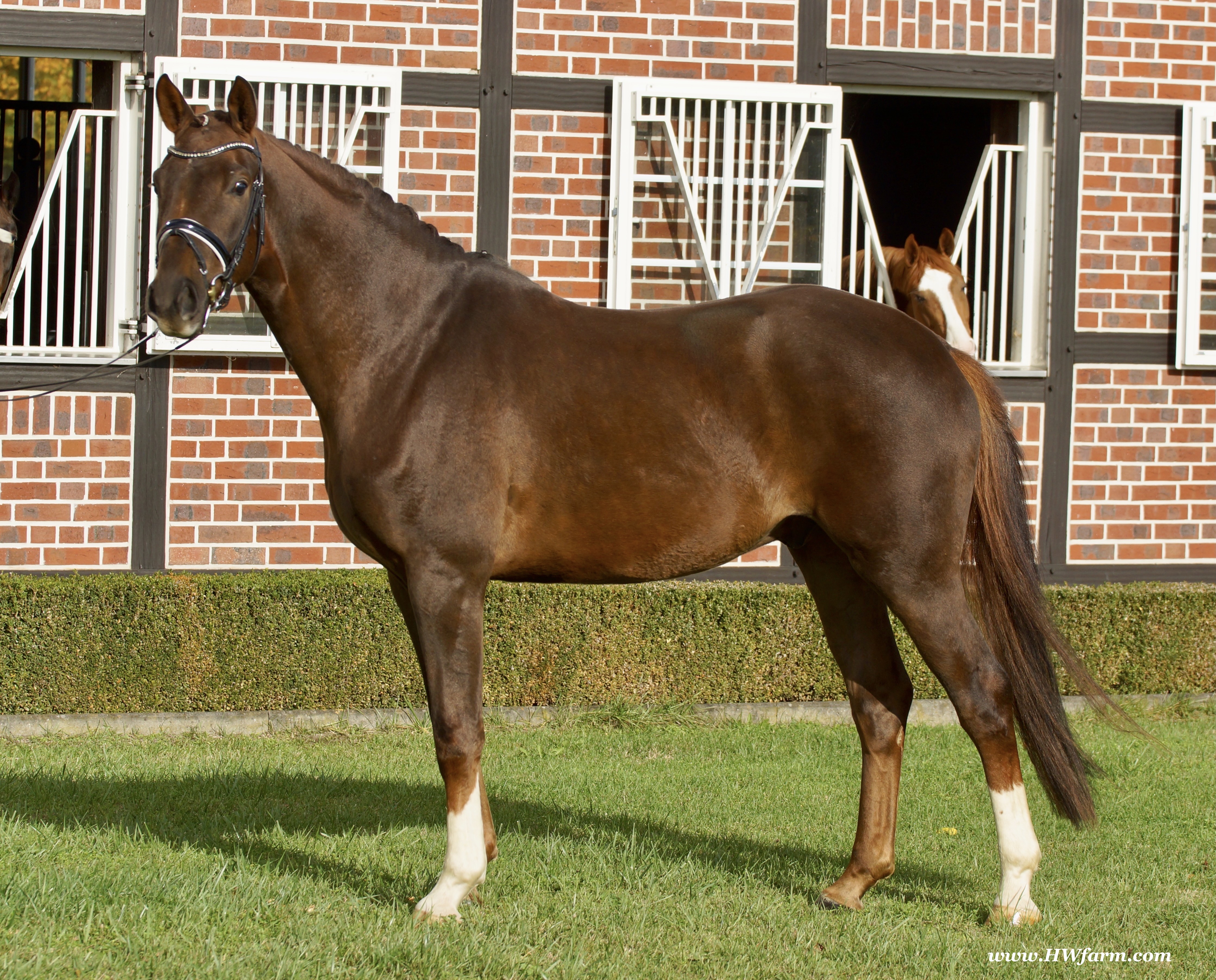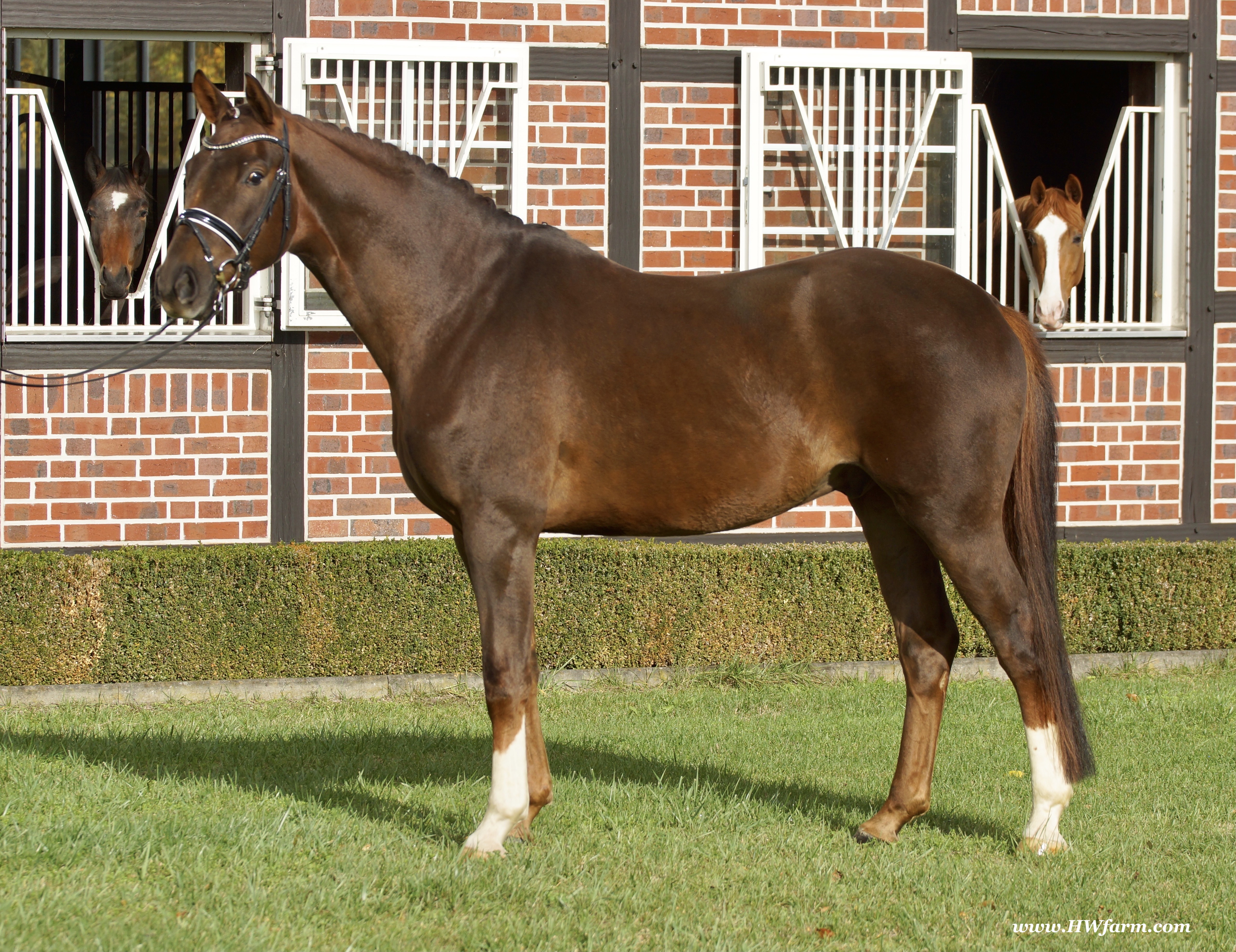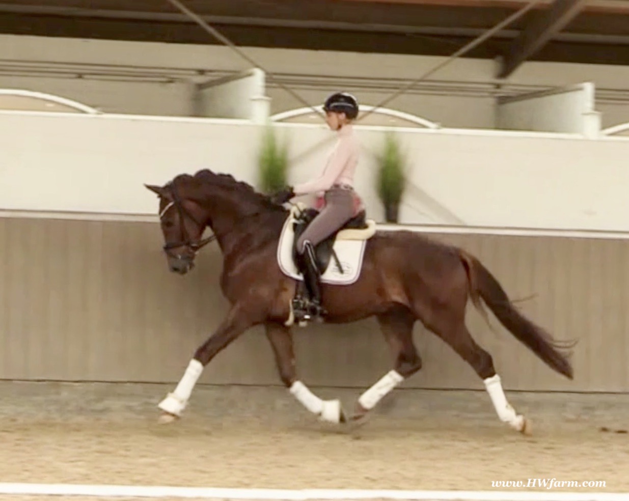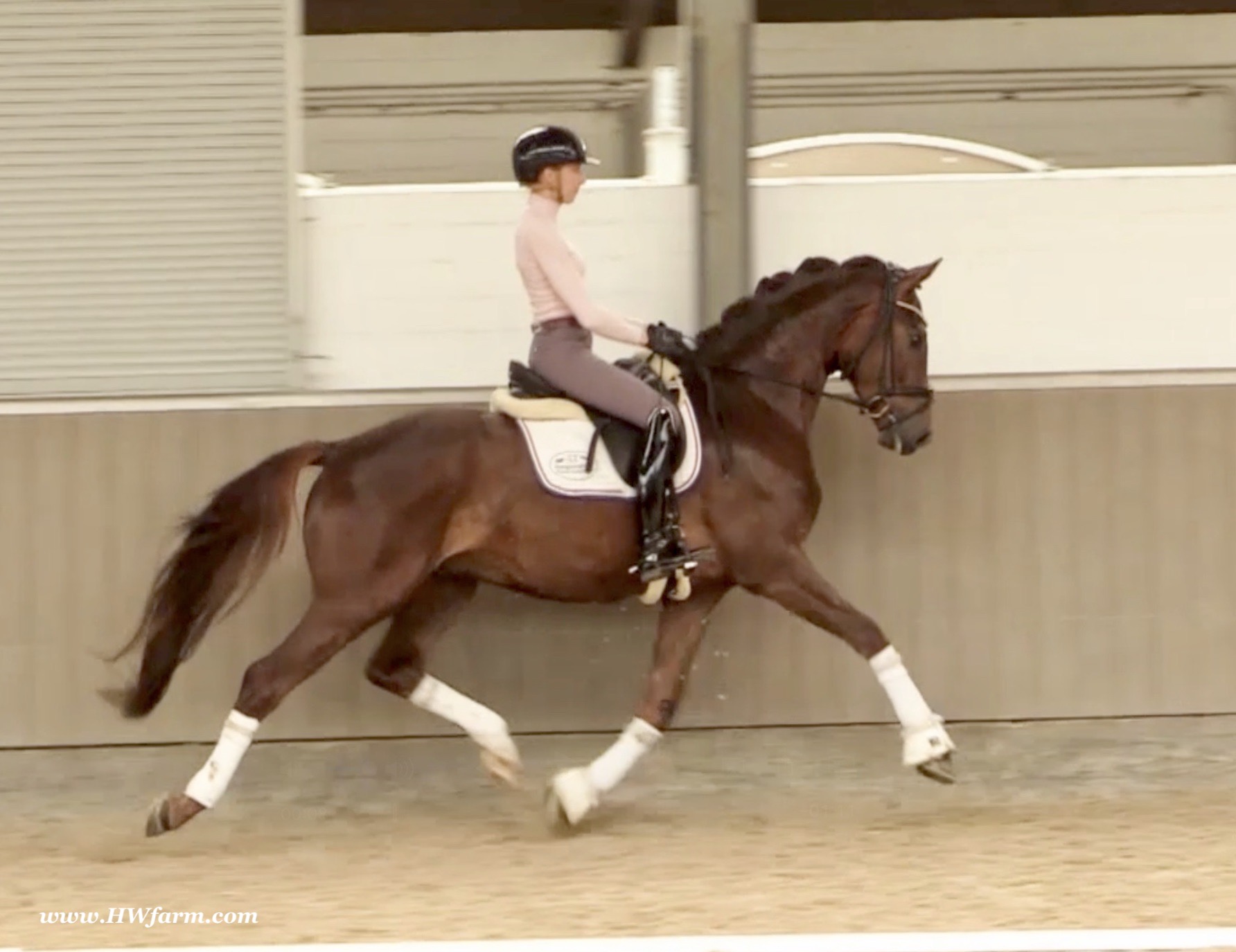 FrontMan HW, chestnut Westphalian gelding, Franziskus/Sir Heinrich born in 2019, standing approximately 167 cm or 16.1 hands. FrontMan HW's sire is the premium stallion Franziskus, he impressed the spectators at the Westphalian licensing in 2010. He has a brilliant type, a perfect frame as well as a harmonious and correct exterior. His basic gaits are perfect: He walks with diligence and beat, he trots with impulsion and forward thrust and he canters uphill. Franziskus was already very good as a foal. He won the qualification to the German foal-championships. In 2011 Franziskus absolved the 30-days-test in Münster-Handorf successfully: He got a score of 9.0 for trot, canter and rideability in the training and 9.5 for his character. The test rider gave him even 9.5 points for rideability. Continuing his life of success, Franziskus soon became Bundeschampion of the 4-year-old riding stallions with top marks when he was presented by both his own and by foreign riders in 2012. The Olympic rider Ingrid Klimke began riding Franziskus at the end of 2013 and was victorious with him in his first dressage class for young horses, at "M-level" (the highest class 6-year-olds can compete in Germany). Franziskus is victorious in dressage tests of KL S ** and has been 15 licensed sons. 2015 and 2016, victorious in dressage horse Kl. S ** Inter I under Ingrid Klimke and was a finalist in the Nuernberg Burgpokals/cup. •