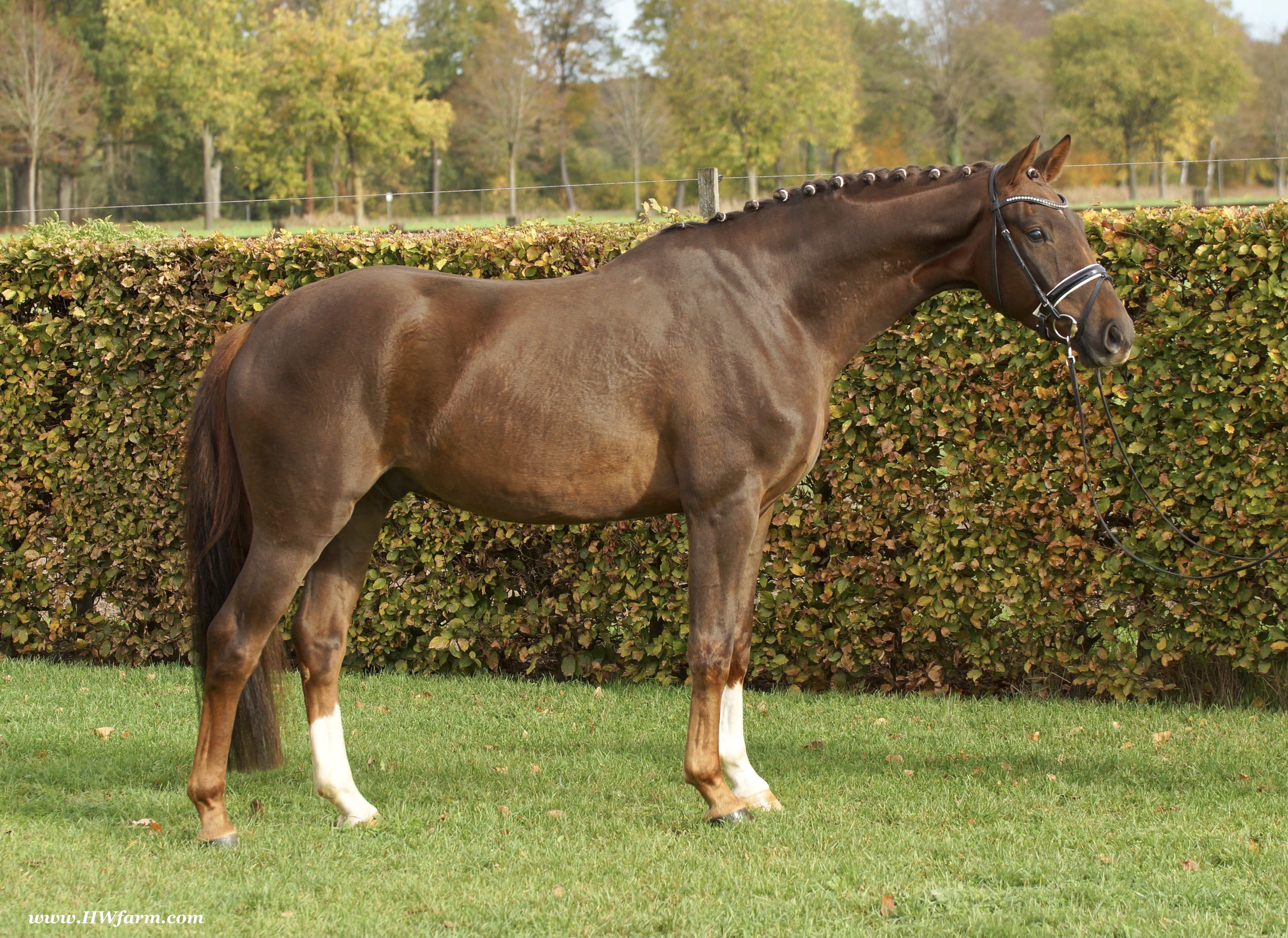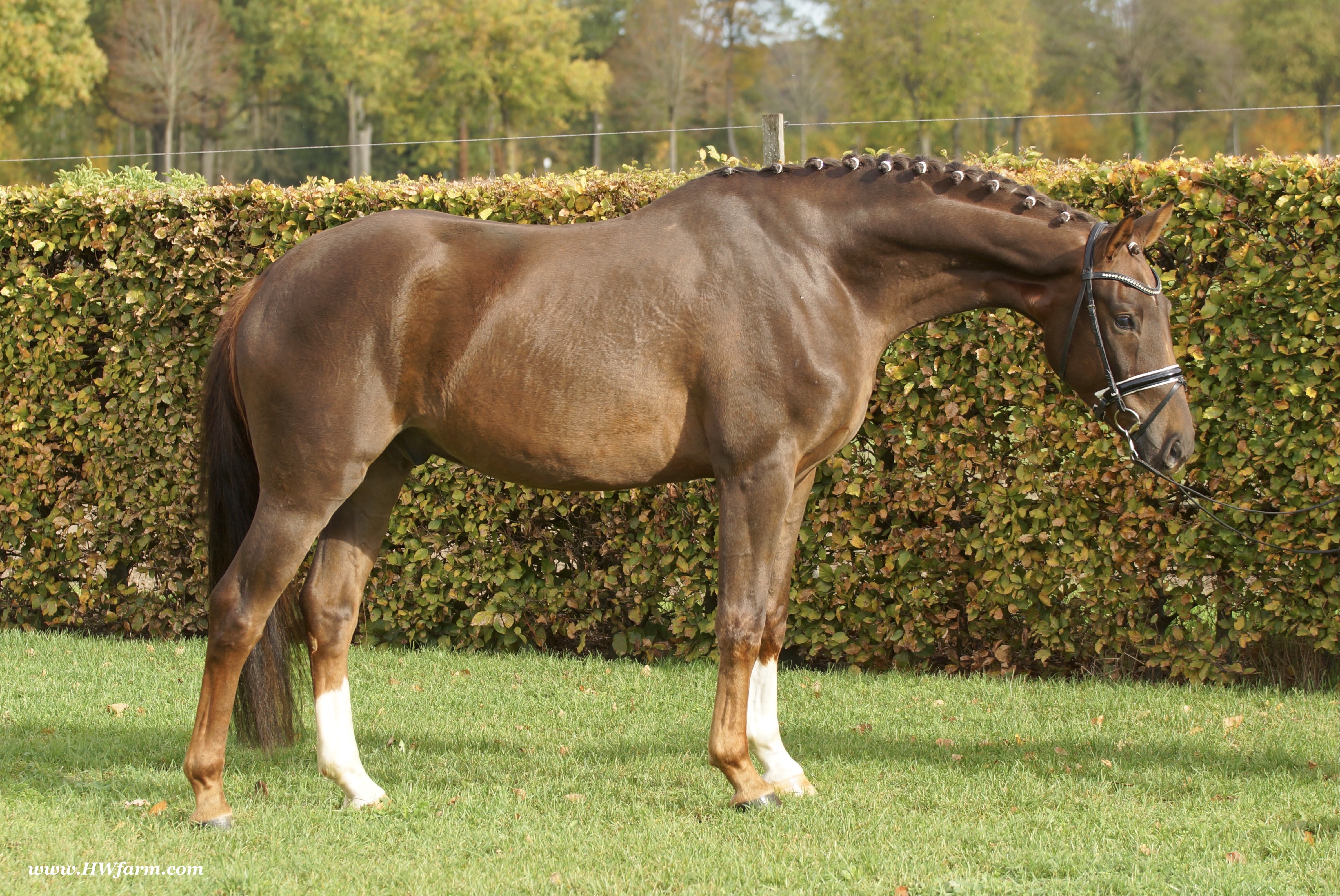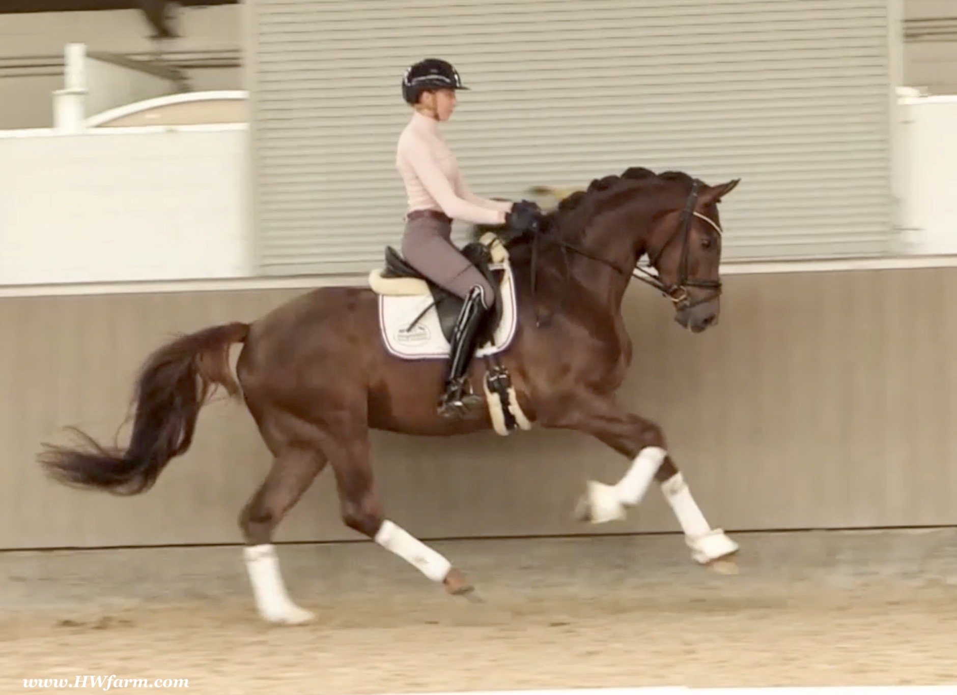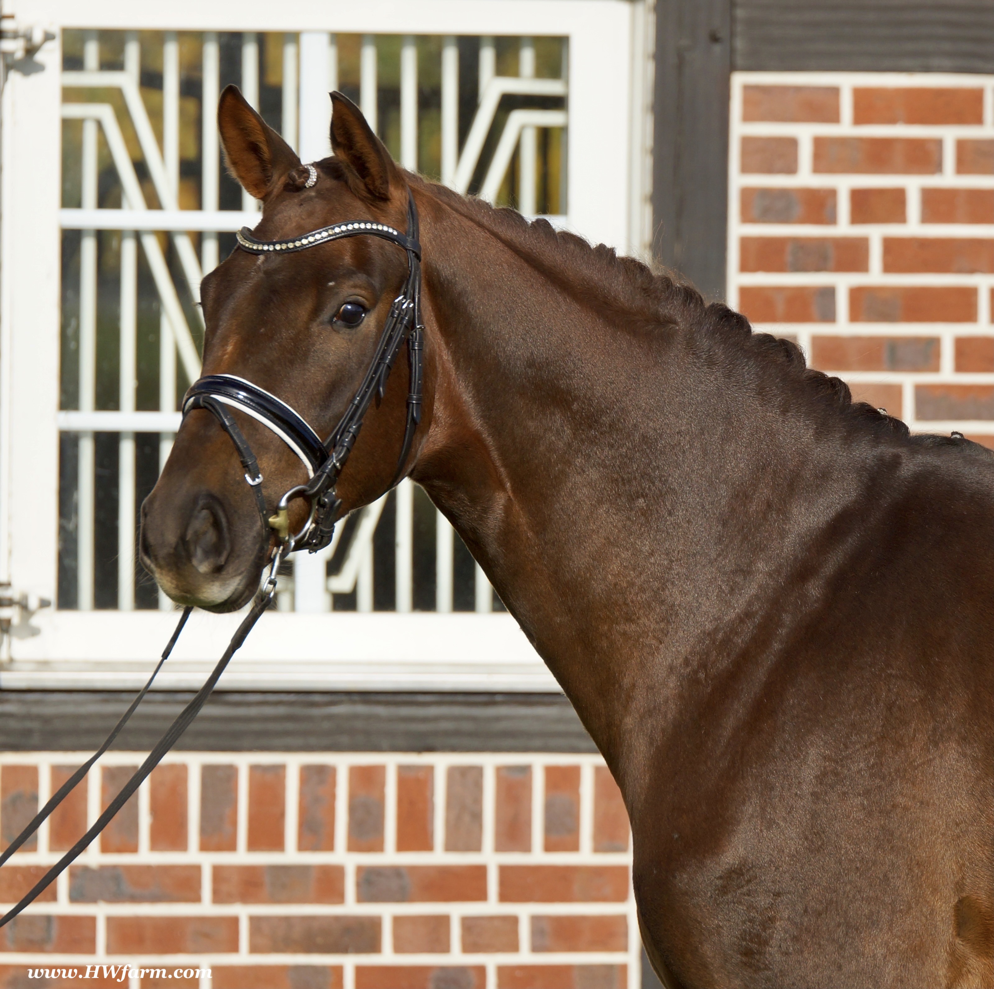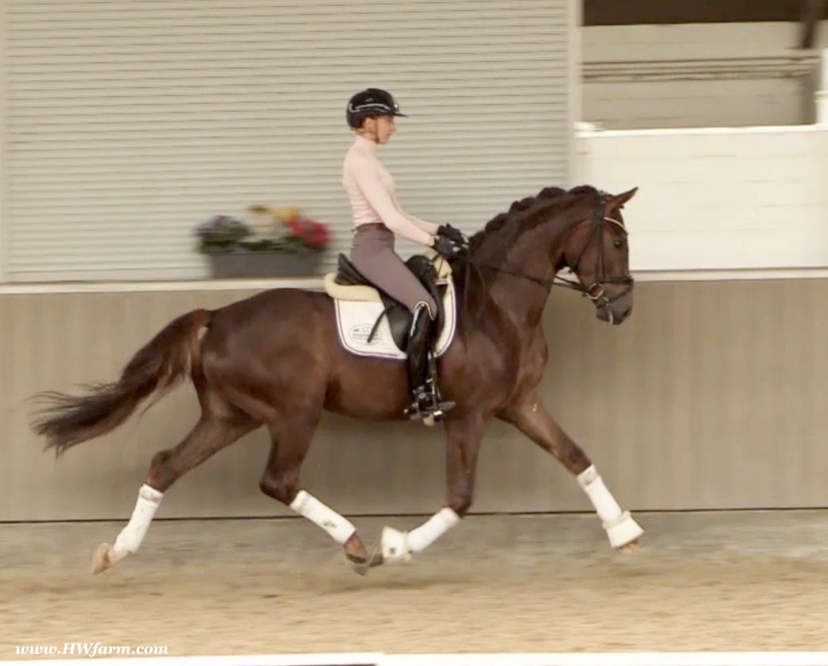 FrontMan HW, chestnut Westphalian gelding, Franziskus/Sir Heinrich born in 2019, standing approximately 167 cm or 16.1 hands. FrontMan HW's sire is the premium stallion Franziskus, he impressed the spectators at the Westphalian licensing in 2010. He has a brilliant type, a perfect frame as well as a harmonious and correct exterior. His basic gaits are perfect: He walks with diligence and beat, he trots with impulsion and forward thrust and he canters uphill. Franziskus was already very good as a foal. He won the qualification to the German foal-championships. In 2011 Franziskus absolved the 30-days-test in Münster-Handorf successfully: He got a score of 9.0 for trot, canter and rideability in the training and 9.5 for his character. The test rider gave him even 9.5 points for rideability. Continuing his life of success, Franziskus soon became Bundeschampion of the 4-year-old riding stallions with top marks when he was presented by both his own and by foreign riders in 2012. The Olympic rider Ingrid Klimke began riding Franziskus at the end of 2013 and was victorious with him in his first dressage class for young horses, at "M-level" (the highest class 6-year-olds can compete in Germany). Franziskus is victorious in dressage tests of KL S ** and has been 15 licensed sons. 2015 and 2016, victorious in dressage horse Kl. S ** Inter I under Ingrid Klimke and was a finalist in the Nuernberg Burgpokals/cup. •