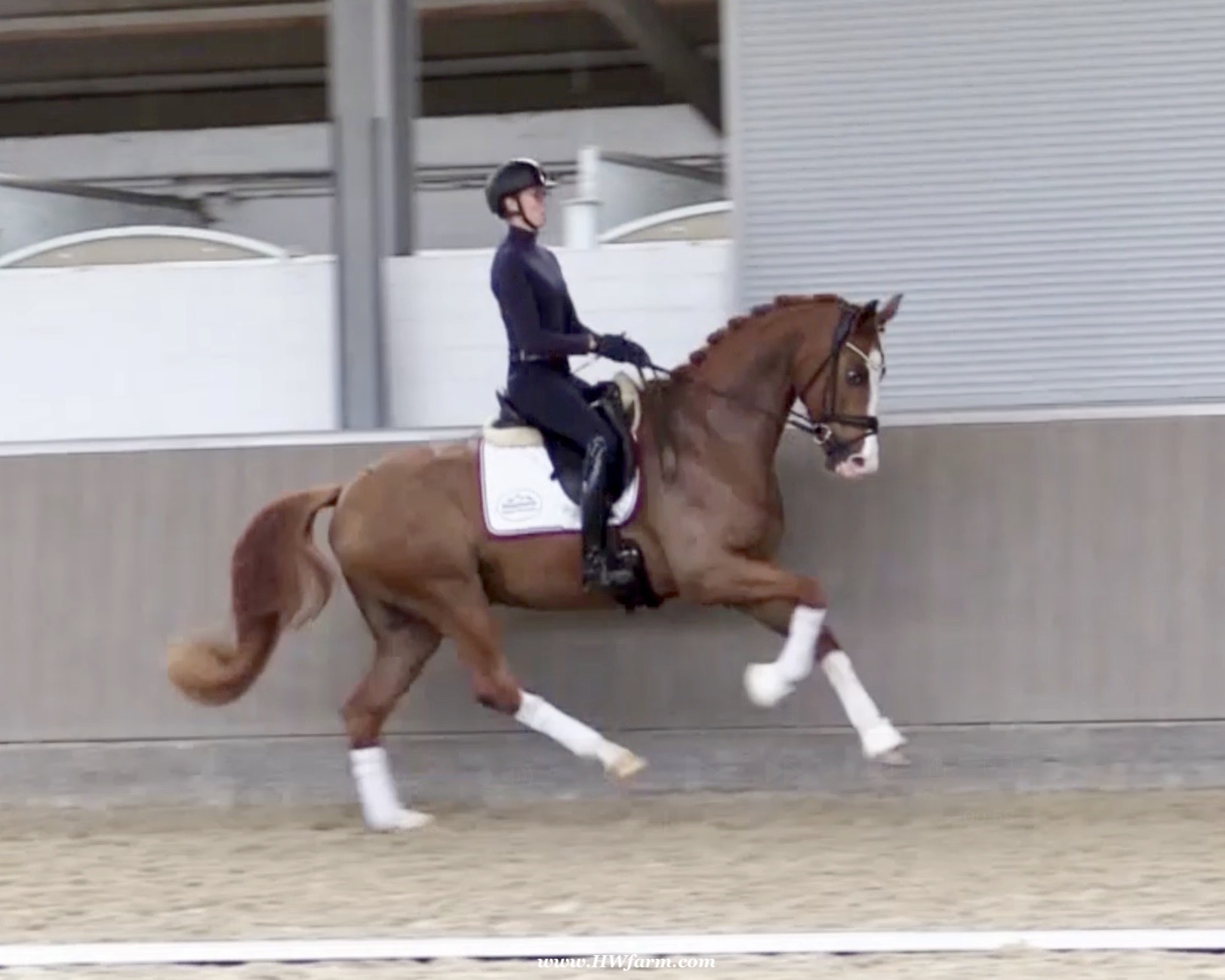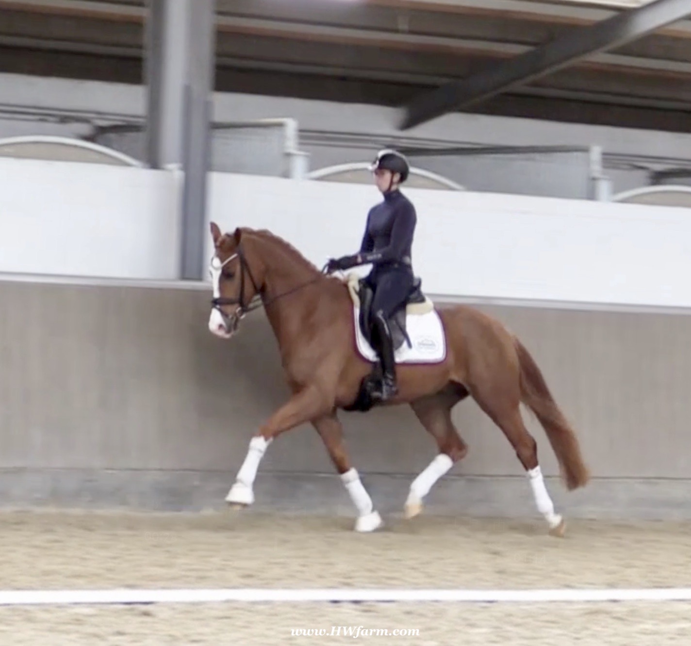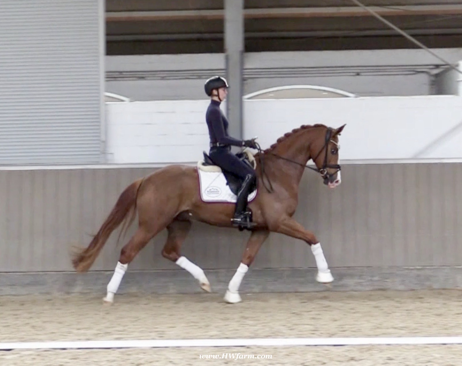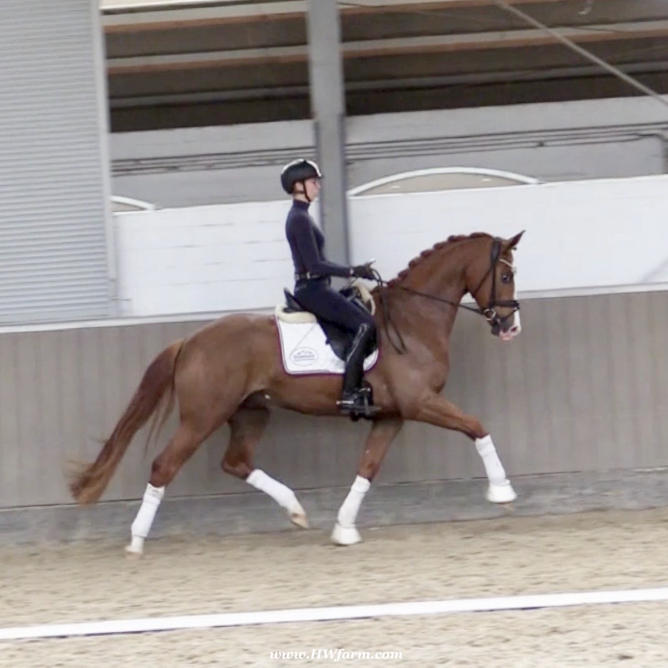 Fürst Quotenkönig HW, liver chestnut Westphalian gelding by Fürst Samarant/Vice Bundeschampion Quotenkönig, born in 2019, standing approximately 167 cm or 16.2 hands. Fürst Quotenkönig HW's sire is the famous stallion Fürst Samarant. Fürst Samarant, powerful and beautiful, he was one of the most sought-after premium stallions at the NRW main inspection in 2017 and passed the sport test for four-year-old stallions in Münster-Handorf in April 2019 with a record result as the best four-year-old dressage stallion in all of Germany! Under the saddle of Friederike Kampmeyer he achieved a 9.0 for canter, walk and rideability and the final score for dressage was 8.86. Fürst Samarant already showed his qualities in 2018, after he completed the 14-day test in Adelheidsdorf as a three-year-old with top marks and an overall result of 8.58 points as a three-year-old. In addition, he was also released as a premium stallion at the Hanoverian Verband. As a five-year-old, Fürst Samarant won young dressage horse classes under the saddle of Annika Korte and qualified for the Bundeschampionat in Warendorf. At the age of six he was placed several times and is now on his way to the senior class. In terms of breeding, Fürst Samarant has already delivered a convincing business card with his foals. He shows foals with impressive qualities at shows and auctions. His first offspring are now entering inspections and competitions. Fürst Samarant's sire For Romance won his first Prix. St. George trial when he was only seven years old and took part in the Nürnberger Burgpokal final. At the CDI in Hagen 2019, he successfully debuted in his first Grand Prix. As a grandson of Fürst Heinrich, For Romance serves the coveted blood of Florestan I in its sportiest form. The Westphalian foundation stallion Florestan I features twice prominently in Fürst Samarant's pedigree. Dam's sire Fürst Nymphenburg is a son of the double World Champion Florencio and thus the grandson of Florestan I . With Samarant as the third sire in the pedigree, the Sandro Hit blood is represented. Grandam Sinfonie is the half-sister of Amarena B (s. Accord II), who was successful in International Young Riders classes. Third dam Las Vegas B is the sister of Gambler's Lady, who produced the approved stallion Westfriese in combination with Wolkentanz. The successful sport horses of this line also include the ZZ-dressage horses Fontainebleau (s. Fidermark) and Donovan (s. Don Vino) as well as numerous show jumpers, including Corey Z (s. Chellano Z) - 1.40m spr., Shaqiri - 1.45m spr. and Stakkata - 1.45m spr. and much more. Fürst Samarant is approved by Westfalen, Rheinland, Hanover, Oldenburg and Süddeutsche Verbände.