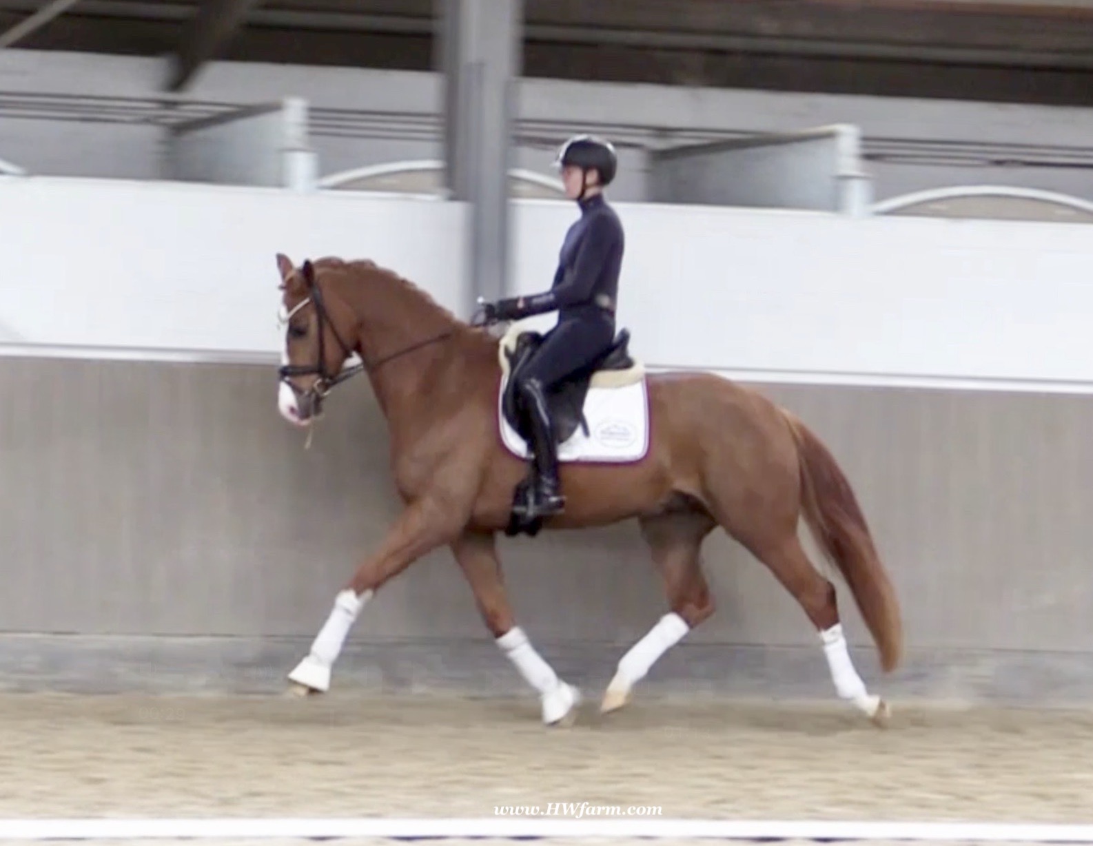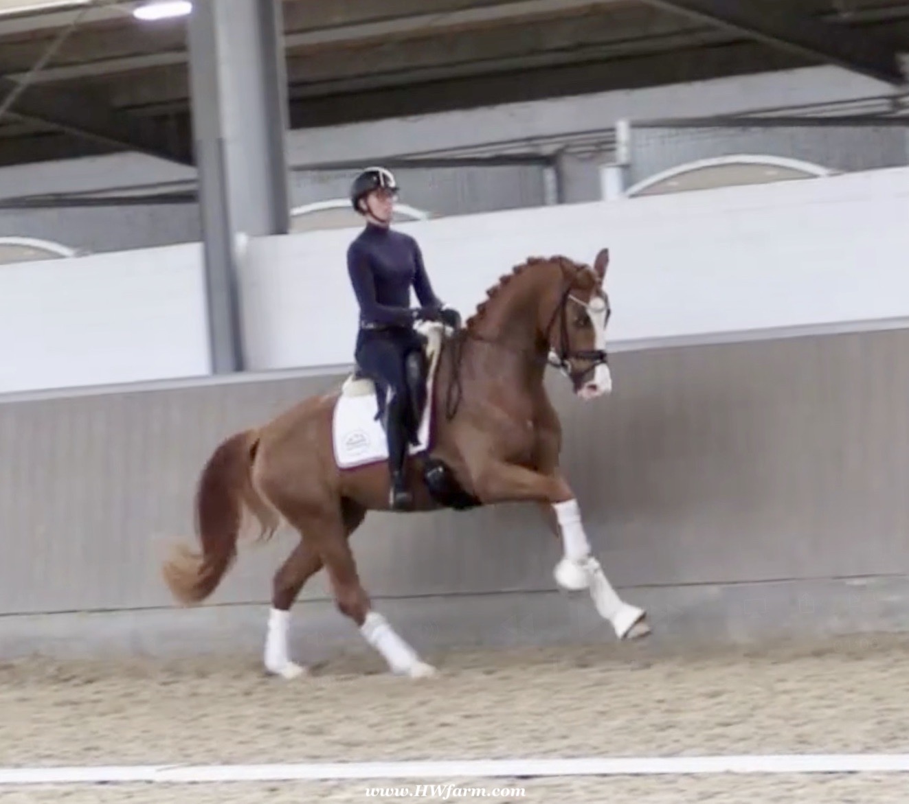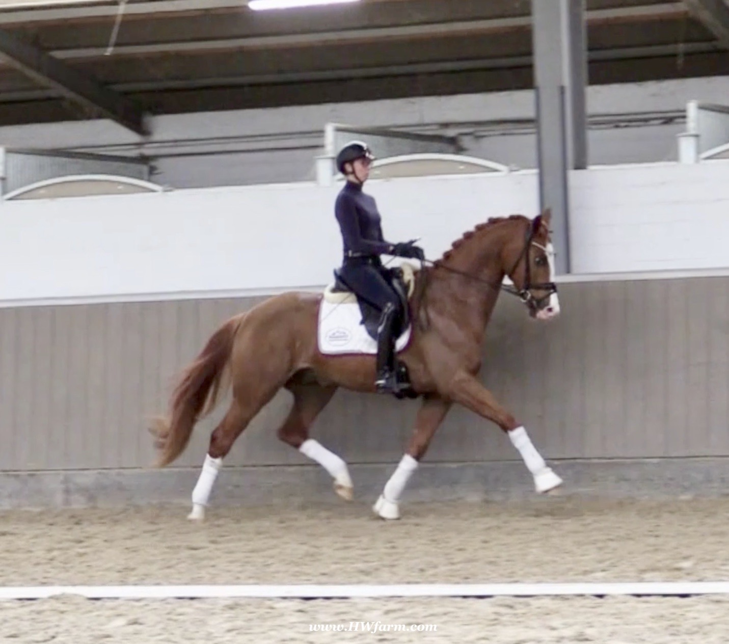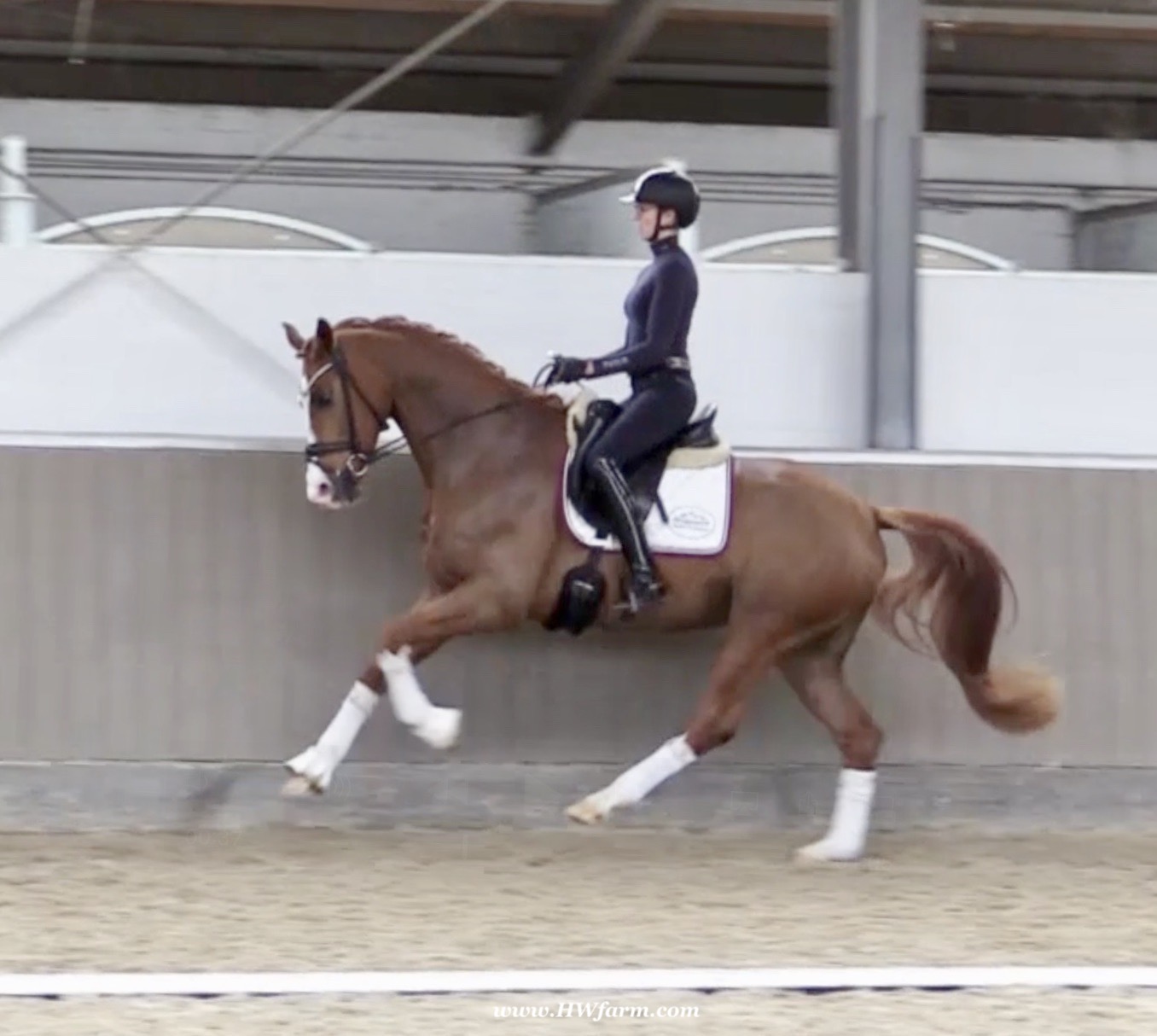 Fürst Quotenkönig HW, liver chestnut Westphalian gelding by Fürst Samarant/Vice Bundeschampion Quotenkönig, born in 2019, standing approximately 167 cm or 16.2 hands. Fürst Quotenkönig HW's sire is the famous stallion Fürst Samarant. Fürst Samarant, powerful and beautiful, he was one of the most sought-after premium stallions at the NRW main inspection in 2017 and passed the sport test for four-year-old stallions in Münster-Handorf in April 2019 with a record result as the best four-year-old dressage stallion in all of Germany! Under the saddle of Friederike Kampmeyer he achieved a 9.0 for canter, walk and rideability and the final score for dressage was 8.86. Fürst Samarant already showed his qualities in 2018, after he completed the 14-day test in Adelheidsdorf as a three-year-old with top marks and an overall result of 8.58 points as a three-year-old. In addition, he was also released as a premium stallion at the Hanoverian Verband. As a five-year-old, Fürst Samarant won young dressage horse classes under the saddle of Annika Korte and qualified for the Bundeschampionat in Warendorf. At the age of six he was placed several times and is now on his way to the senior class. In terms of breeding, Fürst Samarant has already delivered a convincing business card with his foals. He shows foals with impressive qualities at shows and auctions. His first offspring are now entering inspections and competitions. Fürst Samarant's sire For Romance won his first Prix. St. George trial when he was only seven years old and took part in the Nürnberger Burgpokal final. At the CDI in Hagen 2019, he successfully debuted in his first Grand Prix. As a grandson of Fürst Heinrich, For Romance serves the coveted blood of Florestan I in its sportiest form. The Westphalian foundation stallion Florestan I features twice prominently in Fürst Samarant's pedigree. Dam's sire Fürst Nymphenburg is a son of the double World Champion Florencio and thus the grandson of Florestan I . With Samarant as the third sire in the pedigree, the Sandro Hit blood is represented. Grandam Sinfonie is the half-sister of Amarena B (s. Accord II), who was successful in International Young Riders classes. Third dam Las Vegas B is the sister of Gambler's Lady, who produced the approved stallion Westfriese in combination with Wolkentanz. The successful sport horses of this line also include the ZZ-dressage horses Fontainebleau (s. Fidermark) and Donovan (s. Don Vino) as well as numerous show jumpers, including Corey Z (s. Chellano Z) - 1.40m spr., Shaqiri - 1.45m spr. and Stakkata - 1.45m spr. and much more. Fürst Samarant is approved by Westfalen, Rheinland, Hanover, Oldenburg and Süddeutsche Verbände.