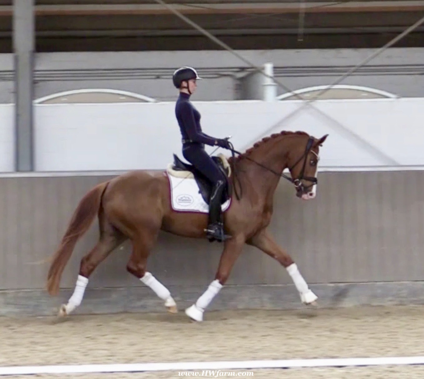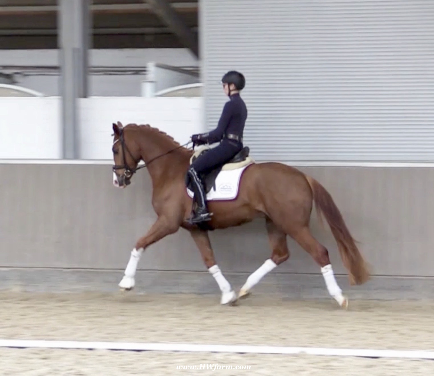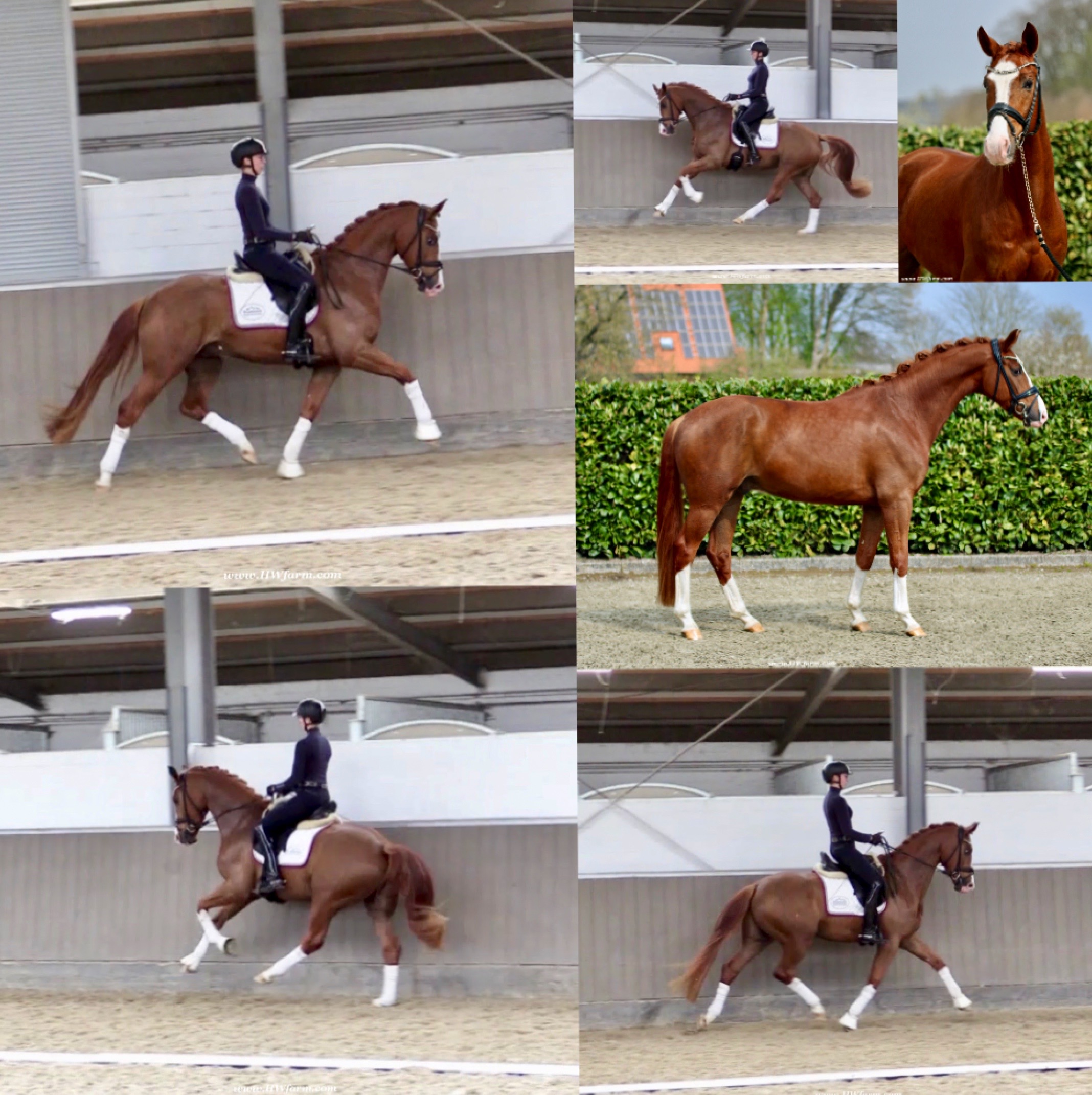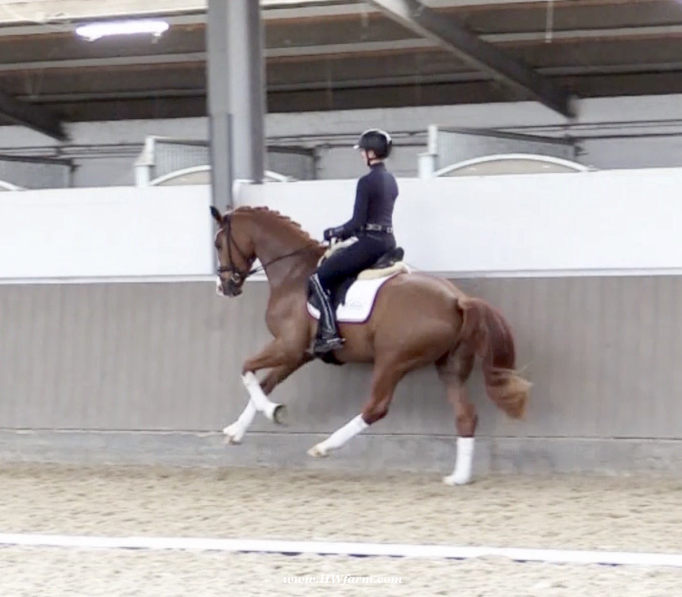 Fürst Quotenkönig HW, liver chestnut Westphalian gelding by Fürst Samarant/Vice Bundeschampion Quotenkönig, born in 2019, standing approximately 167 cm or 16.2 hands. Fürst Quotenkönig HW's sire is the famous stallion Fürst Samarant. Fürst Samarant, powerful and beautiful, he was one of the most sought-after premium stallions at the NRW main inspection in 2017 and passed the sport test for four-year-old stallions in Münster-Handorf in April 2019 with a record result as the best four-year-old dressage stallion in all of Germany! Under the saddle of Friederike Kampmeyer he achieved a 9.0 for canter, walk and rideability and the final score for dressage was 8.86. Fürst Samarant already showed his qualities in 2018, after he completed the 14-day test in Adelheidsdorf as a three-year-old with top marks and an overall result of 8.58 points as a three-year-old. In addition, he was also released as a premium stallion at the Hanoverian Verband. As a five-year-old, Fürst Samarant won young dressage horse classes under the saddle of Annika Korte and qualified for the Bundeschampionat in Warendorf. At the age of six he was placed several times and is now on his way to the senior class. In terms of breeding, Fürst Samarant has already delivered a convincing business card with his foals. He shows foals with impressive qualities at shows and auctions. His first offspring are now entering inspections and competitions. Fürst Samarant's sire For Romance won his first Prix. St. George trial when he was only seven years old and took part in the Nürnberger Burgpokal final. At the CDI in Hagen 2019, he successfully debuted in his first Grand Prix. As a grandson of Fürst Heinrich, For Romance serves the coveted blood of Florestan I in its sportiest form. The Westphalian foundation stallion Florestan I features twice prominently in Fürst Samarant's pedigree. Dam's sire Fürst Nymphenburg is a son of the double World Champion Florencio and thus the grandson of Florestan I . With Samarant as the third sire in the pedigree, the Sandro Hit blood is represented. Grandam Sinfonie is the half-sister of Amarena B (s. Accord II), who was successful in International Young Riders classes. Third dam Las Vegas B is the sister of Gambler's Lady, who produced the approved stallion Westfriese in combination with Wolkentanz. The successful sport horses of this line also include the ZZ-dressage horses Fontainebleau (s. Fidermark) and Donovan (s. Don Vino) as well as numerous show jumpers, including Corey Z (s. Chellano Z) - 1.40m spr., Shaqiri - 1.45m spr. and Stakkata - 1.45m spr. and much more. Fürst Samarant is approved by Westfalen, Rheinland, Hanover, Oldenburg and Süddeutsche Verbände.