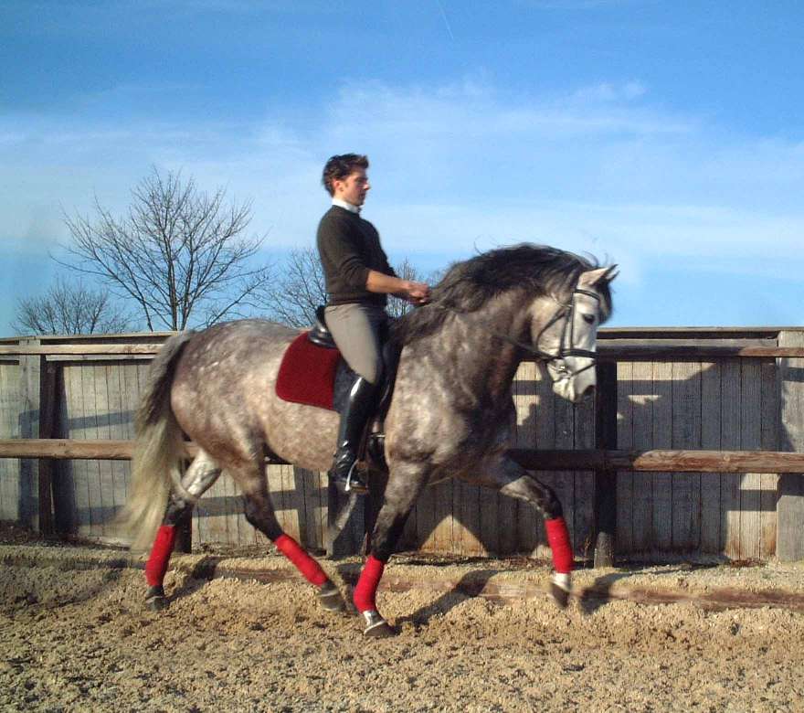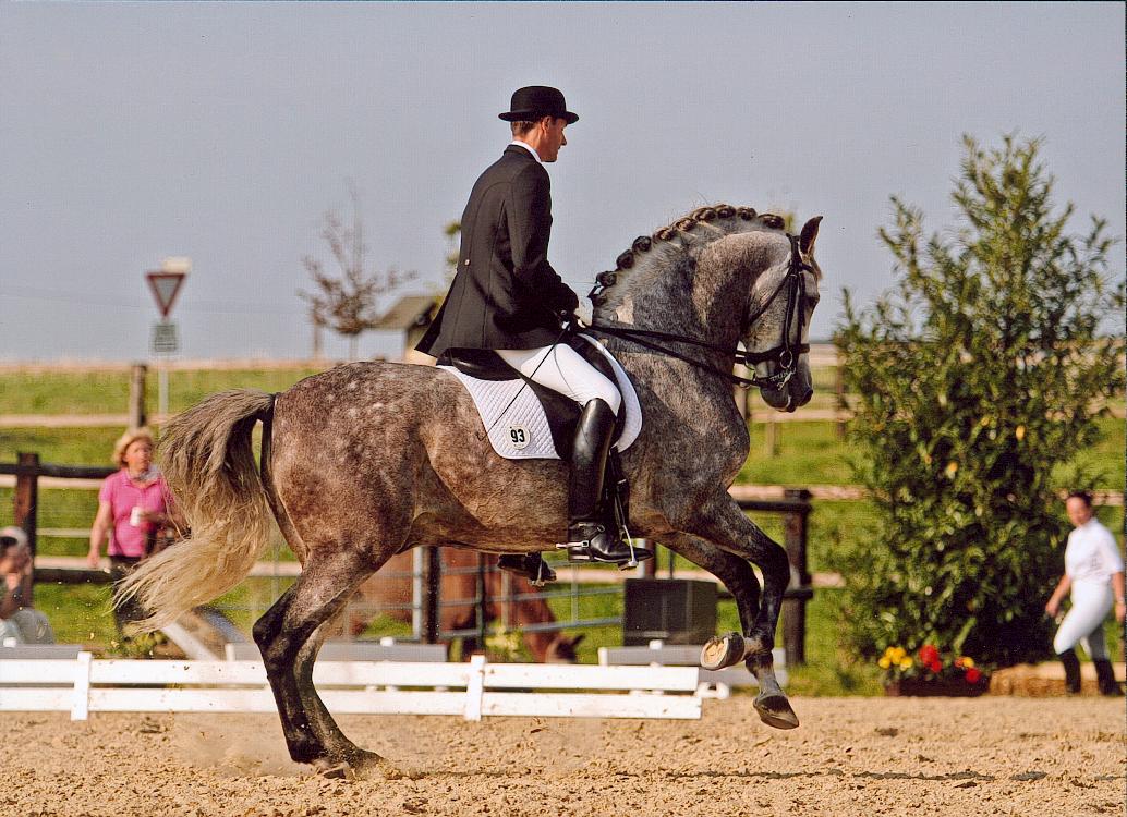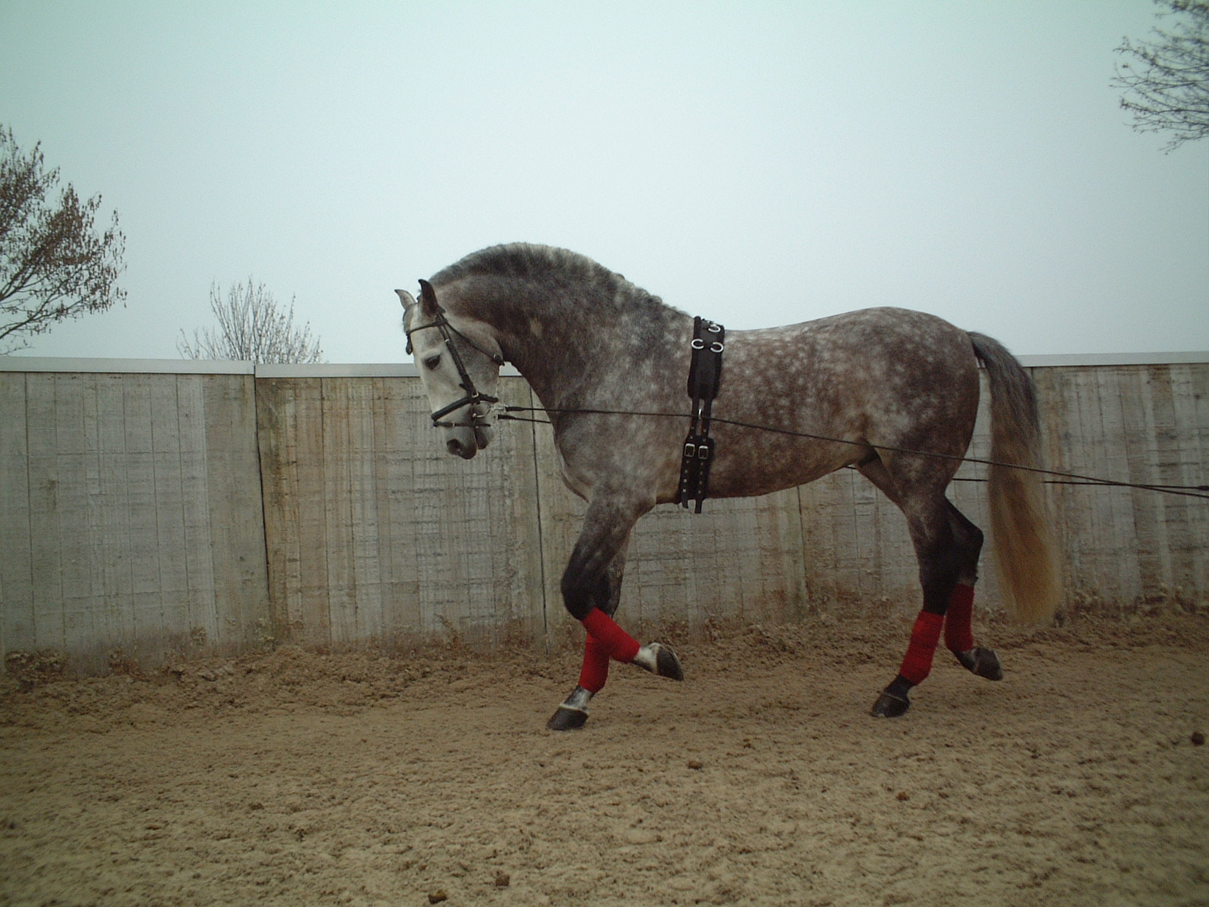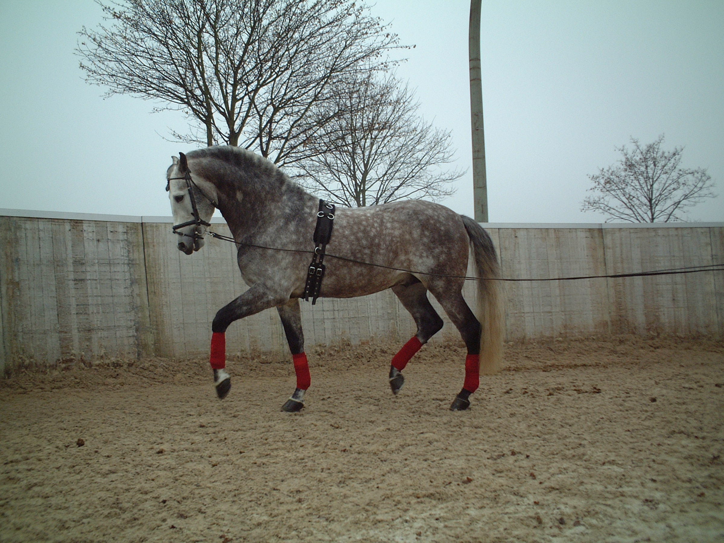 Jaleo, grey Andalusian stallion by Magnate/Delicia, born in 1997, standing approximately 16.2 hands. Jaleo is as soft and easy to sit as a couch. Back problems? This is the perfect boy for you! He is doing tempi changes, passage and piaffe word and comes with stunning looks. This stallion passed his Koering and is licensed to breed. He does not act like a stud and is easy to manage and handle. He will stir the crowd and the attention will be his. Lateral work in all gaits is excellent and he loves to do it. This is a stallion for somebody that will appreciate the excellence of this horse. He is like a magnet, everybody loves him.