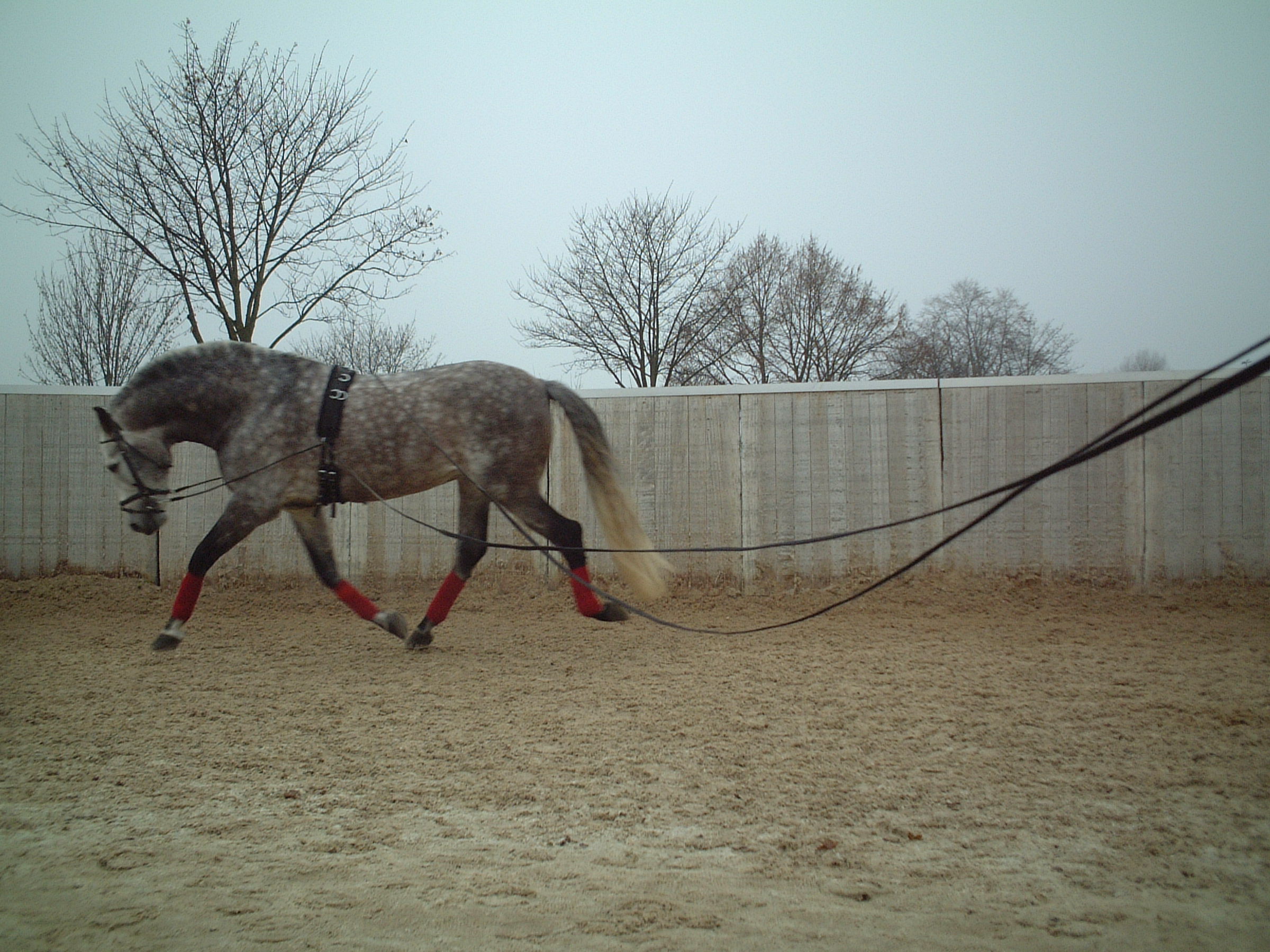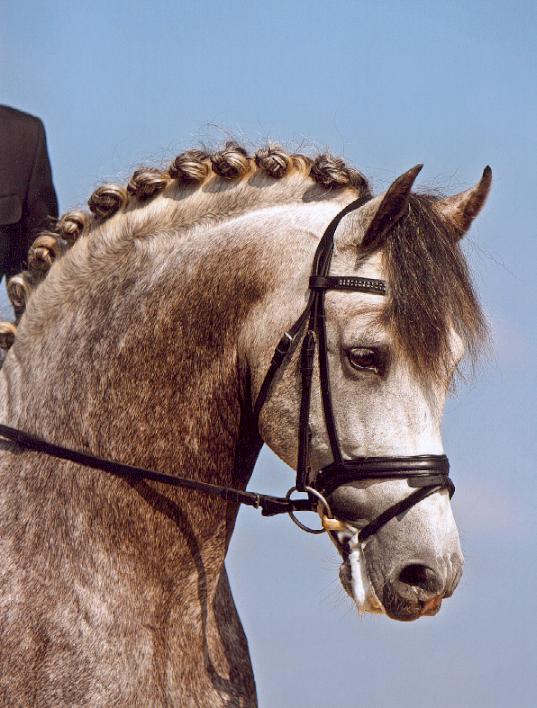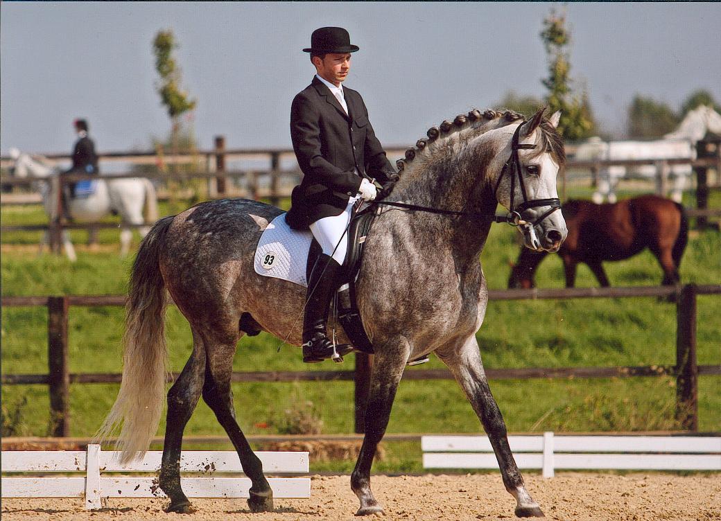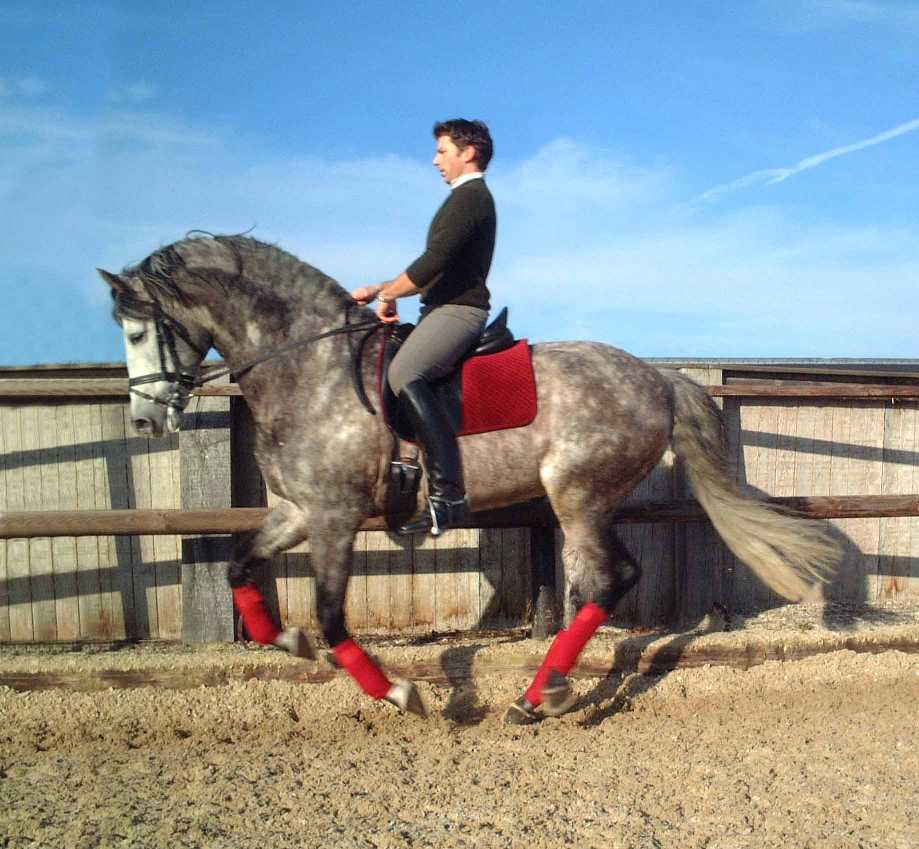 Jaleo, grey Andalusian stallion by Magnate/Delicia, born in 1997, standing approximately 16.2 hands. Jaleo is as soft and easy to sit as a couch. Back problems? This is the perfect boy for you! He is doing tempi changes, passage and piaffe word and comes with stunning looks. This stallion passed his Koering and is licensed to breed. He does not act like a stud and is easy to manage and handle. He will stir the crowd and the attention will be his. Lateral work in all gaits is excellent and he loves to do it. This is a stallion for somebody that will appreciate the excellence of this horse. He is like a magnet, everybody loves him.