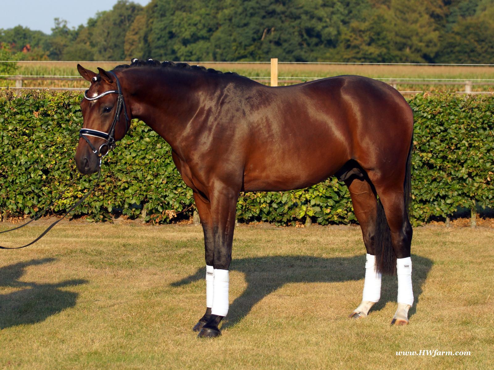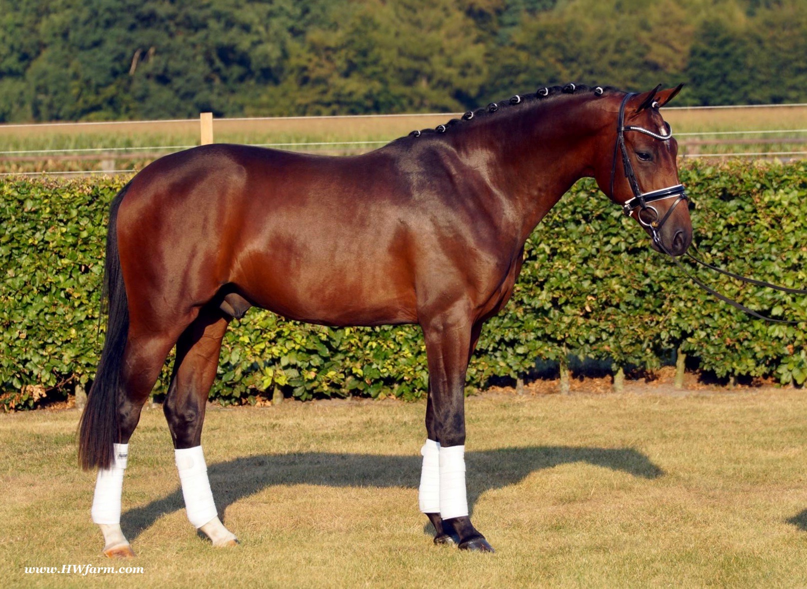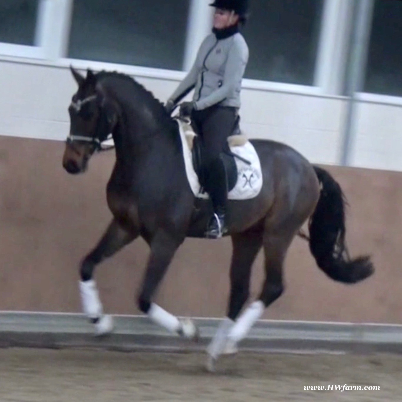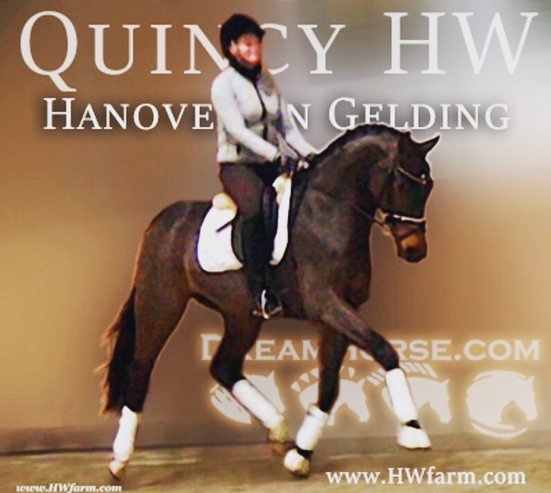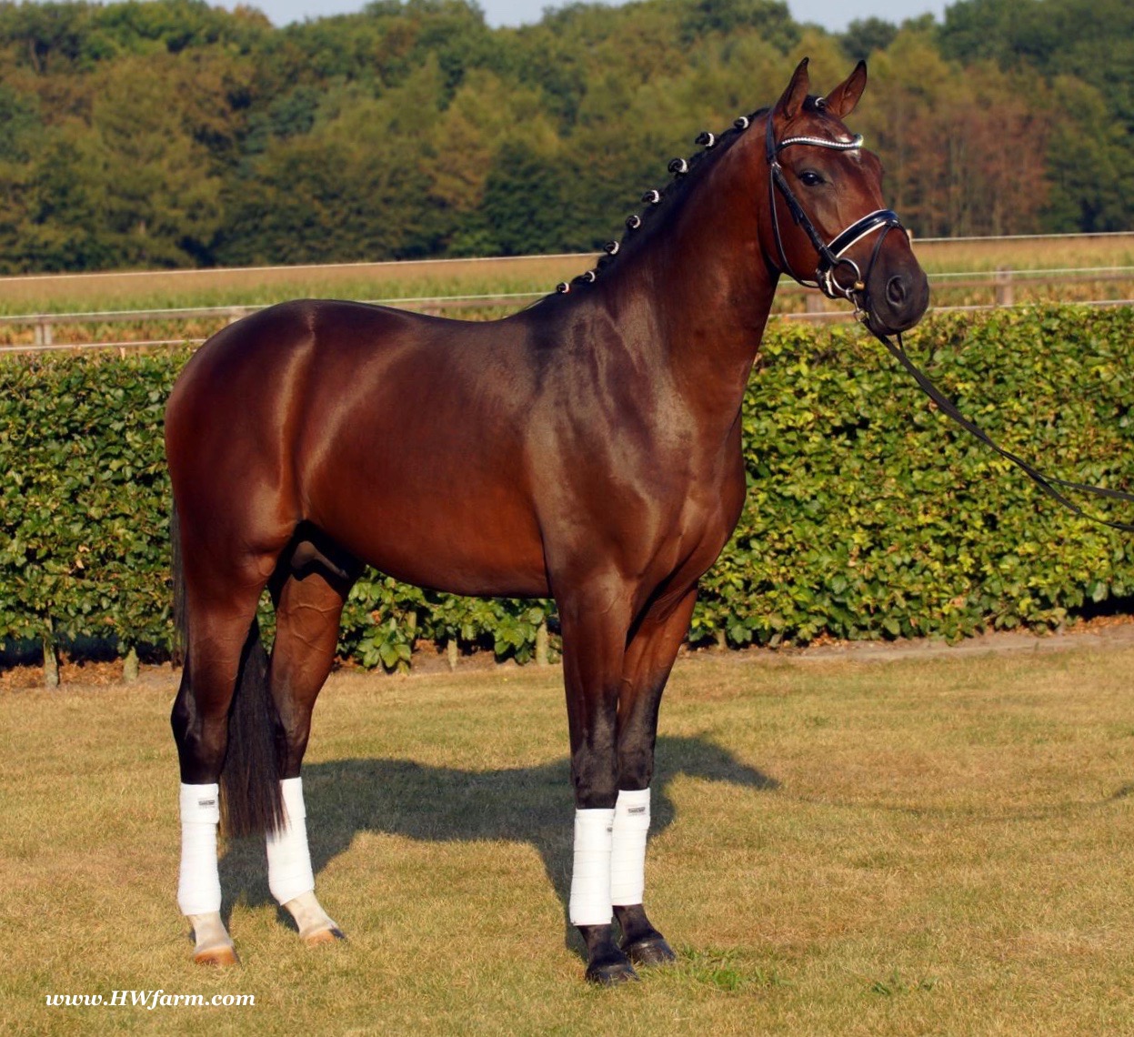 3 x Westphalian Champion & ViceBundesChampion son Quincy HW, dark bay Rhineland gelding by the powerful and dynamic Quotenkönig/Sandro Hit, born in 2014, standing approximately 169 cm or 16.2 hands. Quotenkönig, Vice Bundeschampion 2012, Westphalian Champion 2012, 2013 and 2014. BundesChampionat 2015, 4th place, WorldChampionship 2015, 8th place in the final round, victories in 3rd and 4th levels, WorldChampionship 2016, 4th place, multiple S & M Dressage victories and counting! Quotenkönig is by the Bundeschampion Quaterback. A breathtaking stallion with phenomenal offspring. Here are just some of the highlights for Quaterback: Scores for the Bundeschampionat: Trot; 9.5 Canter: 10 walk 7.5 Conformation: 9.5 Overall Impression: 9.5 Licensed for Berlin-Brandenburg, Oldenburg , Hanoverian This exceptional moving young stallion has already started his winning ways. Paired with the talented young rider, Christian Flamm of Hessen, Quaterback galloped away from the competition at the Bundeschampionate in 2006. He started his stallion career by being named Champion of his licensing in Neustadt/Dosse in 2005. In 2006, after the Bundeschampionate, he went on to win his 30 day test at Neustadt/Dosse with outstanding scores: Int. 9.0 Trot 9.25 Canter 9.75 Walk 7.63 Riding qualities 9.75 Jumping 7.75 Quotenkönig's dam is "St.Pr.St. Fleet-Street", 1. Reserve-Champion (Elite) of the mare performance testing in the year 2006 and she participated at the Bundeschampionat as well. She scored an amazing 8.99 at her performance testing. SPS Fleet-Street under saddle: SPS Fleet-Street in hand: She is by the famous Fürst Piccolo, a 100 Day Performance Test Winner! Fürst Piccolo's sire Fidermark was the vice champion of the NRW approvals in 1994 and won the Warendorf state stallion performance test with a big margin in 1995. Further successes followed in 1996. He dominated the "Optimum of Westphalian Riding Horses" sovereignty in Munster . He also became the Buneschampion in his home town of Warendorf . He then went on to win the LVM stallion championship in Munster Handorf. He has had many wins in the Prix St George and Intermediaire I under Marlies Van Baalen and he is trained by Johann Hinnemann. In 2003 he made his debut successfully at Grand Prix. His first foal crops produced sensational foals. They dominated the Westphalian Foal shows and the NRW elite foal auctions. In 1998 his first approved son Fein Sinn won the 100 day test, the first of several including the impressive moving Fürst Piccolo. He has over 15 licensed sons and many state premium mares to his credit already. He is a sire who will dominate German breeding for many years to come. He is ranked highly on the FN breeding values list. The dam sire Mephistopheles, a son of the Trakehner Mackensen derives from a Romadour II mare, establishing a blood connection to the paternal side via Rheingold. Mephistopheles sired the performance test winner Jacquare. Rembrandt in the third generation was a performance test winner with Trakehner blood. Fürst Piccolo was a premium stallion at the NRW main approval in 1999 and won the 100 day test in 2000 with high scores. He is an amazing moving stallion and his first few foal crops have dominated the Westphalian elite foal auctions. Quotenkönig's grand dam is the mother of "Feedback", by Fidertanz, he was the reserve winner of the NRW-stallion licensing 2009. She scored an amazing 8.06 at her performance testing. Feedback is her son, here is some info about him: After victories in riding horse tests and the Federal Championship qualifying with a score of 8.6, underlined its exceptional quality of Feedback with a superb 30-day test in Neustadt / Dosse. He received the best grade point average of all stallions. The descendants of the second NRW reserve winner in 2009 are eagerly awaited. Fidertanz father, the NRW champion stallion in 2004, presented again in 2010 and numerous top foals approved sons. Feedbacks mother, Conn. Pr.St. Scarlett was first reserve champion mare in her circle, is the parent of the premium stallion Fiderhit, the champion mare St.Pr.St. Fleet Street and many winning foals. Dam's sire Sandro Hit was Bundes champion six-year old and World champion of the young horses. Among the best known children of the stallion are the champion stallion Sir Donnerhall as well as the record mare Poetin. The Contender-Holstein and Landgraf lines round out the third and fourth generation of the pedigree. Quotenkönig (King of hearts!) is a picture perfect and absolutely stunning young stallion. He is a favorite of the NRW stallion auditions. Superb gentleman with 3 way above average gaits. He impresses everybody with his cat like movement, super free shoulder and unbelievable active hind end. He is one of a kind in movement, dynamic, charm and esprit. Quincy HW is a high quality youngster. His pedigree reads like no other, famous stallions, famous worldwide known riders! The Olympic horse, Horse Of The Year, Oldenburg Champion stallion and Young Horse Champion, TRIPLE CROWN WINNER - Selten HW, previously Elizabeth Ball's mount, sold for Euro 500.000 to Fiona Bigwood and Anders Dahl - internationally successful, bred and raised by www.HWfarm.com - is by the same sire as Quincy HW's dam sire. Olympic horse Selten HW, bred by www.HWfarm.com with Anders Dahl Quincy HW's dam herself produced a high priced auction horse and a half brother, was in the end ring at the foal championships, she is a proven high quality producer by the stallion of the century, Sandro Hit. Sandro Hit - Better than ever: Dominant refiner with revolutionary breeding performance two of his offspring, St. Emilion and Showtime ridden by Dorothee Schneider, are currently on the German Olympic dressage team. Very few stallions have managed to become a legend during their lifetime. Sandro Hit is therefore almost unique and his production of epochal importance in world dressage horse breeding. He has almost created his own "label": Des