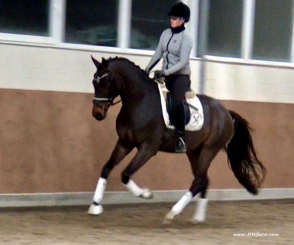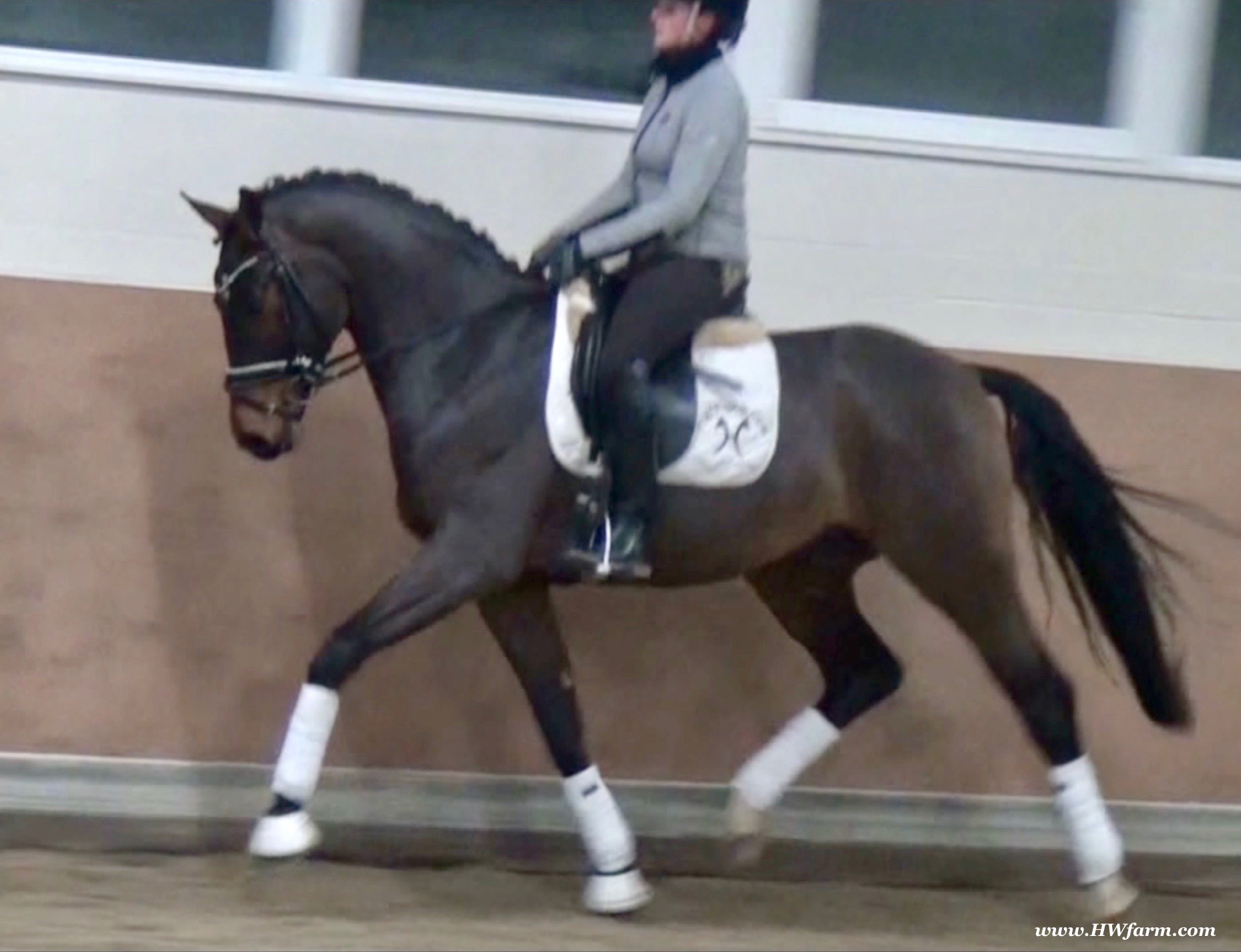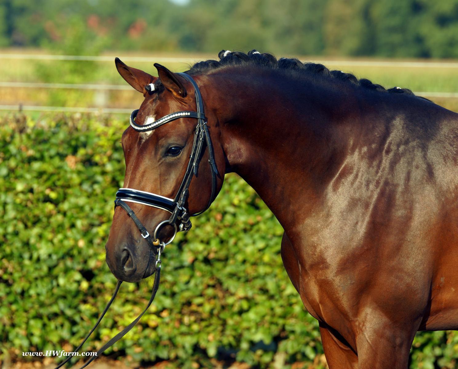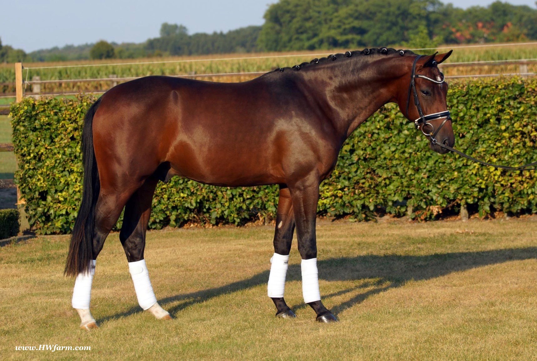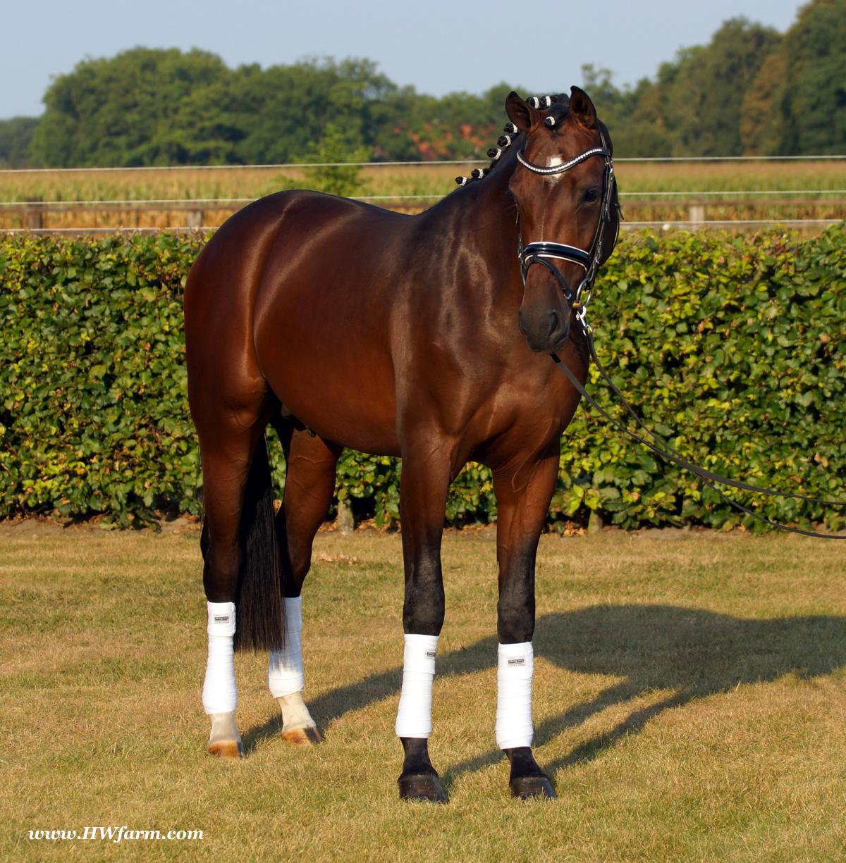 3 x Westphalian Champion & ViceBundesChampion son Quincy HW, dark bay Rhineland gelding by the powerful and dynamic Quotenkönig/Sandro Hit, born in 2014, standing approximately 169 cm or 16.2 hands. Quotenkönig, Vice Bundeschampion 2012, Westphalian Champion 2012, 2013 and 2014. BundesChampionat 2015, 4th place, WorldChampionship 2015, 8th place in the final round, victories in 3rd and 4th levels, WorldChampionship 2016, 4th place, multiple S & M Dressage victories and counting! Quotenkönig is by the Bundeschampion Quaterback. A breathtaking stallion with phenomenal offspring. Here are just some of the highlights for Quaterback: Scores for the Bundeschampionat: Trot; 9.5 Canter: 10 walk 7.5 Conformation: 9.5 Overall Impression: 9.5 Licensed for Berlin-Brandenburg, Oldenburg , Hanoverian This exceptional moving young stallion has already started his winning ways. Paired with the talented young rider, Christian Flamm of Hessen, Quaterback galloped away from the competition at the Bundeschampionate in 2006. He started his stallion career by being named Champion of his licensing in Neustadt/Dosse in 2005. In 2006, after the Bundeschampionate, he went on to win his 30 day test at Neustadt/Dosse with outstanding scores: Int. 9.0 Trot 9.25 Canter 9.75 Walk 7.63 Riding qualities 9.75 Jumping 7.75 Quotenkönig's dam is "St.Pr.St. Fleet-Street", 1. Reserve-Champion (Elite) of the mare performance testing in the year 2006 and she participated at the Bundeschampionat as well. She scored an amazing 8.99 at her performance testing. SPS Fleet-Street under saddle: SPS Fleet-Street in hand: She is by the famous Fürst Piccolo, a 100 Day Performance Test Winner! Fürst Piccolo's sire Fidermark was the vice champion of the NRW approvals in 1994 and won the Warendorf state stallion performance test with a big margin in 1995. Further successes followed in 1996. He dominated the "Optimum of Westphalian Riding Horses" sovereignty in Munster . He also became the Buneschampion in his home town of Warendorf . He then went on to win the LVM stallion championship in Munster Handorf. He has had many wins in the Prix St George and Intermediaire I under Marlies Van Baalen and he is trained by Johann Hinnemann. In 2003 he made his debut successfully at Grand Prix. His first foal crops produced sensational foals. They dominated the Westphalian Foal shows and the NRW elite foal auctions. In 1998 his first approved son Fein Sinn won the 100 day test, the first of several including the impressive moving Fürst Piccolo. He has over 15 licensed sons and many state premium mares to his credit already. He is a sire who will dominate German breeding for many years to come. He is ranked highly on the FN breeding values list. The dam sire Mephistopheles, a son of the Trakehner Mackensen derives from a Romadour II mare, establishing a blood connection to the paternal side via Rheingold. Mephistopheles sired the performance test winner Jacquare. Rembrandt in the third generation was a performance test winner with Trakehner blood. Fürst Piccolo was a premium stallion at the NRW main approval in 1999 and won the 100 day test in 2000 with high scores. He is an amazing moving stallion and his first few foal crops have dominated the Westphalian elite foal auctions. Quotenkönig's grand dam is the mother of "Feedback", by Fidertanz, he was the reserve winner of the NRW-stallion licensing 2009. She scored an amazing 8.06 at her performance testing. Feedback is her son, here is some info about him: After victories in riding horse tests and the Federal Championship qualifying with a score of 8.6, underlined its exceptional quality of Feedback with a superb 30-day test in Neustadt / Dosse. He received the best grade point average of all stallions. The descendants of the second NRW reserve winner in 2009 are eagerly awaited. Fidertanz father, the NRW champion stallion in 2004, presented again in 2010 and numerous top foals approved sons. Feedbacks mother, Conn. Pr.St. Scarlett was first reserve champion mare in her circle, is the parent of the premium stallion Fiderhit, the champion mare St.Pr.St. Fleet Street and many winning foals. Dam's sire Sandro Hit was Bundes champion six-year old and World champion of the young horses. Among the best known children of the stallion are the champion stallion Sir Donnerhall as well as the record mare Poetin. The Contender-Holstein and Landgraf lines round out the third and fourth generation of the pedigree. Quotenkönig (King of hearts!) is a picture perfect and absolutely stunning young stallion. He is a favorite of the NRW stallion auditions. Superb gentleman with 3 way above average gaits. He impresses everybody with his cat like movement, super free shoulder and unbelievable active hind end. He is one of a kind in movement, dynamic, charm and esprit. Quincy HW is a high quality youngster. His pedigree reads like no other, famous stallions, famous worldwide known riders! The Olympic horse, Horse Of The Year, Oldenburg Champion stallion and Young Horse Champion, TRIPLE CROWN WINNER - Selten HW, previously Elizabeth Ball's mount, sold for Euro 500.000 to Fiona Bigwood and Anders Dahl - internationally successful, bred and raised by www.HWfarm.com - is by the same sire as Quincy HW's dam sire. Olympic horse Selten HW, bred by www.HWfarm.com with Anders Dahl Quincy HW's dam herself produced a high priced auction horse and a half brother, was in the end ring at the foal championships, she is a proven high quality producer by the stallion of the century, Sandro Hit. Sandro Hit - Better than ever: Dominant refiner with revolutionary breeding performance two of his offspring, St. Emilion and Showtime ridden by Dorothee Schneider, are currently on the German Olympic dressage team. Very few stallions have managed to become a legend during their lifetime. Sandro Hit is therefore almost unique and his production of epochal importance in world dressage horse breeding. He has almost created his own "label": Des