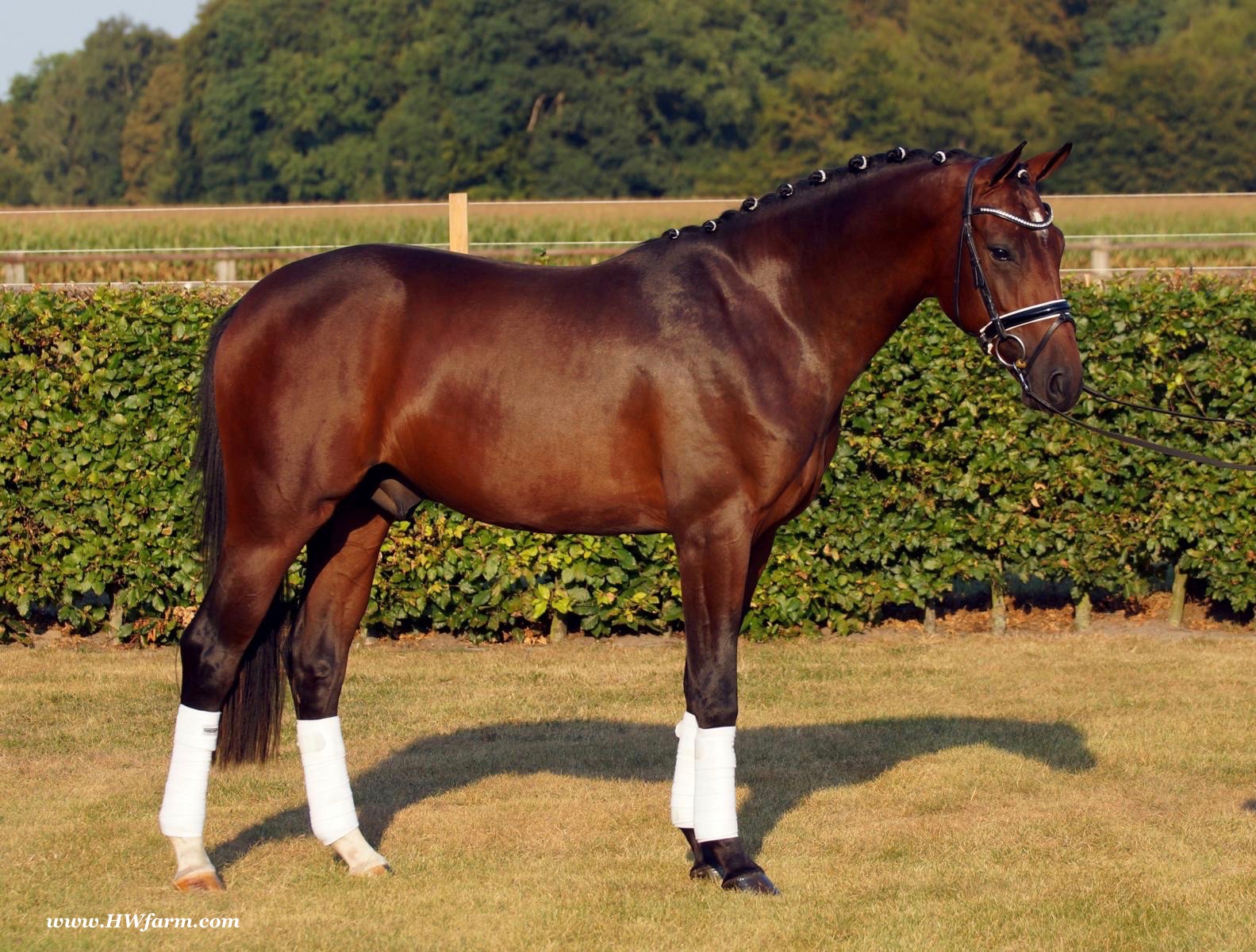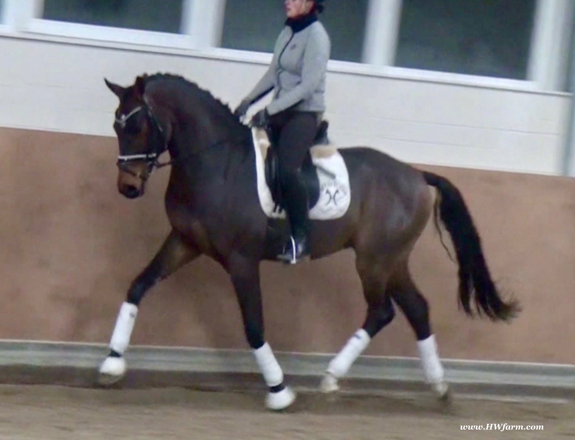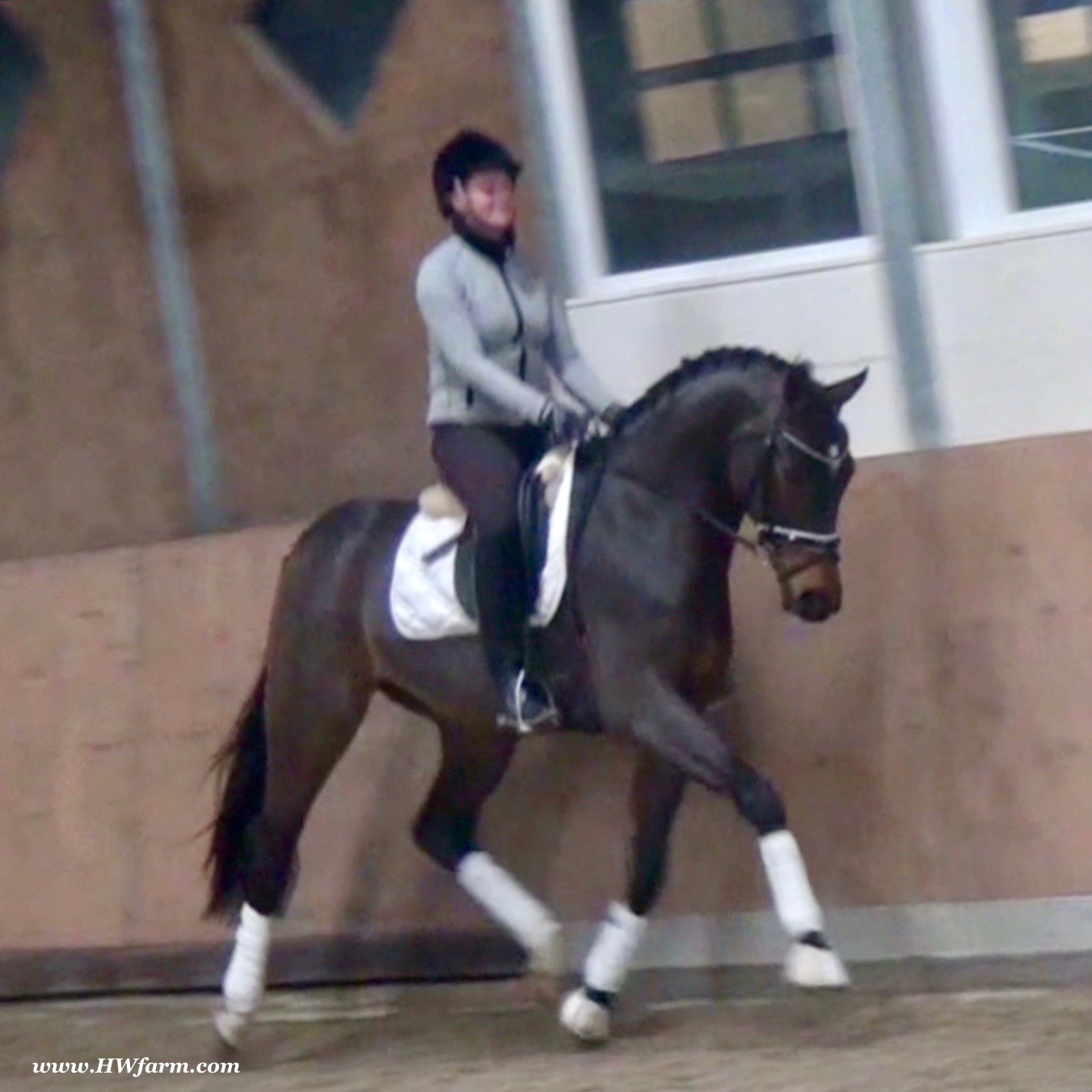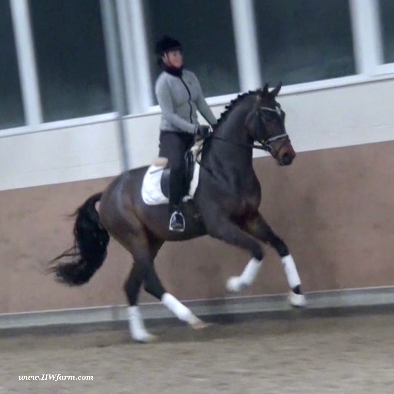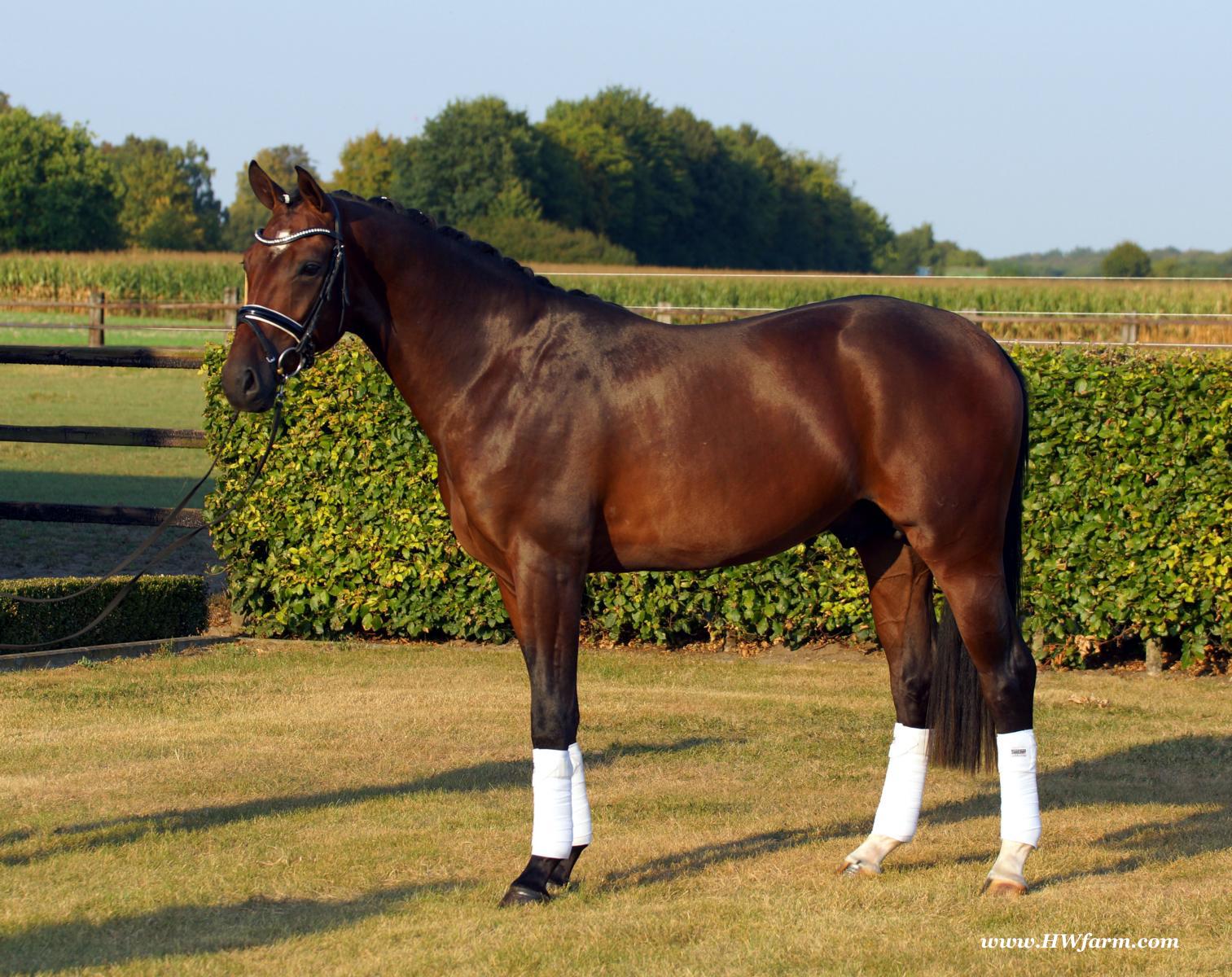 3 x Westphalian Champion & ViceBundesChampion son Quincy HW, dark bay Rhineland gelding by the powerful and dynamic Quotenkönig/Sandro Hit, born in 2014, standing approximately 169 cm or 16.2 hands. Quotenkönig, Vice Bundeschampion 2012, Westphalian Champion 2012, 2013 and 2014. BundesChampionat 2015, 4th place, WorldChampionship 2015, 8th place in the final round, victories in 3rd and 4th levels, WorldChampionship 2016, 4th place, multiple S & M Dressage victories and counting! Quotenkönig is by the Bundeschampion Quaterback. A breathtaking stallion with phenomenal offspring. Here are just some of the highlights for Quaterback: Scores for the Bundeschampionat: Trot; 9.5 Canter: 10 walk 7.5 Conformation: 9.5 Overall Impression: 9.5 Licensed for Berlin-Brandenburg, Oldenburg , Hanoverian This exceptional moving young stallion has already started his winning ways. Paired with the talented young rider, Christian Flamm of Hessen, Quaterback galloped away from the competition at the Bundeschampionate in 2006. He started his stallion career by being named Champion of his licensing in Neustadt/Dosse in 2005. In 2006, after the Bundeschampionate, he went on to win his 30 day test at Neustadt/Dosse with outstanding scores: Int. 9.0 Trot 9.25 Canter 9.75 Walk 7.63 Riding qualities 9.75 Jumping 7.75 Quotenkönig's dam is "St.Pr.St. Fleet-Street", 1. Reserve-Champion (Elite) of the mare performance testing in the year 2006 and she participated at the Bundeschampionat as well. She scored an amazing 8.99 at her performance testing. SPS Fleet-Street under saddle: SPS Fleet-Street in hand: She is by the famous Fürst Piccolo, a 100 Day Performance Test Winner! Fürst Piccolo's sire Fidermark was the vice champion of the NRW approvals in 1994 and won the Warendorf state stallion performance test with a big margin in 1995. Further successes followed in 1996. He dominated the "Optimum of Westphalian Riding Horses" sovereignty in Munster . He also became the Buneschampion in his home town of Warendorf . He then went on to win the LVM stallion championship in Munster Handorf. He has had many wins in the Prix St George and Intermediaire I under Marlies Van Baalen and he is trained by Johann Hinnemann. In 2003 he made his debut successfully at Grand Prix. His first foal crops produced sensational foals. They dominated the Westphalian Foal shows and the NRW elite foal auctions. In 1998 his first approved son Fein Sinn won the 100 day test, the first of several including the impressive moving Fürst Piccolo. He has over 15 licensed sons and many state premium mares to his credit already. He is a sire who will dominate German breeding for many years to come. He is ranked highly on the FN breeding values list. The dam sire Mephistopheles, a son of the Trakehner Mackensen derives from a Romadour II mare, establishing a blood connection to the paternal side via Rheingold. Mephistopheles sired the performance test winner Jacquare. Rembrandt in the third generation was a performance test winner with Trakehner blood. Fürst Piccolo was a premium stallion at the NRW main approval in 1999 and won the 100 day test in 2000 with high scores. He is an amazing moving stallion and his first few foal crops have dominated the Westphalian elite foal auctions. Quotenkönig's grand dam is the mother of "Feedback", by Fidertanz, he was the reserve winner of the NRW-stallion licensing 2009. She scored an amazing 8.06 at her performance testing. Feedback is her son, here is some info about him: After victories in riding horse tests and the Federal Championship qualifying with a score of 8.6, underlined its exceptional quality of Feedback with a superb 30-day test in Neustadt / Dosse. He received the best grade point average of all stallions. The descendants of the second NRW reserve winner in 2009 are eagerly awaited. Fidertanz father, the NRW champion stallion in 2004, presented again in 2010 and numerous top foals approved sons. Feedbacks mother, Conn. Pr.St. Scarlett was first reserve champion mare in her circle, is the parent of the premium stallion Fiderhit, the champion mare St.Pr.St. Fleet Street and many winning foals. Dam's sire Sandro Hit was Bundes champion six-year old and World champion of the young horses. Among the best known children of the stallion are the champion stallion Sir Donnerhall as well as the record mare Poetin. The Contender-Holstein and Landgraf lines round out the third and fourth generation of the pedigree. Quotenkönig (King of hearts!) is a picture perfect and absolutely stunning young stallion. He is a favorite of the NRW stallion auditions. Superb gentleman with 3 way above average gaits. He impresses everybody with his cat like movement, super free shoulder and unbelievable active hind end. He is one of a kind in movement, dynamic, charm and esprit. Quincy HW is a high quality youngster. His pedigree reads like no other, famous stallions, famous worldwide known riders! The Olympic horse, Horse Of The Year, Oldenburg Champion stallion and Young Horse Champion, TRIPLE CROWN WINNER - Selten HW, previously Elizabeth Ball's mount, sold for Euro 500.000 to Fiona Bigwood and Anders Dahl - internationally successful, bred and raised by www.HWfarm.com - is by the same sire as Quincy HW's dam sire. Olympic horse Selten HW, bred by www.HWfarm.com with Anders Dahl Quincy HW's dam herself produced a high priced auction horse and a half brother, was in the end ring at the foal championships, she is a proven high quality producer by the stallion of the century, Sandro Hit. Sandro Hit - Better than ever: Dominant refiner with revolutionary breeding performance two of his offspring, St. Emilion and Showtime ridden by Dorothee Schneider, are currently on the German Olympic dressage team. Very few stallions have managed to become a legend during their lifetime. Sandro Hit is therefore almost unique and his production of epochal importance in world dressage horse breeding. He has almost created his own "label": Des