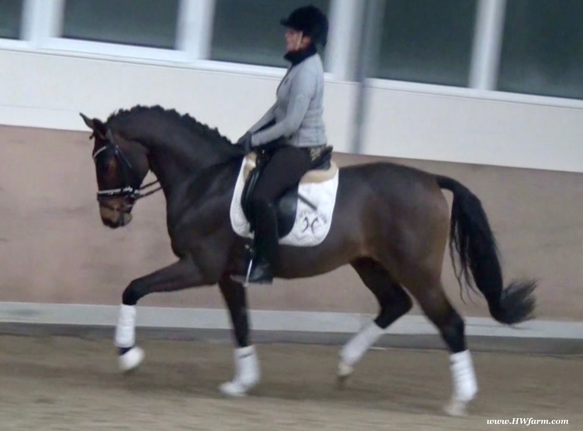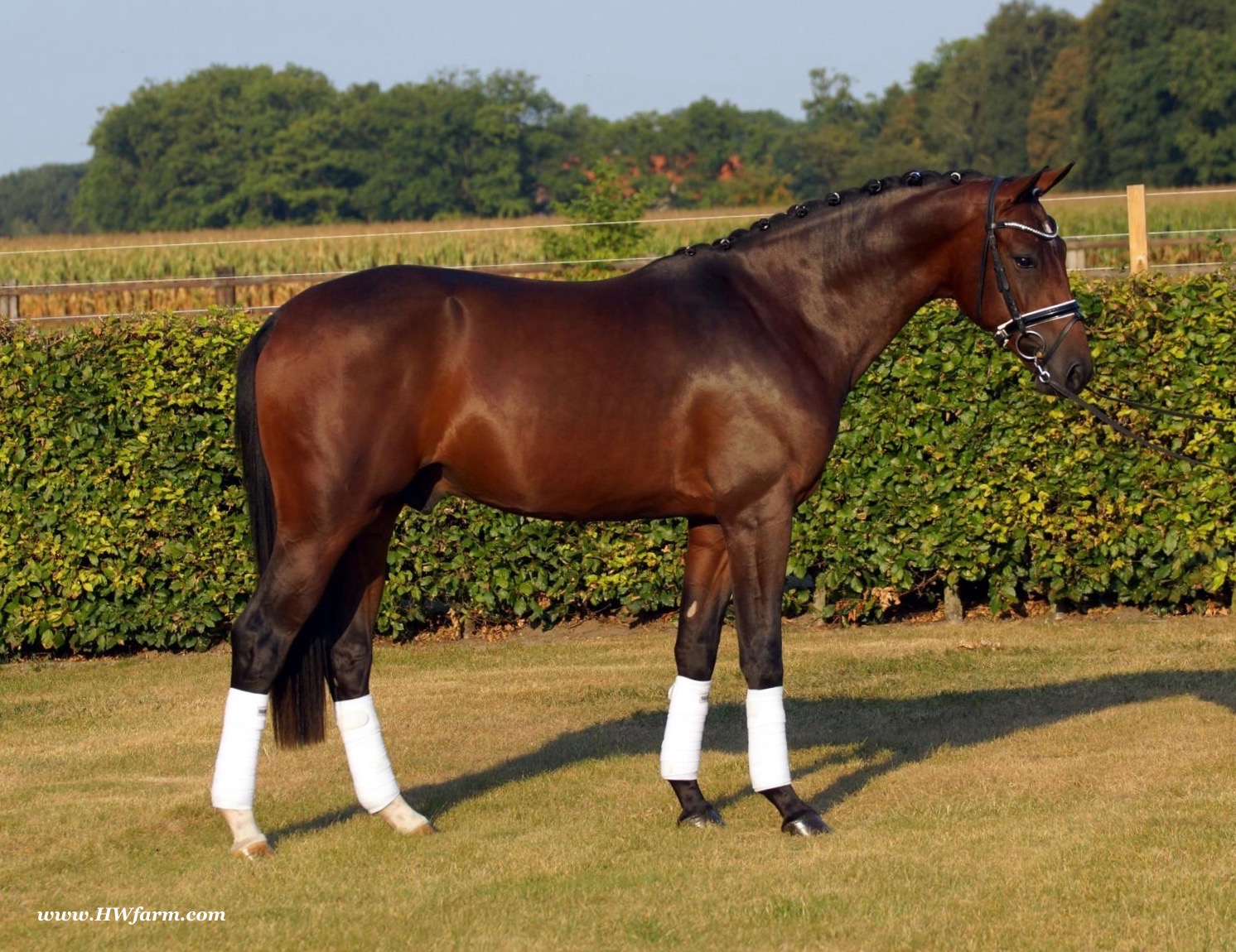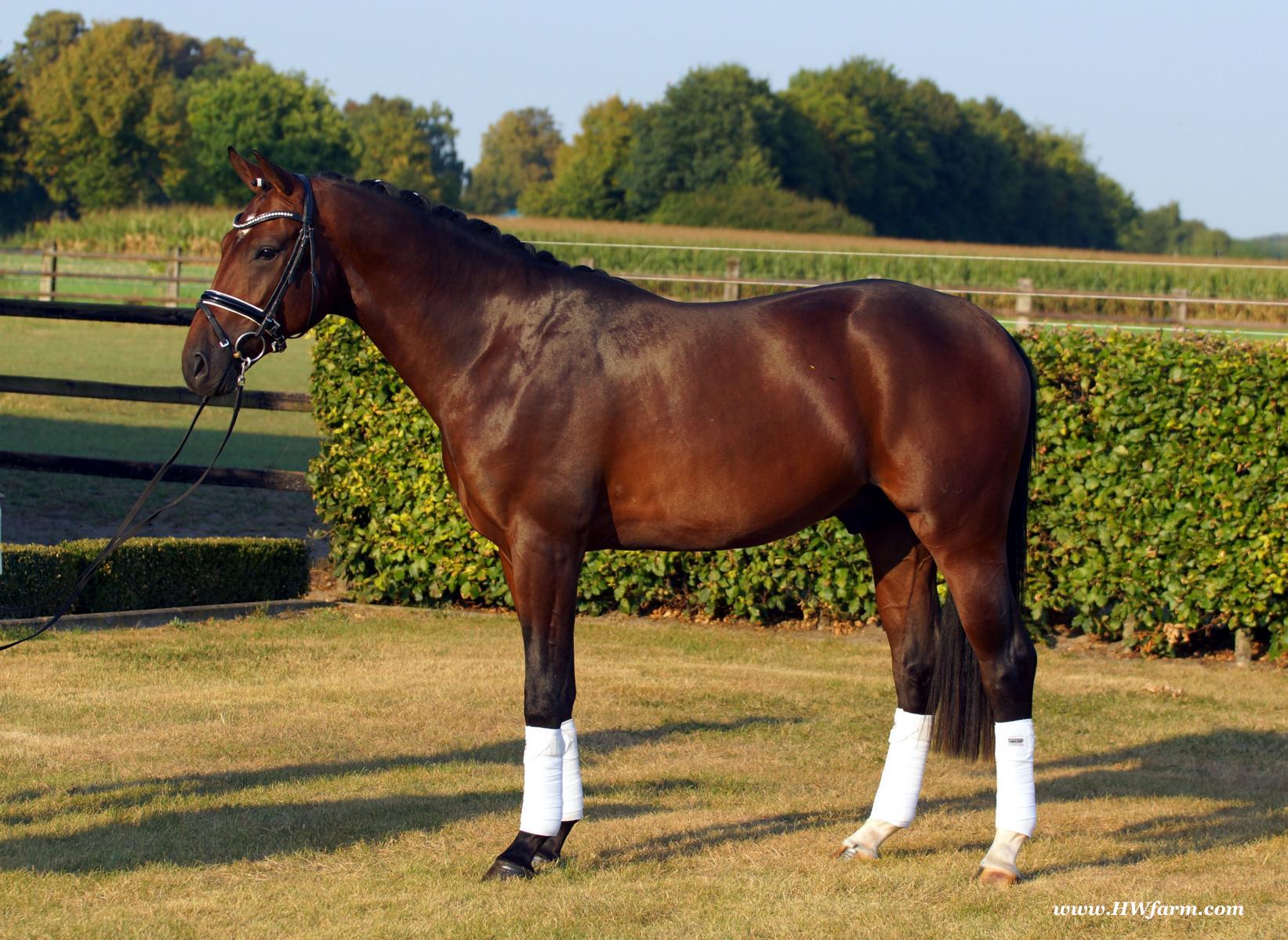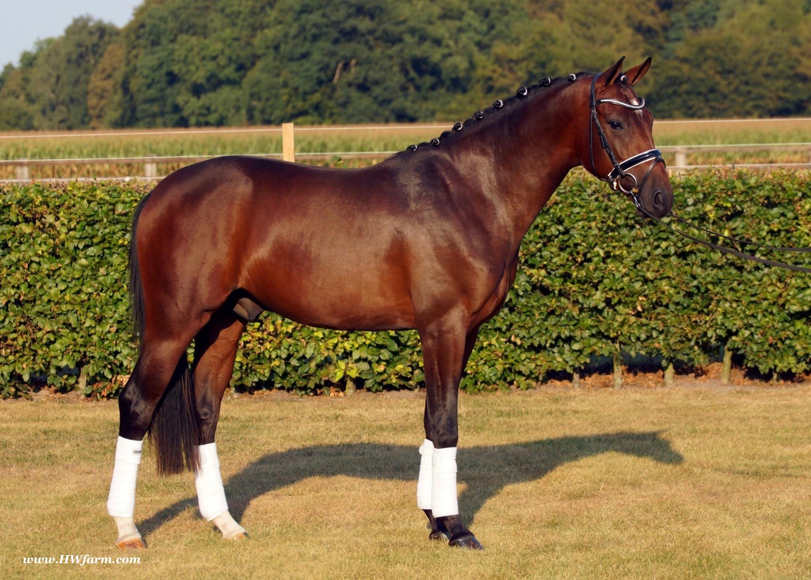 3 x Westphalian Champion & ViceBundesChampion son Quincy HW, dark bay Rhineland gelding by the powerful and dynamic Quotenkönig/Sandro Hit, born in 2014, standing approximately 169 cm or 16.2 hands. Quotenkönig, Vice Bundeschampion 2012, Westphalian Champion 2012, 2013 and 2014. BundesChampionat 2015, 4th place, WorldChampionship 2015, 8th place in the final round, victories in 3rd and 4th levels, WorldChampionship 2016, 4th place, multiple S & M Dressage victories and counting! Quotenkönig is by the Bundeschampion Quaterback. A breathtaking stallion with phenomenal offspring. Here are just some of the highlights for Quaterback: Scores for the Bundeschampionat: Trot; 9.5 Canter: 10 walk 7.5 Conformation: 9.5 Overall Impression: 9.5 Licensed for Berlin-Brandenburg, Oldenburg , Hanoverian This exceptional moving young stallion has already started his winning ways. Paired with the talented young rider, Christian Flamm of Hessen, Quaterback galloped away from the competition at the Bundeschampionate in 2006. He started his stallion career by being named Champion of his licensing in Neustadt/Dosse in 2005. In 2006, after the Bundeschampionate, he went on to win his 30 day test at Neustadt/Dosse with outstanding scores: Int. 9.0 Trot 9.25 Canter 9.75 Walk 7.63 Riding qualities 9.75 Jumping 7.75 Quotenkönig's dam is "St.Pr.St. Fleet-Street", 1. Reserve-Champion (Elite) of the mare performance testing in the year 2006 and she participated at the Bundeschampionat as well. She scored an amazing 8.99 at her performance testing. SPS Fleet-Street under saddle: SPS Fleet-Street in hand: She is by the famous Fürst Piccolo, a 100 Day Performance Test Winner! Fürst Piccolo's sire Fidermark was the vice champion of the NRW approvals in 1994 and won the Warendorf state stallion performance test with a big margin in 1995. Further successes followed in 1996. He dominated the "Optimum of Westphalian Riding Horses" sovereignty in Munster . He also became the Buneschampion in his home town of Warendorf . He then went on to win the LVM stallion championship in Munster Handorf. He has had many wins in the Prix St George and Intermediaire I under Marlies Van Baalen and he is trained by Johann Hinnemann. In 2003 he made his debut successfully at Grand Prix. His first foal crops produced sensational foals. They dominated the Westphalian Foal shows and the NRW elite foal auctions. In 1998 his first approved son Fein Sinn won the 100 day test, the first of several including the impressive moving Fürst Piccolo. He has over 15 licensed sons and many state premium mares to his credit already. He is a sire who will dominate German breeding for many years to come. He is ranked highly on the FN breeding values list. The dam sire Mephistopheles, a son of the Trakehner Mackensen derives from a Romadour II mare, establishing a blood connection to the paternal side via Rheingold. Mephistopheles sired the performance test winner Jacquare. Rembrandt in the third generation was a performance test winner with Trakehner blood. Fürst Piccolo was a premium stallion at the NRW main approval in 1999 and won the 100 day test in 2000 with high scores. He is an amazing moving stallion and his first few foal crops have dominated the Westphalian elite foal auctions. Quotenkönig's grand dam is the mother of "Feedback", by Fidertanz, he was the reserve winner of the NRW-stallion licensing 2009. She scored an amazing 8.06 at her performance testing. Feedback is her son, here is some info about him: After victories in riding horse tests and the Federal Championship qualifying with a score of 8.6, underlined its exceptional quality of Feedback with a superb 30-day test in Neustadt / Dosse. He received the best grade point average of all stallions. The descendants of the second NRW reserve winner in 2009 are eagerly awaited. Fidertanz father, the NRW champion stallion in 2004, presented again in 2010 and numerous top foals approved sons. Feedbacks mother, Conn. Pr.St. Scarlett was first reserve champion mare in her circle, is the parent of the premium stallion Fiderhit, the champion mare St.Pr.St. Fleet Street and many winning foals. Dam's sire Sandro Hit was Bundes champion six-year old and World champion of the young horses. Among the best known children of the stallion are the champion stallion Sir Donnerhall as well as the record mare Poetin. The Contender-Holstein and Landgraf lines round out the third and fourth generation of the pedigree. Quotenkönig (King of hearts!) is a picture perfect and absolutely stunning young stallion. He is a favorite of the NRW stallion auditions. Superb gentleman with 3 way above average gaits. He impresses everybody with his cat like movement, super free shoulder and unbelievable active hind end. He is one of a kind in movement, dynamic, charm and esprit. Quincy HW is a high quality youngster. His pedigree reads like no other, famous stallions, famous worldwide known riders! The Olympic horse, Horse Of The Year, Oldenburg Champion stallion and Young Horse Champion, TRIPLE CROWN WINNER - Selten HW, previously Elizabeth Ball's mount, sold for Euro 500.000 to Fiona Bigwood and Anders Dahl - internationally successful, bred and raised by www.HWfarm.com - is by the same sire as Quincy HW's dam sire. Olympic horse Selten HW, bred by www.HWfarm.com with Anders Dahl Quincy HW's dam herself produced a high priced auction horse and a half brother, was in the end ring at the foal championships, she is a proven high quality producer by the stallion of the century, Sandro Hit. Sandro Hit - Better than ever: Dominant refiner with revolutionary breeding performance two of his offspring, St. Emilion and Showtime ridden by Dorothee Schneider, are currently on the German Olympic dressage team. Very few stallions have managed to become a legend during their lifetime. Sandro Hit is therefore almost unique and his production of epochal importance in world dressage horse breeding. He has almost created his own "label": Des