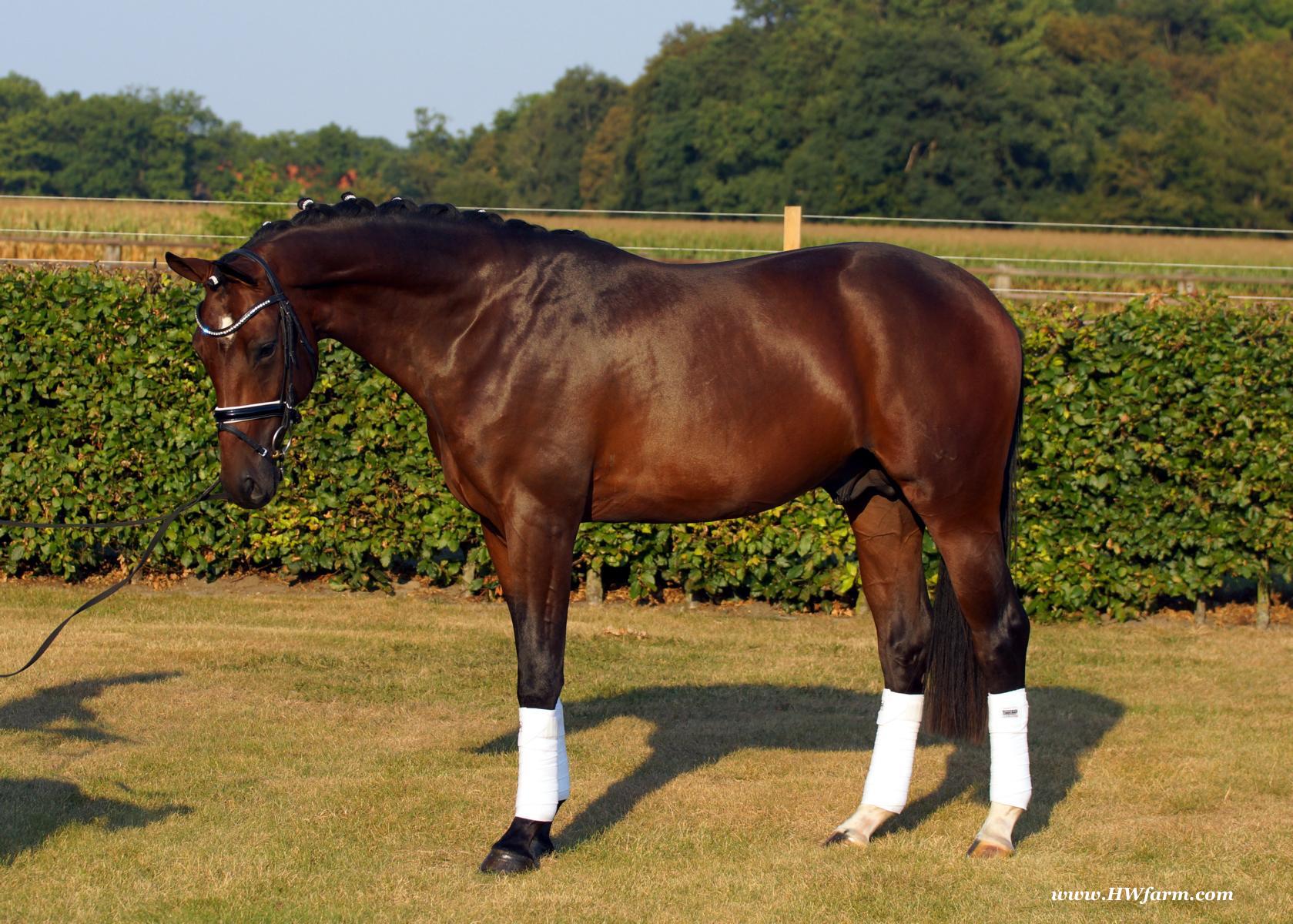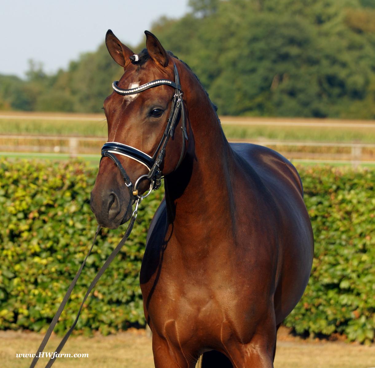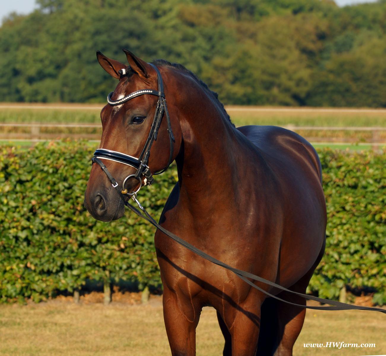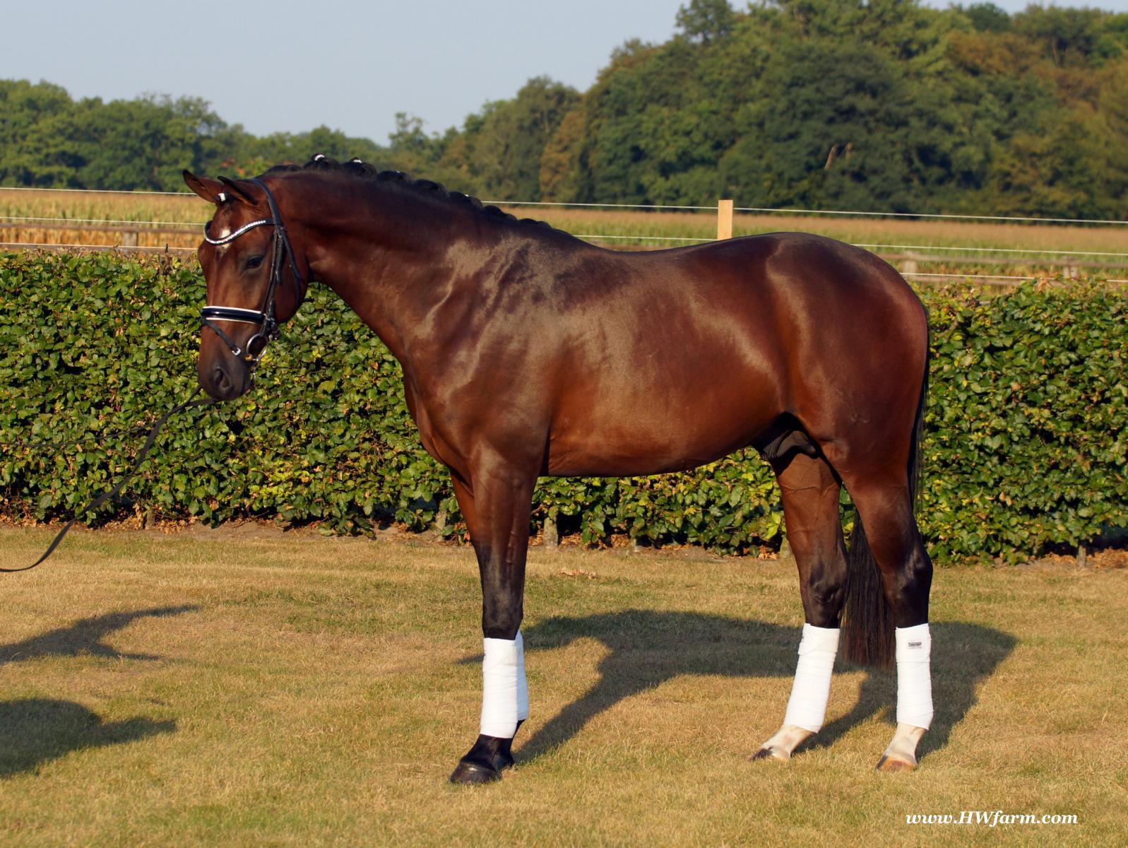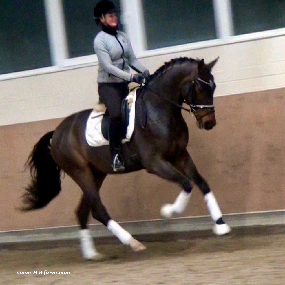 3 x Westphalian Champion & ViceBundesChampion son Quincy HW, dark bay Rhineland gelding by the powerful and dynamic Quotenkönig/Sandro Hit, born in 2014, standing approximately 169 cm or 16.2 hands. Quotenkönig, Vice Bundeschampion 2012, Westphalian Champion 2012, 2013 and 2014. BundesChampionat 2015, 4th place, WorldChampionship 2015, 8th place in the final round, victories in 3rd and 4th levels, WorldChampionship 2016, 4th place, multiple S & M Dressage victories and counting! Quotenkönig is by the Bundeschampion Quaterback. A breathtaking stallion with phenomenal offspring. Here are just some of the highlights for Quaterback: Scores for the Bundeschampionat: Trot; 9.5 Canter: 10 walk 7.5 Conformation: 9.5 Overall Impression: 9.5 Licensed for Berlin-Brandenburg, Oldenburg , Hanoverian This exceptional moving young stallion has already started his winning ways. Paired with the talented young rider, Christian Flamm of Hessen, Quaterback galloped away from the competition at the Bundeschampionate in 2006. He started his stallion career by being named Champion of his licensing in Neustadt/Dosse in 2005. In 2006, after the Bundeschampionate, he went on to win his 30 day test at Neustadt/Dosse with outstanding scores: Int. 9.0 Trot 9.25 Canter 9.75 Walk 7.63 Riding qualities 9.75 Jumping 7.75 Quotenkönig's dam is "St.Pr.St. Fleet-Street", 1. Reserve-Champion (Elite) of the mare performance testing in the year 2006 and she participated at the Bundeschampionat as well. She scored an amazing 8.99 at her performance testing. SPS Fleet-Street under saddle: SPS Fleet-Street in hand: She is by the famous Fürst Piccolo, a 100 Day Performance Test Winner! Fürst Piccolo's sire Fidermark was the vice champion of the NRW approvals in 1994 and won the Warendorf state stallion performance test with a big margin in 1995. Further successes followed in 1996. He dominated the "Optimum of Westphalian Riding Horses" sovereignty in Munster . He also became the Buneschampion in his home town of Warendorf . He then went on to win the LVM stallion championship in Munster Handorf. He has had many wins in the Prix St George and Intermediaire I under Marlies Van Baalen and he is trained by Johann Hinnemann. In 2003 he made his debut successfully at Grand Prix. His first foal crops produced sensational foals. They dominated the Westphalian Foal shows and the NRW elite foal auctions. In 1998 his first approved son Fein Sinn won the 100 day test, the first of several including the impressive moving Fürst Piccolo. He has over 15 licensed sons and many state premium mares to his credit already. He is a sire who will dominate German breeding for many years to come. He is ranked highly on the FN breeding values list. The dam sire Mephistopheles, a son of the Trakehner Mackensen derives from a Romadour II mare, establishing a blood connection to the paternal side via Rheingold. Mephistopheles sired the performance test winner Jacquare. Rembrandt in the third generation was a performance test winner with Trakehner blood. Fürst Piccolo was a premium stallion at the NRW main approval in 1999 and won the 100 day test in 2000 with high scores. He is an amazing moving stallion and his first few foal crops have dominated the Westphalian elite foal auctions. Quotenkönig's grand dam is the mother of "Feedback", by Fidertanz, he was the reserve winner of the NRW-stallion licensing 2009. She scored an amazing 8.06 at her performance testing. Feedback is her son, here is some info about him: After victories in riding horse tests and the Federal Championship qualifying with a score of 8.6, underlined its exceptional quality of Feedback with a superb 30-day test in Neustadt / Dosse. He received the best grade point average of all stallions. The descendants of the second NRW reserve winner in 2009 are eagerly awaited. Fidertanz father, the NRW champion stallion in 2004, presented again in 2010 and numerous top foals approved sons. Feedbacks mother, Conn. Pr.St. Scarlett was first reserve champion mare in her circle, is the parent of the premium stallion Fiderhit, the champion mare St.Pr.St. Fleet Street and many winning foals. Dam's sire Sandro Hit was Bundes champion six-year old and World champion of the young horses. Among the best known children of the stallion are the champion stallion Sir Donnerhall as well as the record mare Poetin. The Contender-Holstein and Landgraf lines round out the third and fourth generation of the pedigree. Quotenkönig (King of hearts!) is a picture perfect and absolutely stunning young stallion. He is a favorite of the NRW stallion auditions. Superb gentleman with 3 way above average gaits. He impresses everybody with his cat like movement, super free shoulder and unbelievable active hind end. He is one of a kind in movement, dynamic, charm and esprit. Quincy HW is a high quality youngster. His pedigree reads like no other, famous stallions, famous worldwide known riders! The Olympic horse, Horse Of The Year, Oldenburg Champion stallion and Young Horse Champion, TRIPLE CROWN WINNER - Selten HW, previously Elizabeth Ball's mount, sold for Euro 500.000 to Fiona Bigwood and Anders Dahl - internationally successful, bred and raised by www.HWfarm.com - is by the same sire as Quincy HW's dam sire. Olympic horse Selten HW, bred by www.HWfarm.com with Anders Dahl Quincy HW's dam herself produced a high priced auction horse and a half brother, was in the end ring at the foal championships, she is a proven high quality producer by the stallion of the century, Sandro Hit. Sandro Hit - Better than ever: Dominant refiner with revolutionary breeding performance two of his offspring, St. Emilion and Showtime ridden by Dorothee Schneider, are currently on the German Olympic dressage team. Very few stallions have managed to become a legend during their lifetime. Sandro Hit is therefore almost unique and his production of epochal importance in world dressage horse breeding. He has almost created his own "label": Des