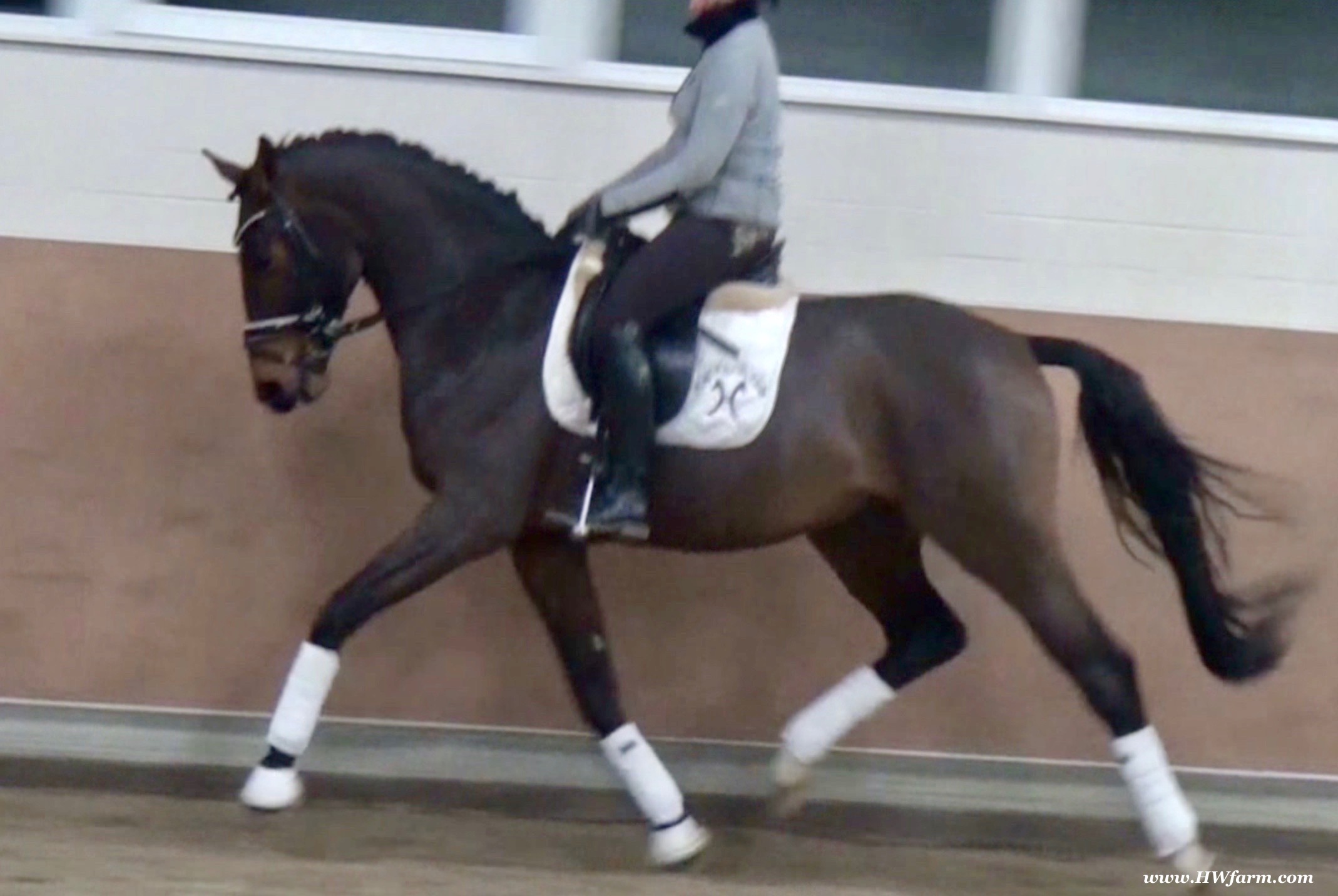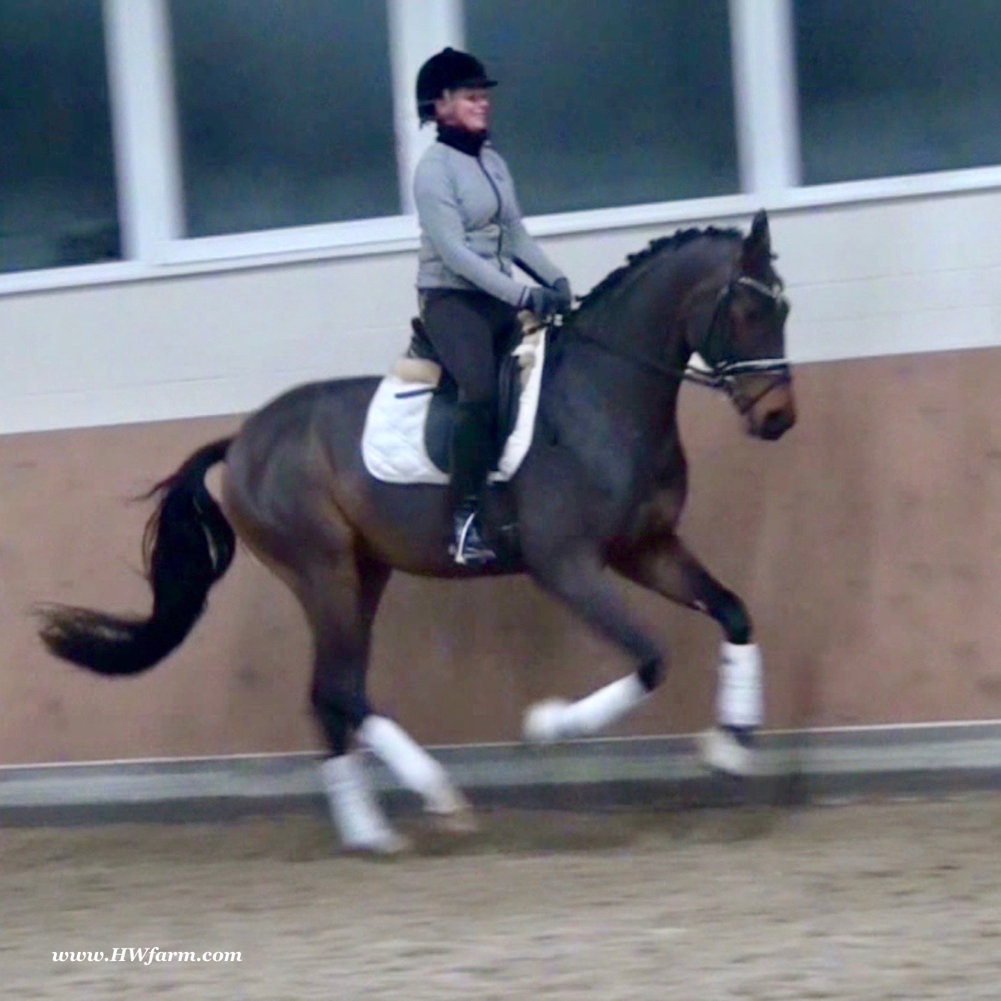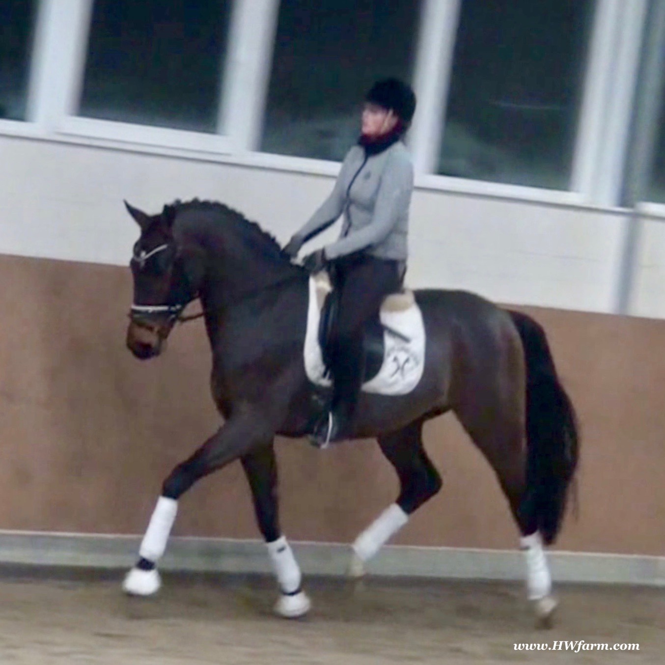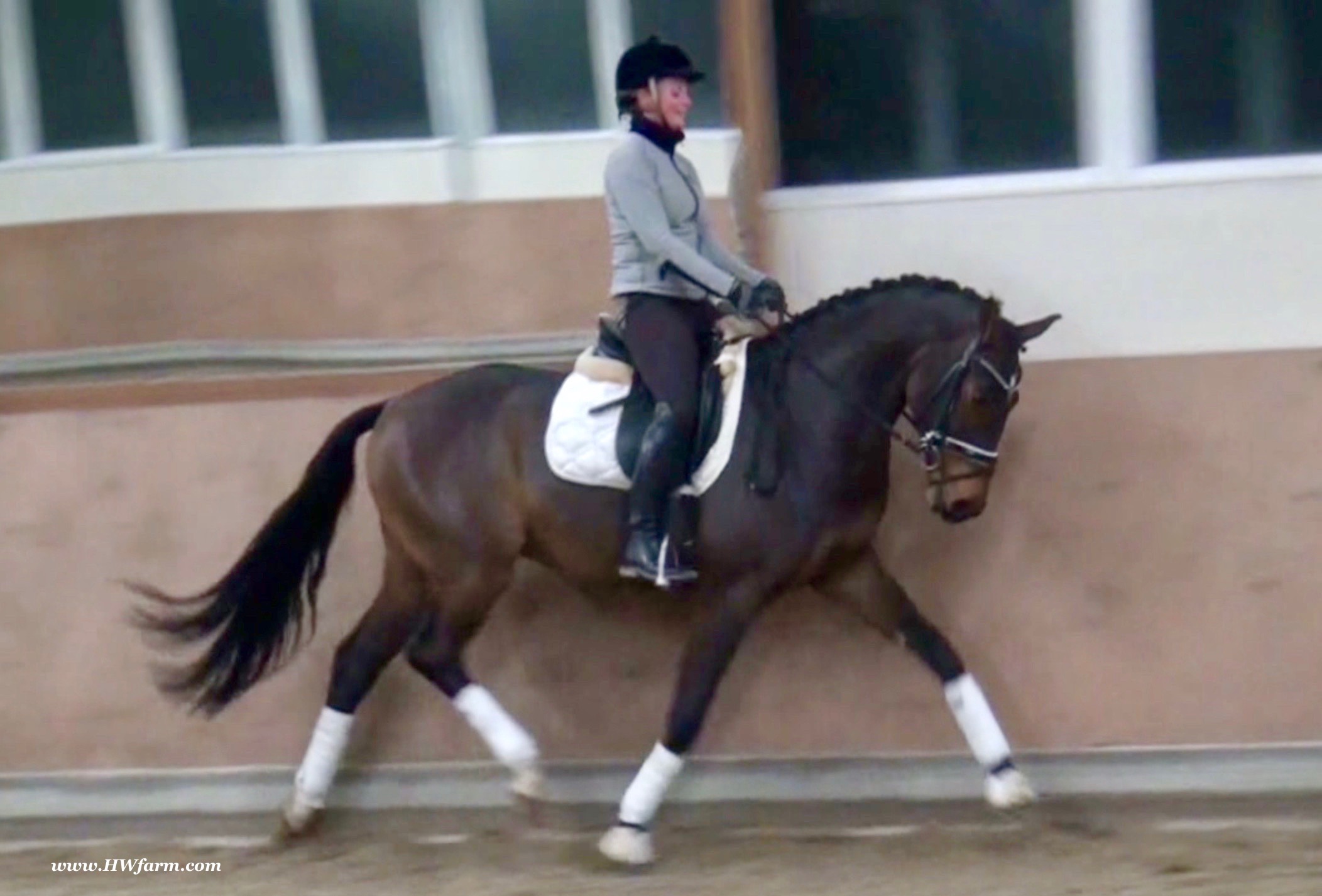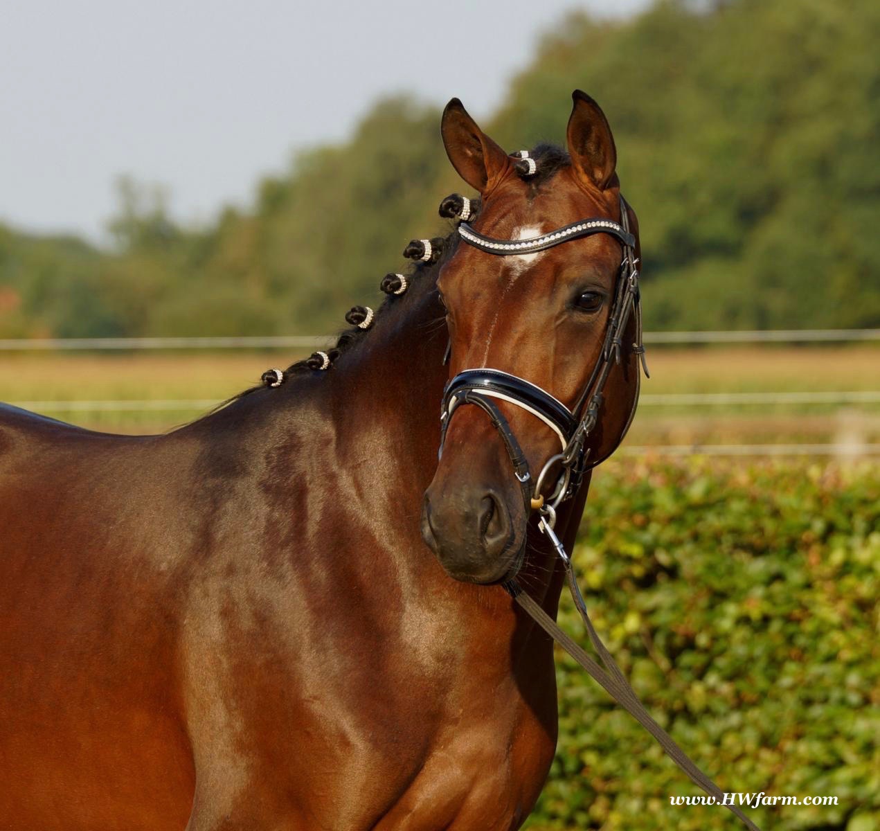 3 x Westphalian Champion & ViceBundesChampion son Quincy HW, dark bay Rhineland gelding by the powerful and dynamic Quotenkönig/Sandro Hit, born in 2014, standing approximately 169 cm or 16.2 hands. Quotenkönig, Vice Bundeschampion 2012, Westphalian Champion 2012, 2013 and 2014. BundesChampionat 2015, 4th place, WorldChampionship 2015, 8th place in the final round, victories in 3rd and 4th levels, WorldChampionship 2016, 4th place, multiple S & M Dressage victories and counting! Quotenkönig is by the Bundeschampion Quaterback. A breathtaking stallion with phenomenal offspring. Here are just some of the highlights for Quaterback: Scores for the Bundeschampionat: Trot; 9.5 Canter: 10 walk 7.5 Conformation: 9.5 Overall Impression: 9.5 Licensed for Berlin-Brandenburg, Oldenburg , Hanoverian This exceptional moving young stallion has already started his winning ways. Paired with the talented young rider, Christian Flamm of Hessen, Quaterback galloped away from the competition at the Bundeschampionate in 2006. He started his stallion career by being named Champion of his licensing in Neustadt/Dosse in 2005. In 2006, after the Bundeschampionate, he went on to win his 30 day test at Neustadt/Dosse with outstanding scores: Int. 9.0 Trot 9.25 Canter 9.75 Walk 7.63 Riding qualities 9.75 Jumping 7.75 Quotenkönig's dam is "St.Pr.St. Fleet-Street", 1. Reserve-Champion (Elite) of the mare performance testing in the year 2006 and she participated at the Bundeschampionat as well. She scored an amazing 8.99 at her performance testing. SPS Fleet-Street under saddle: SPS Fleet-Street in hand: She is by the famous Fürst Piccolo, a 100 Day Performance Test Winner! Fürst Piccolo's sire Fidermark was the vice champion of the NRW approvals in 1994 and won the Warendorf state stallion performance test with a big margin in 1995. Further successes followed in 1996. He dominated the "Optimum of Westphalian Riding Horses" sovereignty in Munster . He also became the Buneschampion in his home town of Warendorf . He then went on to win the LVM stallion championship in Munster Handorf. He has had many wins in the Prix St George and Intermediaire I under Marlies Van Baalen and he is trained by Johann Hinnemann. In 2003 he made his debut successfully at Grand Prix. His first foal crops produced sensational foals. They dominated the Westphalian Foal shows and the NRW elite foal auctions. In 1998 his first approved son Fein Sinn won the 100 day test, the first of several including the impressive moving Fürst Piccolo. He has over 15 licensed sons and many state premium mares to his credit already. He is a sire who will dominate German breeding for many years to come. He is ranked highly on the FN breeding values list. The dam sire Mephistopheles, a son of the Trakehner Mackensen derives from a Romadour II mare, establishing a blood connection to the paternal side via Rheingold. Mephistopheles sired the performance test winner Jacquare. Rembrandt in the third generation was a performance test winner with Trakehner blood. Fürst Piccolo was a premium stallion at the NRW main approval in 1999 and won the 100 day test in 2000 with high scores. He is an amazing moving stallion and his first few foal crops have dominated the Westphalian elite foal auctions. Quotenkönig's grand dam is the mother of "Feedback", by Fidertanz, he was the reserve winner of the NRW-stallion licensing 2009. She scored an amazing 8.06 at her performance testing. Feedback is her son, here is some info about him: After victories in riding horse tests and the Federal Championship qualifying with a score of 8.6, underlined its exceptional quality of Feedback with a superb 30-day test in Neustadt / Dosse. He received the best grade point average of all stallions. The descendants of the second NRW reserve winner in 2009 are eagerly awaited. Fidertanz father, the NRW champion stallion in 2004, presented again in 2010 and numerous top foals approved sons. Feedbacks mother, Conn. Pr.St. Scarlett was first reserve champion mare in her circle, is the parent of the premium stallion Fiderhit, the champion mare St.Pr.St. Fleet Street and many winning foals. Dam's sire Sandro Hit was Bundes champion six-year old and World champion of the young horses. Among the best known children of the stallion are the champion stallion Sir Donnerhall as well as the record mare Poetin. The Contender-Holstein and Landgraf lines round out the third and fourth generation of the pedigree. Quotenkönig (King of hearts!) is a picture perfect and absolutely stunning young stallion. He is a favorite of the NRW stallion auditions. Superb gentleman with 3 way above average gaits. He impresses everybody with his cat like movement, super free shoulder and unbelievable active hind end. He is one of a kind in movement, dynamic, charm and esprit. Quincy HW is a high quality youngster. His pedigree reads like no other, famous stallions, famous worldwide known riders! The Olympic horse, Horse Of The Year, Oldenburg Champion stallion and Young Horse Champion, TRIPLE CROWN WINNER - Selten HW, previously Elizabeth Ball's mount, sold for Euro 500.000 to Fiona Bigwood and Anders Dahl - internationally successful, bred and raised by www.HWfarm.com - is by the same sire as Quincy HW's dam sire. Olympic horse Selten HW, bred by www.HWfarm.com with Anders Dahl Quincy HW's dam herself produced a high priced auction horse and a half brother, was in the end ring at the foal championships, she is a proven high quality producer by the stallion of the century, Sandro Hit. Sandro Hit - Better than ever: Dominant refiner with revolutionary breeding performance two of his offspring, St. Emilion and Showtime ridden by Dorothee Schneider, are currently on the German Olympic dressage team. Very few stallions have managed to become a legend during their lifetime. Sandro Hit is therefore almost unique and his production of epochal importance in world dressage horse breeding. He has almost created his own "label": Des