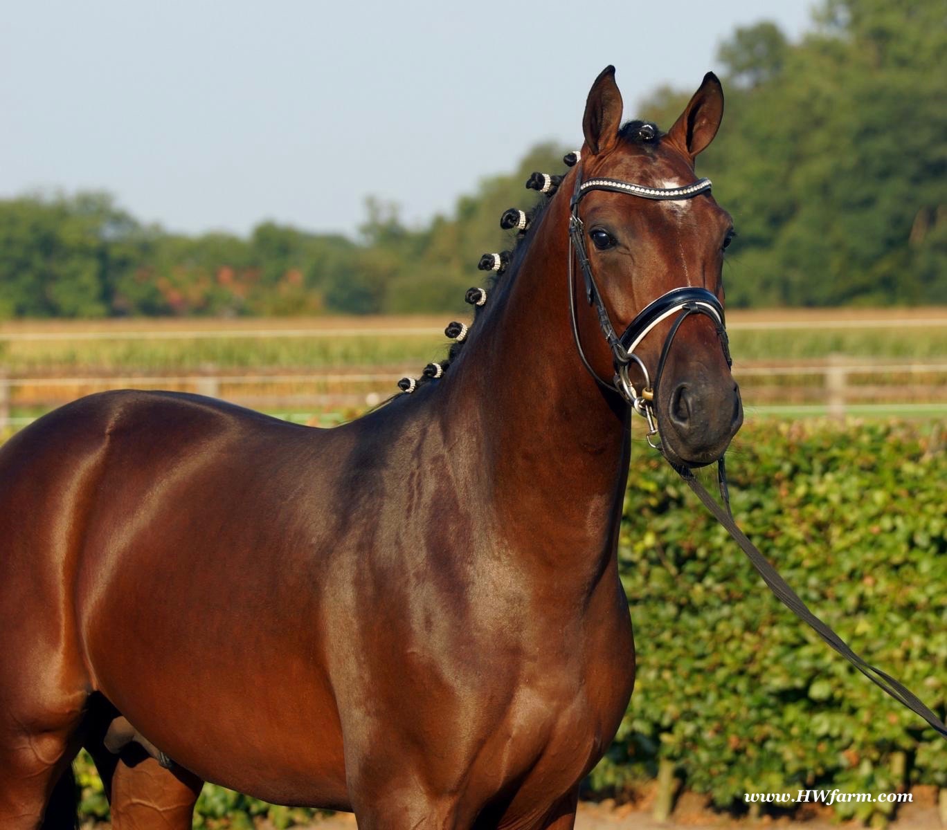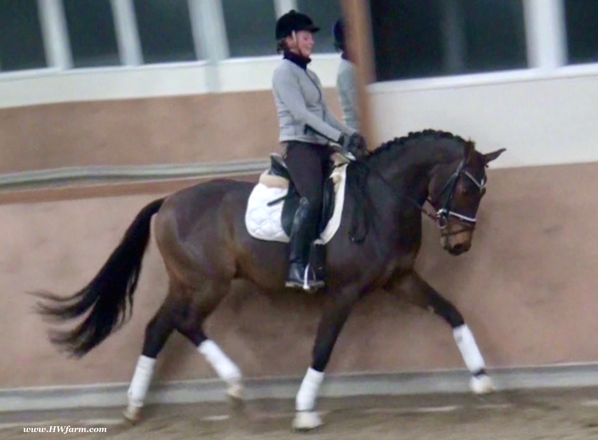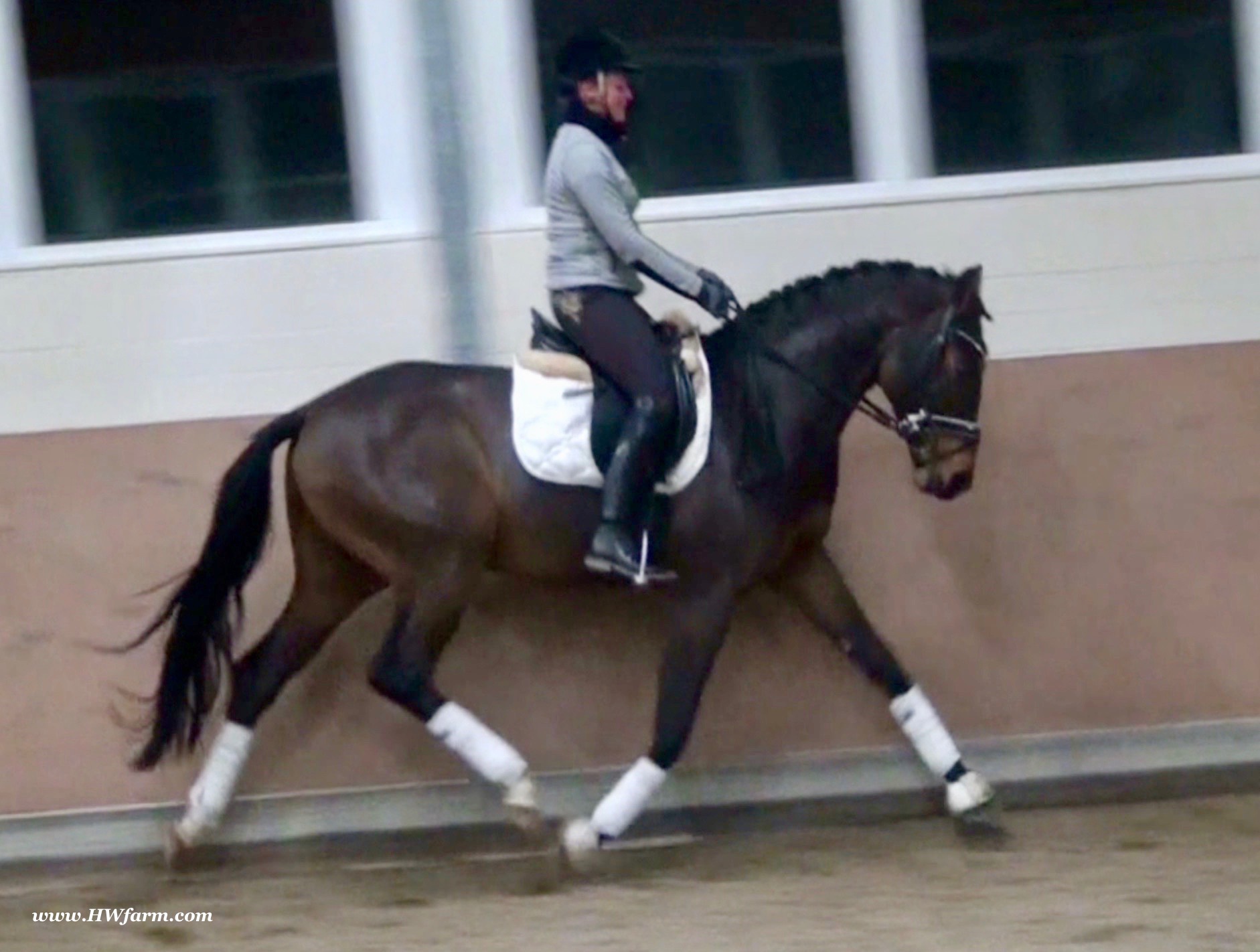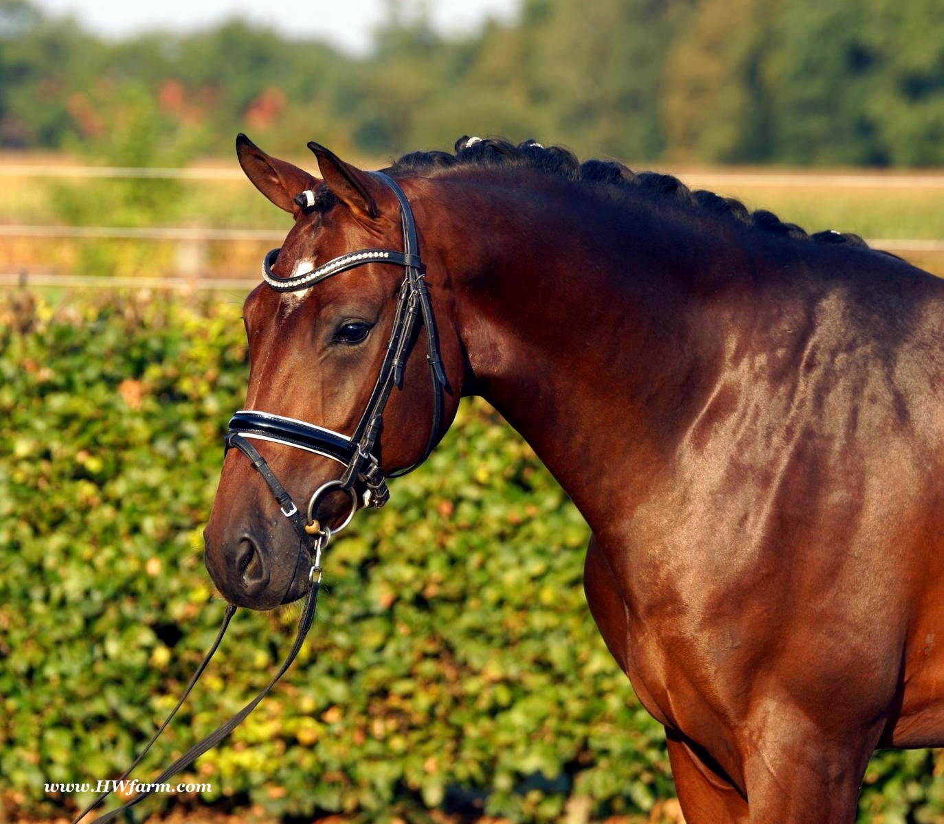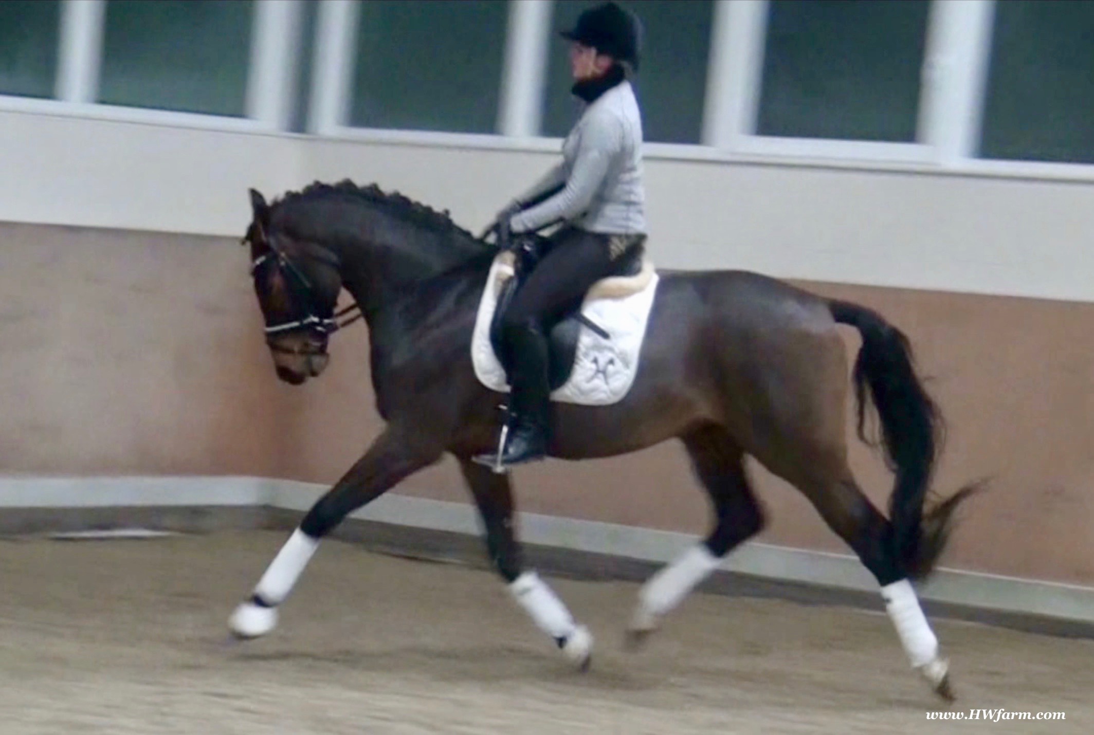3 x Westphalian Champion & ViceBundesChampion son Quincy HW, dark bay Rhineland gelding by the powerful and dynamic Quotenkönig/Sandro Hit, born in 2014, standing approximately 169 cm or 16.2 hands. Quotenkönig, Vice Bundeschampion 2012, Westphalian Champion 2012, 2013 and 2014. BundesChampionat 2015, 4th place, WorldChampionship 2015, 8th place in the final round, victories in 3rd and 4th levels, WorldChampionship 2016, 4th place, multiple S & M Dressage victories and counting! Quotenkönig is by the Bundeschampion Quaterback. A breathtaking stallion with phenomenal offspring. Here are just some of the highlights for Quaterback: Scores for the Bundeschampionat: Trot; 9.5 Canter: 10 walk 7.5 Conformation: 9.5 Overall Impression: 9.5 Licensed for Berlin-Brandenburg, Oldenburg , Hanoverian This exceptional moving young stallion has already started his winning ways. Paired with the talented young rider, Christian Flamm of Hessen, Quaterback galloped away from the competition at the Bundeschampionate in 2006. He started his stallion career by being named Champion of his licensing in Neustadt/Dosse in 2005. In 2006, after the Bundeschampionate, he went on to win his 30 day test at Neustadt/Dosse with outstanding scores: Int. 9.0 Trot 9.25 Canter 9.75 Walk 7.63 Riding qualities 9.75 Jumping 7.75 Quotenkönig's dam is "St.Pr.St. Fleet-Street", 1. Reserve-Champion (Elite) of the mare performance testing in the year 2006 and she participated at the Bundeschampionat as well. She scored an amazing 8.99 at her performance testing. SPS Fleet-Street under saddle: SPS Fleet-Street in hand: She is by the famous Fürst Piccolo, a 100 Day Performance Test Winner! Fürst Piccolo's sire Fidermark was the vice champion of the NRW approvals in 1994 and won the Warendorf state stallion performance test with a big margin in 1995. Further successes followed in 1996. He dominated the "Optimum of Westphalian Riding Horses" sovereignty in Munster . He also became the Buneschampion in his home town of Warendorf . He then went on to win the LVM stallion championship in Munster Handorf. He has had many wins in the Prix St George and Intermediaire I under Marlies Van Baalen and he is trained by Johann Hinnemann. In 2003 he made his debut successfully at Grand Prix. His first foal crops produced sensational foals. They dominated the Westphalian Foal shows and the NRW elite foal auctions. In 1998 his first approved son Fein Sinn won the 100 day test, the first of several including the impressive moving Fürst Piccolo. He has over 15 licensed sons and many state premium mares to his credit already. He is a sire who will dominate German breeding for many years to come. He is ranked highly on the FN breeding values list. The dam sire Mephistopheles, a son of the Trakehner Mackensen derives from a Romadour II mare, establishing a blood connection to the paternal side via Rheingold. Mephistopheles sired the performance test winner Jacquare. Rembrandt in the third generation was a performance test winner with Trakehner blood. Fürst Piccolo was a premium stallion at the NRW main approval in 1999 and won the 100 day test in 2000 with high scores. He is an amazing moving stallion and his first few foal crops have dominated the Westphalian elite foal auctions. Quotenkönig's grand dam is the mother of "Feedback", by Fidertanz, he was the reserve winner of the NRW-stallion licensing 2009. She scored an amazing 8.06 at her performance testing. Feedback is her son, here is some info about him: After victories in riding horse tests and the Federal Championship qualifying with a score of 8.6, underlined its exceptional quality of Feedback with a superb 30-day test in Neustadt / Dosse. He received the best grade point average of all stallions. The descendants of the second NRW reserve winner in 2009 are eagerly awaited. Fidertanz father, the NRW champion stallion in 2004, presented again in 2010 and numerous top foals approved sons. Feedbacks mother, Conn. Pr.St. Scarlett was first reserve champion mare in her circle, is the parent of the premium stallion Fiderhit, the champion mare St.Pr.St. Fleet Street and many winning foals. Dam's sire Sandro Hit was Bundes champion six-year old and World champion of the young horses. Among the best known children of the stallion are the champion stallion Sir Donnerhall as well as the record mare Poetin. The Contender-Holstein and Landgraf lines round out the third and fourth generation of the pedigree. Quotenkönig (King of hearts!) is a picture perfect and absolutely stunning young stallion. He is a favorite of the NRW stallion auditions. Superb gentleman with 3 way above average gaits. He impresses everybody with his cat like movement, super free shoulder and unbelievable active hind end. He is one of a kind in movement, dynamic, charm and esprit. Quincy HW is a high quality youngster. His pedigree reads like no other, famous stallions, famous worldwide known riders! The Olympic horse, Horse Of The Year, Oldenburg Champion stallion and Young Horse Champion, TRIPLE CROWN WINNER - Selten HW, previously Elizabeth Ball's mount, sold for Euro 500.000 to Fiona Bigwood and Anders Dahl - internationally successful, bred and raised by www.HWfarm.com - is by the same sire as Quincy HW's dam sire. Olympic horse Selten HW, bred by www.HWfarm.com with Anders Dahl Quincy HW's dam herself produced a high priced auction horse and a half brother, was in the end ring at the foal championships, she is a proven high quality producer by the stallion of the century, Sandro Hit. Sandro Hit - Better than ever: Dominant refiner with revolutionary breeding performance two of his offspring, St. Emilion and Showtime ridden by Dorothee Schneider, are currently on the German Olympic dressage team. Very few stallions have managed to become a legend during their lifetime. Sandro Hit is therefore almost unique and his production of epochal importance in world dressage horse breeding. He has almost created his own "label": Des