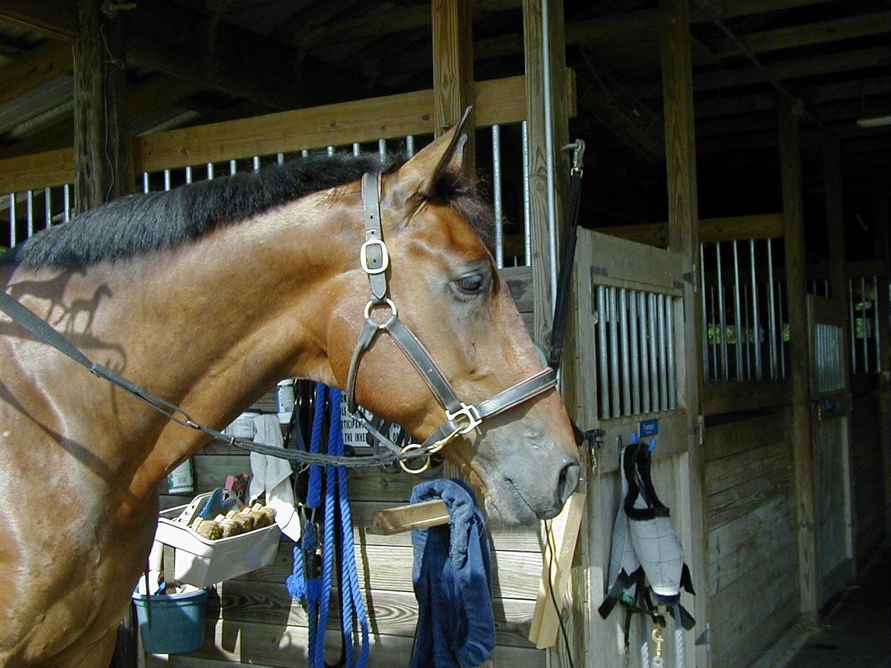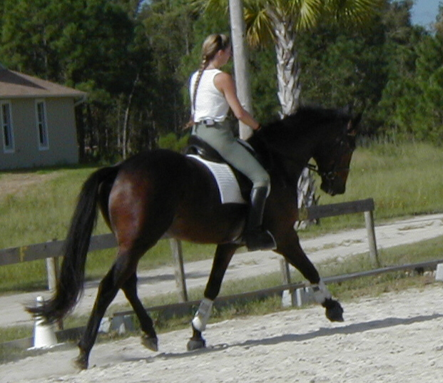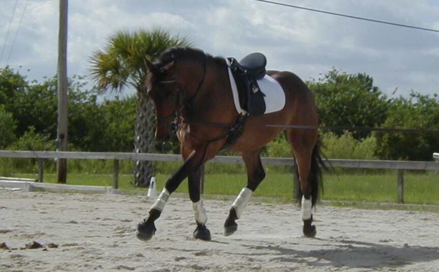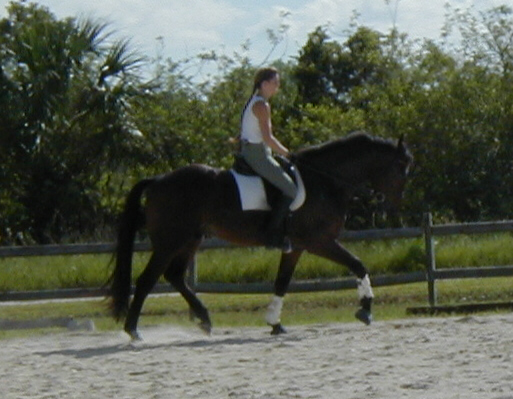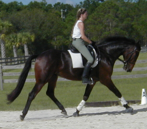 Regaro: Regaro (Regazzoni - Figaro - Vollkorn xx) was born in 2000, stands 17.0 hands, and has a natural cadence that is to die for! This dark bay beauty is sizeable enough for a taller rider, yet his sensitivity make him suitable for a smaller rider as well. He is branded and registered Oldenburg and has recently been imported from Germany. He is straight forward to ride, light from the leg, and pleasant in the bridle even at this tender age of four! Regaro's gaits are impressive, and he is very well balanced. His lovely neck and near perfect conformation will surely catch the eye of all discerning horse enthusiasts. Don't miss out on this rising star, he'll be glowing in the show ring for sure.