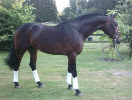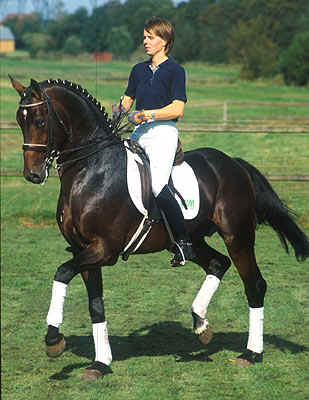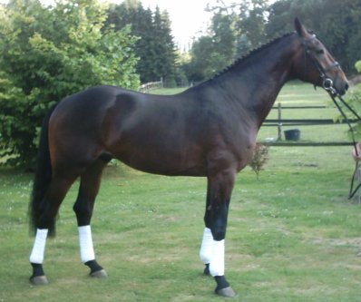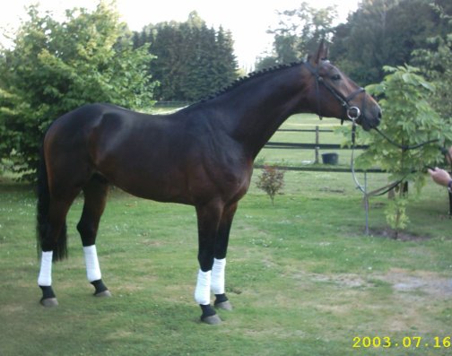 The single Thumbnail above is showing Regazzoni the father of the wonderful gelding Regaro. Regaro (Regazzoni - Figaro - Vollkorn xx) was born in 2000 and will be your future dressage star. He is branded and papered Oldenburg and still with his breeder in Germany. He stands close to 17 hands and will fit the taller person as well as the medium size rider. He is easy to ride and has a feeling for tact and rhythm. He is dark bay and very nice to handle. His gaits are impressive and he has already a lot of balance for his age and he is just some weeks under saddle. Don't miss out this one, he'll be the star in the dressage ring for sure. This horse is real fun to ride, you'll be impressed! He is a son of the famous Regazzoni (Rubinstein line) who was recently imported to the USA, he is of outstanding quality, see more information about him on our stallion site. Rubinstein usually doesn't need an introduction, but you are welcome to read a whole story about him. On the mother line, he is by the Oldenburg Foundation stallion "Figaro". The legendary Oldenburg foundation sire Figaro passed away on May 24, 2000. This is a tragic loss for the Oldenburger verband which lost two of its best stallions, Figaro and Rubinstein I, within two weeks. Oldenburg connoisseur and chief editor of the Oldenburger Sportpferd magazine Jan Toenjes explains: "Figaro was a lifetime legend in the Oldenburg breed. The last "purebred" Oldenburg was sired by the Anglo-Norman Futuro (by Furioso xx). Figaro's dam Veilchenate by Goerz was one of the last mares of the old coach horse type to be used for breeding in the early 1970s. The chestnut, born in 1972, was awarded with the "Oldenburg champion stallion" title in 1976. He sired Grand Prix competition horses for both show jumping (Figaro's Boy/Ludger Beerbaum) and Flower/John Whitaker) and dressage (Aleppo (Argentinus x Figaro) and Rainier (Ronaldo x Figaro). Figaro sired multiple Bundeschampionate winners like Figaro's Lady (later sold at the Vechta auction for DM 100.000 - which was a spectacular price in the early 80s) or Frauenfreund - a promising Grand Prix mount that accidentally died. His son Formidable (Figaro x Inschallah) ridden by Markus Gribbe of Wasserburg/Inn was the only horse to beat Anthony FRH as a 5-year-old at the Bundeschampionate in Munich in the first qualification. Waldelefe (Figaro x Tin Rocco) made it to the Nurnberger Burgpokal finals 1999 ridden by Hiltrud Mohrmann. Figaro was only approved for the Oldenburg Verband - in the past years he was in the lead in the "old sires" section of the FN breed statistics. Figaro had to be put down because of his age, he sired 5 approved sons and 228 registered Oldenburg broodmares of which 46 received the state premium title. last update : 09/10/25 12:30 PM