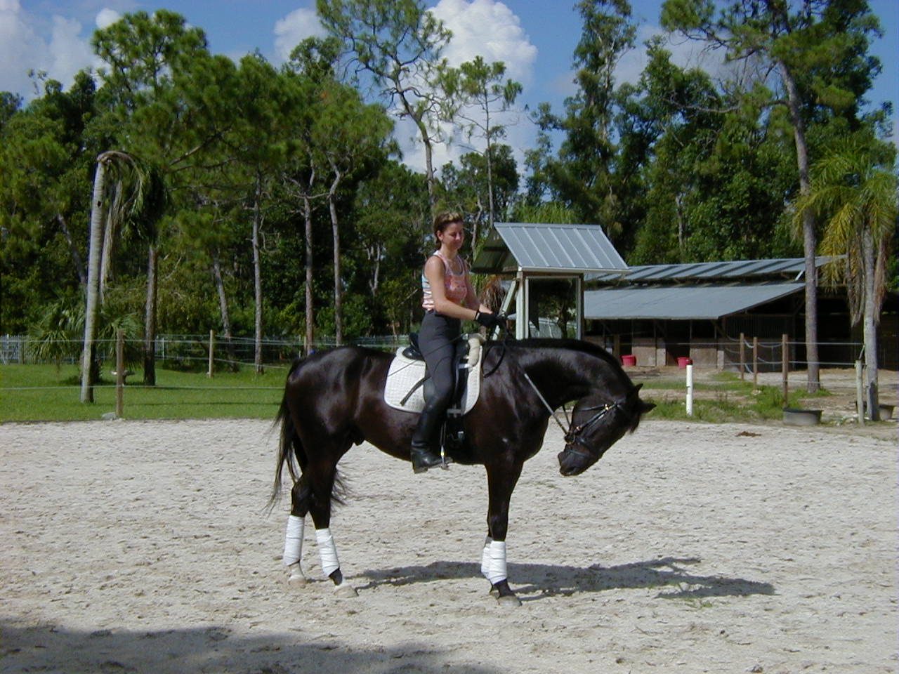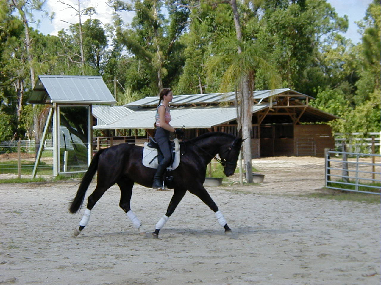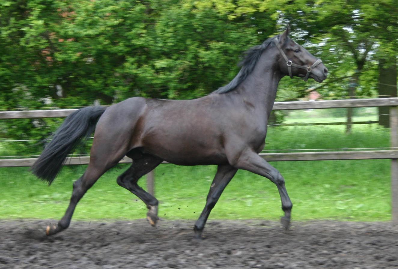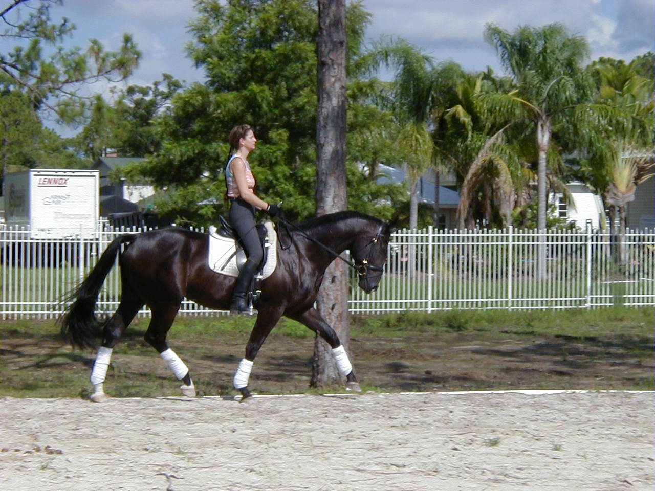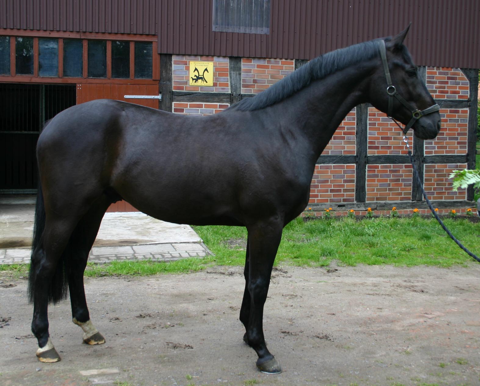 NEW now with video clips (click here) Riccie HW, born February 2002, is a 16,2 hand black gelding by Reccio L. Riccie was presented at the German stallion licensing, by the owners of his sire. They were hoping that his approval would be a nice feather in the cap of his sire because Reccio had just been sold to new owners in China. With so many quality youngsters being bred in Germany (out of approximately 800, only 100 get pre selected and only some of them get approved!), Riccie was not licensed and is now being offered as a super riding horse for the discerning person. Riccie is an exceptional “stallion look-a -like” example of the Hanoverian breed. His shiny ebony coat plus his natural expression keep eyes turning everywhere he goes. With a gorgeous neck and wonderful gaits, this fellow is destined for a show career. He is also quite comfortable to sit and loves to work. He is safe and sensible in and out of the ring. He is forward thinking but not hot and calm enough without being boring or lazy. Riccie can be ridden by nearly any level of rider. He can also be your best friend and partner because he wallows in the extra attention. He is quite a clown in the barn, will help to fill up water buckets (he holds the water hose!) and he’ll open the door for you, without being annoying! Impeccable barn manners also speak volumes of the quality of this fellow. He bathes loads and stands quietly for the vet and blacksmith. Riccie loves his special grooming time and patiently allows my 14 year old daughter to manage, handle and ride him. He is suitable for other young riders too! His bloodlines go back to Raphael (Ramiro), Falkland as well as the world famous Calypso. This will enable him to be a perfect partner for dressage or jumping, depending on your personal preference. He is currently in dressage training with a small jump here and there for fun. He is very reasonably priced at $ 28,900 for a limited time. His price will soon go up with further training and with show ring experience. Blue ribbons tend to add value, and we are sure that Riccie will get more than his share!