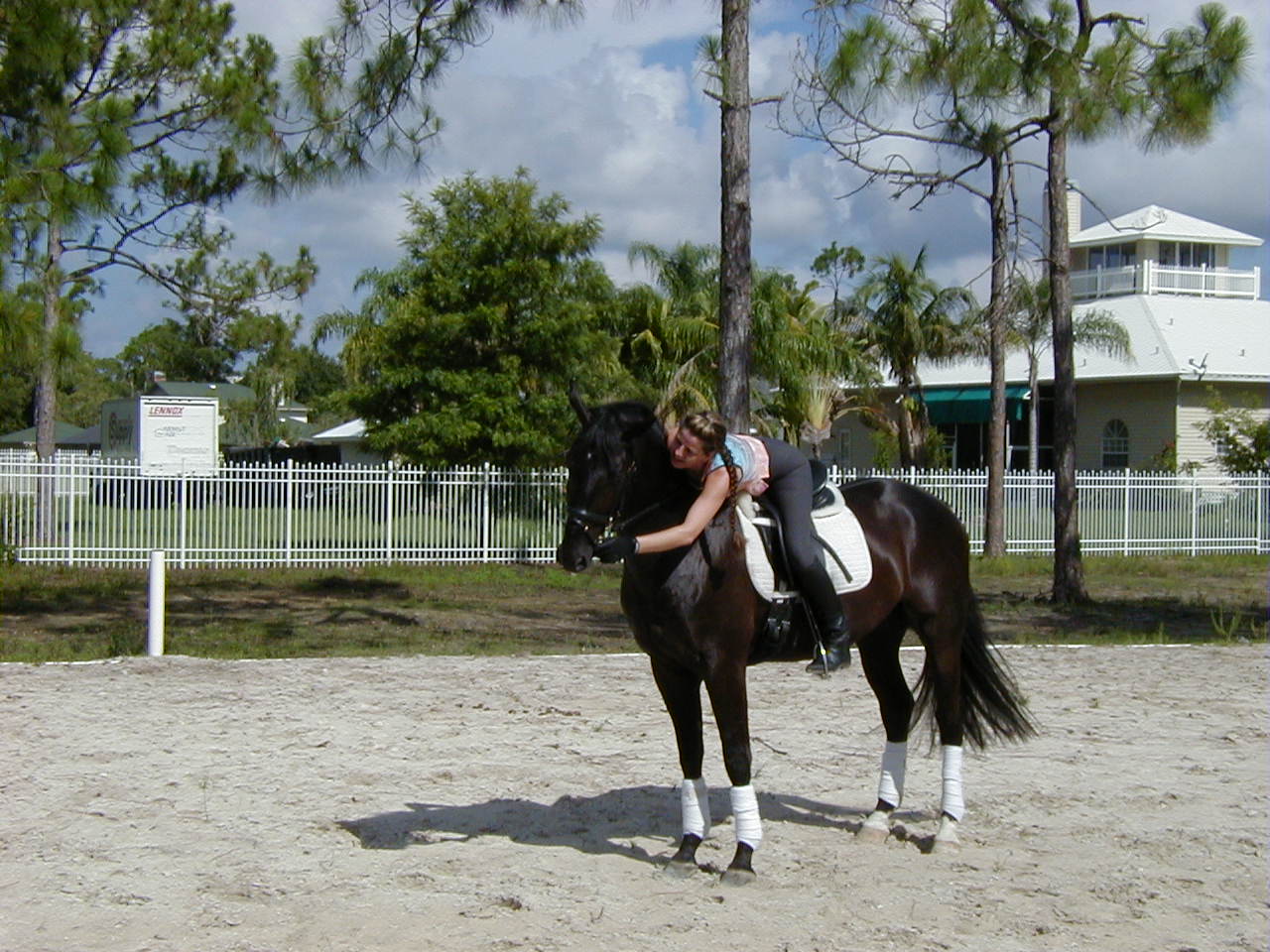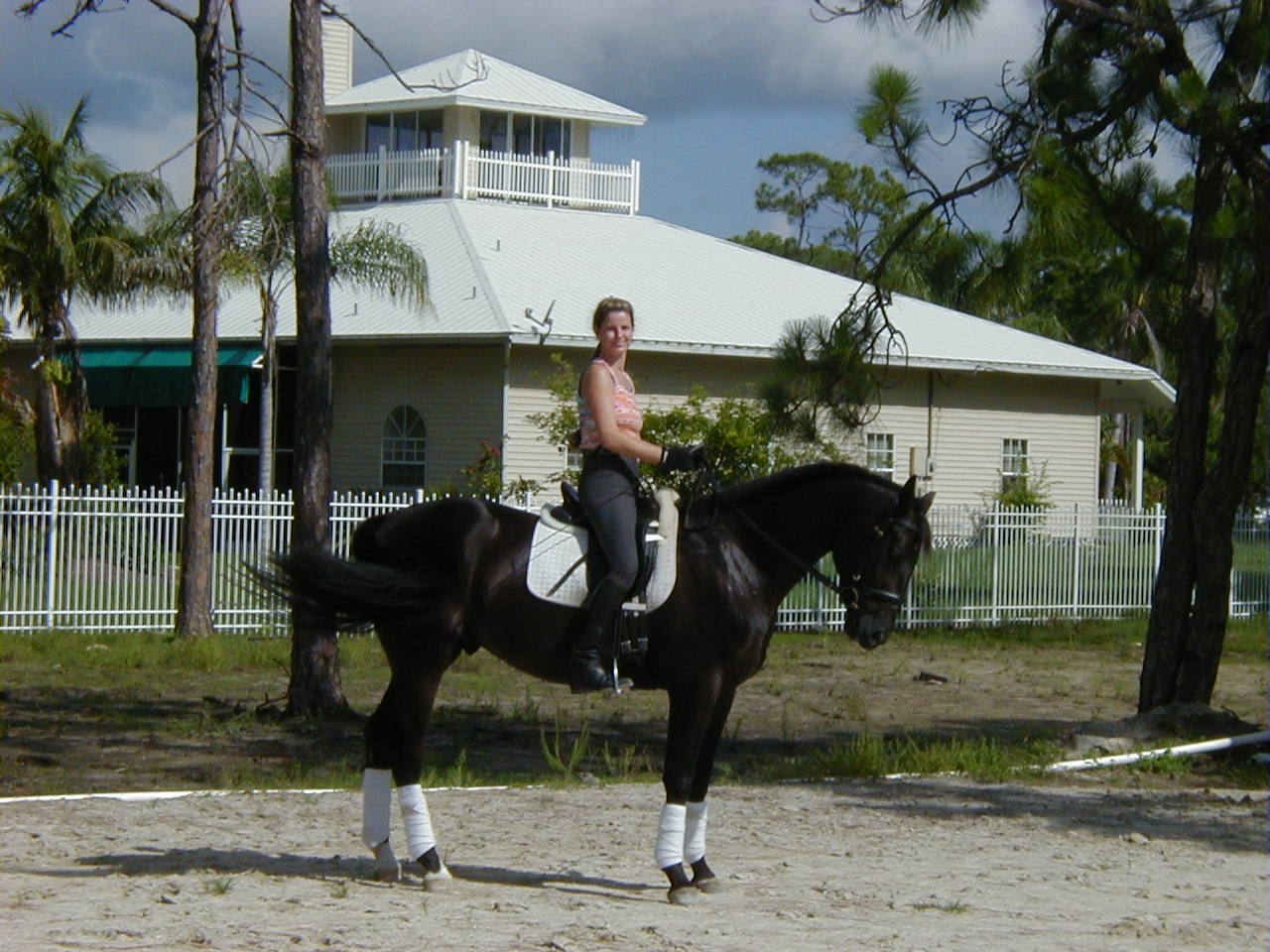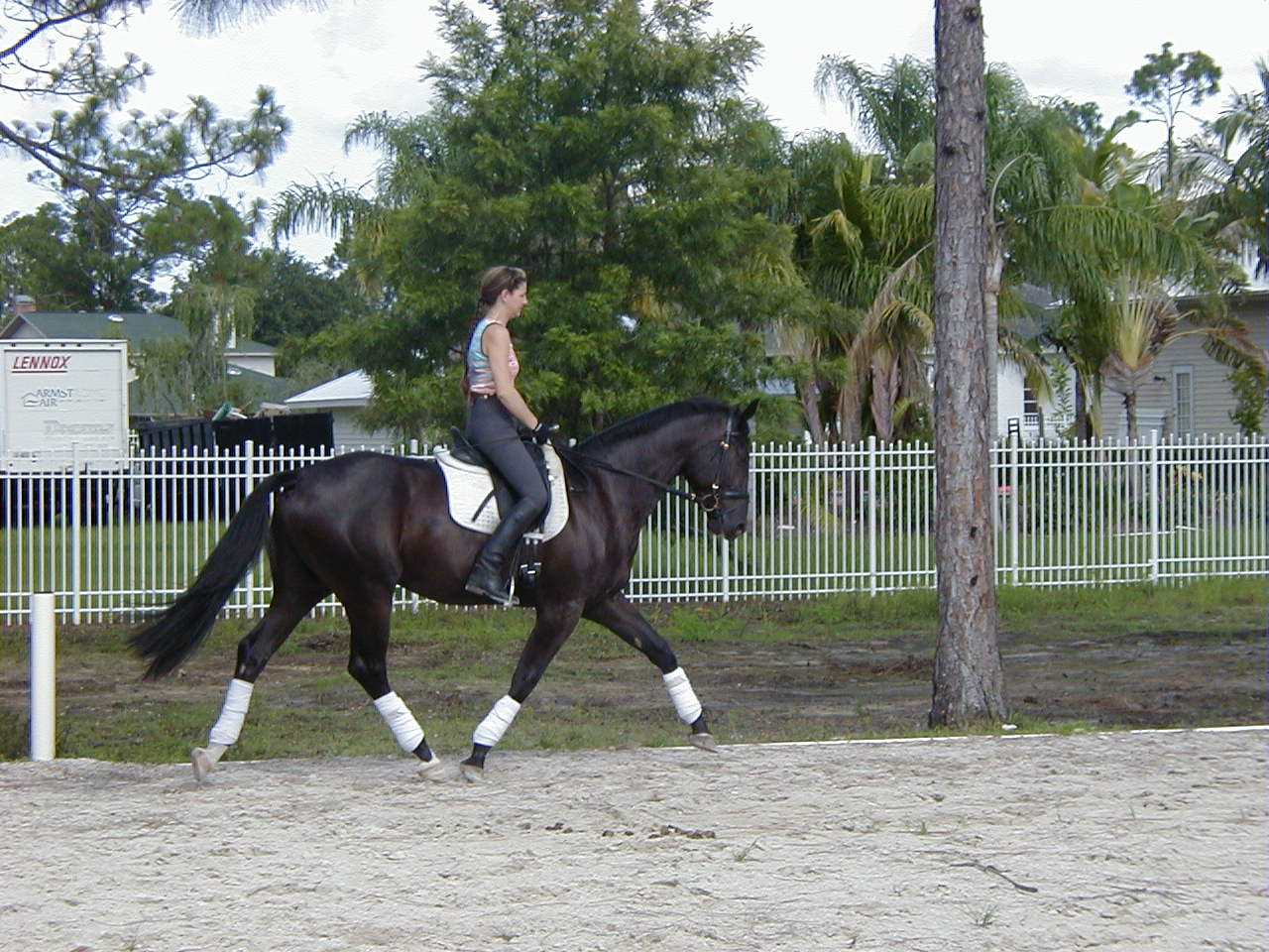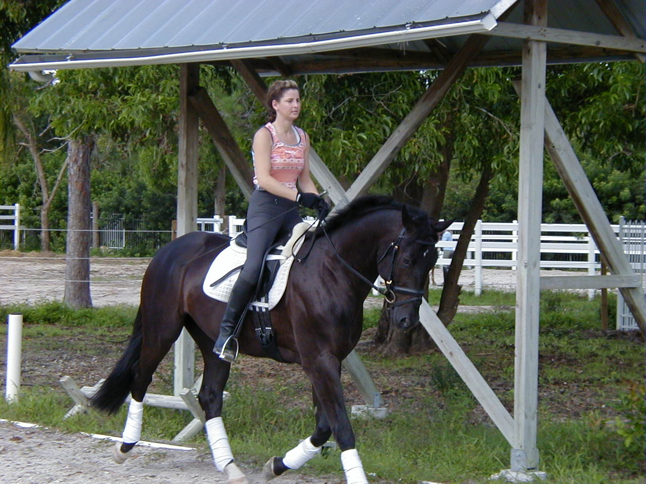 NEW now with video clips (click here) Riccie HW, born February 2002, is a 16,2 hand black gelding by Reccio L. Riccie was presented at the German stallion licensing, by the owners of his sire. They were hoping that his approval would be a nice feather in the cap of his sire because Reccio had just been sold to new owners in China. With so many quality youngsters being bred in Germany (out of approximately 800, only 100 get pre selected and only some of them get approved!), Riccie was not licensed and is now being offered as a super riding horse for the discerning person. Riccie is an exceptional “stallion look-a -like” example of the Hanoverian breed. His shiny ebony coat plus his natural expression keep eyes turning everywhere he goes. With a gorgeous neck and wonderful gaits, this fellow is destined for a show career. He is also quite comfortable to sit and loves to work. He is safe and sensible in and out of the ring. He is forward thinking but not hot and calm enough without being boring or lazy. Riccie can be ridden by nearly any level of rider. He can also be your best friend and partner because he wallows in the extra attention. He is quite a clown in the barn, will help to fill up water buckets (he holds the water hose!) and he’ll open the door for you, without being annoying! Impeccable barn manners also speak volumes of the quality of this fellow. He bathes loads and stands quietly for the vet and blacksmith. Riccie loves his special grooming time and patiently allows my 14 year old daughter to manage, handle and ride him. He is suitable for other young riders too! His bloodlines go back to Raphael (Ramiro), Falkland as well as the world famous Calypso. This will enable him to be a perfect partner for dressage or jumping, depending on your personal preference. He is currently in dressage training with a small jump here and there for fun. He is very reasonably priced at $ 28,900 for a limited time. His price will soon go up with further training and with show ring experience. Blue ribbons tend to add value, and we are sure that Riccie will get more than his share!