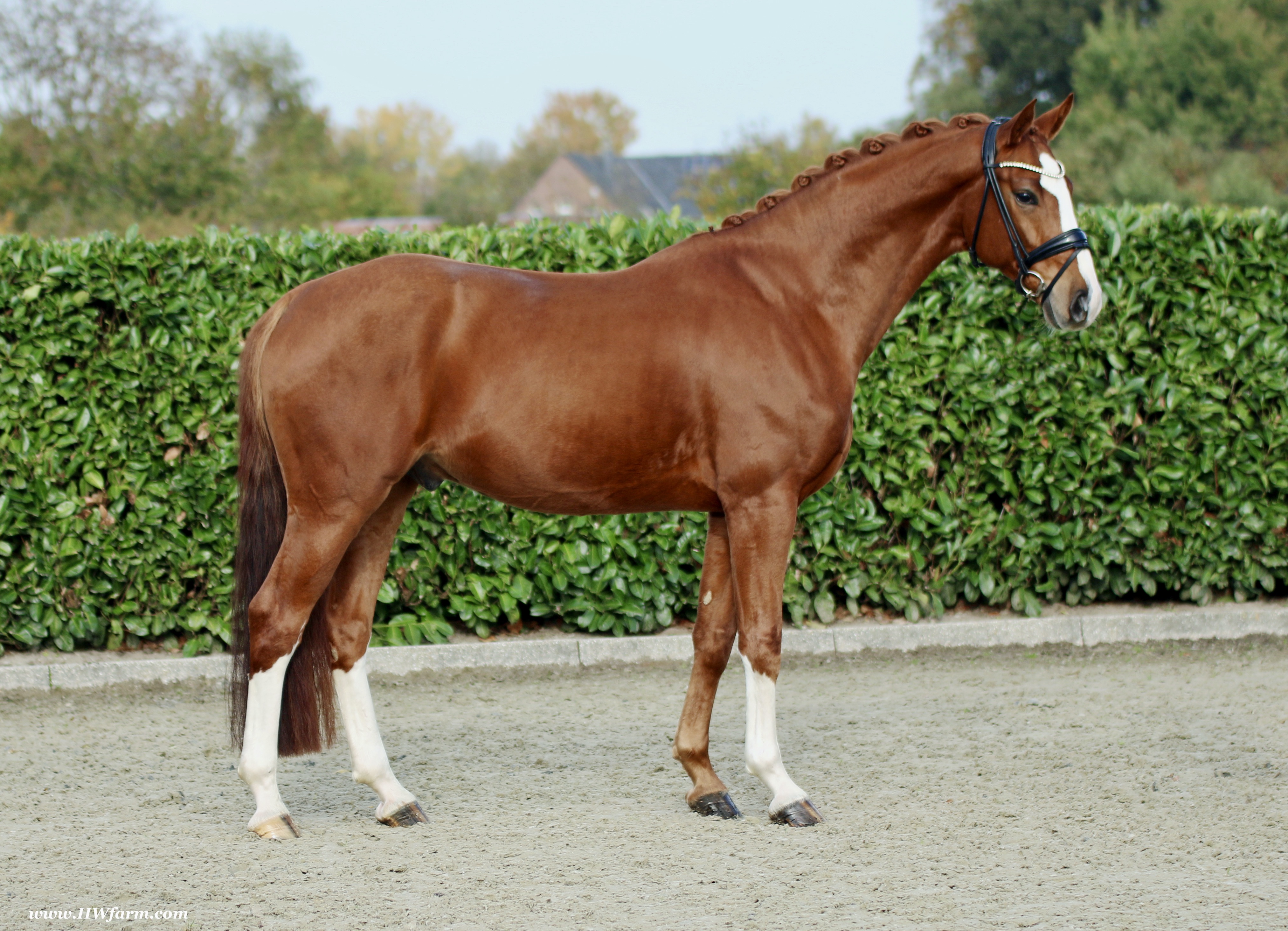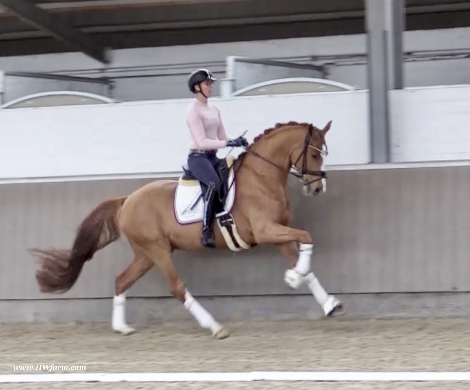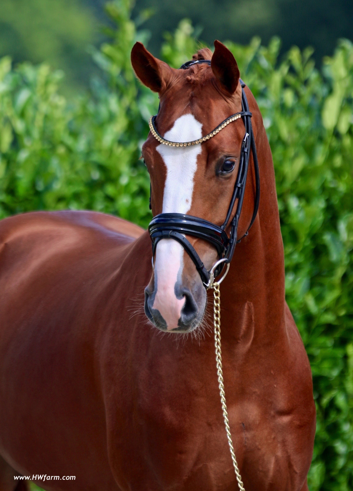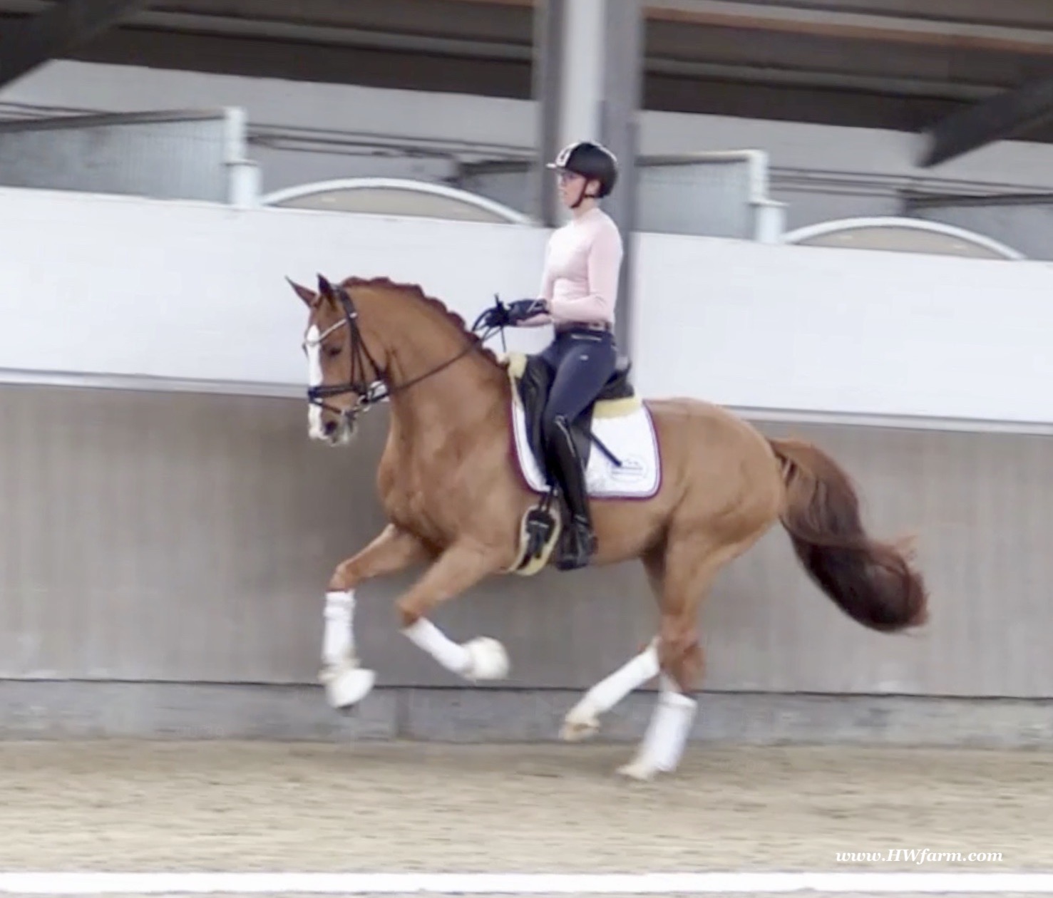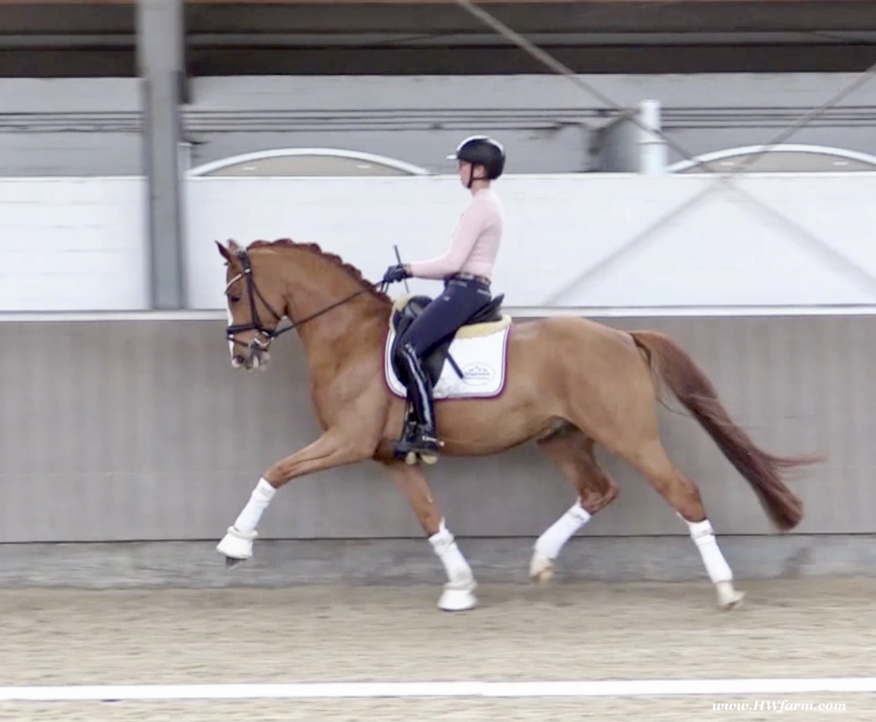 Sir Dynamic HW, chestnut Westphalian gelding, by stallion of the year Sir Heinrich/Champion Don Frederico, born in 2017, standing approximately 166 cm or 16.1 hands. Sir Dynamic HW is by Sir Heinrich, the full-brother to the four Bundeschampions Cindy OLD, Candy OLD, Caty OLD and Casey OLD. His sire Sir Donnerhall I became Bundeschampion of six-year-old dressage horses in 2006 and finished best at the 70-day test in Adelheidsdorf in 2005 (dressage index 163.87). More than 100 of his sons have been licensed, soon 400 of his daughters have been awarded premium mares. As the first mare in history, St.Pr./El.St. C'est bon became dam of five Bundeschampions: Sir Heinrich OLD, Cindy OLD, Candy OLD, Caty OLD and Casey OLD (all by Sir Donnerhall I). Sir Heinrich OLD and Si bon were also licensed, and Oldenburg champion mares are Candy OLD and Casey OLD. He was licensed in 2010 at the NRW main licensing in Münster and completed his 70-day test in Neustadt/Dosse in 2011 with an overall score of 8.5, achieving the second-best result of the entire year with his dressage score of 8.99. As a highly sought-after NRW state stud stallion, he sired 16 licensed sons, more than 60 premium mares, auction price peaks and offspring that are successful in sport. After he won the Oldenburger Landeschampionat in 2012, he became vice-champion in national championships of four years old stallions. At national championships in 2013 he won convincingly his qualification class of five years-old dressage horses, in the finals he saved the silver medal with a scoring of 8.6 in his age group. Sir Heinrich OLD represented the German colors as a five and six years-old in world championships of young dressage horses in Verden. He can show victories in elementary and medium level dressage tests for young horses as well as in advanced level dressage tests (S*). His sport horses career's highlight was certainly the victory in national championships of six years-old dressage horses in 2014 with a total score of 8.7 in the finals. On the occasion of the Oldenburg Stallion Days 2016 he was awarded VTV-Dressage Stallion of the year.