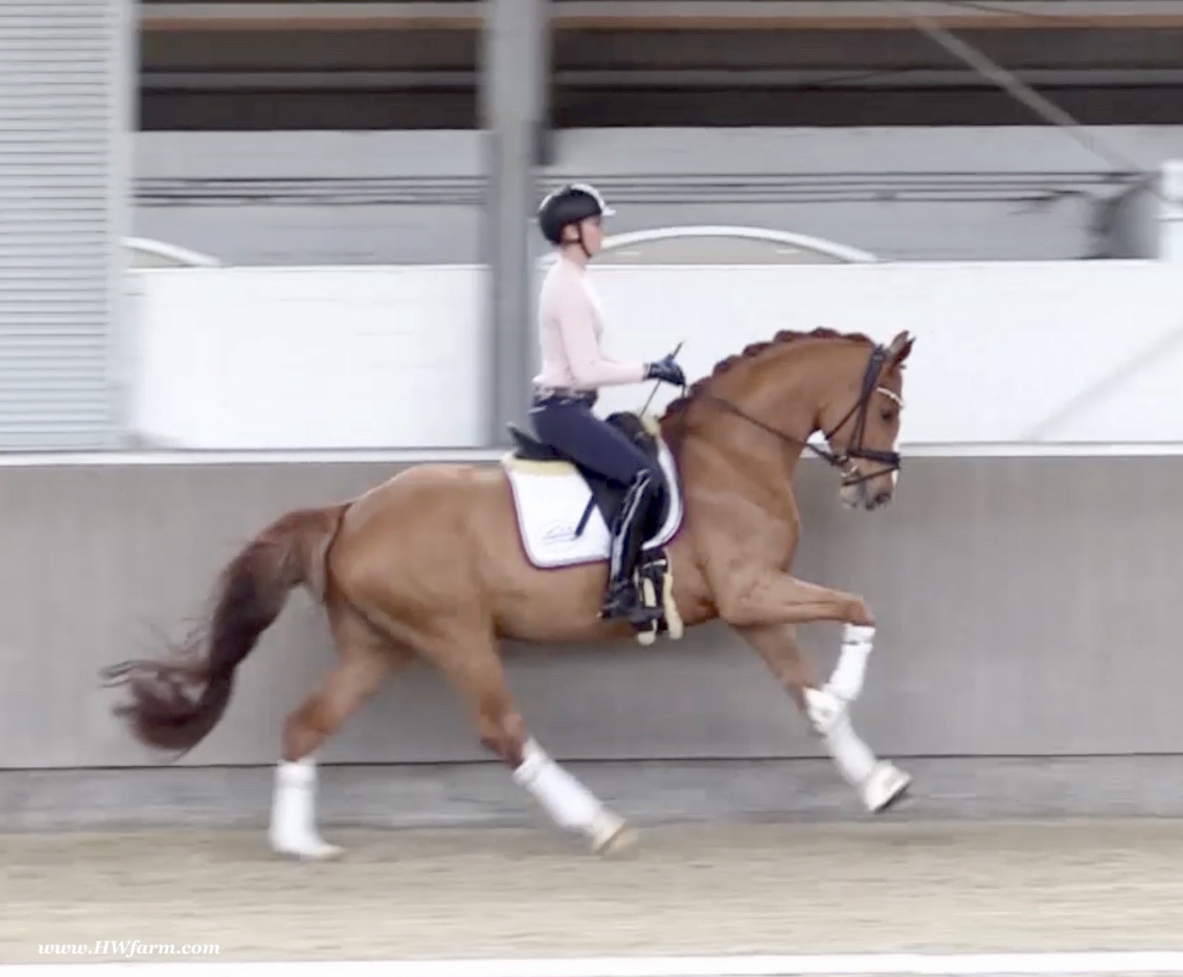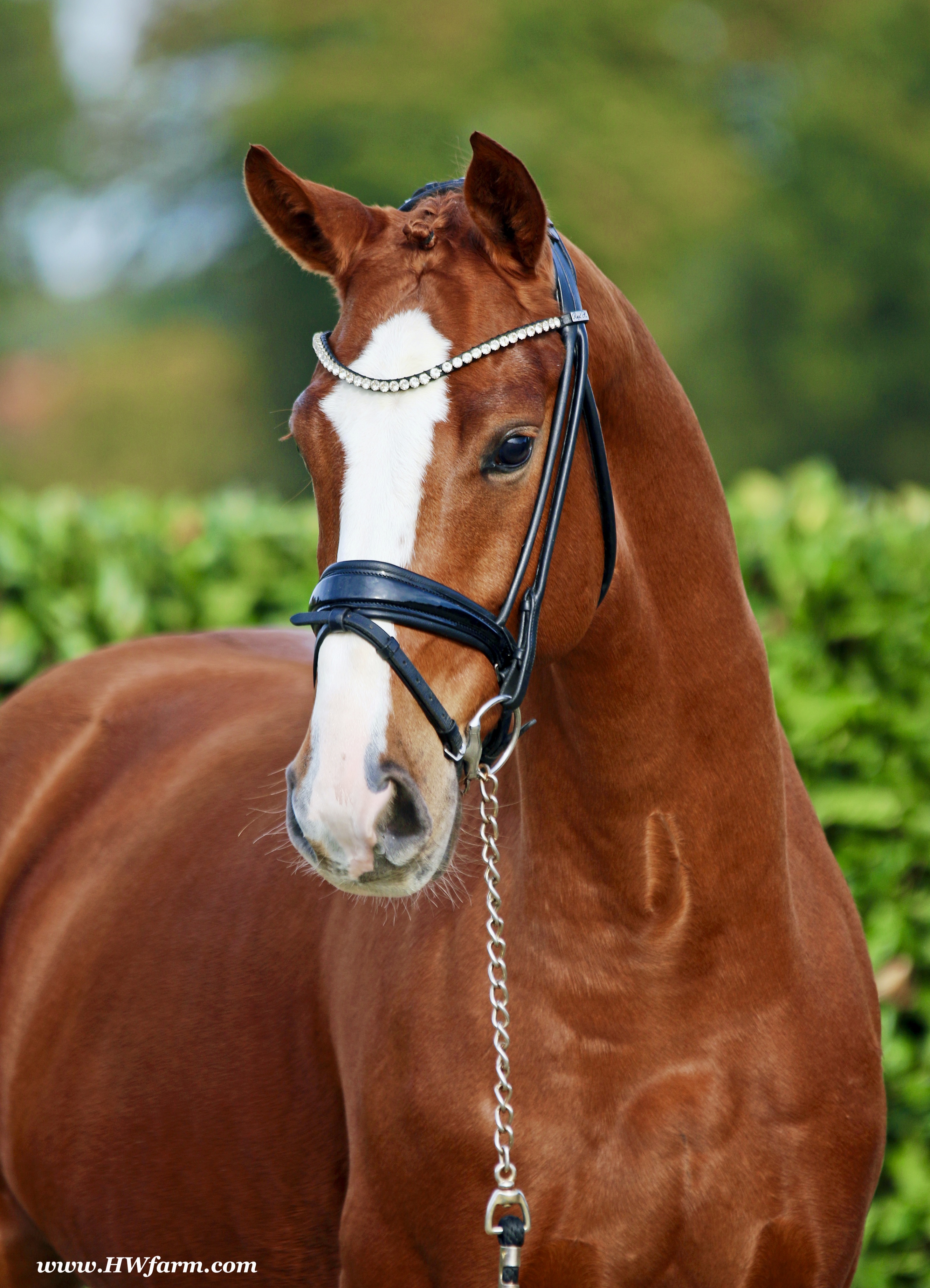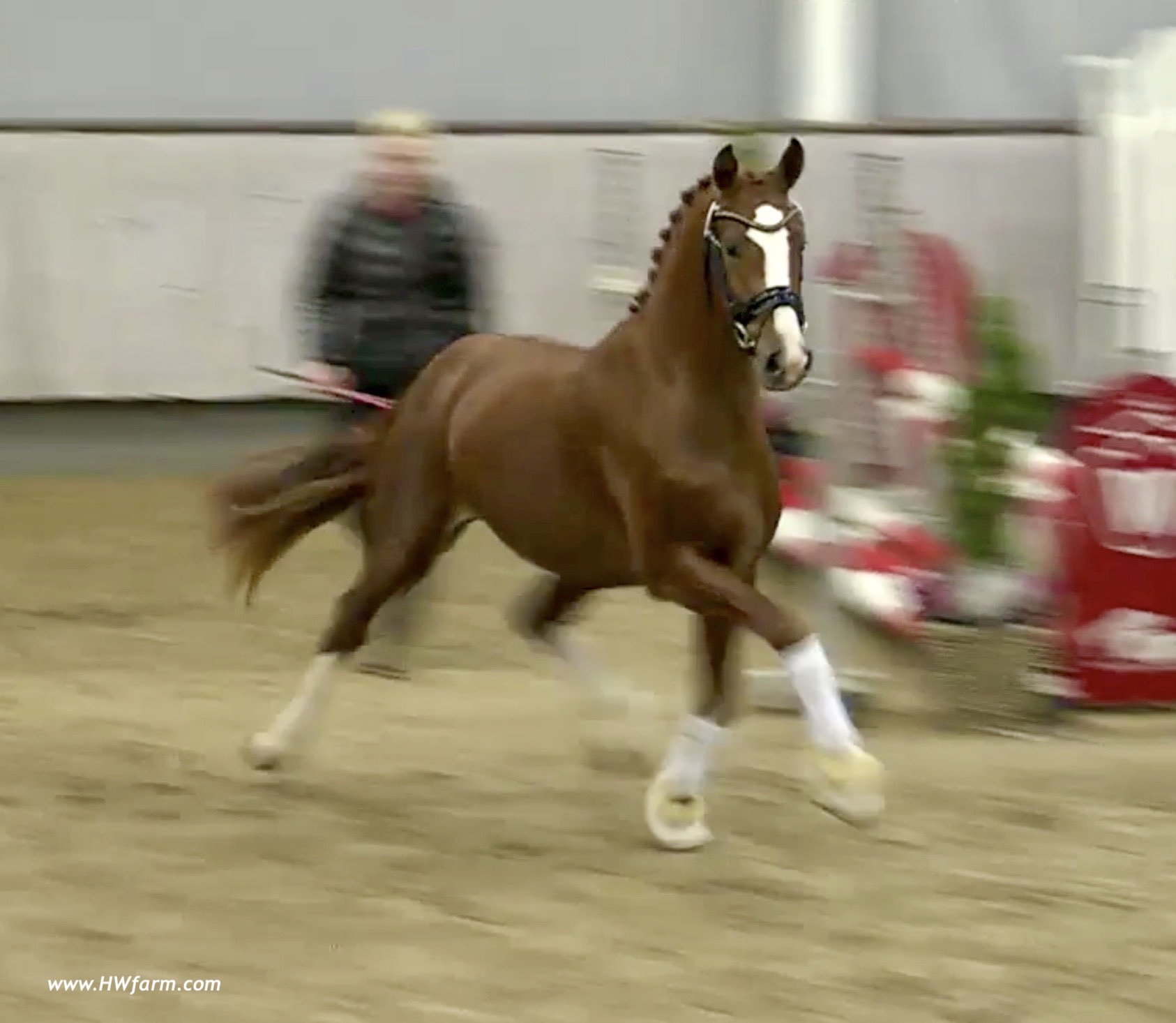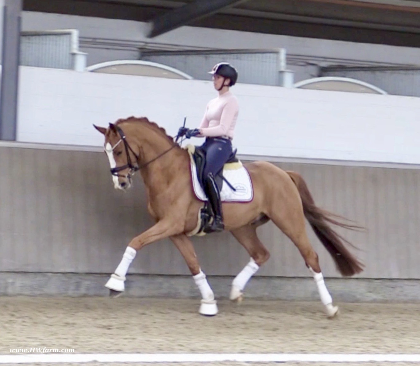 Sir Dynamic HW, chestnut Westphalian gelding, by stallion of the year Sir Heinrich/Champion Don Frederico, born in 2017, standing approximately 166 cm or 16.1 hands. Sir Dynamic HW is by Sir Heinrich, the full-brother to the four Bundeschampions Cindy OLD, Candy OLD, Caty OLD and Casey OLD. His sire Sir Donnerhall I became Bundeschampion of six-year-old dressage horses in 2006 and finished best at the 70-day test in Adelheidsdorf in 2005 (dressage index 163.87). More than 100 of his sons have been licensed, soon 400 of his daughters have been awarded premium mares. As the first mare in history, St.Pr./El.St. C'est bon became dam of five Bundeschampions: Sir Heinrich OLD, Cindy OLD, Candy OLD, Caty OLD and Casey OLD (all by Sir Donnerhall I). Sir Heinrich OLD and Si bon were also licensed, and Oldenburg champion mares are Candy OLD and Casey OLD. He was licensed in 2010 at the NRW main licensing in Münster and completed his 70-day test in Neustadt/Dosse in 2011 with an overall score of 8.5, achieving the second-best result of the entire year with his dressage score of 8.99. As a highly sought-after NRW state stud stallion, he sired 16 licensed sons, more than 60 premium mares, auction price peaks and offspring that are successful in sport. After he won the Oldenburger Landeschampionat in 2012, he became vice-champion in national championships of four years old stallions. At national championships in 2013 he won convincingly his qualification class of five years-old dressage horses, in the finals he saved the silver medal with a scoring of 8.6 in his age group. Sir Heinrich OLD represented the German colors as a five and six years-old in world championships of young dressage horses in Verden. He can show victories in elementary and medium level dressage tests for young horses as well as in advanced level dressage tests (S*). His sport horses career's highlight was certainly the victory in national championships of six years-old dressage horses in 2014 with a total score of 8.7 in the finals. On the occasion of the Oldenburg Stallion Days 2016 he was awarded VTV-Dressage Stallion of the year.