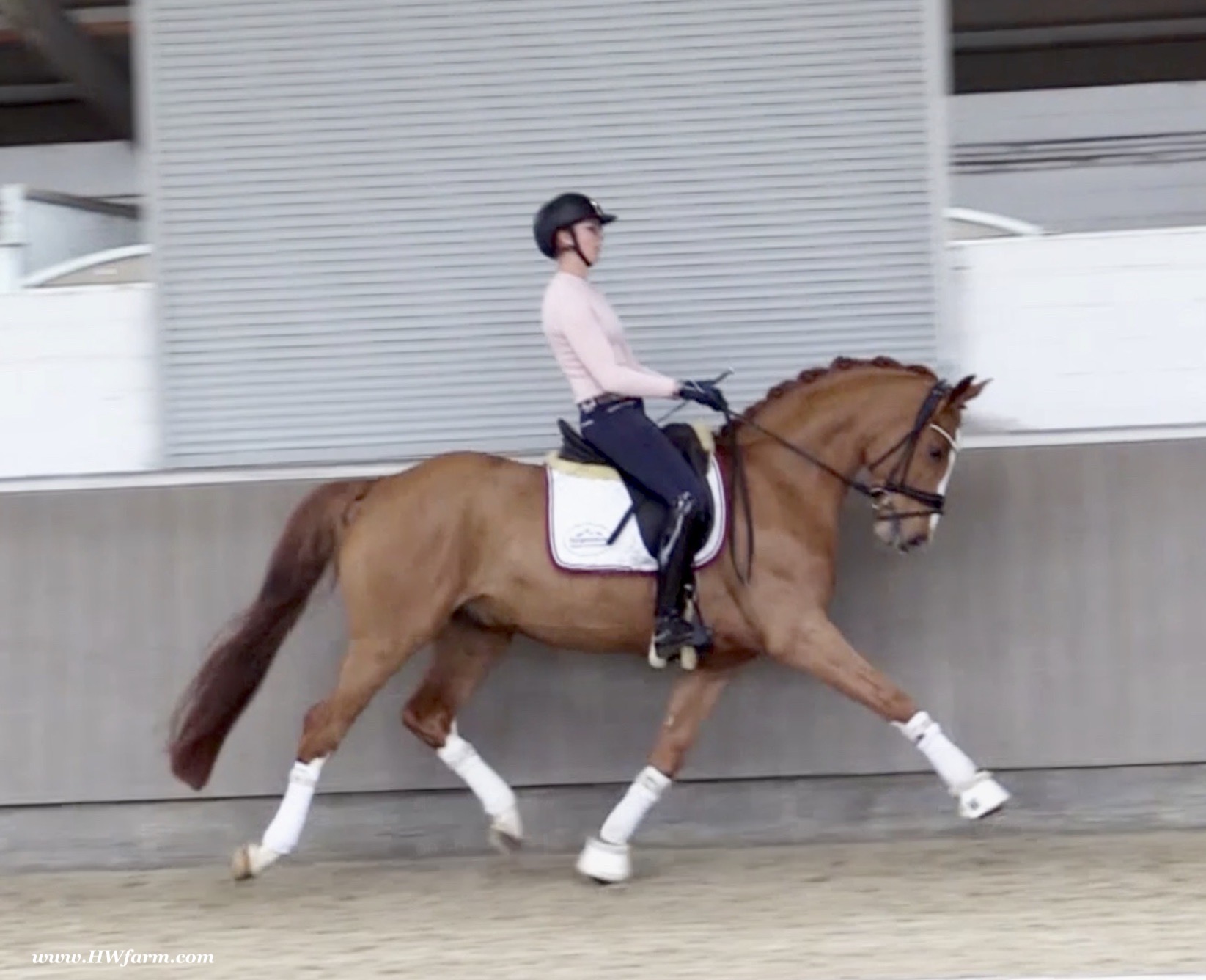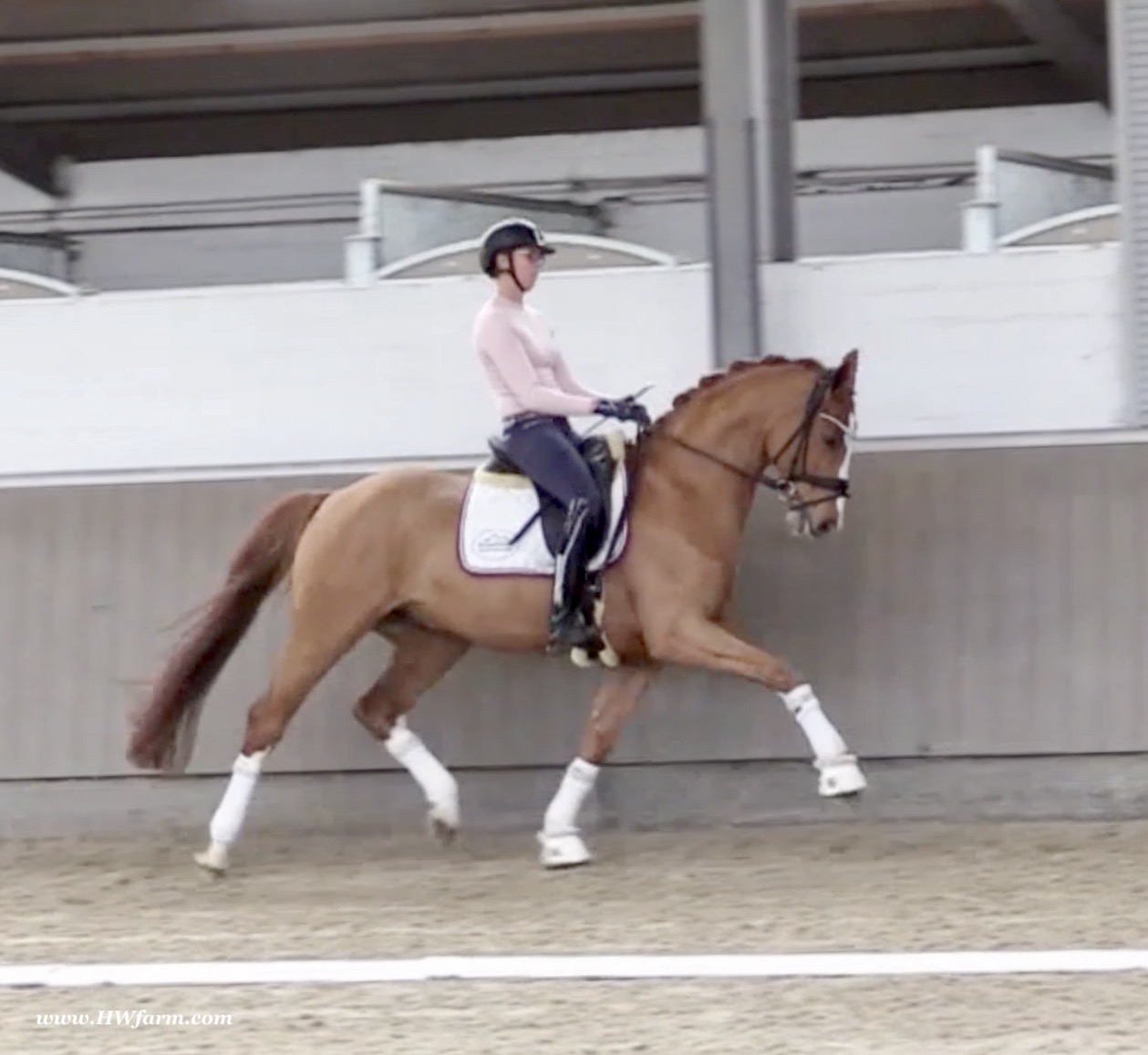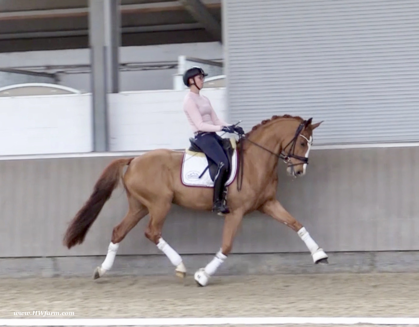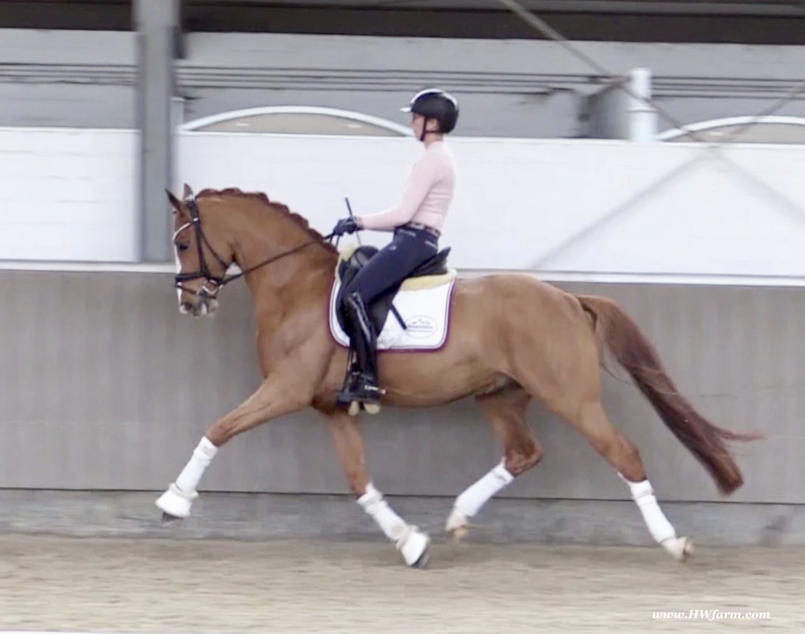 Sir Dynamic HW, chestnut Westphalian gelding, by stallion of the year Sir Heinrich/Champion Don Frederico, born in 2017, standing approximately 166 cm or 16.1 hands. Sir Dynamic HW is by Sir Heinrich, the full-brother to the four Bundeschampions Cindy OLD, Candy OLD, Caty OLD and Casey OLD. His sire Sir Donnerhall I became Bundeschampion of six-year-old dressage horses in 2006 and finished best at the 70-day test in Adelheidsdorf in 2005 (dressage index 163.87). More than 100 of his sons have been licensed, soon 400 of his daughters have been awarded premium mares. As the first mare in history, St.Pr./El.St. C'est bon became dam of five Bundeschampions: Sir Heinrich OLD, Cindy OLD, Candy OLD, Caty OLD and Casey OLD (all by Sir Donnerhall I). Sir Heinrich OLD and Si bon were also licensed, and Oldenburg champion mares are Candy OLD and Casey OLD. He was licensed in 2010 at the NRW main licensing in Münster and completed his 70-day test in Neustadt/Dosse in 2011 with an overall score of 8.5, achieving the second-best result of the entire year with his dressage score of 8.99. As a highly sought-after NRW state stud stallion, he sired 16 licensed sons, more than 60 premium mares, auction price peaks and offspring that are successful in sport. After he won the Oldenburger Landeschampionat in 2012, he became vice-champion in national championships of four years old stallions. At national championships in 2013 he won convincingly his qualification class of five years-old dressage horses, in the finals he saved the silver medal with a scoring of 8.6 in his age group. Sir Heinrich OLD represented the German colors as a five and six years-old in world championships of young dressage horses in Verden. He can show victories in elementary and medium level dressage tests for young horses as well as in advanced level dressage tests (S*). His sport horses career's highlight was certainly the victory in national championships of six years-old dressage horses in 2014 with a total score of 8.7 in the finals. On the occasion of the Oldenburg Stallion Days 2016 he was awarded VTV-Dressage Stallion of the year.