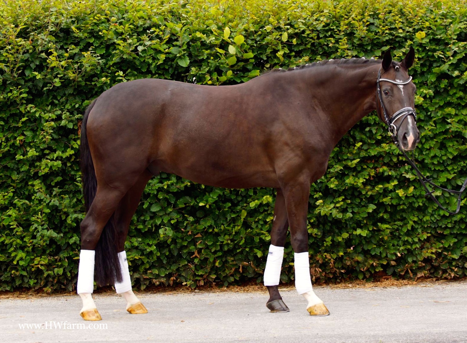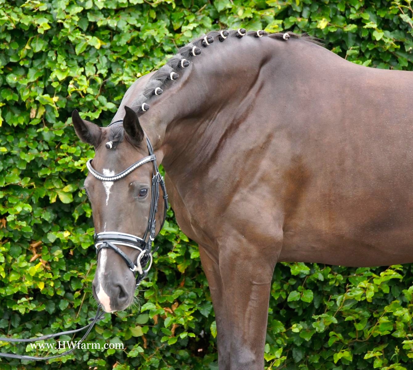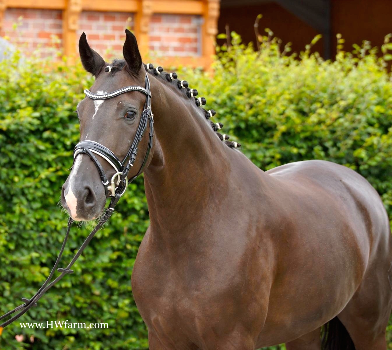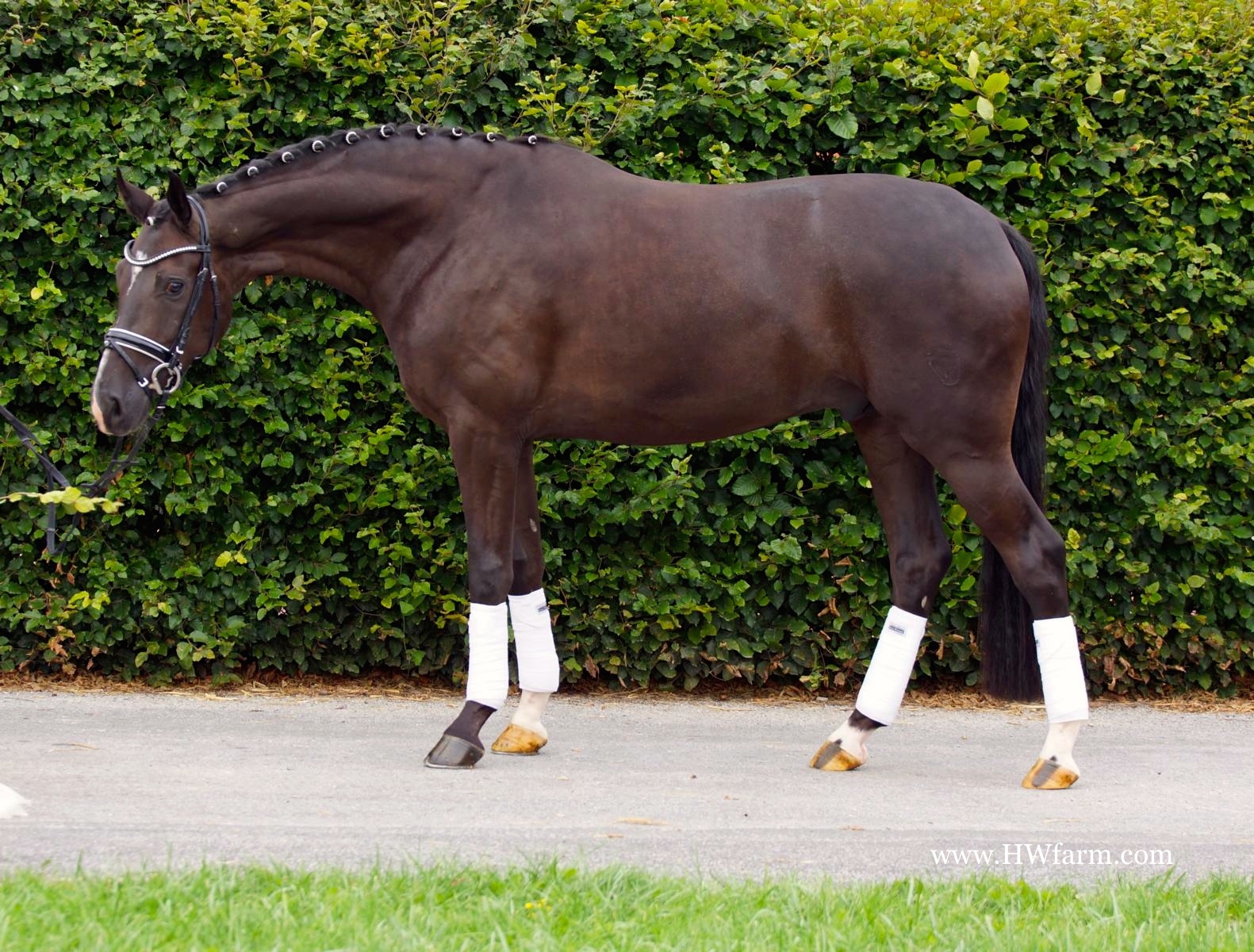 Sir Niro HW, dark bay Westphalian gelding, by Sir Donnerhall/De Niro, born in 2011, standing approximately 167 cm or 16.1 hands. Sir Niro is by Sir Donnerhall. Exclusive Young Horse National Champion and Reserve World Champion Producer of the Reserve Approval Champion and premium stallions as well as highly demanded foals Sir Donnerhall is the sire of World Champions, Bundeschampions, top prices and licensing winners. In 2013, Sir Donnerhall dominated the Bundeschampionships as no sire has before: His daughter Cindy OLD won the class for four year old mares and gelding and the licensed sons, Sir Henry and Sean Connery became Vice Champions of the five- and six-year old dressage horses respectively. Sir Diamond won the bronze medal in the class for five-year-olds and with Secret Love and Simply Red, two more of his descendants, reached the final. The son Sa Coeur was the 2012 and 2013 World Champion for five- and six- year old dressage horses and then the top price at the PSI-Auction in Ankum. Sir Donnerhall I has been popular as a sire of auction horses for years and he regularly delivers top horses selling for six-figure prices. For years the FN's breeding value estimation declares Sir Donnerhall I, who is trained up to Grand Prix, as one of the best dressage horse sires. He himself was second Reserve Champion at his licensing, in 2005 I-a main premium stallion, in 2006 Bundeschampion as well as Vice World Champion for five-year old dressage horses and has turned out to be a trademark stallion: He has already produced 85 licensed sons, including the NRW Champion Stallion and Vice Bundeschampion, Silbermond, the Southern German Champion Stallions Sir Nymphenburg I and Sir Schiwago as well as numerous premium stallions at all the German licensing sites. More than 60 daughters have been awarded the state premium. His daughter Assandra was nominated as Austria's best three-year old mare. Sir Donnerhall: One of the most reliable German dressage horse makers. Sir Niro HW's dam is by De Niro. She is a Statespremium mare with an overall score of 8.01, called "Die Dame". De Niro's sire, Donnerhall, holds the highest dressage breeding value index (271) of all stallions. He placed second among 70 stallions at his performance test and went on to become DLG Champion in 1986. Donnerhall won more than 65 FEI Level and Grand Prix competitions and competed successfully until he was retired at 17-years of age. De Niro's dam was a successful dressage competitor producing an Approved stallion in Westfalia. His dam's sire, Akzent II, is regarded as one of the best sires of rideability in modern sport horse breeding producing many Approved stallions and expensive auction horses.