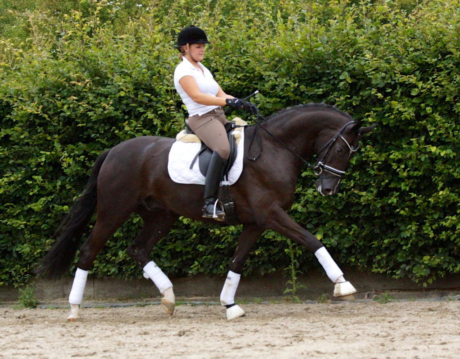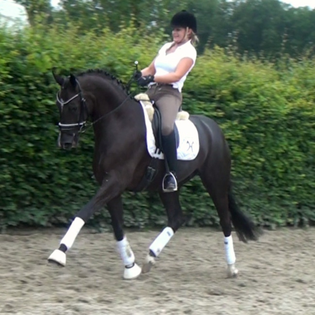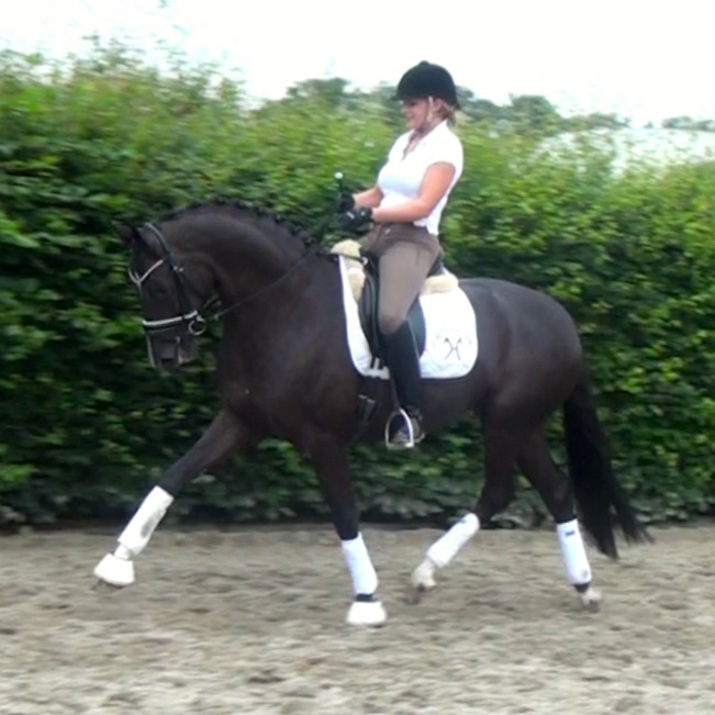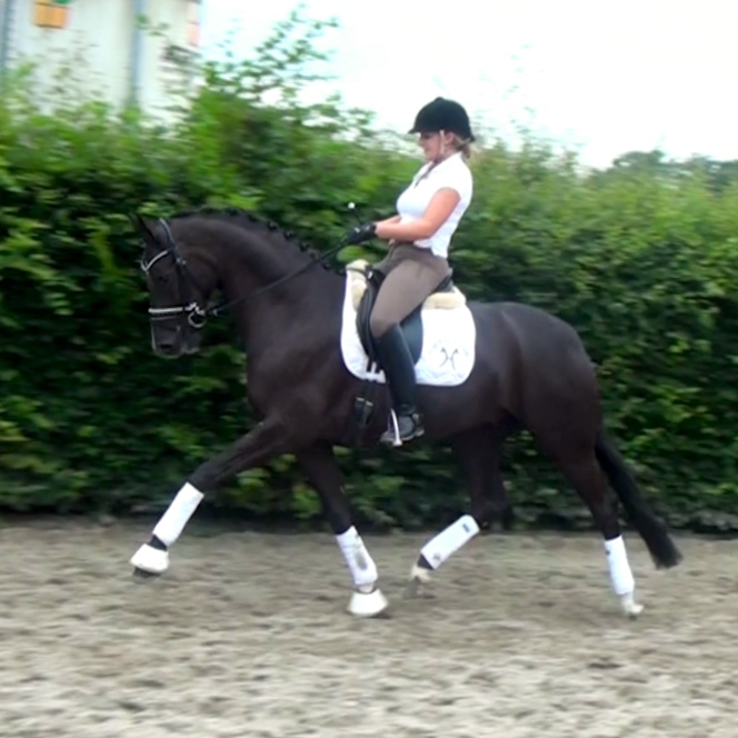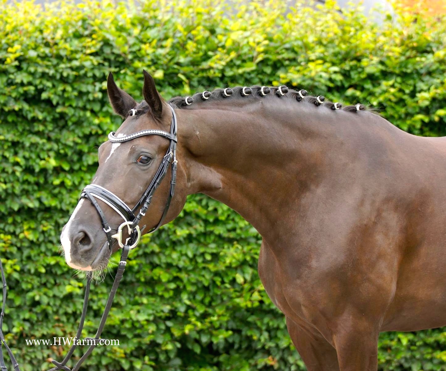 Sir Niro HW, dark bay Westphalian gelding, by Sir Donnerhall/De Niro, born in 2011, standing approximately 167 cm or 16.1 hands. Sir Niro is by Sir Donnerhall. Exclusive Young Horse National Champion and Reserve World Champion Producer of the Reserve Approval Champion and premium stallions as well as highly demanded foals Sir Donnerhall is the sire of World Champions, Bundeschampions, top prices and licensing winners. In 2013, Sir Donnerhall dominated the Bundeschampionships as no sire has before: His daughter Cindy OLD won the class for four year old mares and gelding and the licensed sons, Sir Henry and Sean Connery became Vice Champions of the five- and six-year old dressage horses respectively. Sir Diamond won the bronze medal in the class for five-year-olds and with Secret Love and Simply Red, two more of his descendants, reached the final. The son Sa Coeur was the 2012 and 2013 World Champion for five- and six- year old dressage horses and then the top price at the PSI-Auction in Ankum. Sir Donnerhall I has been popular as a sire of auction horses for years and he regularly delivers top horses selling for six-figure prices. For years the FN's breeding value estimation declares Sir Donnerhall I, who is trained up to Grand Prix, as one of the best dressage horse sires. He himself was second Reserve Champion at his licensing, in 2005 I-a main premium stallion, in 2006 Bundeschampion as well as Vice World Champion for five-year old dressage horses and has turned out to be a trademark stallion: He has already produced 85 licensed sons, including the NRW Champion Stallion and Vice Bundeschampion, Silbermond, the Southern German Champion Stallions Sir Nymphenburg I and Sir Schiwago as well as numerous premium stallions at all the German licensing sites. More than 60 daughters have been awarded the state premium. His daughter Assandra was nominated as Austria's best three-year old mare. Sir Donnerhall: One of the most reliable German dressage horse makers. Sir Niro HW's dam is by De Niro. She is a Statespremium mare with an overall score of 8.01, called "Die Dame". De Niro's sire, Donnerhall, holds the highest dressage breeding value index (271) of all stallions. He placed second among 70 stallions at his performance test and went on to become DLG Champion in 1986. Donnerhall won more than 65 FEI Level and Grand Prix competitions and competed successfully until he was retired at 17-years of age. De Niro's dam was a successful dressage competitor producing an Approved stallion in Westfalia. His dam's sire, Akzent II, is regarded as one of the best sires of rideability in modern sport horse breeding producing many Approved stallions and expensive auction horses.