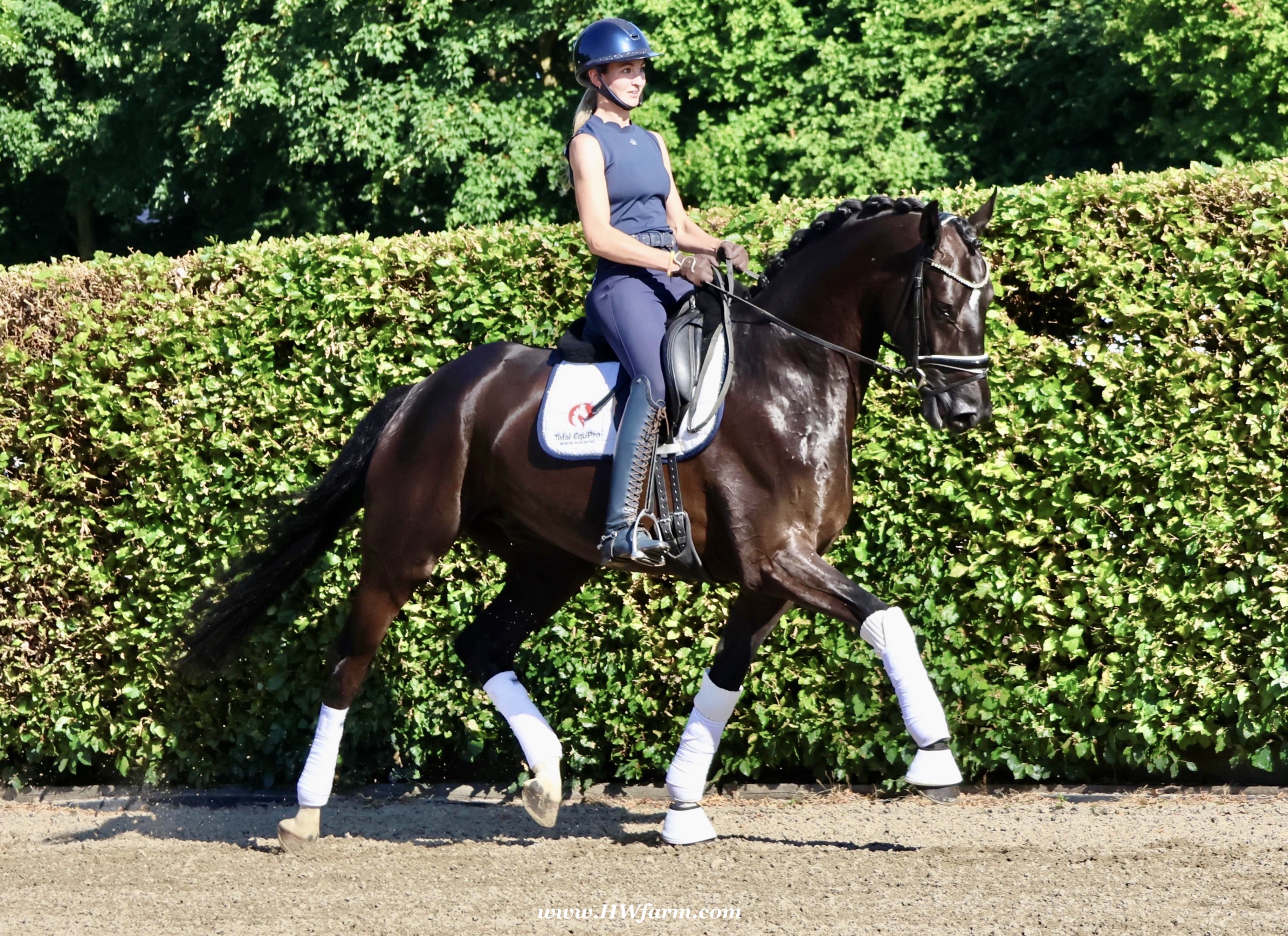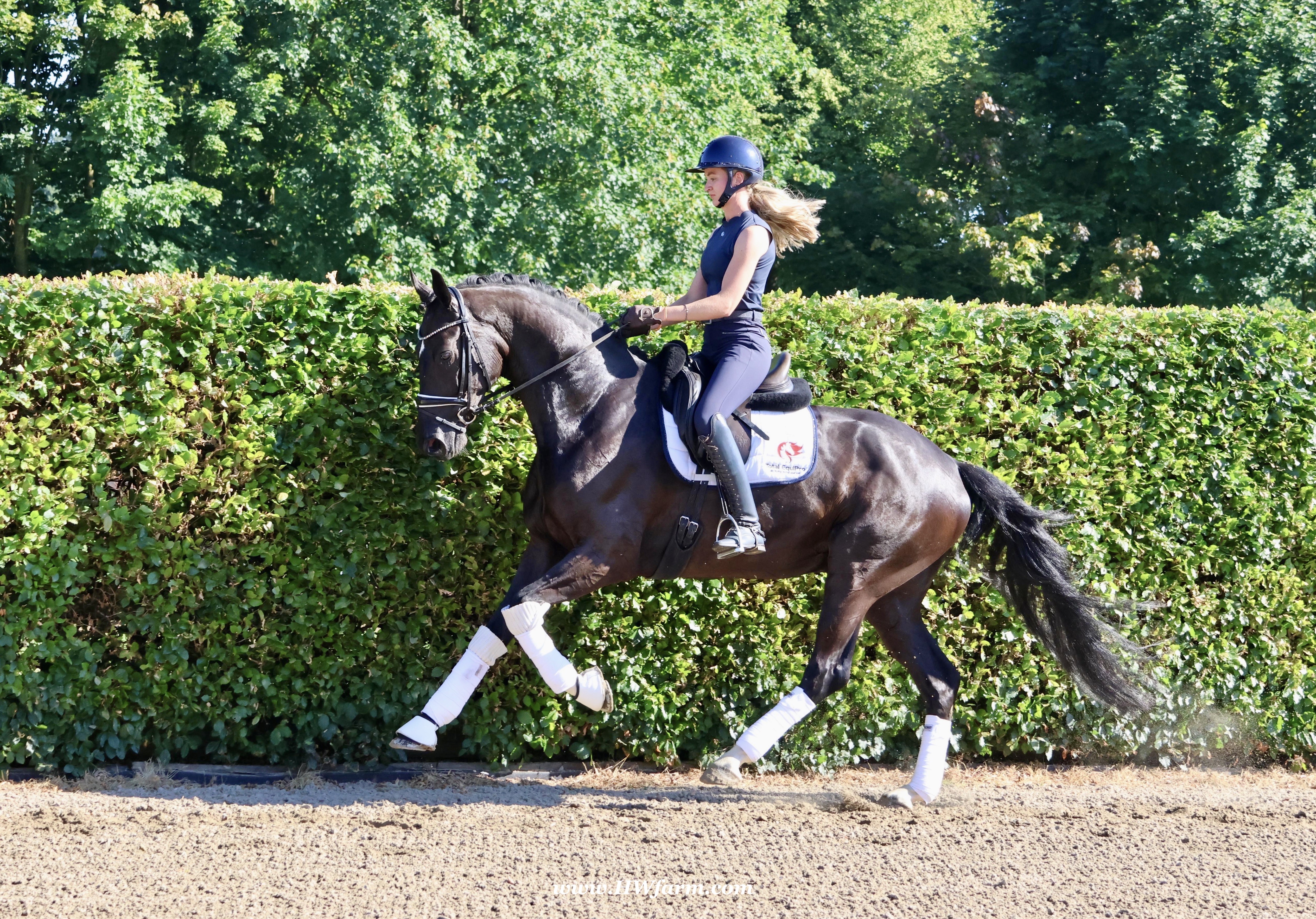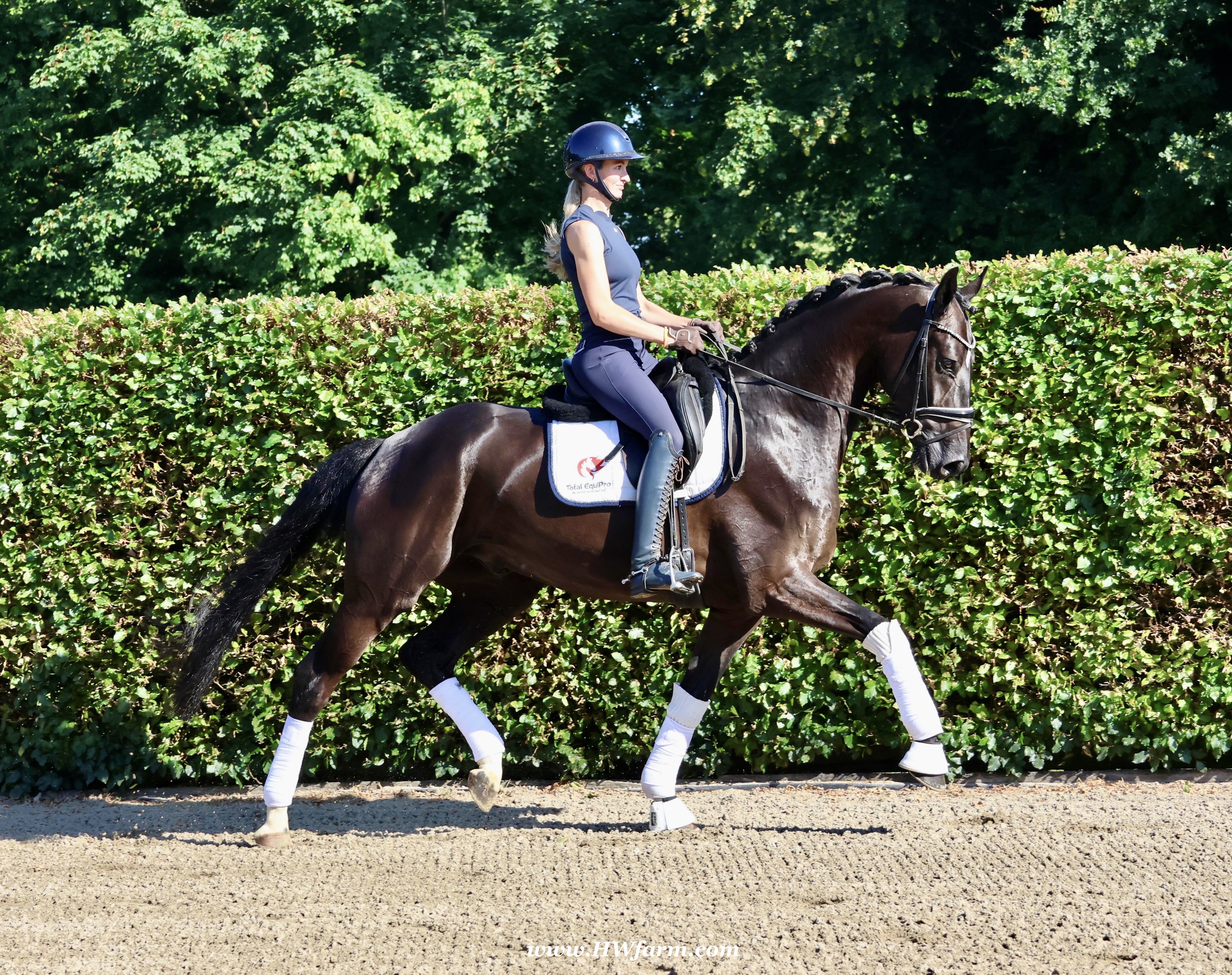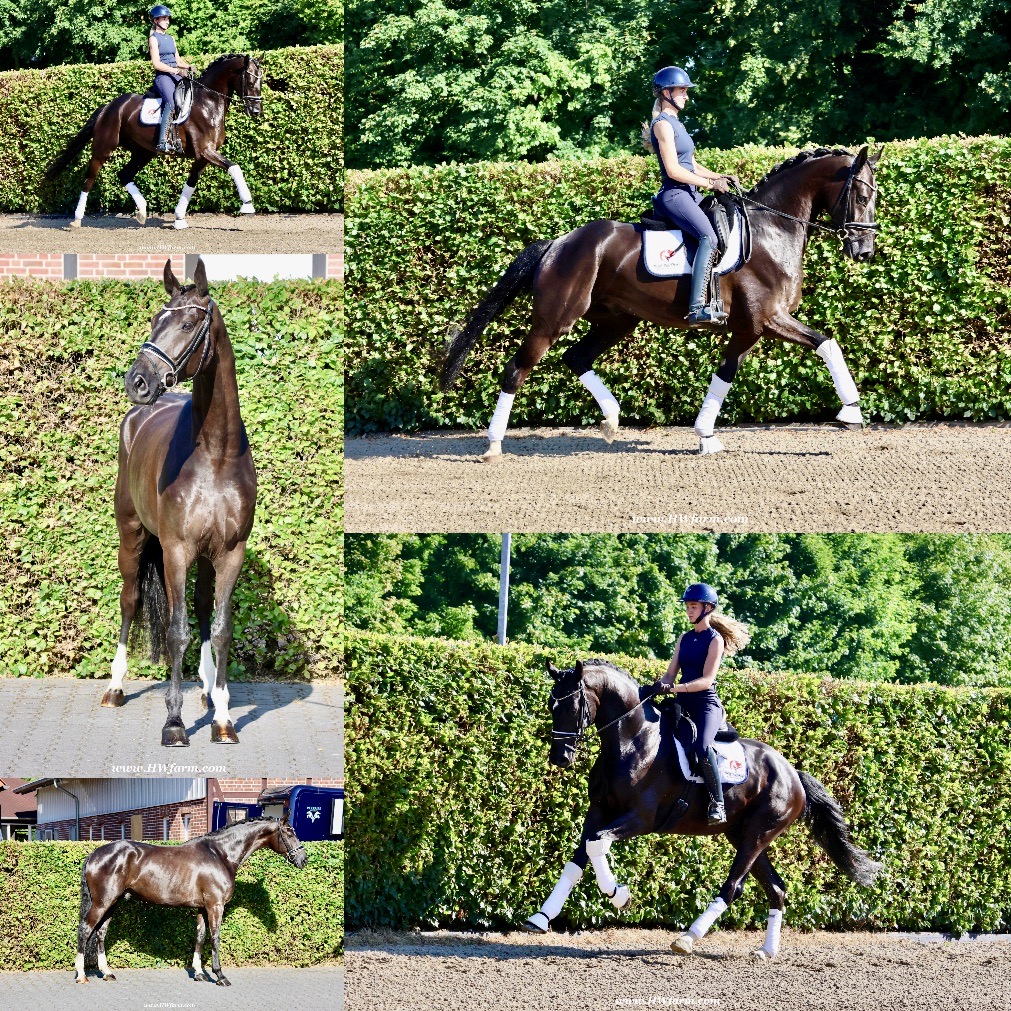 SuperMan HW, black Westphalian gelding, by So Unique/Ehrenstolz, born in 2020, standing approximately 174 cm or 17 hands. SuperMan HW, by So Unique Premium son of triple World Champion, Sezuan Winner of the Danish Warmblood 35-days stallion performance test 2018 Winner of the Bundeschampionate for 3yo stallions 2018 Premium Stallion in Danish Warmblood 2018 Won the Westfalia Championat 2018 Premium Stallion in Verden 2017. With So Unique his name says it all - not only in terms of his sporting career, but also in his hereditary performance. The Hanoverian and Danish premium stallion, Verden stallion market top price, stallion performance test winner, German Champion and champion of the first edition of the final of four-year-olds at the World Championships for Young Dressage Horses in 2019 in Ermelo/NED transmits his own special aura to his foals. His foals also impress with a lot of power, strong backs, the desired freedom of the shoulders and an exceptional, calm character. In 2020, So Unique won the qualifier for the German Championships for five-year-old dressage horses with Eva Möller. For all three paces, submission and overall impression, he received the fantastic score of 9.0. In the final, he could not quite match this performance and finished tenth with an overall score of 8.1 (walk: 9.5). So Unique was selected to represent Germany at the World Championships for young dressage horses, which had to be cancelled due to the coronavirus pandemic. His sire Sezuan was World Champion of the five, six and seven-year-old dressage horses and belongs, without a doubt, to the most demanded dressage stallions of the present. With his rider Dorothee Schneider, he won international competitions up to Inter I. Since then, he has been trained up to Grand Prix level with Patrik Kittel/SWE. On the breeding scene, the Danish Champion Stallion, record stallion performance test winner and Danish Dressage Champion also dominates all events. He sired our two-time record stallion performance test winner, Sezuan's Donnerhall, the Vice World Champion and German Champion of young dressage horses, Secret, the bronze medallist at the World Championships for Young Dressage Horses, Queenparks Wendy with Andreas Helgstrand/DEN, and our Oldenburg Reserve Champion Stallion So Perfect, to name just a few highlights. The dam St.Pr.St. Daiquiri, herself a winner in tests for young horses, is a half-sister of the licensed stallions St. Petersburg (by Sandro Bedo) and Quaterbend Ymas (by Quaterback), of the mare Doris Day K (by De Niro), who produced the licensed stallion Sir Stanislaus (by Sandro Hit), who was successful up to Inter I, of the mare Dynasty (by De Niro), who produced the licensed stallion Scolari (by Sandro Hit) and a stallion by Bonifatius, and of the mare Daylight (by De Niro), who produced the licensed stallion Flanell (by Fidertanz) and Fats Domino (by Fidertanz)/Fabienne Müller-Lütkemeier, victorious at Grand Prix level. Daiquri also produced Havanna II (by Hotline), who was placed up to Inter I. Daiquiri's sisters' daughters produced the licensed stallions Le Vivaldi I and II (both by Vivaldi) and Quattroporte (by Quantensprung). His dam's sire Donnerhall counts as one of the most important line founders of current times. He was double World Champion with Karin Rehbein, has produced over 120 licensed stallions and over 275 state premium mares and the lifetime earnings of his progeny amount to over 3.22 million euros. Also in the third generation, the Celle stud's Weltmeyer is a foundation stallion of special quality, who has significantly marked this stallion with regard to his impressive charisma. Weltmeyer was Vice German Champion, winner of his licensing and stallion performance test as well as DLG champion. Amongst his over 100 licensed sons appear several licensing winners, German Champions and stallion performance test winners. His great-grand-dam Geranie has produced the two licensed stallions Aleman (by Akzent II) and Worldman (by Weltmeyer). Her daughter Avignon (by Akzent II) has produced the licensed stallions Belfort G (by Brentano II) and Regazotti (by Rohdiamant), as well as St.Pr.St. Gardenia (by Grafenburg), who in turn produced Rhodes Scolar (by Rohdiamant, who was internationally successful up to Inter I. Through her daughter Pikobella (by Prestige Pilot), Geranie is the grand-dam of the stallion quartet Balance of Power, Barclay I and II (all by Belissimo M) and Fengari (by Fürstenball). Geranie also produced St.Pr.St. Weltina (by Weltmeyer), who produced the 2008 World Champion of young dressage horses, Dramatic (by Don Frederico)/Jana Freund, and bred to Rousseau, the licensed stallion Fürst Rousseau. SuperMan HW's dam sire is by Ehrenstolz. Born in 2003, EHRENSTOLZ completed his 30-day aptitude test in 2006 in Münster-Handorf with above-average scores in rideability (8.88), character (8.63), and trot (8.88). He was a candidate at the 31st NRW Elite Spring Auction, winner of the "Westfalen Wappen" (Westphalia Coat of Arms), and participated twice in the Federal Championships. EHRENSTOLZ has placed highly up to advanced level. His breeding value for young horse classes was calculated at 131. His breeding value for competitive dressage, in turn, is 126, with offspring that have competed up to advanced (S) level.EHRENSTOLZ's daughters, in particular, continually attract attention. They excel at broodmare tests and elite shows. With the mare Offenbarung, he achieved the top price at the 42nd NRW Elite Auction for €140,000. A total of six of his daughters have already received the State Premium. He also produced a licensed son, Ehrensache. SuperMan HW himself, is a breathtaking horse of definite Champion quality, equipped with absolutely phenomenal gaits, presenting himself with wonderful self-carriage. 100% ride-ability and a super character His stallion type (he is a gelding!!) will mesmerize everybody alike. He is a horse who casts his spell on every single person, a 