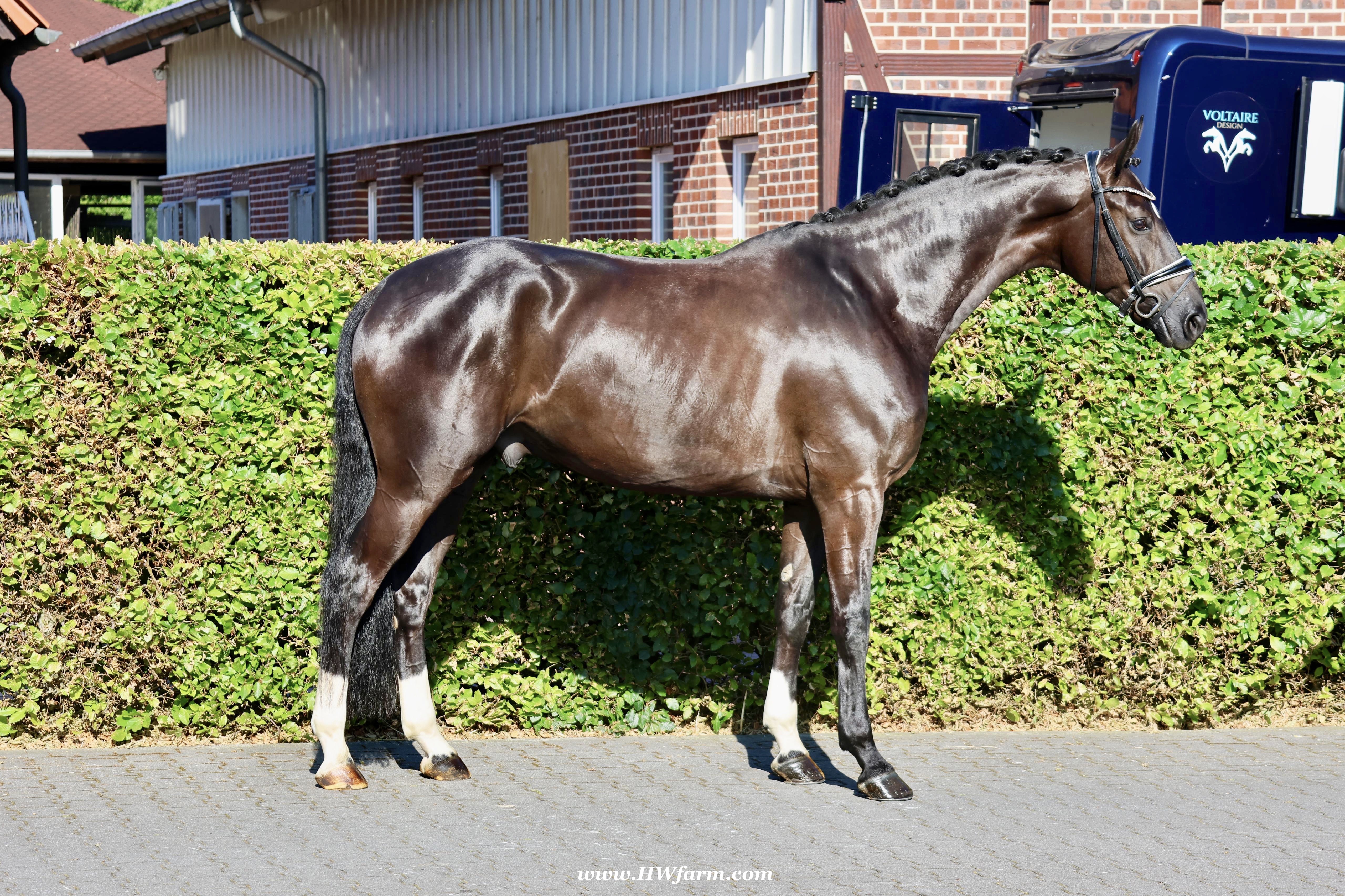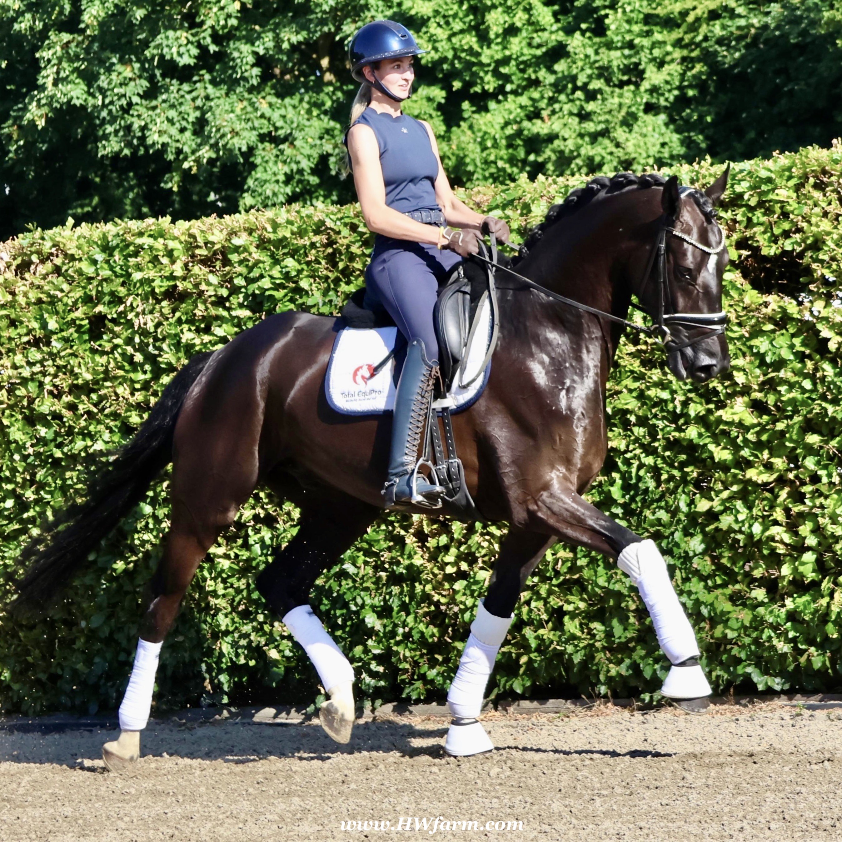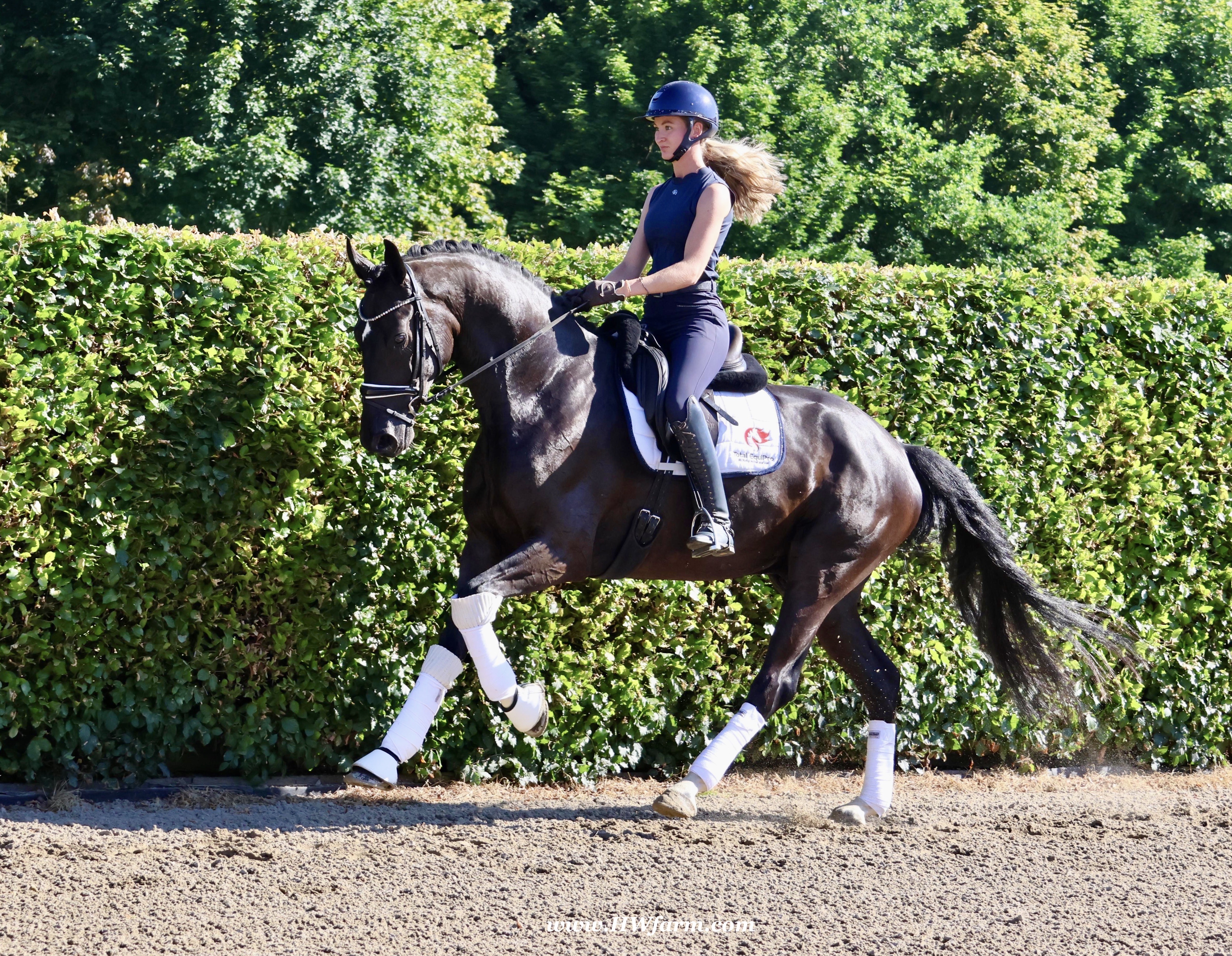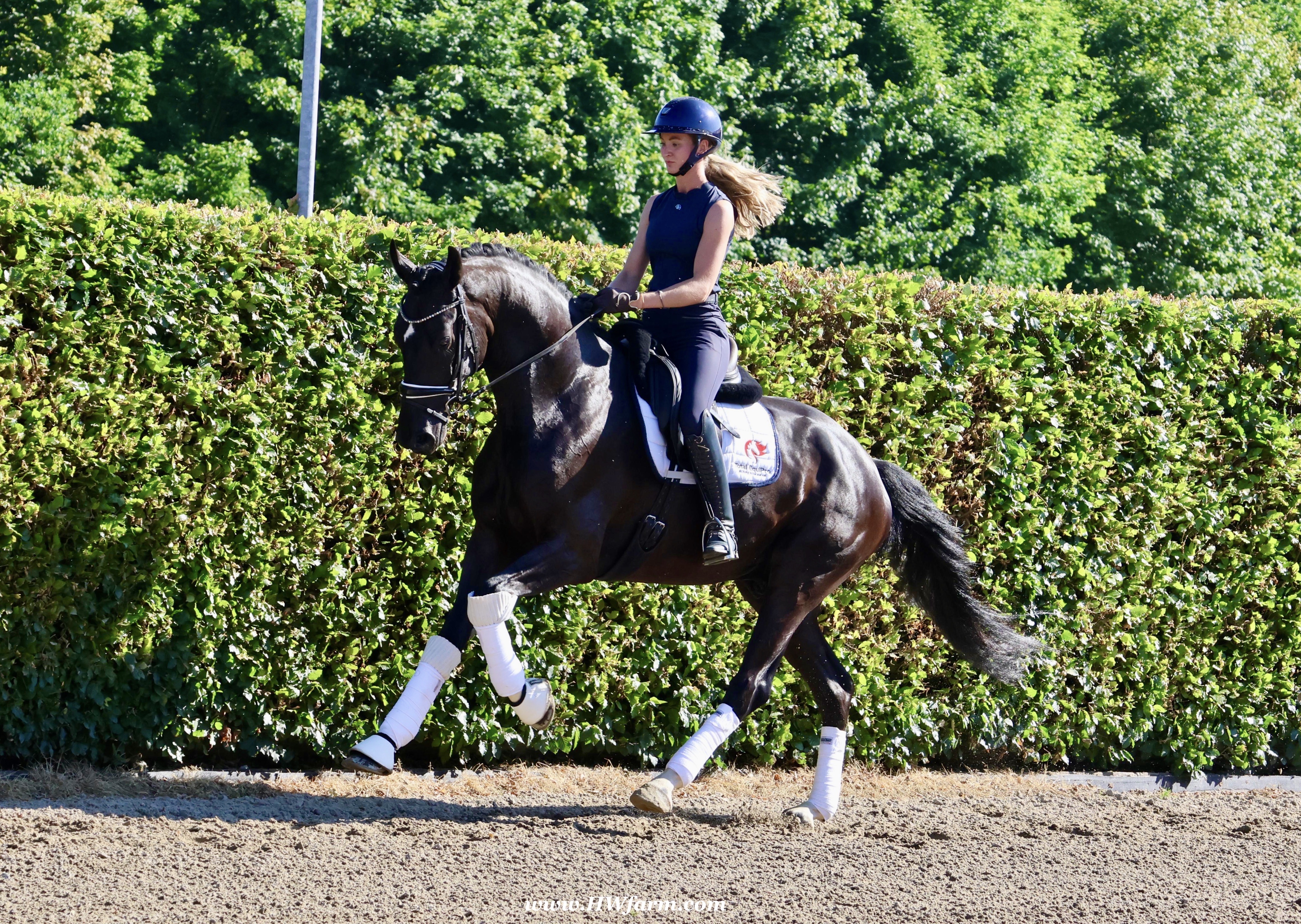 SuperMan HW, black Westphalian gelding, by So Unique/Ehrenstolz, born in 2020, standing approximately 174 cm or 17 hands. SuperMan HW, by So Unique Premium son of triple World Champion, Sezuan Winner of the Danish Warmblood 35-days stallion performance test 2018 Winner of the Bundeschampionate for 3yo stallions 2018 Premium Stallion in Danish Warmblood 2018 Won the Westfalia Championat 2018 Premium Stallion in Verden 2017. With So Unique his name says it all - not only in terms of his sporting career, but also in his hereditary performance. The Hanoverian and Danish premium stallion, Verden stallion market top price, stallion performance test winner, German Champion and champion of the first edition of the final of four-year-olds at the World Championships for Young Dressage Horses in 2019 in Ermelo/NED transmits his own special aura to his foals. His foals also impress with a lot of power, strong backs, the desired freedom of the shoulders and an exceptional, calm character. In 2020, So Unique won the qualifier for the German Championships for five-year-old dressage horses with Eva Möller. For all three paces, submission and overall impression, he received the fantastic score of 9.0. In the final, he could not quite match this performance and finished tenth with an overall score of 8.1 (walk: 9.5). So Unique was selected to represent Germany at the World Championships for young dressage horses, which had to be cancelled due to the coronavirus pandemic. His sire Sezuan was World Champion of the five, six and seven-year-old dressage horses and belongs, without a doubt, to the most demanded dressage stallions of the present. With his rider Dorothee Schneider, he won international competitions up to Inter I. Since then, he has been trained up to Grand Prix level with Patrik Kittel/SWE. On the breeding scene, the Danish Champion Stallion, record stallion performance test winner and Danish Dressage Champion also dominates all events. He sired our two-time record stallion performance test winner, Sezuan's Donnerhall, the Vice World Champion and German Champion of young dressage horses, Secret, the bronze medallist at the World Championships for Young Dressage Horses, Queenparks Wendy with Andreas Helgstrand/DEN, and our Oldenburg Reserve Champion Stallion So Perfect, to name just a few highlights. The dam St.Pr.St. Daiquiri, herself a winner in tests for young horses, is a half-sister of the licensed stallions St. Petersburg (by Sandro Bedo) and Quaterbend Ymas (by Quaterback), of the mare Doris Day K (by De Niro), who produced the licensed stallion Sir Stanislaus (by Sandro Hit), who was successful up to Inter I, of the mare Dynasty (by De Niro), who produced the licensed stallion Scolari (by Sandro Hit) and a stallion by Bonifatius, and of the mare Daylight (by De Niro), who produced the licensed stallion Flanell (by Fidertanz) and Fats Domino (by Fidertanz)/Fabienne Müller-Lütkemeier, victorious at Grand Prix level. Daiquri also produced Havanna II (by Hotline), who was placed up to Inter I. Daiquiri's sisters' daughters produced the licensed stallions Le Vivaldi I and II (both by Vivaldi) and Quattroporte (by Quantensprung). His dam's sire Donnerhall counts as one of the most important line founders of current times. He was double World Champion with Karin Rehbein, has produced over 120 licensed stallions and over 275 state premium mares and the lifetime earnings of his progeny amount to over 3.22 million euros. Also in the third generation, the Celle stud's Weltmeyer is a foundation stallion of special quality, who has significantly marked this stallion with regard to his impressive charisma. Weltmeyer was Vice German Champion, winner of his licensing and stallion performance test as well as DLG champion. Amongst his over 100 licensed sons appear several licensing winners, German Champions and stallion performance test winners. His great-grand-dam Geranie has produced the two licensed stallions Aleman (by Akzent II) and Worldman (by Weltmeyer). Her daughter Avignon (by Akzent II) has produced the licensed stallions Belfort G (by Brentano II) and Regazotti (by Rohdiamant), as well as St.Pr.St. Gardenia (by Grafenburg), who in turn produced Rhodes Scolar (by Rohdiamant, who was internationally successful up to Inter I. Through her daughter Pikobella (by Prestige Pilot), Geranie is the grand-dam of the stallion quartet Balance of Power, Barclay I and II (all by Belissimo M) and Fengari (by Fürstenball). Geranie also produced St.Pr.St. Weltina (by Weltmeyer), who produced the 2008 World Champion of young dressage horses, Dramatic (by Don Frederico)/Jana Freund, and bred to Rousseau, the licensed stallion Fürst Rousseau. SuperMan HW's dam sire is by Ehrenstolz. Born in 2003, EHRENSTOLZ completed his 30-day aptitude test in 2006 in Münster-Handorf with above-average scores in rideability (8.88), character (8.63), and trot (8.88). He was a candidate at the 31st NRW Elite Spring Auction, winner of the "Westfalen Wappen" (Westphalia Coat of Arms), and participated twice in the Federal Championships. EHRENSTOLZ has placed highly up to advanced level. His breeding value for young horse classes was calculated at 131. His breeding value for competitive dressage, in turn, is 126, with offspring that have competed up to advanced (S) level.EHRENSTOLZ's daughters, in particular, continually attract attention. They excel at broodmare tests and elite shows. With the mare Offenbarung, he achieved the top price at the 42nd NRW Elite Auction for €140,000. A total of six of his daughters have already received the State Premium. He also produced a licensed son, Ehrensache. SuperMan HW himself, is a breathtaking horse of definite Champion quality, equipped with absolutely phenomenal gaits, presenting himself with wonderful self-carriage. 100% ride-ability and a super character His stallion type (he is a gelding!!) will mesmerize everybody alike. He is a horse who casts his spell on every single person, a 