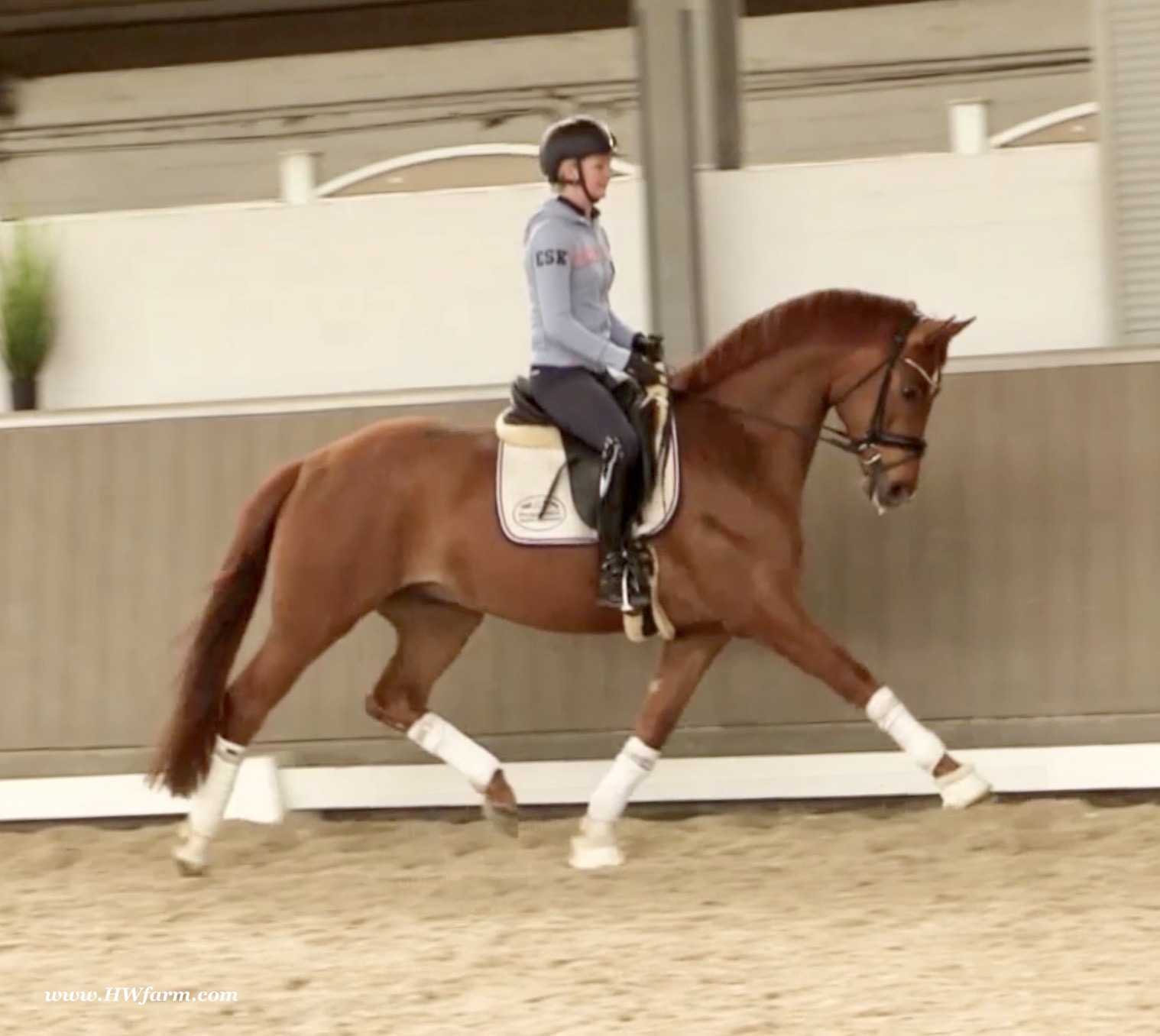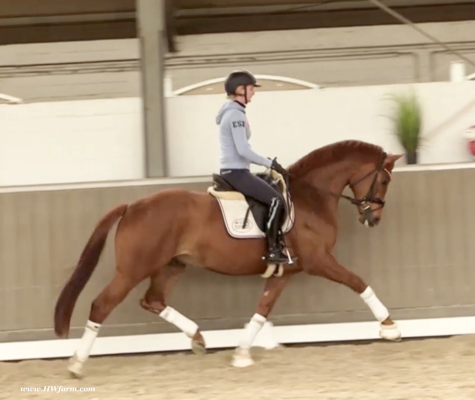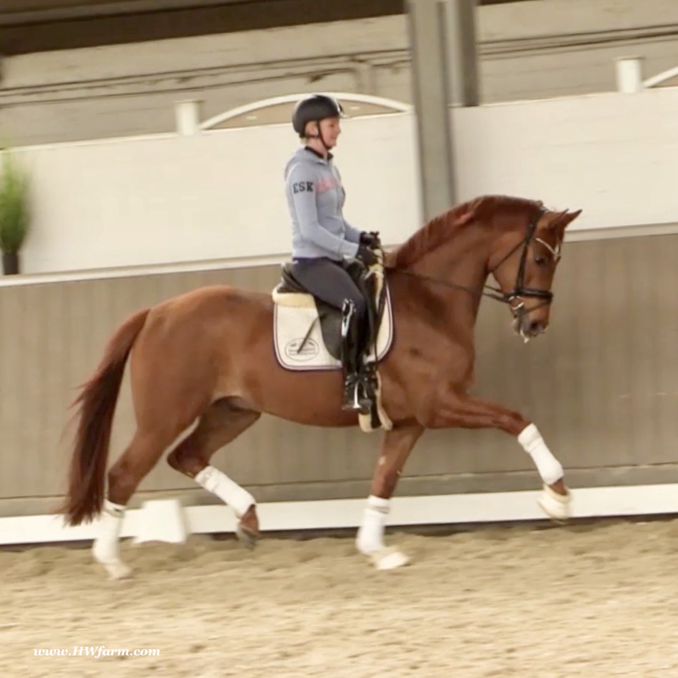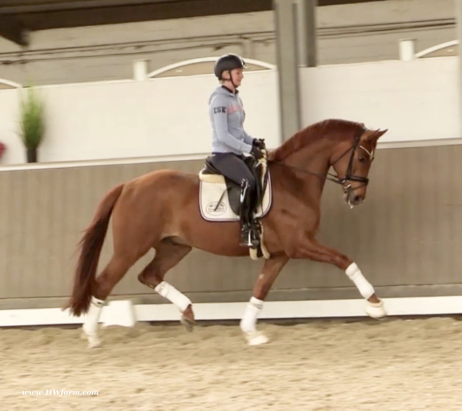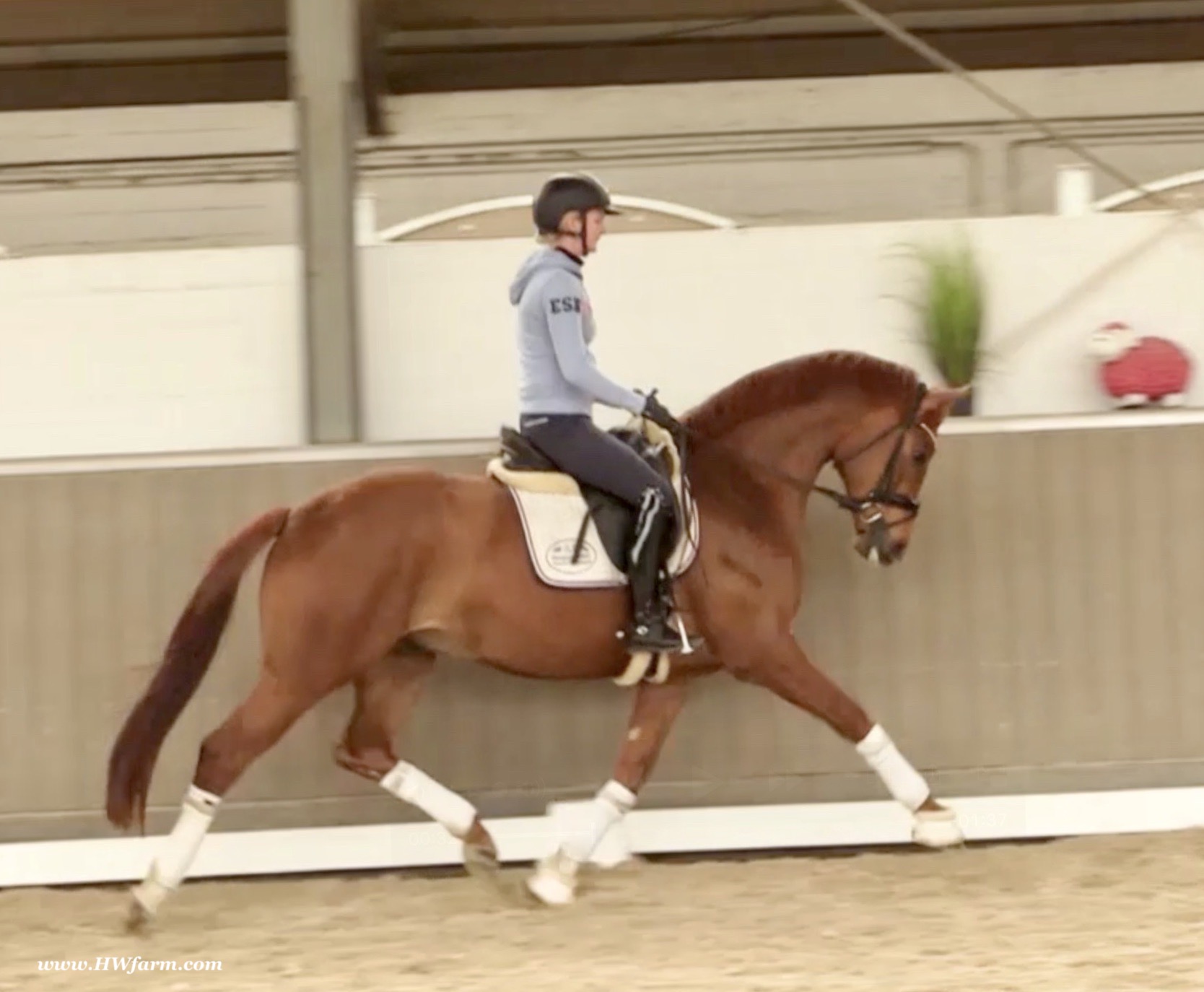 Synergy HW, chestnut Westphalian gelding, by BundesChampion, Vice World Champion Secret/BundesChampion Quaterback, born in 2018, standing approximately 164 cm or 16 and 1/2 hands. Synergy HW, by Secret, the outstanding National German 6yo Champion, plus at the World Championships for young dressage horses Ermelo 2019 - Secret - a truly exceptional horse, became Vice World Champion! Secret and his rider Jessica Lynn Thomas delivered a spectacular first round in the qualification of the five-year-old dressage horses. They received an 8.8 for the permeability, the step 9.5, the gallop 9.7, the per-spective 9.8 and even 9.9 for the trot. All in all, this gave a total result of 9.54 points and the victory was not to be taken from the two. In the final, Secret had to give up just under 0.02 points, despite a further increase. The pair won the silver medal of the five-year-old dressage horses with 9.64 points. The judge's comment: "A fantastic horse! Always in the flow, always easy. It is a pleasure to judge such a horse. " In terms of breeding, the descendants of the Secret also seamlessly linked to his father's success in 2019. Country after country was heard from his descendants. In the far north, in Schleswig-Holstein, Secret set one of the price peaks at the Glanz and Gloria auction in Delingsdorf with € 21,000. In Verden, Status Quo was one of the most sought-after youngsters at € 25,000. With the appropriate name Somebody to Dance, Secret was also among the price peaks in Münster on the occasion of the Westphalia Week. In Vechta, Serge Gainsbourg triumphed as the most expensive foal in 2019 with a hammer price of 150,000 euros. The price structure was followed by Secret Emperor, another son of the Secret. This went to Aus-tria for € 42,000. And also in the south of Germany in Nörtlingen, it was once again a subsidiary of our Secret, which was one of the top prices of the auction with a hammer price of € 25,000. The fact that his offspring are also in demand abroad was demonstrated by a filly from Secret, which took the reserve winner classification of dressage-stressed filly at the Swiss Sport Foal Championships and then found a new owner with a surcharge of 28,000 francs (about 25,000 €). In the Netherlands it was the colt with the appropriate name - One to Re-member- that became the top foal in the auction at € 22,000 The highlight of the day comes from Schwaiger and bears the appropriate name Sensation, from Secret - Fürst Grandios. A colt with a value of 9.67 (type / stature: 10, exterior / correctness: 9, movement: 10) really leaves nothing to be desired and makes words superfluous. "This is how the Austrian Horse Breeding Association described its winning foal 2019. Secret easily met the expectations placed on him. He completed his 14-day test in Schlieckau with a dressage final score of 9.5. He was able to shine again at the Bundeschampionat in Warendorf, where he was only named Vice Bundeschampion due to the rider marks. No more words need be said about father Sezuan, the celebrated triple world champion of young dressage horses. The mother line of the Secret, line 853 of the Sudette, produced numerous internationally represented performance horses. Already 38 other licensed stallions originate from this dam line. As the dam's sire, we find St. Moritz, which has only been well remembered at our station, and which, due to the fact that it was too short to work at Gestüt WM, produced a whole range of interesting, sporty and successful offspring. The maternal pedigree is rounded off by the proven successful combination of the Celler state stud stallions Rotspon, Argentan, Woermann and Lugano. Another flagship of this mother line is the Bundeschampion of five-year-old dressage horses and world champion of six-year-old dres-sage horses Lordwoods Dancing Diamond. Due to the genetic blood combination of the top class in his flagship pedigree, coupled with the high level of commitment of this rough dia-mond, we offer today's savvy dressage horse lovers, something truly special. Synergy HW's dam sire is is the BundesChampion Quaterback, it's the same dam who produced the BundesFoalChampion Ferdinand HW and She's Magic HW. Quaterback is a stallion that seems like he could only come from another planet - with his light-footed, brilliant movement and perfect cadence, all eyes become riveted on Quaterback when he appears. his stallion career by being named Champion of his licensing in Neustadt/Dosse in 2005. In 2006, after the Bundeschampionate, he went on to win his 30 day test at Neustadt/Dosse with outstanding scores: Int. 9.0 Trot 9.25 Canter 9.75 Walk 7.63 Riding qualities 9.75 Jumping 7.75 He was the radiant Bundeschampion of the three year old riding horses in 2006 with the highest scores for his trot and canter. The test riders in Warendorf even gave him this dream score of 10.0. Prior to this test, he had won several tests for young riding horses. He was also the winner of his 30-day test with a final score of 9.14 in dressage, an 8.43 for jumping and an overall score of 8.88. As if it were not enough to have unbelievably dynamic movement, he was also blessed with an outstanding type. Quaterback comes from one of the most successful mare lines of modern day. His dam Passionata is a half-sister of the unforgettable World Champion and double Bundeschampion, Poetin. Her full brothers Samba Hit I , Samba Hit III to V put on convincing presentations at the Bundeschampionate. Samba Hit I was also a finalist in the 2006 Nürnberg Burgpokal and the sire of Samba's Diamond who became the Champion Stallion of the licensing in Berlin-Brandenburg and Sachsen-Anhalt that same year. Quaterback's successful advanced (S) level sire Quaterman also participated in several Bundeschampionats and is deemed one of the best sires for passing on good movements in the new German States. The grandsire Quando-Quando took 15th place at the World Championships in Aachen in 2006 under Kristy Oatle