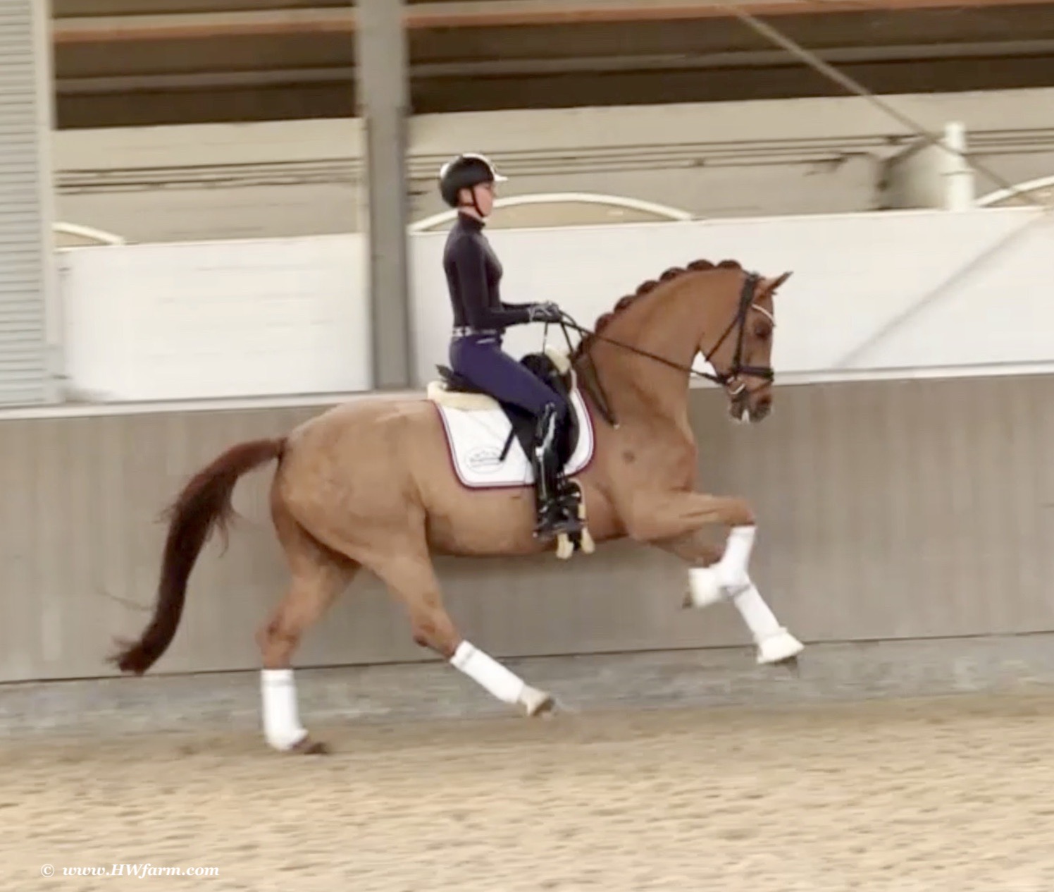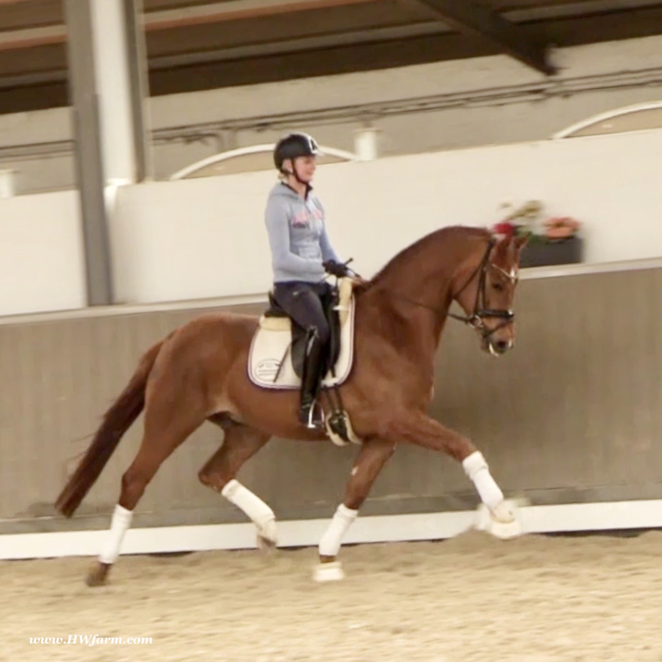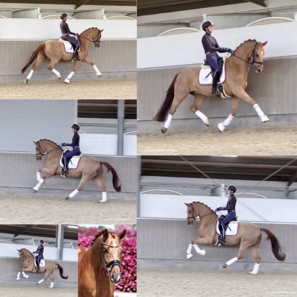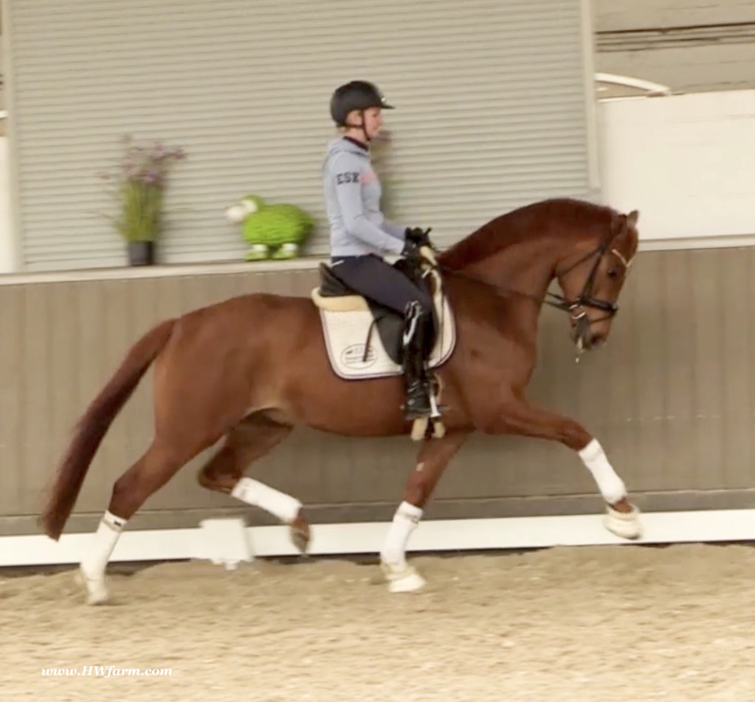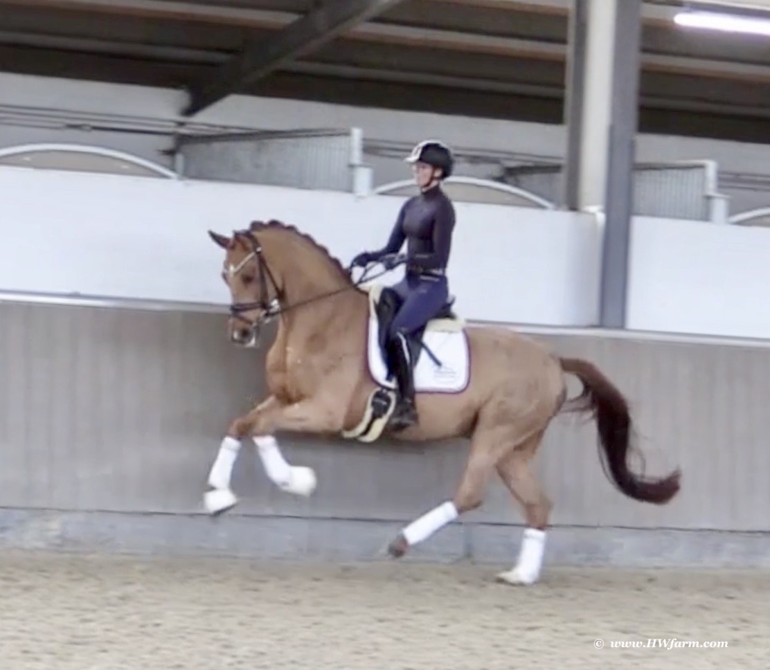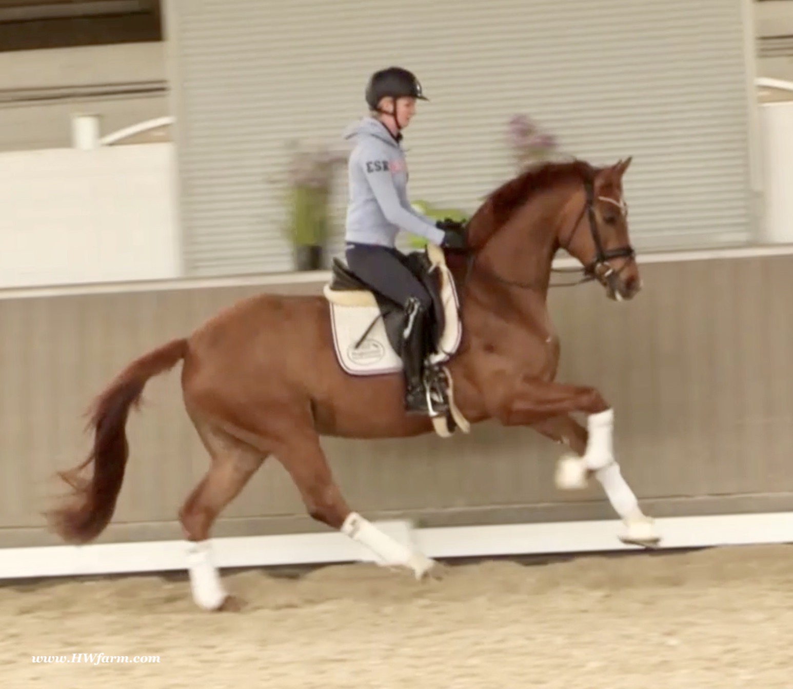 Synergy HW, chestnut Westphalian gelding, by BundesChampion, Vice World Champion Secret/BundesChampion Quaterback, born in 2018, standing approximately 164 cm or 16 and 1/2 hands. Synergy HW, by Secret, the outstanding National German 6yo Champion, plus at the World Championships for young dressage horses Ermelo 2019 - Secret - a truly exceptional horse, became Vice World Champion! Secret and his rider Jessica Lynn Thomas delivered a spectacular first round in the qualification of the five-year-old dressage horses. They received an 8.8 for the permeability, the step 9.5, the gallop 9.7, the per-spective 9.8 and even 9.9 for the trot. All in all, this gave a total result of 9.54 points and the victory was not to be taken from the two. In the final, Secret had to give up just under 0.02 points, despite a further increase. The pair won the silver medal of the five-year-old dressage horses with 9.64 points. The judge's comment: "A fantastic horse! Always in the flow, always easy. It is a pleasure to judge such a horse. " In terms of breeding, the descendants of the Secret also seamlessly linked to his father's success in 2019. Country after country was heard from his descendants. In the far north, in Schleswig-Holstein, Secret set one of the price peaks at the Glanz and Gloria auction in Delingsdorf with € 21,000. In Verden, Status Quo was one of the most sought-after youngsters at € 25,000. With the appropriate name Somebody to Dance, Secret was also among the price peaks in Münster on the occasion of the Westphalia Week. In Vechta, Serge Gainsbourg triumphed as the most expensive foal in 2019 with a hammer price of 150,000 euros. The price structure was followed by Secret Emperor, another son of the Secret. This went to Aus-tria for € 42,000. And also in the south of Germany in Nörtlingen, it was once again a subsidiary of our Secret, which was one of the top prices of the auction with a hammer price of € 25,000. The fact that his offspring are also in demand abroad was demonstrated by a filly from Secret, which took the reserve winner classification of dressage-stressed filly at the Swiss Sport Foal Championships and then found a new owner with a surcharge of 28,000 francs (about 25,000 €). In the Netherlands it was the colt with the appropriate name - One to Re-member- that became the top foal in the auction at € 22,000 The highlight of the day comes from Schwaiger and bears the appropriate name Sensation, from Secret - Fürst Grandios. A colt with a value of 9.67 (type / stature: 10, exterior / correctness: 9, movement: 10) really leaves nothing to be desired and makes words superfluous. "This is how the Austrian Horse Breeding Association described its winning foal 2019. Secret easily met the expectations placed on him. He completed his 14-day test in Schlieckau with a dressage final score of 9.5. He was able to shine again at the Bundeschampionat in Warendorf, where he was only named Vice Bundeschampion due to the rider marks. No more words need be said about father Sezuan, the celebrated triple world champion of young dressage horses. The mother line of the Secret, line 853 of the Sudette, produced numerous internationally represented performance horses. Already 38 other licensed stallions originate from this dam line. As the dam's sire, we find St. Moritz, which has only been well remembered at our station, and which, due to the fact that it was too short to work at Gestüt WM, produced a whole range of interesting, sporty and successful offspring. The maternal pedigree is rounded off by the proven successful combination of the Celler state stud stallions Rotspon, Argentan, Woermann and Lugano. Another flagship of this mother line is the Bundeschampion of five-year-old dressage horses and world champion of six-year-old dres-sage horses Lordwoods Dancing Diamond. Due to the genetic blood combination of the top class in his flagship pedigree, coupled with the high level of commitment of this rough dia-mond, we offer today's savvy dressage horse lovers, something truly special. Synergy HW's dam sire is is the BundesChampion Quaterback, it's the same dam who produced the BundesFoalChampion Ferdinand HW and She's Magic HW. Quaterback is a stallion that seems like he could only come from another planet - with his light-footed, brilliant movement and perfect cadence, all eyes become riveted on Quaterback when he appears. his stallion career by being named Champion of his licensing in Neustadt/Dosse in 2005. In 2006, after the Bundeschampionate, he went on to win his 30 day test at Neustadt/Dosse with outstanding scores: Int. 9.0 Trot 9.25 Canter 9.75 Walk 7.63 Riding qualities 9.75 Jumping 7.75 He was the radiant Bundeschampion of the three year old riding horses in 2006 with the highest scores for his trot and canter. The test riders in Warendorf even gave him this dream score of 10.0. Prior to this test, he had won several tests for young riding horses. He was also the winner of his 30-day test with a final score of 9.14 in dressage, an 8.43 for jumping and an overall score of 8.88. As if it were not enough to have unbelievably dynamic movement, he was also blessed with an outstanding type. Quaterback comes from one of the most successful mare lines of modern day. His dam Passionata is a half-sister of the unforgettable World Champion and double Bundeschampion, Poetin. Her full brothers Samba Hit I , Samba Hit III to V put on convincing presentations at the Bundeschampionate. Samba Hit I was also a finalist in the 2006 Nürnberg Burgpokal and the sire of Samba's Diamond who became the Champion Stallion of the licensing in Berlin-Brandenburg and Sachsen-Anhalt that same year. Quaterback's successful advanced (S) level sire Quaterman also participated in several Bundeschampionats and is deemed one of the best sires for passing on good movements in the new German States. The grandsire Quando-Quando took 15th place at the World Championships in Aachen in 2006 under Kristy Oatle
