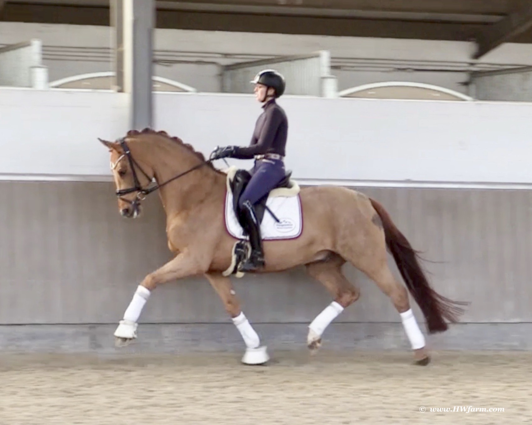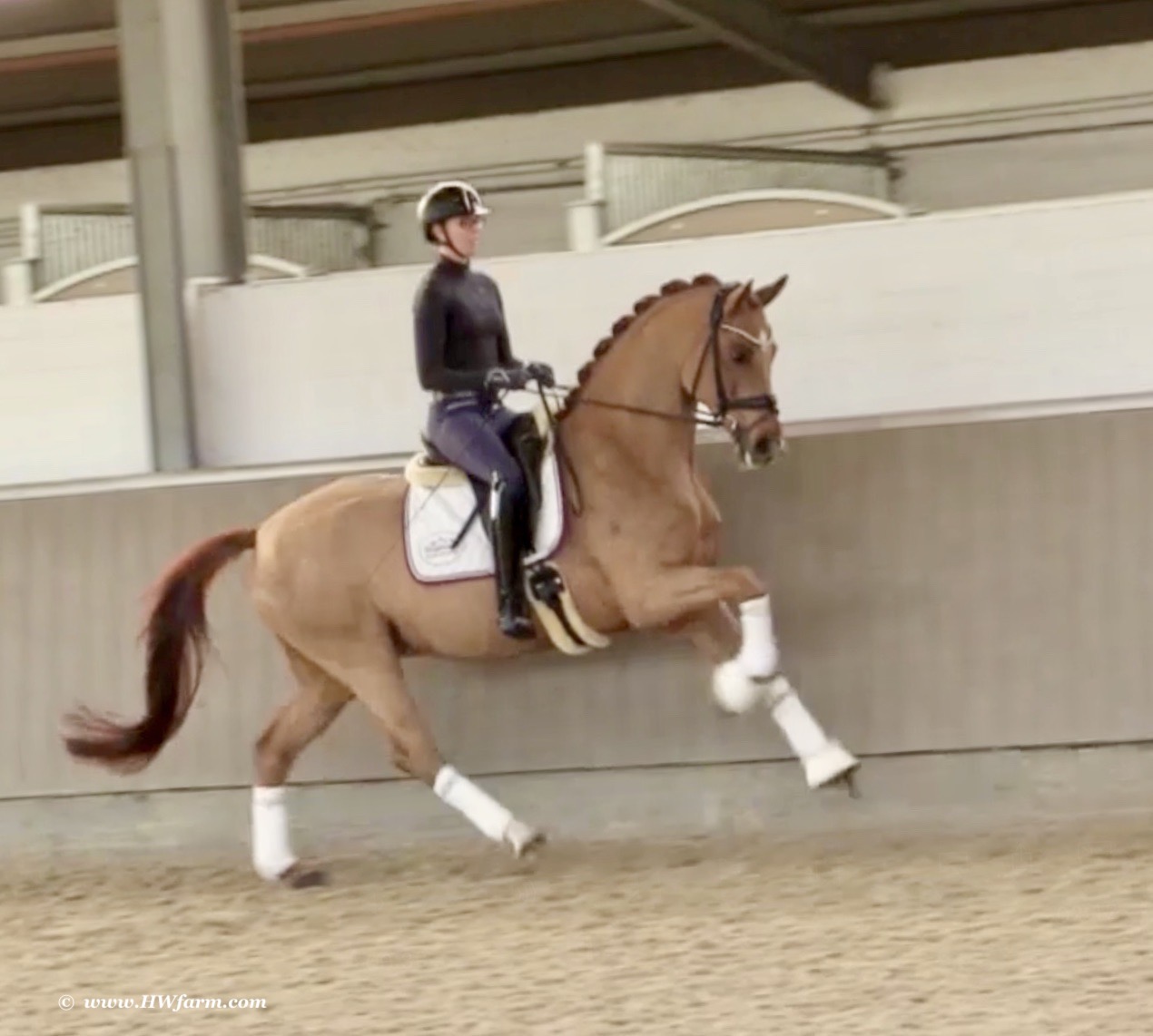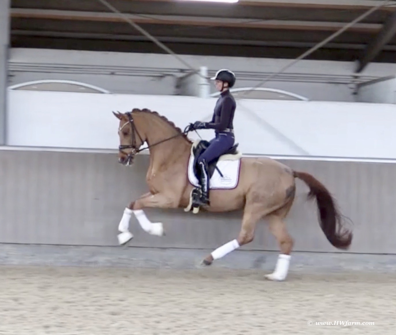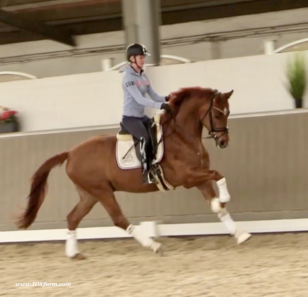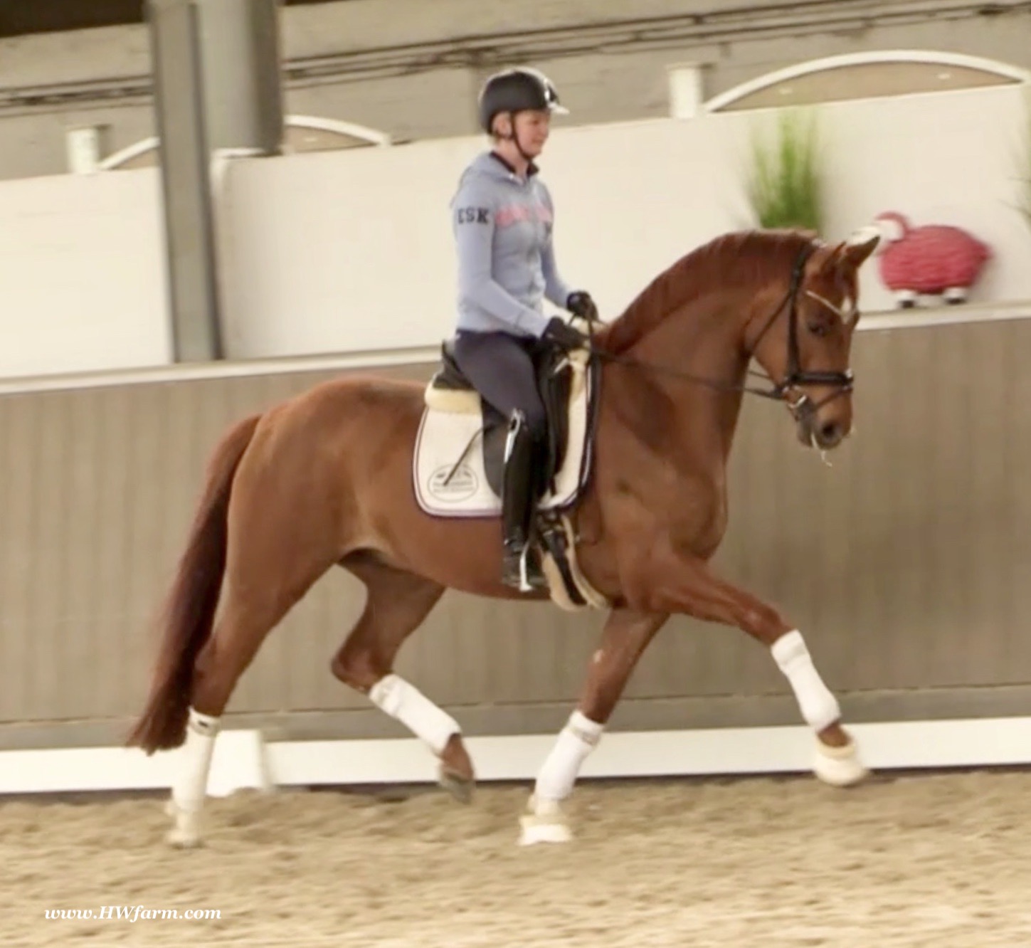 Synergy HW, chestnut Westphalian gelding, by BundesChampion, Vice World Champion Secret/BundesChampion Quaterback, born in 2018, standing approximately 164 cm or 16 and 1/2 hands. Synergy HW, by Secret, the outstanding National German 6yo Champion, plus at the World Championships for young dressage horses Ermelo 2019 - Secret - a truly exceptional horse, became Vice World Champion! Secret and his rider Jessica Lynn Thomas delivered a spectacular first round in the qualification of the five-year-old dressage horses. They received an 8.8 for the permeability, the step 9.5, the gallop 9.7, the per-spective 9.8 and even 9.9 for the trot. All in all, this gave a total result of 9.54 points and the victory was not to be taken from the two. In the final, Secret had to give up just under 0.02 points, despite a further increase. The pair won the silver medal of the five-year-old dressage horses with 9.64 points. The judge's comment: "A fantastic horse! Always in the flow, always easy. It is a pleasure to judge such a horse. " In terms of breeding, the descendants of the Secret also seamlessly linked to his father's success in 2019. Country after country was heard from his descendants. In the far north, in Schleswig-Holstein, Secret set one of the price peaks at the Glanz and Gloria auction in Delingsdorf with € 21,000. In Verden, Status Quo was one of the most sought-after youngsters at € 25,000. With the appropriate name Somebody to Dance, Secret was also among the price peaks in Münster on the occasion of the Westphalia Week. In Vechta, Serge Gainsbourg triumphed as the most expensive foal in 2019 with a hammer price of 150,000 euros. The price structure was followed by Secret Emperor, another son of the Secret. This went to Aus-tria for € 42,000. And also in the south of Germany in Nörtlingen, it was once again a subsidiary of our Secret, which was one of the top prices of the auction with a hammer price of € 25,000. The fact that his offspring are also in demand abroad was demonstrated by a filly from Secret, which took the reserve winner classification of dressage-stressed filly at the Swiss Sport Foal Championships and then found a new owner with a surcharge of 28,000 francs (about 25,000 €). In the Netherlands it was the colt with the appropriate name - One to Re-member- that became the top foal in the auction at € 22,000 The highlight of the day comes from Schwaiger and bears the appropriate name Sensation, from Secret - Fürst Grandios. A colt with a value of 9.67 (type / stature: 10, exterior / correctness: 9, movement: 10) really leaves nothing to be desired and makes words superfluous. "This is how the Austrian Horse Breeding Association described its winning foal 2019. Secret easily met the expectations placed on him. He completed his 14-day test in Schlieckau with a dressage final score of 9.5. He was able to shine again at the Bundeschampionat in Warendorf, where he was only named Vice Bundeschampion due to the rider marks. No more words need be said about father Sezuan, the celebrated triple world champion of young dressage horses. The mother line of the Secret, line 853 of the Sudette, produced numerous internationally represented performance horses. Already 38 other licensed stallions originate from this dam line. As the dam's sire, we find St. Moritz, which has only been well remembered at our station, and which, due to the fact that it was too short to work at Gestüt WM, produced a whole range of interesting, sporty and successful offspring. The maternal pedigree is rounded off by the proven successful combination of the Celler state stud stallions Rotspon, Argentan, Woermann and Lugano. Another flagship of this mother line is the Bundeschampion of five-year-old dressage horses and world champion of six-year-old dres-sage horses Lordwoods Dancing Diamond. Due to the genetic blood combination of the top class in his flagship pedigree, coupled with the high level of commitment of this rough dia-mond, we offer today's savvy dressage horse lovers, something truly special. Synergy HW's dam sire is is the BundesChampion Quaterback, it's the same dam who produced the BundesFoalChampion Ferdinand HW and She's Magic HW. Quaterback is a stallion that seems like he could only come from another planet - with his light-footed, brilliant movement and perfect cadence, all eyes become riveted on Quaterback when he appears. his stallion career by being named Champion of his licensing in Neustadt/Dosse in 2005. In 2006, after the Bundeschampionate, he went on to win his 30 day test at Neustadt/Dosse with outstanding scores: Int. 9.0 Trot 9.25 Canter 9.75 Walk 7.63 Riding qualities 9.75 Jumping 7.75 He was the radiant Bundeschampion of the three year old riding horses in 2006 with the highest scores for his trot and canter. The test riders in Warendorf even gave him this dream score of 10.0. Prior to this test, he had won several tests for young riding horses. He was also the winner of his 30-day test with a final score of 9.14 in dressage, an 8.43 for jumping and an overall score of 8.88. As if it were not enough to have unbelievably dynamic movement, he was also blessed with an outstanding type. Quaterback comes from one of the most successful mare lines of modern day. His dam Passionata is a half-sister of the unforgettable World Champion and double Bundeschampion, Poetin. Her full brothers Samba Hit I , Samba Hit III to V put on convincing presentations at the Bundeschampionate. Samba Hit I was also a finalist in the 2006 Nürnberg Burgpokal and the sire of Samba's Diamond who became the Champion Stallion of the licensing in Berlin-Brandenburg and Sachsen-Anhalt that same year. Quaterback's successful advanced (S) level sire Quaterman also participated in several Bundeschampionats and is deemed one of the best sires for passing on good movements in the new German States. The grandsire Quando-Quando took 15th place at the World Championships in Aachen in 2006 under Kristy Oatle