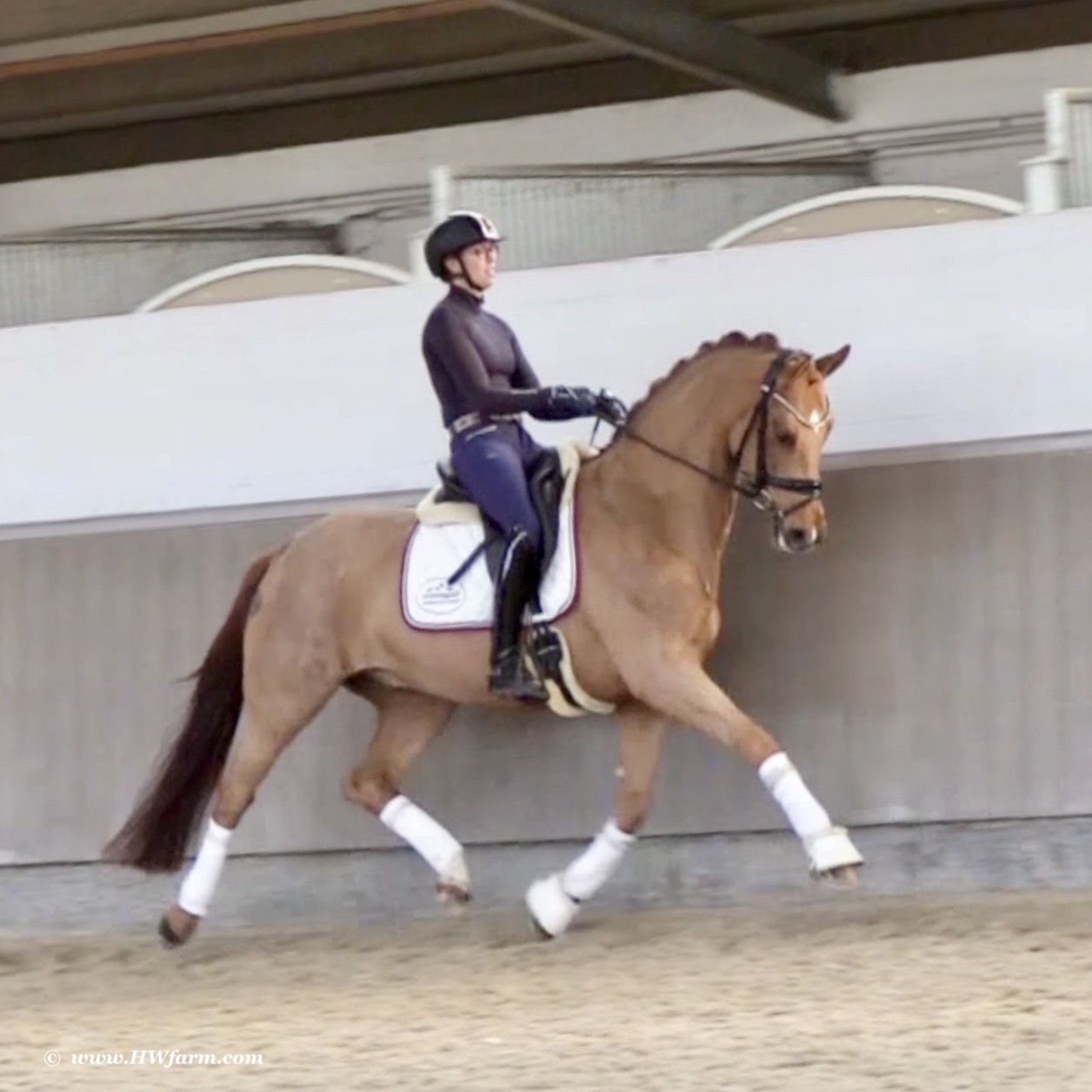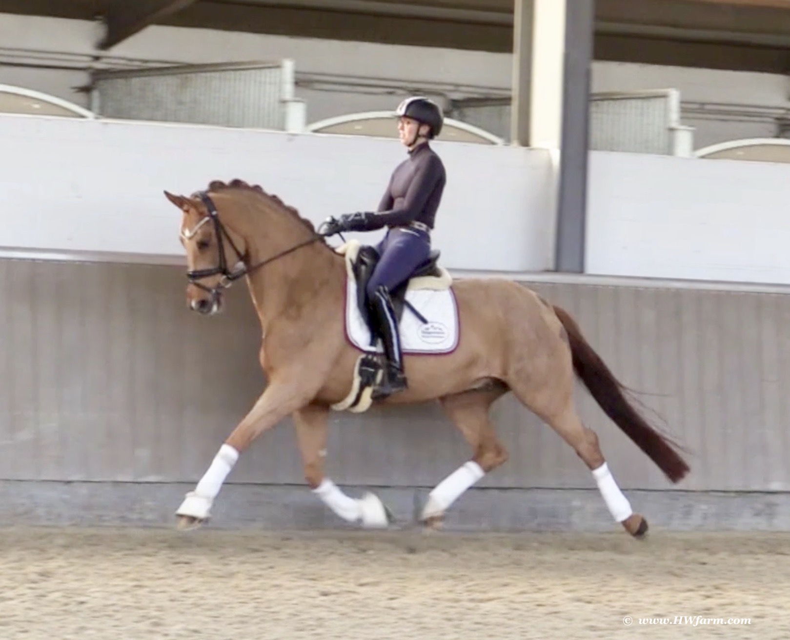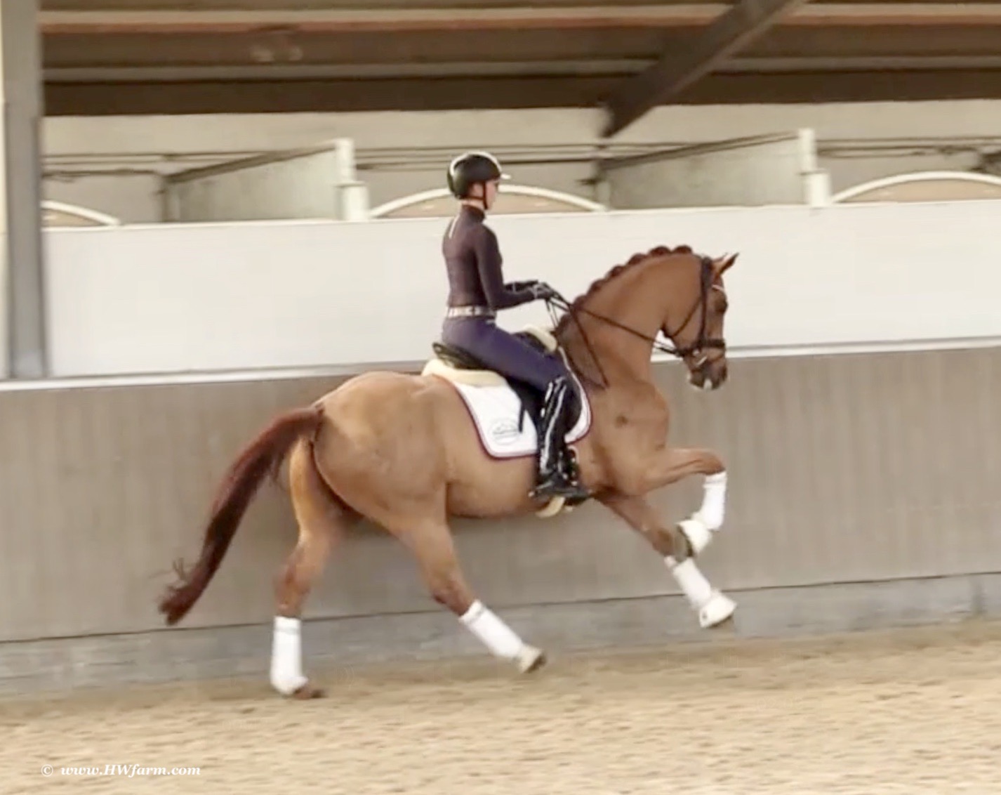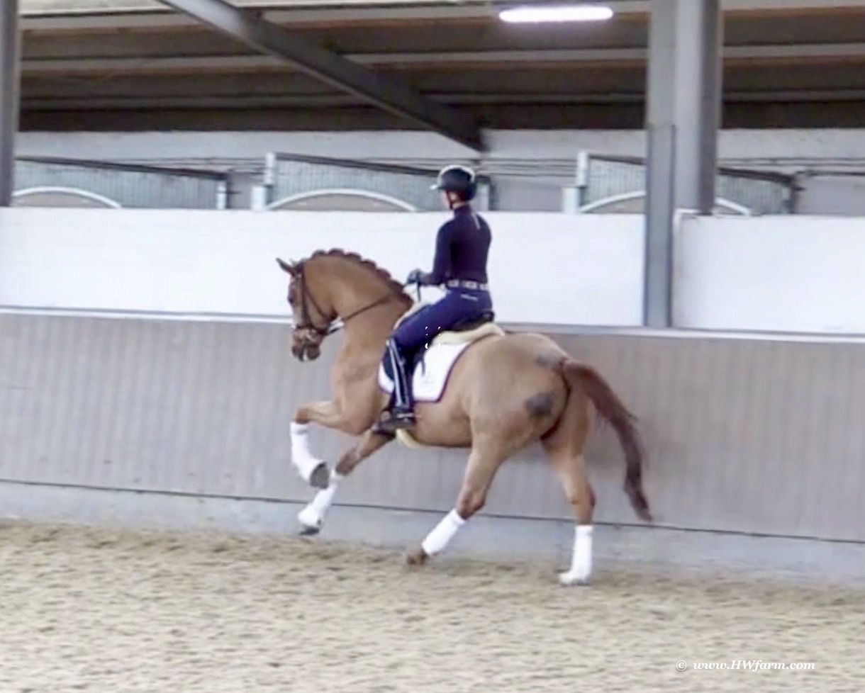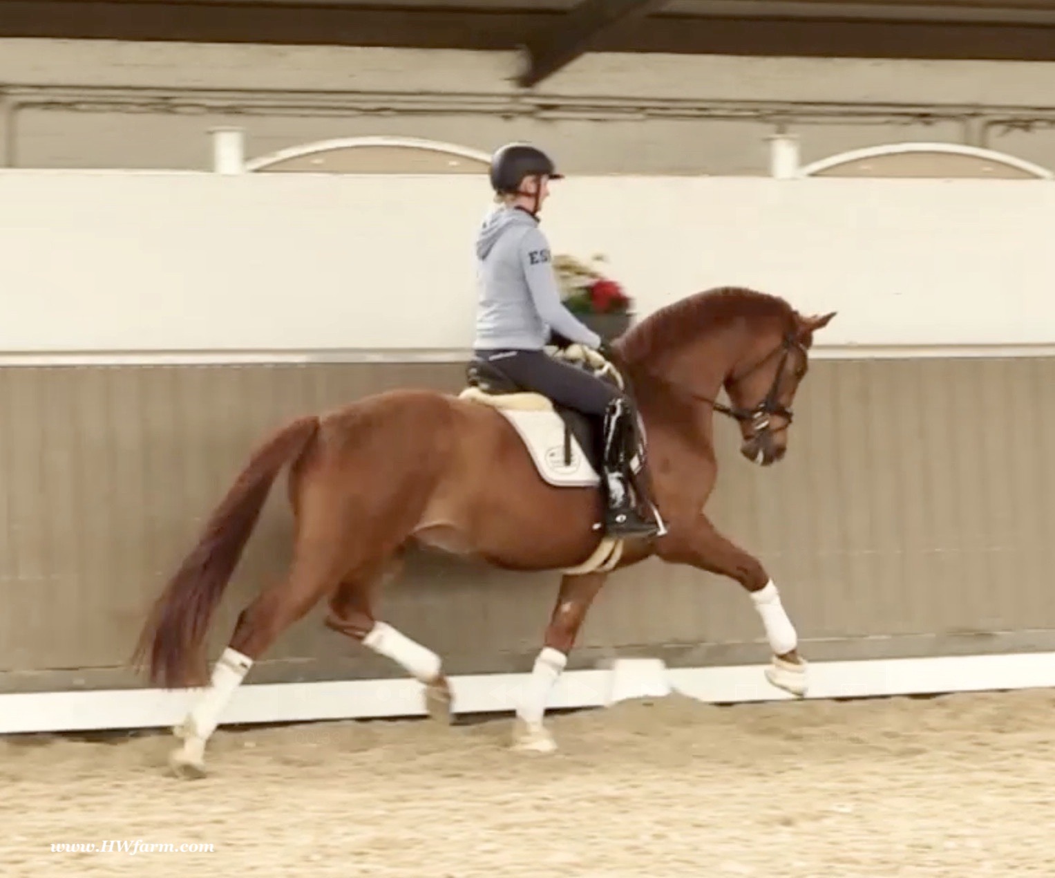 Synergy HW, chestnut Westphalian gelding, by BundesChampion, Vice World Champion Secret/BundesChampion Quaterback, born in 2018, standing approximately 164 cm or 16 and 1/2 hands. Synergy HW, by Secret, the outstanding National German 6yo Champion, plus at the World Championships for young dressage horses Ermelo 2019 - Secret - a truly exceptional horse, became Vice World Champion! Secret and his rider Jessica Lynn Thomas delivered a spectacular first round in the qualification of the five-year-old dressage horses. They received an 8.8 for the permeability, the step 9.5, the gallop 9.7, the per-spective 9.8 and even 9.9 for the trot. All in all, this gave a total result of 9.54 points and the victory was not to be taken from the two. In the final, Secret had to give up just under 0.02 points, despite a further increase. The pair won the silver medal of the five-year-old dressage horses with 9.64 points. The judge's comment: "A fantastic horse! Always in the flow, always easy. It is a pleasure to judge such a horse. " In terms of breeding, the descendants of the Secret also seamlessly linked to his father's success in 2019. Country after country was heard from his descendants. In the far north, in Schleswig-Holstein, Secret set one of the price peaks at the Glanz and Gloria auction in Delingsdorf with € 21,000. In Verden, Status Quo was one of the most sought-after youngsters at € 25,000. With the appropriate name Somebody to Dance, Secret was also among the price peaks in Münster on the occasion of the Westphalia Week. In Vechta, Serge Gainsbourg triumphed as the most expensive foal in 2019 with a hammer price of 150,000 euros. The price structure was followed by Secret Emperor, another son of the Secret. This went to Aus-tria for € 42,000. And also in the south of Germany in Nörtlingen, it was once again a subsidiary of our Secret, which was one of the top prices of the auction with a hammer price of € 25,000. The fact that his offspring are also in demand abroad was demonstrated by a filly from Secret, which took the reserve winner classification of dressage-stressed filly at the Swiss Sport Foal Championships and then found a new owner with a surcharge of 28,000 francs (about 25,000 €). In the Netherlands it was the colt with the appropriate name - One to Re-member- that became the top foal in the auction at € 22,000 The highlight of the day comes from Schwaiger and bears the appropriate name Sensation, from Secret - Fürst Grandios. A colt with a value of 9.67 (type / stature: 10, exterior / correctness: 9, movement: 10) really leaves nothing to be desired and makes words superfluous. "This is how the Austrian Horse Breeding Association described its winning foal 2019. Secret easily met the expectations placed on him. He completed his 14-day test in Schlieckau with a dressage final score of 9.5. He was able to shine again at the Bundeschampionat in Warendorf, where he was only named Vice Bundeschampion due to the rider marks. No more words need be said about father Sezuan, the celebrated triple world champion of young dressage horses. The mother line of the Secret, line 853 of the Sudette, produced numerous internationally represented performance horses. Already 38 other licensed stallions originate from this dam line. As the dam's sire, we find St. Moritz, which has only been well remembered at our station, and which, due to the fact that it was too short to work at Gestüt WM, produced a whole range of interesting, sporty and successful offspring. The maternal pedigree is rounded off by the proven successful combination of the Celler state stud stallions Rotspon, Argentan, Woermann and Lugano. Another flagship of this mother line is the Bundeschampion of five-year-old dressage horses and world champion of six-year-old dres-sage horses Lordwoods Dancing Diamond. Due to the genetic blood combination of the top class in his flagship pedigree, coupled with the high level of commitment of this rough dia-mond, we offer today's savvy dressage horse lovers, something truly special. Synergy HW's dam sire is is the BundesChampion Quaterback, it's the same dam who produced the BundesFoalChampion Ferdinand HW and She's Magic HW. Quaterback is a stallion that seems like he could only come from another planet - with his light-footed, brilliant movement and perfect cadence, all eyes become riveted on Quaterback when he appears. his stallion career by being named Champion of his licensing in Neustadt/Dosse in 2005. In 2006, after the Bundeschampionate, he went on to win his 30 day test at Neustadt/Dosse with outstanding scores: Int. 9.0 Trot 9.25 Canter 9.75 Walk 7.63 Riding qualities 9.75 Jumping 7.75 He was the radiant Bundeschampion of the three year old riding horses in 2006 with the highest scores for his trot and canter. The test riders in Warendorf even gave him this dream score of 10.0. Prior to this test, he had won several tests for young riding horses. He was also the winner of his 30-day test with a final score of 9.14 in dressage, an 8.43 for jumping and an overall score of 8.88. As if it were not enough to have unbelievably dynamic movement, he was also blessed with an outstanding type. Quaterback comes from one of the most successful mare lines of modern day. His dam Passionata is a half-sister of the unforgettable World Champion and double Bundeschampion, Poetin. Her full brothers Samba Hit I , Samba Hit III to V put on convincing presentations at the Bundeschampionate. Samba Hit I was also a finalist in the 2006 Nürnberg Burgpokal and the sire of Samba's Diamond who became the Champion Stallion of the licensing in Berlin-Brandenburg and Sachsen-Anhalt that same year. Quaterback's successful advanced (S) level sire Quaterman also participated in several Bundeschampionats and is deemed one of the best sires for passing on good movements in the new German States. The grandsire Quando-Quando took 15th place at the World Championships in Aachen in 2006 under Kristy Oatle