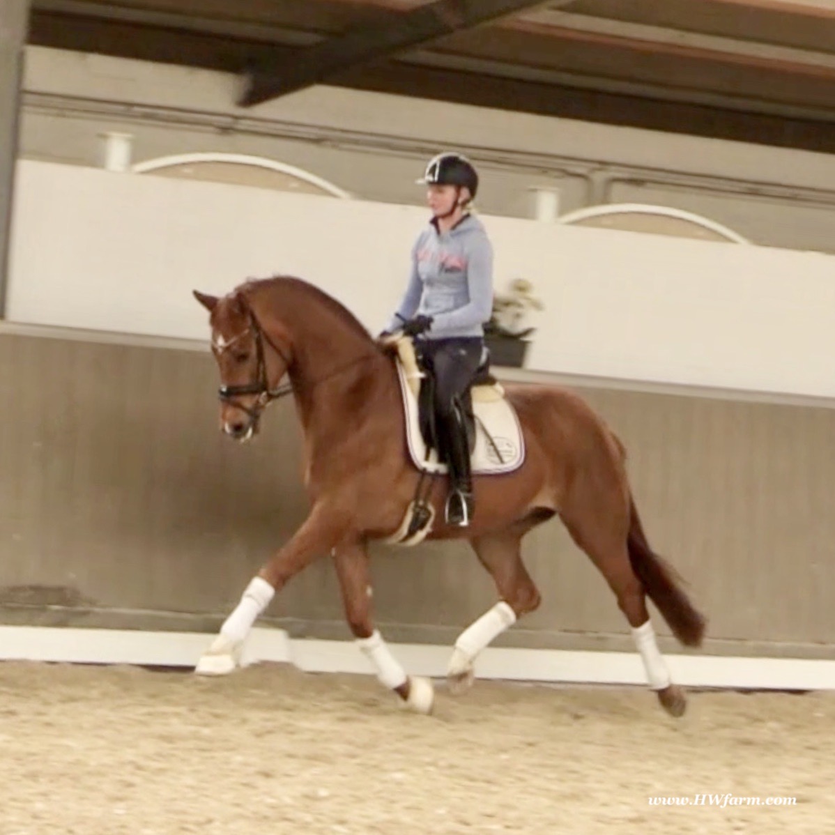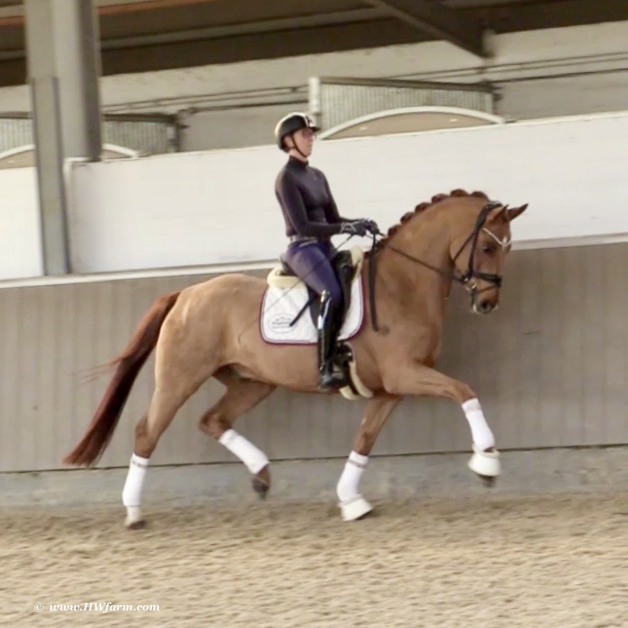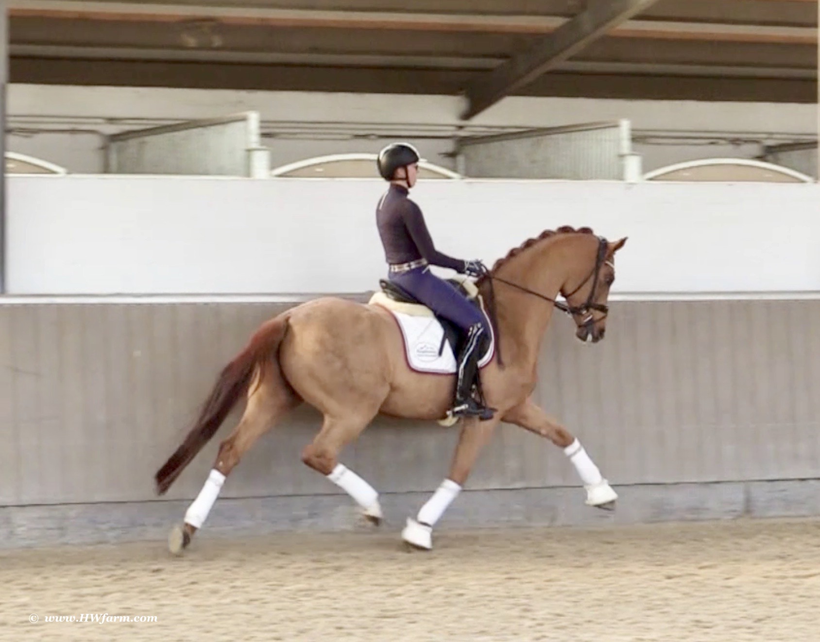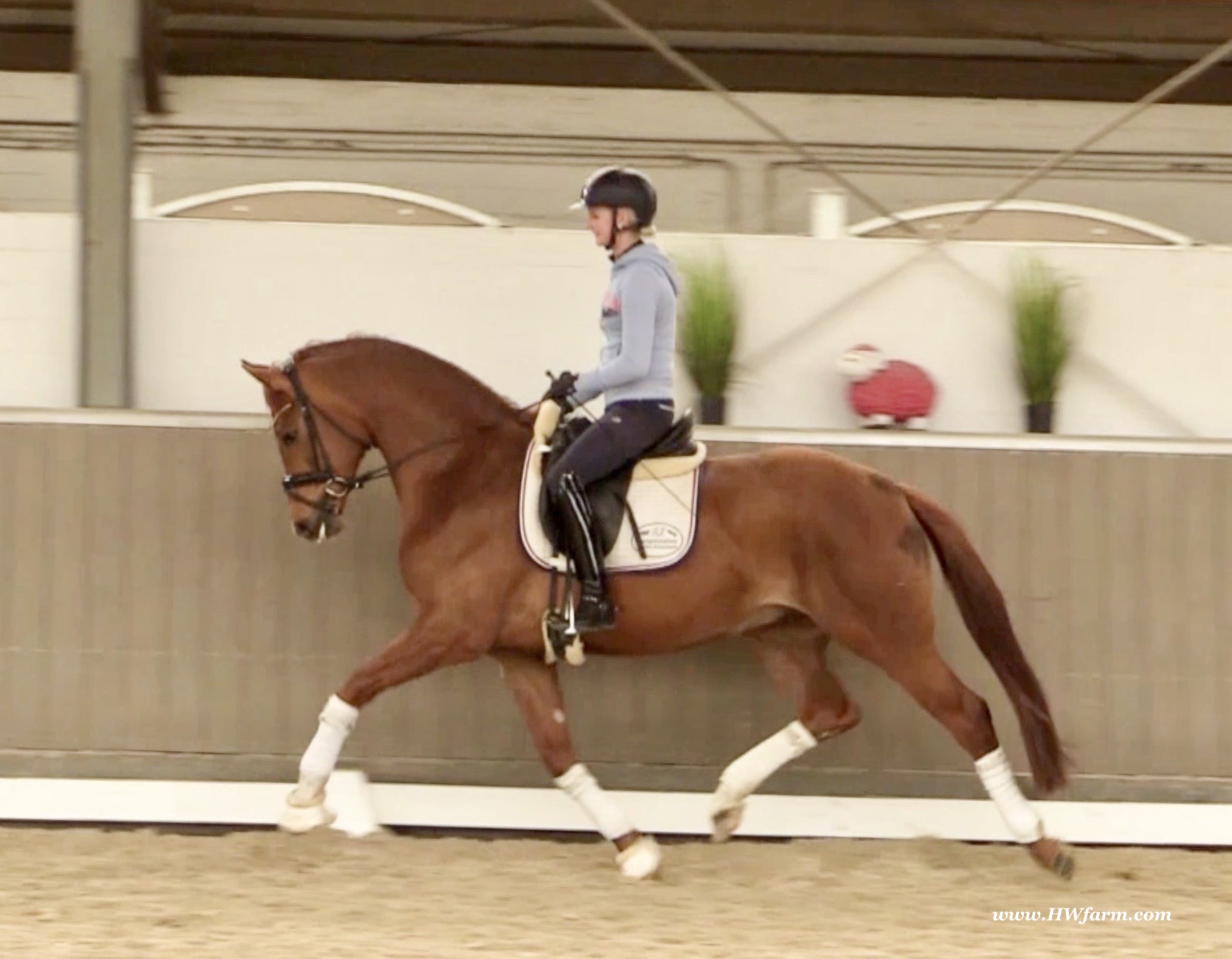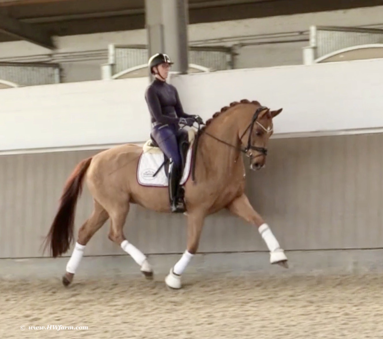 Synergy HW, chestnut Westphalian gelding, by BundesChampion, Vice World Champion Secret/BundesChampion Quaterback, born in 2018, standing approximately 164 cm or 16 and 1/2 hands. Synergy HW, by Secret, the outstanding National German 6yo Champion, plus at the World Championships for young dressage horses Ermelo 2019 - Secret - a truly exceptional horse, became Vice World Champion! Secret and his rider Jessica Lynn Thomas delivered a spectacular first round in the qualification of the five-year-old dressage horses. They received an 8.8 for the permeability, the step 9.5, the gallop 9.7, the per-spective 9.8 and even 9.9 for the trot. All in all, this gave a total result of 9.54 points and the victory was not to be taken from the two. In the final, Secret had to give up just under 0.02 points, despite a further increase. The pair won the silver medal of the five-year-old dressage horses with 9.64 points. The judge's comment: "A fantastic horse! Always in the flow, always easy. It is a pleasure to judge such a horse. " In terms of breeding, the descendants of the Secret also seamlessly linked to his father's success in 2019. Country after country was heard from his descendants. In the far north, in Schleswig-Holstein, Secret set one of the price peaks at the Glanz and Gloria auction in Delingsdorf with € 21,000. In Verden, Status Quo was one of the most sought-after youngsters at € 25,000. With the appropriate name Somebody to Dance, Secret was also among the price peaks in Münster on the occasion of the Westphalia Week. In Vechta, Serge Gainsbourg triumphed as the most expensive foal in 2019 with a hammer price of 150,000 euros. The price structure was followed by Secret Emperor, another son of the Secret. This went to Aus-tria for € 42,000. And also in the south of Germany in Nörtlingen, it was once again a subsidiary of our Secret, which was one of the top prices of the auction with a hammer price of € 25,000. The fact that his offspring are also in demand abroad was demonstrated by a filly from Secret, which took the reserve winner classification of dressage-stressed filly at the Swiss Sport Foal Championships and then found a new owner with a surcharge of 28,000 francs (about 25,000 €). In the Netherlands it was the colt with the appropriate name - One to Re-member- that became the top foal in the auction at € 22,000 The highlight of the day comes from Schwaiger and bears the appropriate name Sensation, from Secret - Fürst Grandios. A colt with a value of 9.67 (type / stature: 10, exterior / correctness: 9, movement: 10) really leaves nothing to be desired and makes words superfluous. "This is how the Austrian Horse Breeding Association described its winning foal 2019. Secret easily met the expectations placed on him. He completed his 14-day test in Schlieckau with a dressage final score of 9.5. He was able to shine again at the Bundeschampionat in Warendorf, where he was only named Vice Bundeschampion due to the rider marks. No more words need be said about father Sezuan, the celebrated triple world champion of young dressage horses. The mother line of the Secret, line 853 of the Sudette, produced numerous internationally represented performance horses. Already 38 other licensed stallions originate from this dam line. As the dam's sire, we find St. Moritz, which has only been well remembered at our station, and which, due to the fact that it was too short to work at Gestüt WM, produced a whole range of interesting, sporty and successful offspring. The maternal pedigree is rounded off by the proven successful combination of the Celler state stud stallions Rotspon, Argentan, Woermann and Lugano. Another flagship of this mother line is the Bundeschampion of five-year-old dressage horses and world champion of six-year-old dres-sage horses Lordwoods Dancing Diamond. Due to the genetic blood combination of the top class in his flagship pedigree, coupled with the high level of commitment of this rough dia-mond, we offer today's savvy dressage horse lovers, something truly special. Synergy HW's dam sire is is the BundesChampion Quaterback, it's the same dam who produced the BundesFoalChampion Ferdinand HW and She's Magic HW. Quaterback is a stallion that seems like he could only come from another planet - with his light-footed, brilliant movement and perfect cadence, all eyes become riveted on Quaterback when he appears. his stallion career by being named Champion of his licensing in Neustadt/Dosse in 2005. In 2006, after the Bundeschampionate, he went on to win his 30 day test at Neustadt/Dosse with outstanding scores: Int. 9.0 Trot 9.25 Canter 9.75 Walk 7.63 Riding qualities 9.75 Jumping 7.75 He was the radiant Bundeschampion of the three year old riding horses in 2006 with the highest scores for his trot and canter. The test riders in Warendorf even gave him this dream score of 10.0. Prior to this test, he had won several tests for young riding horses. He was also the winner of his 30-day test with a final score of 9.14 in dressage, an 8.43 for jumping and an overall score of 8.88. As if it were not enough to have unbelievably dynamic movement, he was also blessed with an outstanding type. Quaterback comes from one of the most successful mare lines of modern day. His dam Passionata is a half-sister of the unforgettable World Champion and double Bundeschampion, Poetin. Her full brothers Samba Hit I , Samba Hit III to V put on convincing presentations at the Bundeschampionate. Samba Hit I was also a finalist in the 2006 Nürnberg Burgpokal and the sire of Samba's Diamond who became the Champion Stallion of the licensing in Berlin-Brandenburg and Sachsen-Anhalt that same year. Quaterback's successful advanced (S) level sire Quaterman also participated in several Bundeschampionats and is deemed one of the best sires for passing on good movements in the new German States. The grandsire Quando-Quando took 15th place at the World Championships in Aachen in 2006 under Kristy Oatle