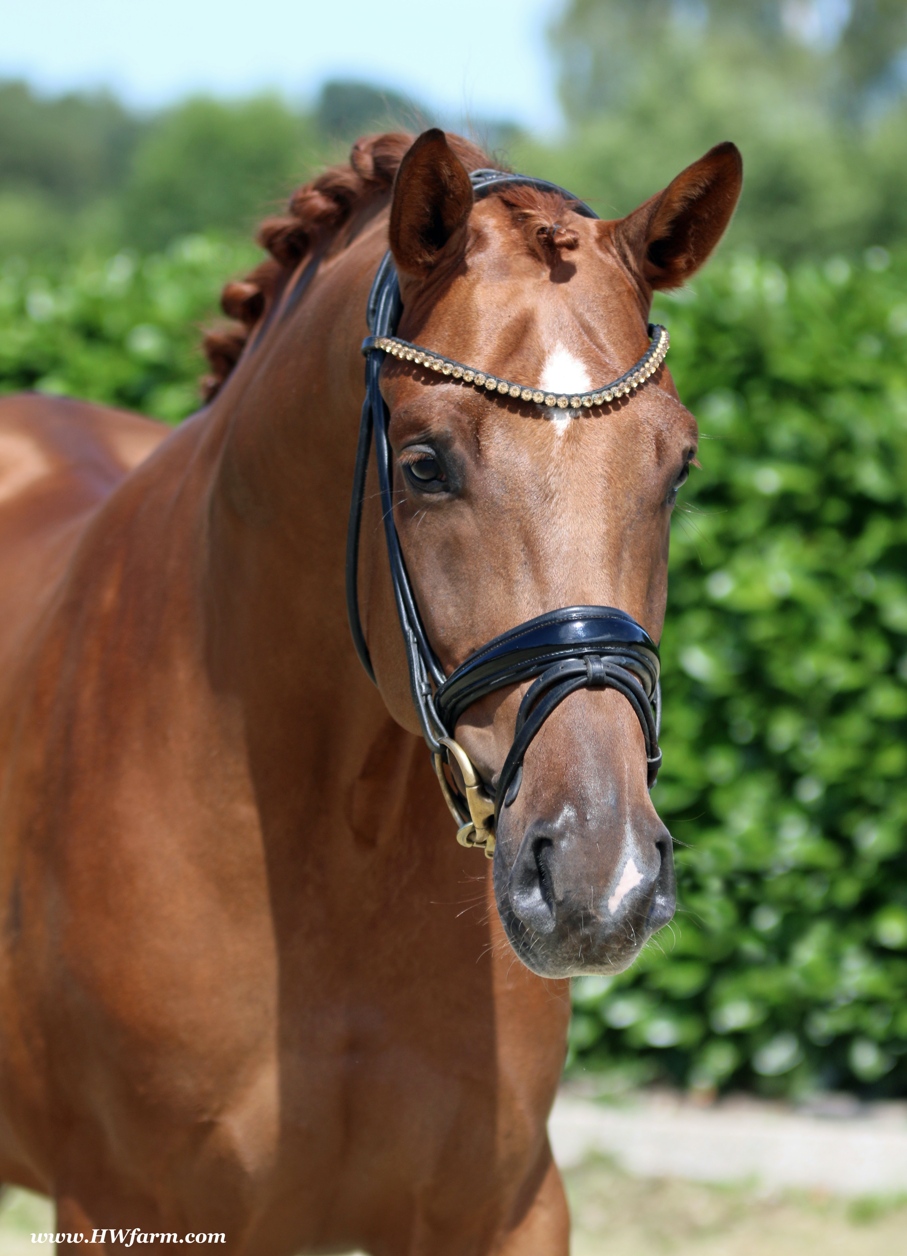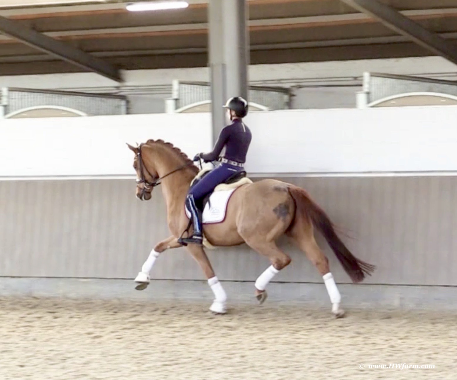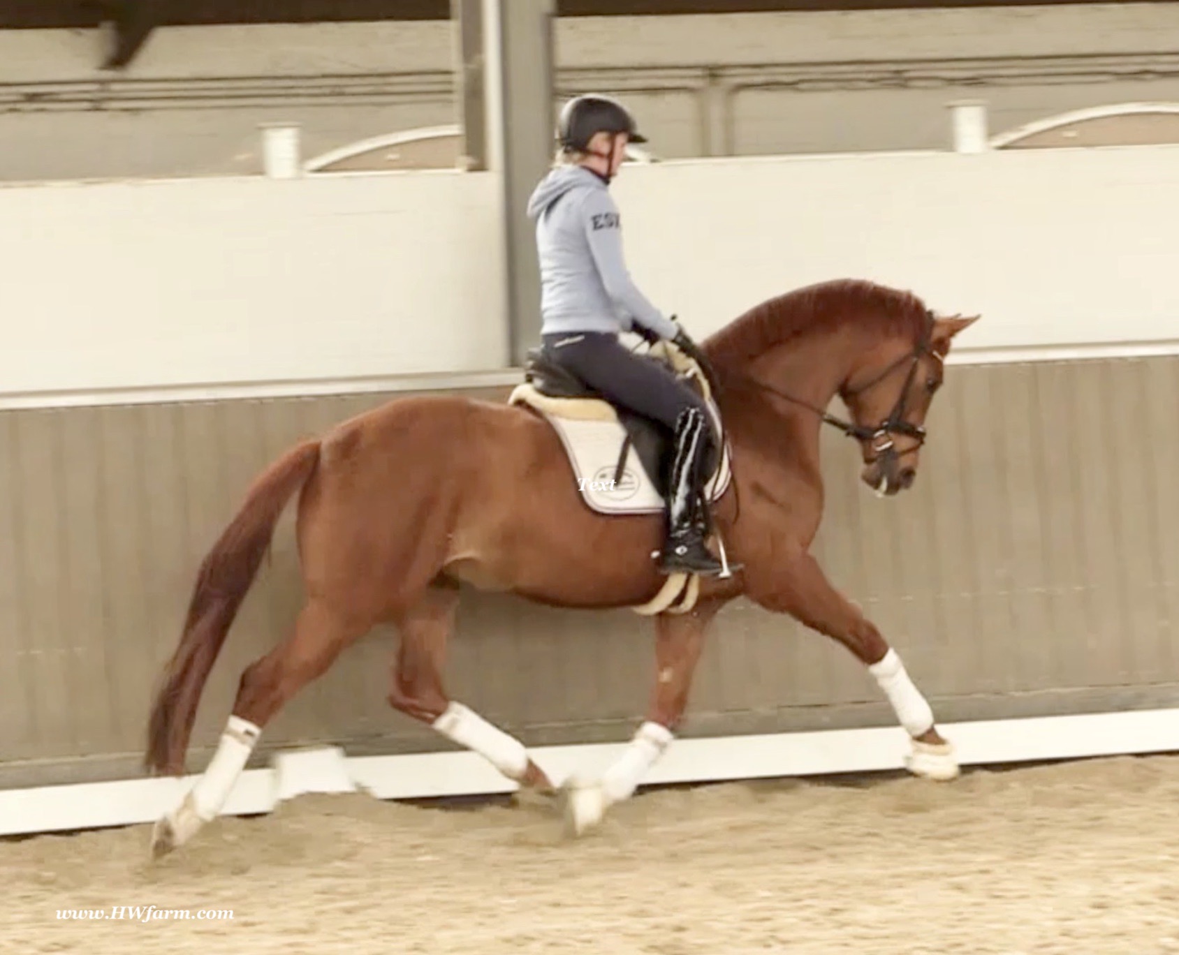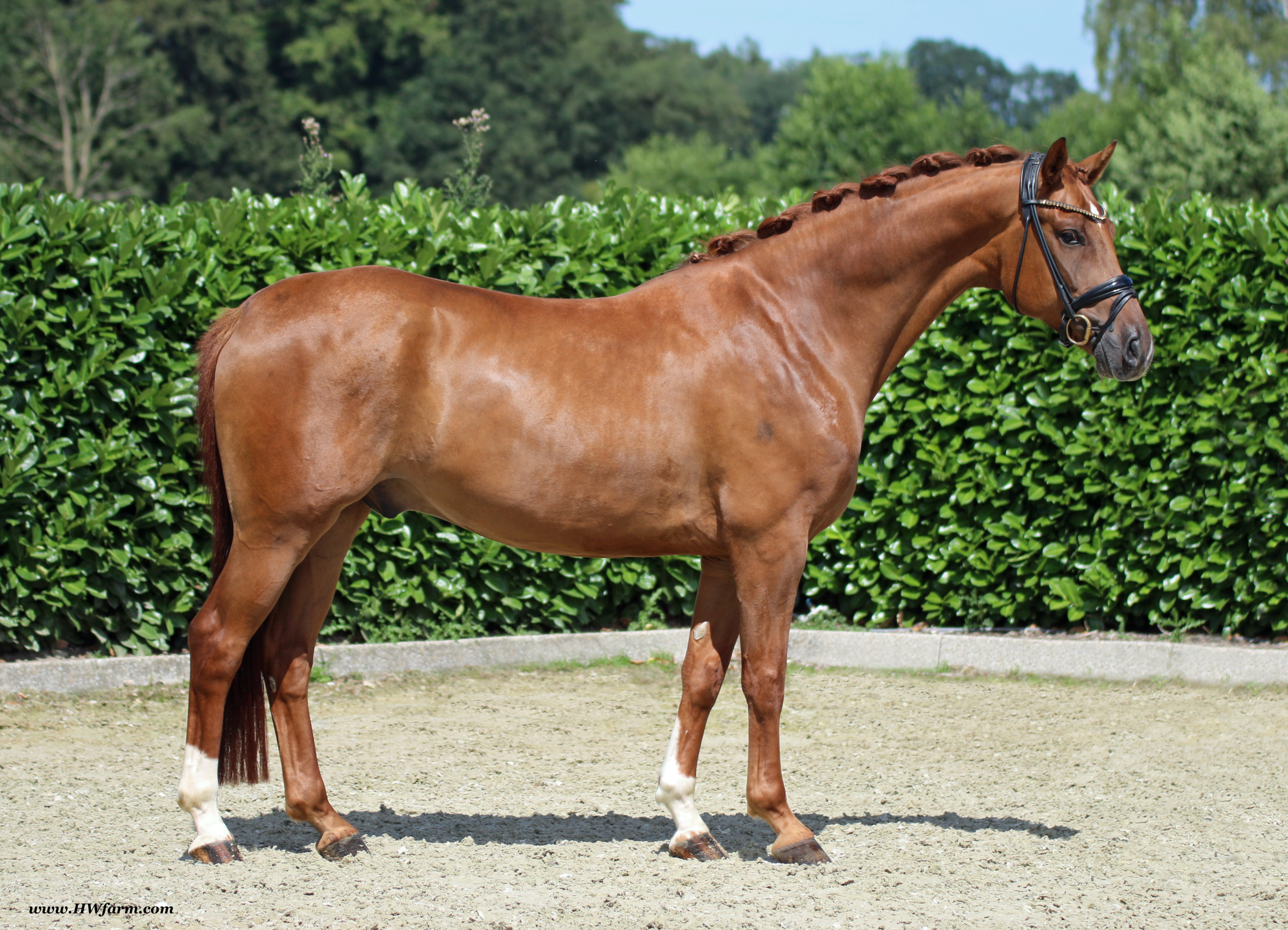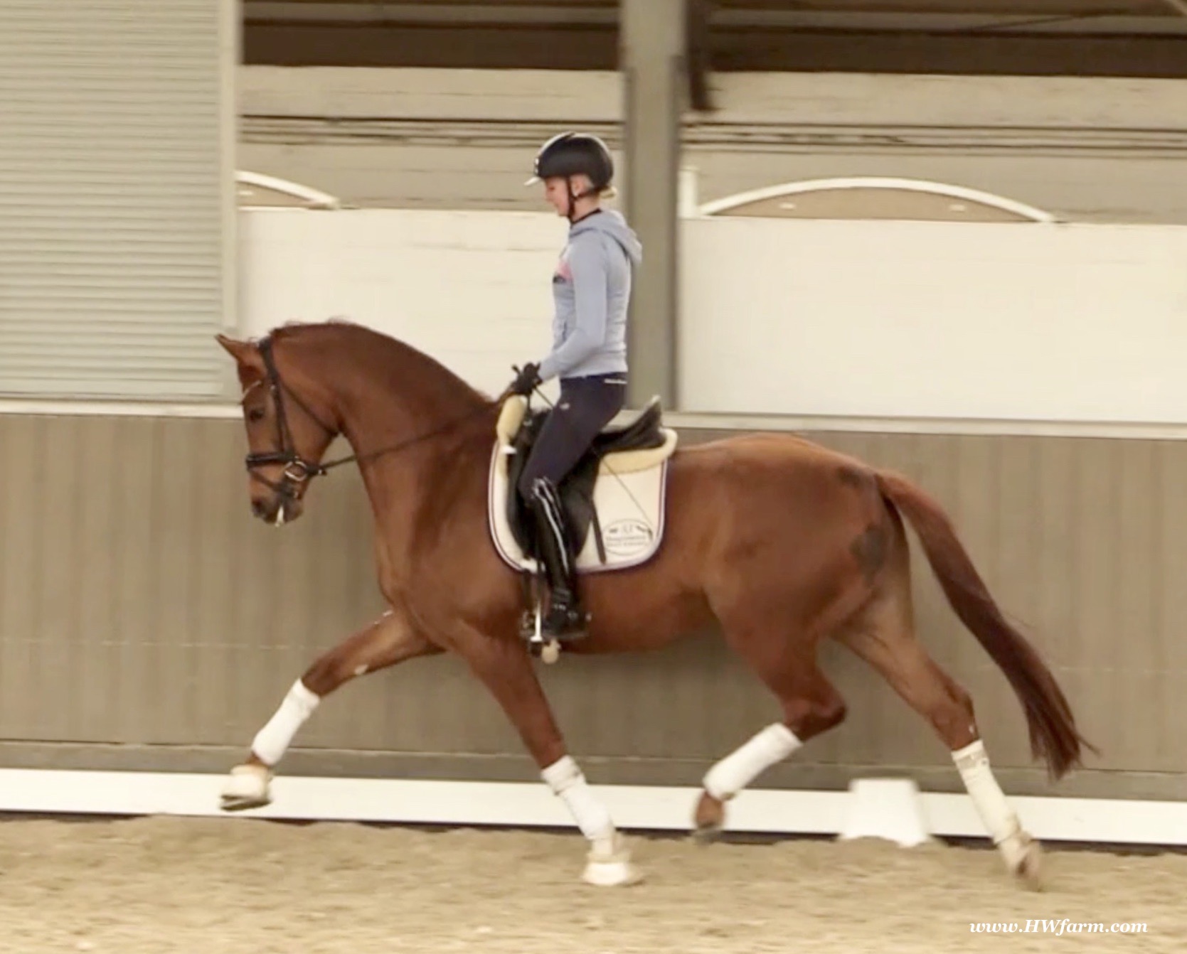 Synergy HW, chestnut Westphalian gelding, by BundesChampion, Vice World Champion Secret/BundesChampion Quaterback, born in 2018, standing approximately 164 cm or 16 and 1/2 hands. Synergy HW, by Secret, the outstanding National German 6yo Champion, plus at the World Championships for young dressage horses Ermelo 2019 - Secret - a truly exceptional horse, became Vice World Champion! Secret and his rider Jessica Lynn Thomas delivered a spectacular first round in the qualification of the five-year-old dressage horses. They received an 8.8 for the permeability, the step 9.5, the gallop 9.7, the per-spective 9.8 and even 9.9 for the trot. All in all, this gave a total result of 9.54 points and the victory was not to be taken from the two. In the final, Secret had to give up just under 0.02 points, despite a further increase. The pair won the silver medal of the five-year-old dressage horses with 9.64 points. The judge's comment: "A fantastic horse! Always in the flow, always easy. It is a pleasure to judge such a horse. " In terms of breeding, the descendants of the Secret also seamlessly linked to his father's success in 2019. Country after country was heard from his descendants. In the far north, in Schleswig-Holstein, Secret set one of the price peaks at the Glanz and Gloria auction in Delingsdorf with € 21,000. In Verden, Status Quo was one of the most sought-after youngsters at € 25,000. With the appropriate name Somebody to Dance, Secret was also among the price peaks in Münster on the occasion of the Westphalia Week. In Vechta, Serge Gainsbourg triumphed as the most expensive foal in 2019 with a hammer price of 150,000 euros. The price structure was followed by Secret Emperor, another son of the Secret. This went to Aus-tria for € 42,000. And also in the south of Germany in Nörtlingen, it was once again a subsidiary of our Secret, which was one of the top prices of the auction with a hammer price of € 25,000. The fact that his offspring are also in demand abroad was demonstrated by a filly from Secret, which took the reserve winner classification of dressage-stressed filly at the Swiss Sport Foal Championships and then found a new owner with a surcharge of 28,000 francs (about 25,000 €). In the Netherlands it was the colt with the appropriate name - One to Re-member- that became the top foal in the auction at € 22,000 The highlight of the day comes from Schwaiger and bears the appropriate name Sensation, from Secret - Fürst Grandios. A colt with a value of 9.67 (type / stature: 10, exterior / correctness: 9, movement: 10) really leaves nothing to be desired and makes words superfluous. "This is how the Austrian Horse Breeding Association described its winning foal 2019. Secret easily met the expectations placed on him. He completed his 14-day test in Schlieckau with a dressage final score of 9.5. He was able to shine again at the Bundeschampionat in Warendorf, where he was only named Vice Bundeschampion due to the rider marks. No more words need be said about father Sezuan, the celebrated triple world champion of young dressage horses. The mother line of the Secret, line 853 of the Sudette, produced numerous internationally represented performance horses. Already 38 other licensed stallions originate from this dam line. As the dam's sire, we find St. Moritz, which has only been well remembered at our station, and which, due to the fact that it was too short to work at Gestüt WM, produced a whole range of interesting, sporty and successful offspring. The maternal pedigree is rounded off by the proven successful combination of the Celler state stud stallions Rotspon, Argentan, Woermann and Lugano. Another flagship of this mother line is the Bundeschampion of five-year-old dressage horses and world champion of six-year-old dres-sage horses Lordwoods Dancing Diamond. Due to the genetic blood combination of the top class in his flagship pedigree, coupled with the high level of commitment of this rough dia-mond, we offer today's savvy dressage horse lovers, something truly special. Synergy HW's dam sire is is the BundesChampion Quaterback, it's the same dam who produced the BundesFoalChampion Ferdinand HW and She's Magic HW. Quaterback is a stallion that seems like he could only come from another planet - with his light-footed, brilliant movement and perfect cadence, all eyes become riveted on Quaterback when he appears. his stallion career by being named Champion of his licensing in Neustadt/Dosse in 2005. In 2006, after the Bundeschampionate, he went on to win his 30 day test at Neustadt/Dosse with outstanding scores: Int. 9.0 Trot 9.25 Canter 9.75 Walk 7.63 Riding qualities 9.75 Jumping 7.75 He was the radiant Bundeschampion of the three year old riding horses in 2006 with the highest scores for his trot and canter. The test riders in Warendorf even gave him this dream score of 10.0. Prior to this test, he had won several tests for young riding horses. He was also the winner of his 30-day test with a final score of 9.14 in dressage, an 8.43 for jumping and an overall score of 8.88. As if it were not enough to have unbelievably dynamic movement, he was also blessed with an outstanding type. Quaterback comes from one of the most successful mare lines of modern day. His dam Passionata is a half-sister of the unforgettable World Champion and double Bundeschampion, Poetin. Her full brothers Samba Hit I , Samba Hit III to V put on convincing presentations at the Bundeschampionate. Samba Hit I was also a finalist in the 2006 Nürnberg Burgpokal and the sire of Samba's Diamond who became the Champion Stallion of the licensing in Berlin-Brandenburg and Sachsen-Anhalt that same year. Quaterback's successful advanced (S) level sire Quaterman also participated in several Bundeschampionats and is deemed one of the best sires for passing on good movements in the new German States. The grandsire Quando-Quando took 15th place at the World Championships in Aachen in 2006 under Kristy Oatle