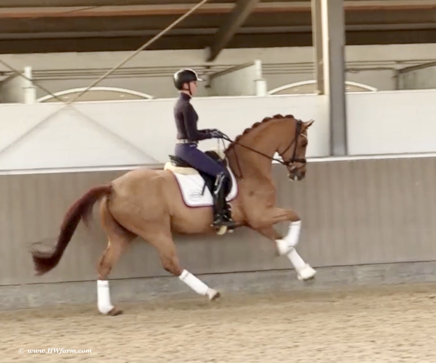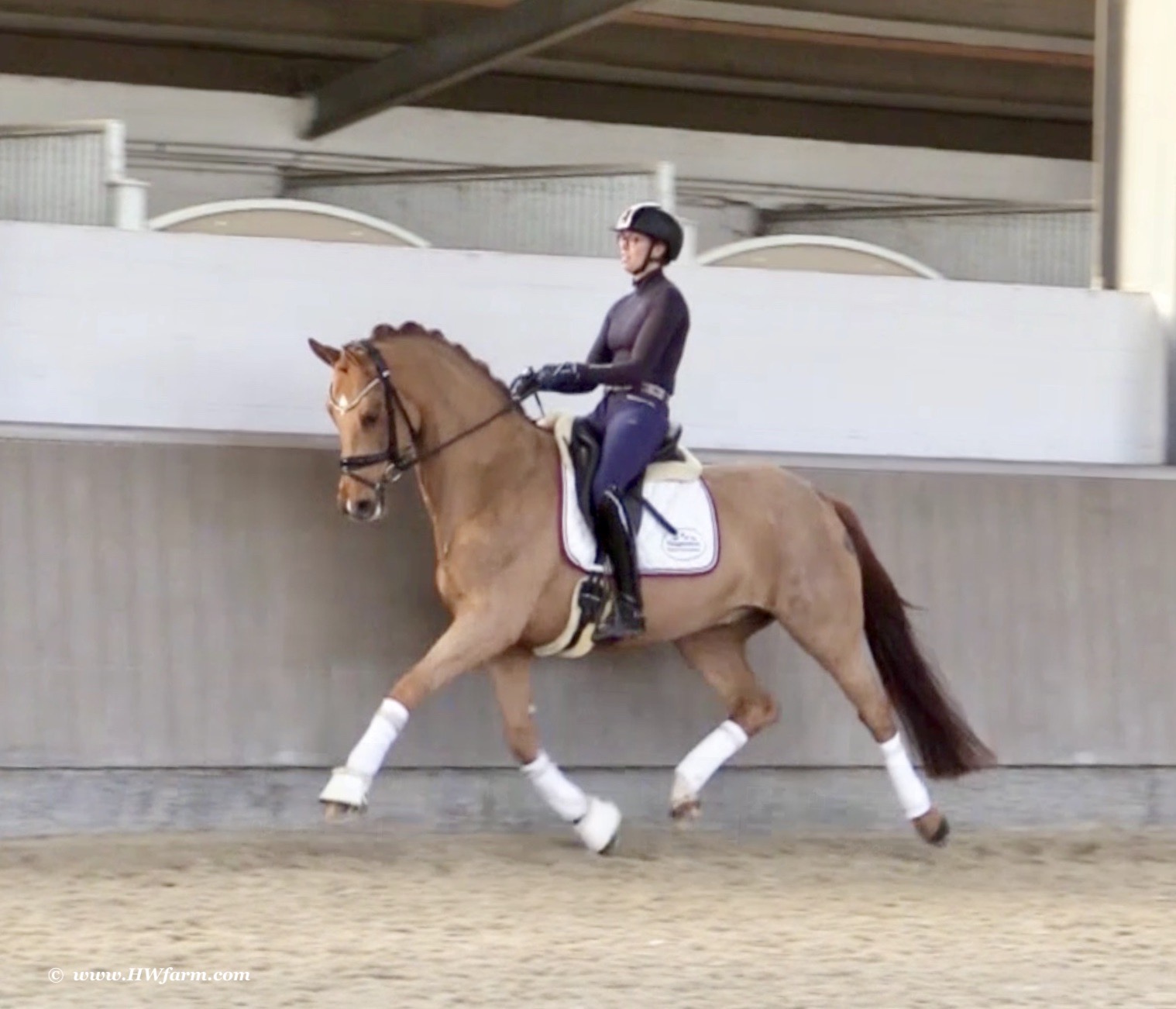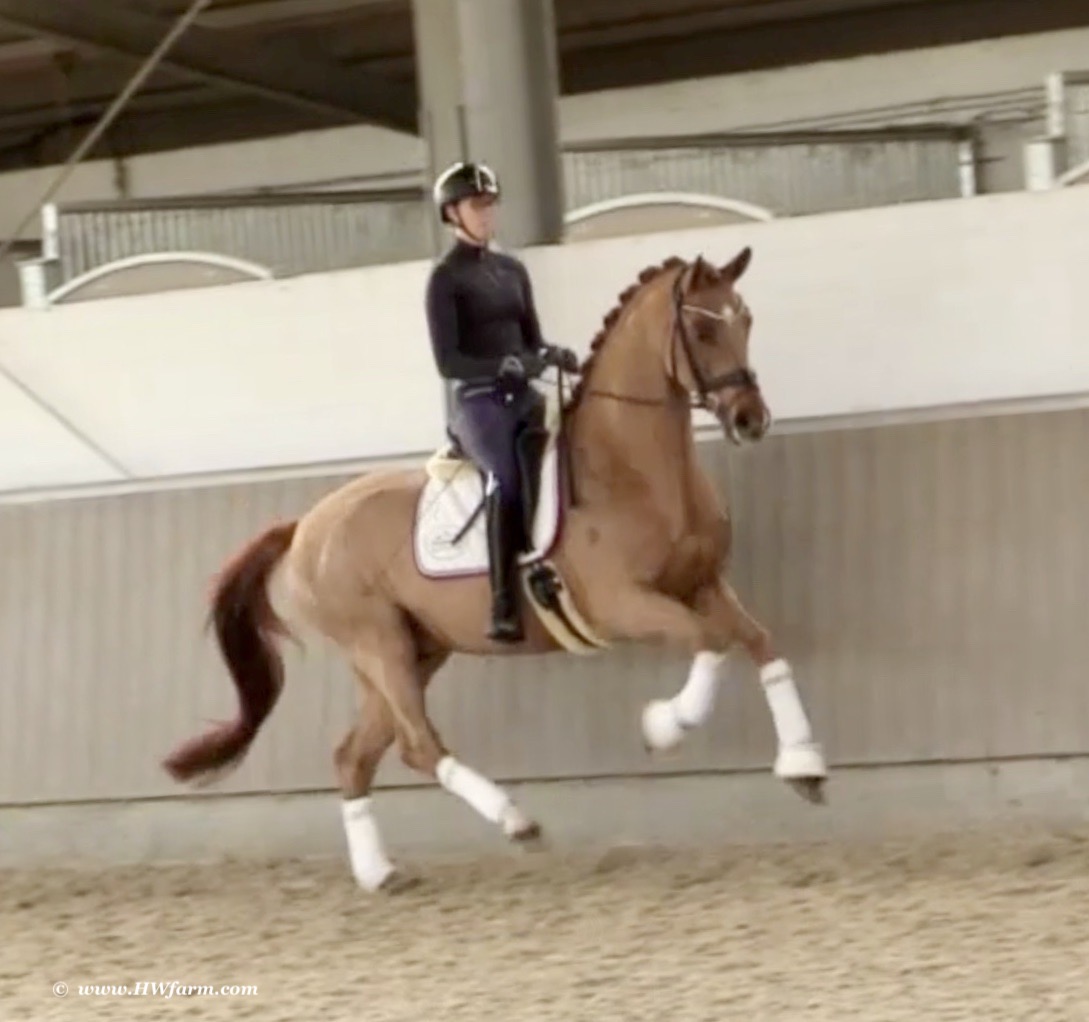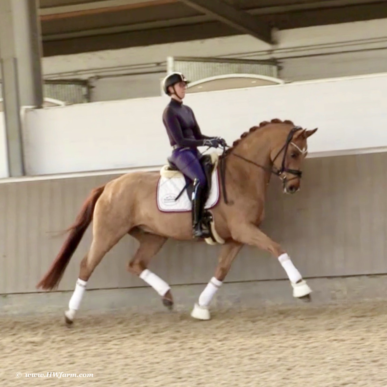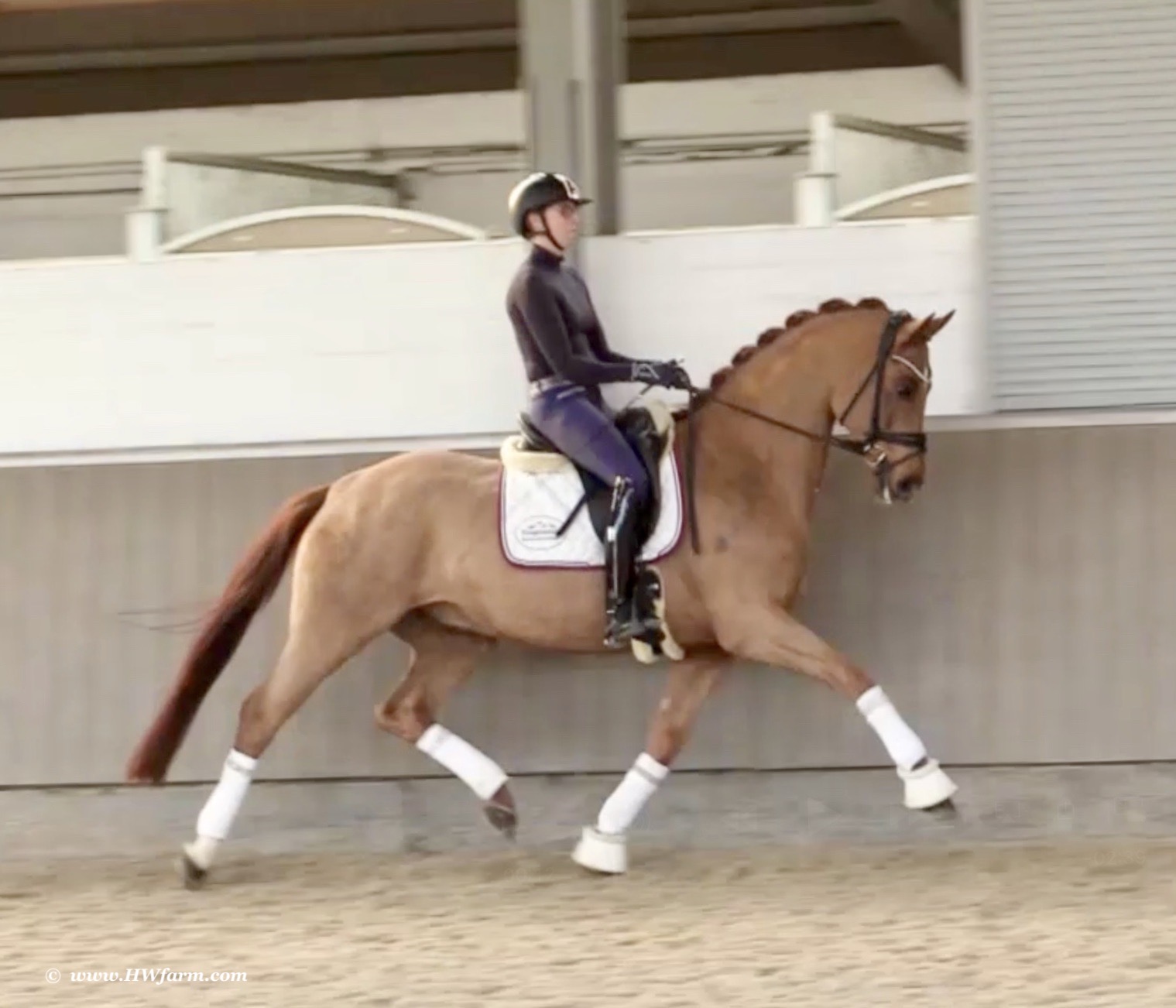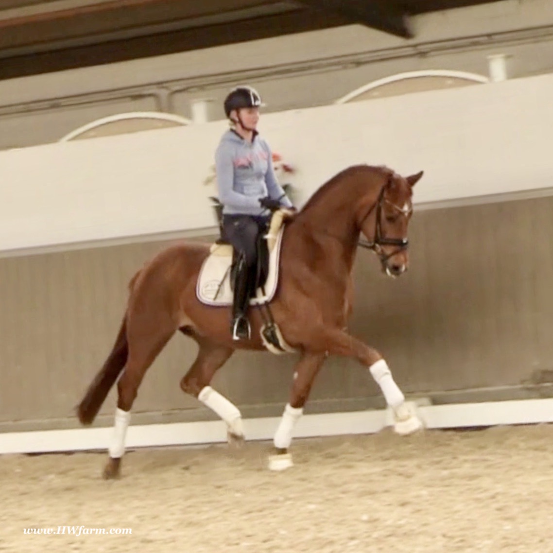 Synergy HW, chestnut Westphalian gelding, by BundesChampion, Vice World Champion Secret/BundesChampion Quaterback, born in 2018, standing approximately 164 cm or 16 and 1/2 hands. Synergy HW, by Secret, the outstanding National German 6yo Champion, plus at the World Championships for young dressage horses Ermelo 2019 - Secret - a truly exceptional horse, became Vice World Champion! Secret and his rider Jessica Lynn Thomas delivered a spectacular first round in the qualification of the five-year-old dressage horses. They received an 8.8 for the permeability, the step 9.5, the gallop 9.7, the per-spective 9.8 and even 9.9 for the trot. All in all, this gave a total result of 9.54 points and the victory was not to be taken from the two. In the final, Secret had to give up just under 0.02 points, despite a further increase. The pair won the silver medal of the five-year-old dressage horses with 9.64 points. The judge's comment: "A fantastic horse! Always in the flow, always easy. It is a pleasure to judge such a horse. " In terms of breeding, the descendants of the Secret also seamlessly linked to his father's success in 2019. Country after country was heard from his descendants. In the far north, in Schleswig-Holstein, Secret set one of the price peaks at the Glanz and Gloria auction in Delingsdorf with € 21,000. In Verden, Status Quo was one of the most sought-after youngsters at € 25,000. With the appropriate name Somebody to Dance, Secret was also among the price peaks in Münster on the occasion of the Westphalia Week. In Vechta, Serge Gainsbourg triumphed as the most expensive foal in 2019 with a hammer price of 150,000 euros. The price structure was followed by Secret Emperor, another son of the Secret. This went to Aus-tria for € 42,000. And also in the south of Germany in Nörtlingen, it was once again a subsidiary of our Secret, which was one of the top prices of the auction with a hammer price of € 25,000. The fact that his offspring are also in demand abroad was demonstrated by a filly from Secret, which took the reserve winner classification of dressage-stressed filly at the Swiss Sport Foal Championships and then found a new owner with a surcharge of 28,000 francs (about 25,000 €). In the Netherlands it was the colt with the appropriate name - One to Re-member- that became the top foal in the auction at € 22,000 The highlight of the day comes from Schwaiger and bears the appropriate name Sensation, from Secret - Fürst Grandios. A colt with a value of 9.67 (type / stature: 10, exterior / correctness: 9, movement: 10) really leaves nothing to be desired and makes words superfluous. "This is how the Austrian Horse Breeding Association described its winning foal 2019. Secret easily met the expectations placed on him. He completed his 14-day test in Schlieckau with a dressage final score of 9.5. He was able to shine again at the Bundeschampionat in Warendorf, where he was only named Vice Bundeschampion due to the rider marks. No more words need be said about father Sezuan, the celebrated triple world champion of young dressage horses. The mother line of the Secret, line 853 of the Sudette, produced numerous internationally represented performance horses. Already 38 other licensed stallions originate from this dam line. As the dam's sire, we find St. Moritz, which has only been well remembered at our station, and which, due to the fact that it was too short to work at Gestüt WM, produced a whole range of interesting, sporty and successful offspring. The maternal pedigree is rounded off by the proven successful combination of the Celler state stud stallions Rotspon, Argentan, Woermann and Lugano. Another flagship of this mother line is the Bundeschampion of five-year-old dressage horses and world champion of six-year-old dres-sage horses Lordwoods Dancing Diamond. Due to the genetic blood combination of the top class in his flagship pedigree, coupled with the high level of commitment of this rough dia-mond, we offer today's savvy dressage horse lovers, something truly special. Synergy HW's dam sire is is the BundesChampion Quaterback, it's the same dam who produced the BundesFoalChampion Ferdinand HW and She's Magic HW. Quaterback is a stallion that seems like he could only come from another planet - with his light-footed, brilliant movement and perfect cadence, all eyes become riveted on Quaterback when he appears. his stallion career by being named Champion of his licensing in Neustadt/Dosse in 2005. In 2006, after the Bundeschampionate, he went on to win his 30 day test at Neustadt/Dosse with outstanding scores: Int. 9.0 Trot 9.25 Canter 9.75 Walk 7.63 Riding qualities 9.75 Jumping 7.75 He was the radiant Bundeschampion of the three year old riding horses in 2006 with the highest scores for his trot and canter. The test riders in Warendorf even gave him this dream score of 10.0. Prior to this test, he had won several tests for young riding horses. He was also the winner of his 30-day test with a final score of 9.14 in dressage, an 8.43 for jumping and an overall score of 8.88. As if it were not enough to have unbelievably dynamic movement, he was also blessed with an outstanding type. Quaterback comes from one of the most successful mare lines of modern day. His dam Passionata is a half-sister of the unforgettable World Champion and double Bundeschampion, Poetin. Her full brothers Samba Hit I , Samba Hit III to V put on convincing presentations at the Bundeschampionate. Samba Hit I was also a finalist in the 2006 Nürnberg Burgpokal and the sire of Samba's Diamond who became the Champion Stallion of the licensing in Berlin-Brandenburg and Sachsen-Anhalt that same year. Quaterback's successful advanced (S) level sire Quaterman also participated in several Bundeschampionats and is deemed one of the best sires for passing on good movements in the new German States. The grandsire Quando-Quando took 15th place at the World Championships in Aachen in 2006 under Kristy Oatle