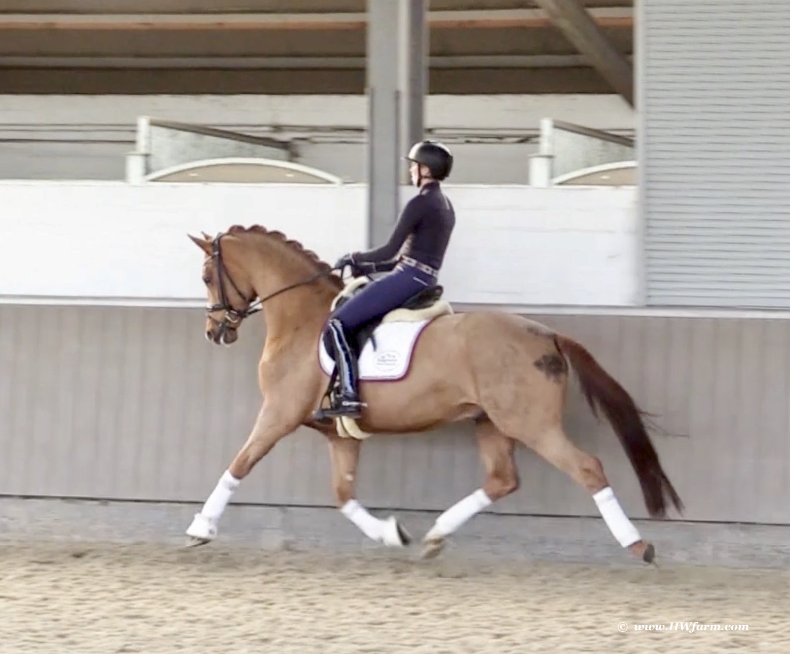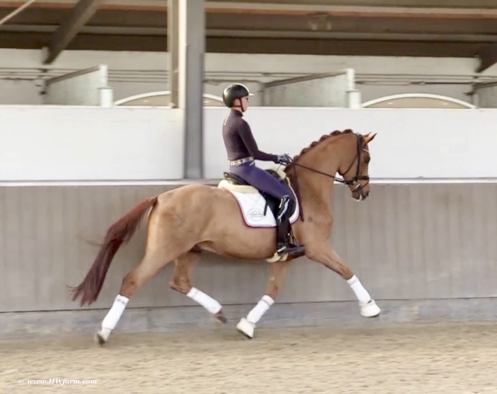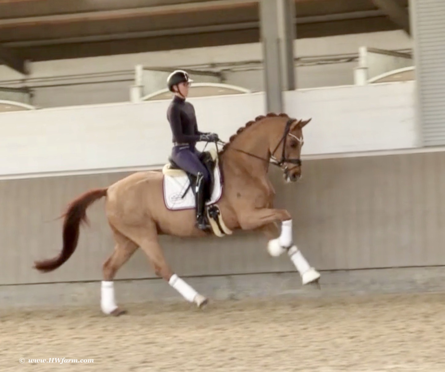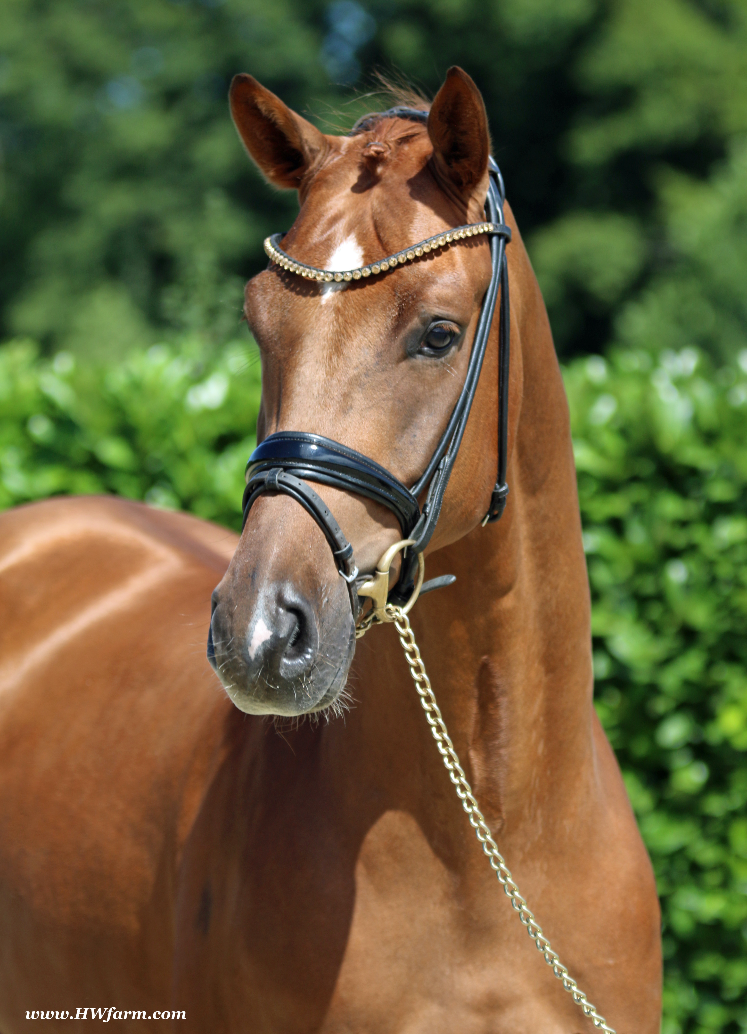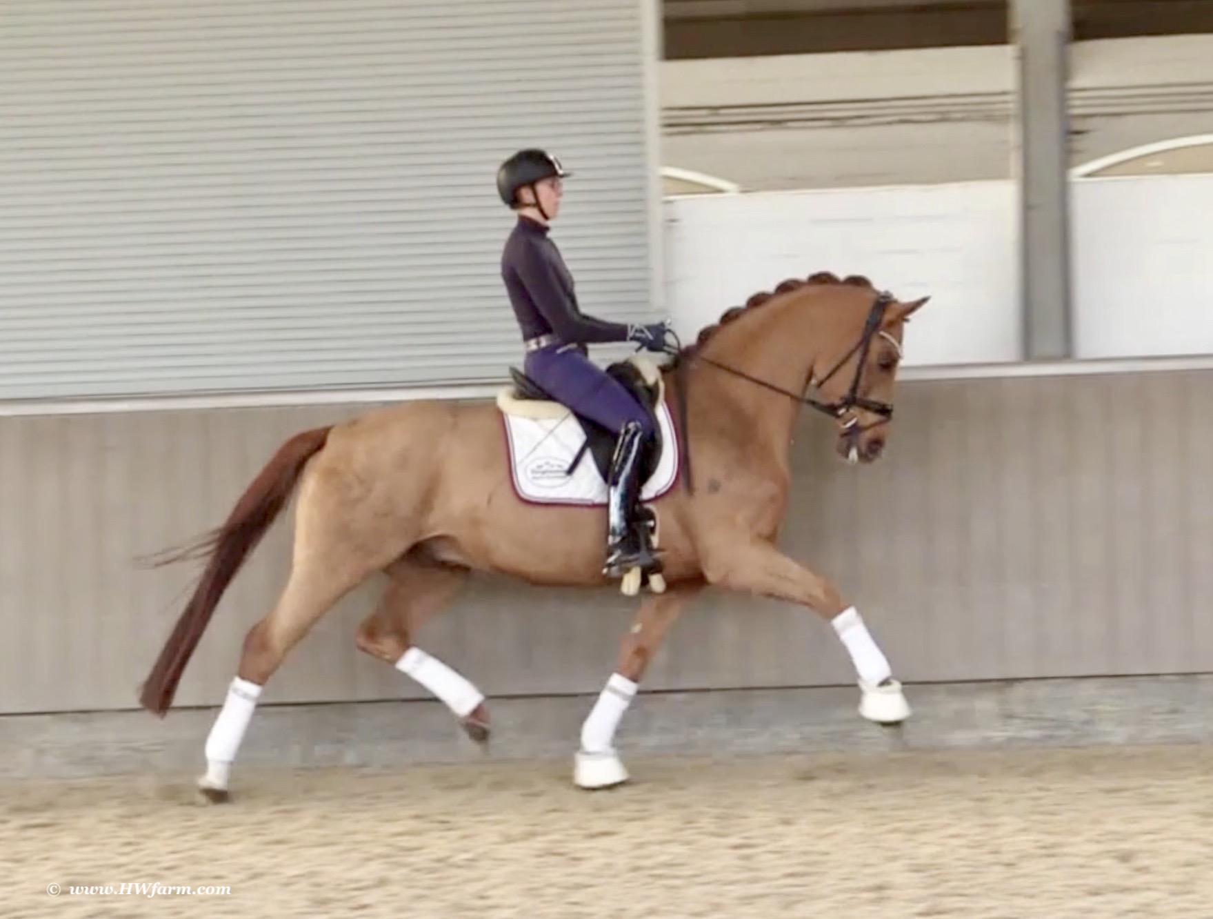 Synergy HW, chestnut Westphalian gelding, by BundesChampion, Vice World Champion Secret/BundesChampion Quaterback, born in 2018, standing approximately 164 cm or 16 and 1/2 hands. Synergy HW, by Secret, the outstanding National German 6yo Champion, plus at the World Championships for young dressage horses Ermelo 2019 - Secret - a truly exceptional horse, became Vice World Champion! Secret and his rider Jessica Lynn Thomas delivered a spectacular first round in the qualification of the five-year-old dressage horses. They received an 8.8 for the permeability, the step 9.5, the gallop 9.7, the per-spective 9.8 and even 9.9 for the trot. All in all, this gave a total result of 9.54 points and the victory was not to be taken from the two. In the final, Secret had to give up just under 0.02 points, despite a further increase. The pair won the silver medal of the five-year-old dressage horses with 9.64 points. The judge's comment: "A fantastic horse! Always in the flow, always easy. It is a pleasure to judge such a horse. " In terms of breeding, the descendants of the Secret also seamlessly linked to his father's success in 2019. Country after country was heard from his descendants. In the far north, in Schleswig-Holstein, Secret set one of the price peaks at the Glanz and Gloria auction in Delingsdorf with € 21,000. In Verden, Status Quo was one of the most sought-after youngsters at € 25,000. With the appropriate name Somebody to Dance, Secret was also among the price peaks in Münster on the occasion of the Westphalia Week. In Vechta, Serge Gainsbourg triumphed as the most expensive foal in 2019 with a hammer price of 150,000 euros. The price structure was followed by Secret Emperor, another son of the Secret. This went to Aus-tria for € 42,000. And also in the south of Germany in Nörtlingen, it was once again a subsidiary of our Secret, which was one of the top prices of the auction with a hammer price of € 25,000. The fact that his offspring are also in demand abroad was demonstrated by a filly from Secret, which took the reserve winner classification of dressage-stressed filly at the Swiss Sport Foal Championships and then found a new owner with a surcharge of 28,000 francs (about 25,000 €). In the Netherlands it was the colt with the appropriate name - One to Re-member- that became the top foal in the auction at € 22,000 The highlight of the day comes from Schwaiger and bears the appropriate name Sensation, from Secret - Fürst Grandios. A colt with a value of 9.67 (type / stature: 10, exterior / correctness: 9, movement: 10) really leaves nothing to be desired and makes words superfluous. "This is how the Austrian Horse Breeding Association described its winning foal 2019. Secret easily met the expectations placed on him. He completed his 14-day test in Schlieckau with a dressage final score of 9.5. He was able to shine again at the Bundeschampionat in Warendorf, where he was only named Vice Bundeschampion due to the rider marks. No more words need be said about father Sezuan, the celebrated triple world champion of young dressage horses. The mother line of the Secret, line 853 of the Sudette, produced numerous internationally represented performance horses. Already 38 other licensed stallions originate from this dam line. As the dam's sire, we find St. Moritz, which has only been well remembered at our station, and which, due to the fact that it was too short to work at Gestüt WM, produced a whole range of interesting, sporty and successful offspring. The maternal pedigree is rounded off by the proven successful combination of the Celler state stud stallions Rotspon, Argentan, Woermann and Lugano. Another flagship of this mother line is the Bundeschampion of five-year-old dressage horses and world champion of six-year-old dres-sage horses Lordwoods Dancing Diamond. Due to the genetic blood combination of the top class in his flagship pedigree, coupled with the high level of commitment of this rough dia-mond, we offer today's savvy dressage horse lovers, something truly special. Synergy HW's dam sire is is the BundesChampion Quaterback, it's the same dam who produced the BundesFoalChampion Ferdinand HW and She's Magic HW. Quaterback is a stallion that seems like he could only come from another planet - with his light-footed, brilliant movement and perfect cadence, all eyes become riveted on Quaterback when he appears. his stallion career by being named Champion of his licensing in Neustadt/Dosse in 2005. In 2006, after the Bundeschampionate, he went on to win his 30 day test at Neustadt/Dosse with outstanding scores: Int. 9.0 Trot 9.25 Canter 9.75 Walk 7.63 Riding qualities 9.75 Jumping 7.75 He was the radiant Bundeschampion of the three year old riding horses in 2006 with the highest scores for his trot and canter. The test riders in Warendorf even gave him this dream score of 10.0. Prior to this test, he had won several tests for young riding horses. He was also the winner of his 30-day test with a final score of 9.14 in dressage, an 8.43 for jumping and an overall score of 8.88. As if it were not enough to have unbelievably dynamic movement, he was also blessed with an outstanding type. Quaterback comes from one of the most successful mare lines of modern day. His dam Passionata is a half-sister of the unforgettable World Champion and double Bundeschampion, Poetin. Her full brothers Samba Hit I , Samba Hit III to V put on convincing presentations at the Bundeschampionate. Samba Hit I was also a finalist in the 2006 Nürnberg Burgpokal and the sire of Samba's Diamond who became the Champion Stallion of the licensing in Berlin-Brandenburg and Sachsen-Anhalt that same year. Quaterback's successful advanced (S) level sire Quaterman also participated in several Bundeschampionats and is deemed one of the best sires for passing on good movements in the new German States. The grandsire Quando-Quando took 15th place at the World Championships in Aachen in 2006 under Kristy Oatle