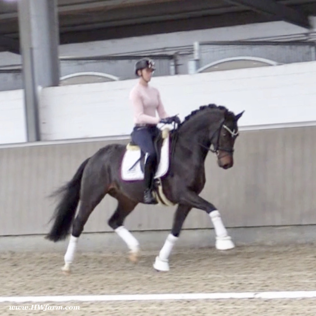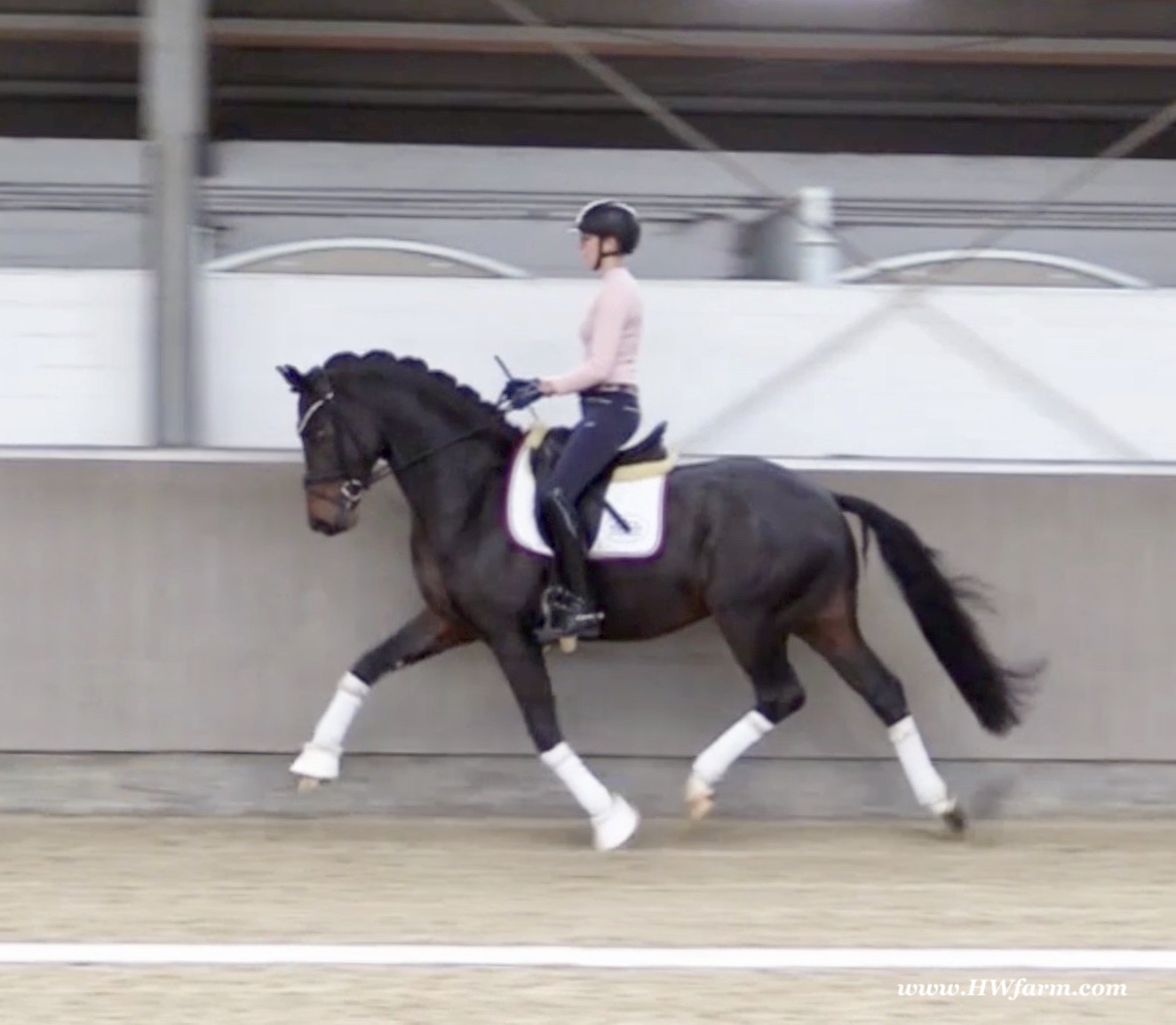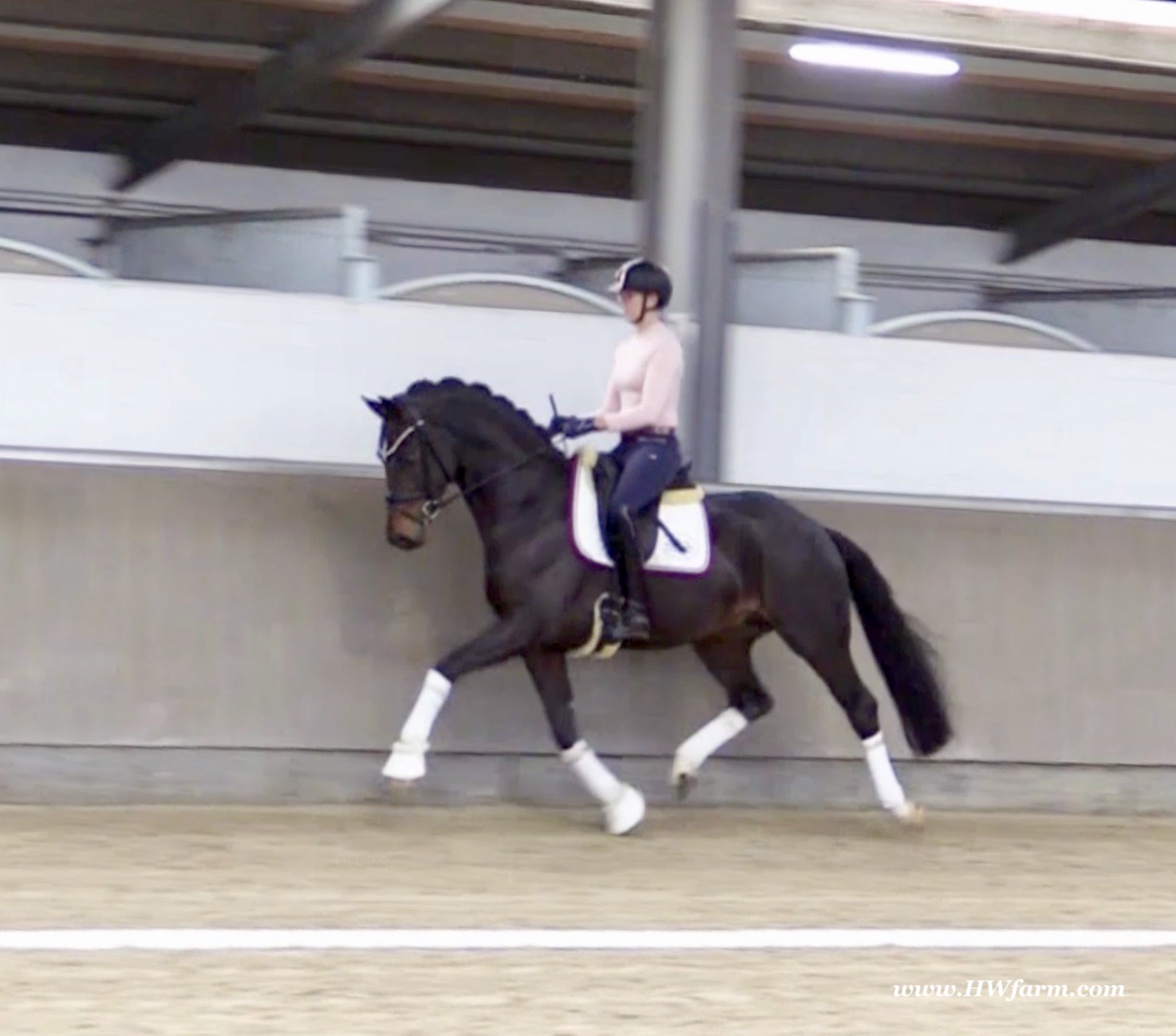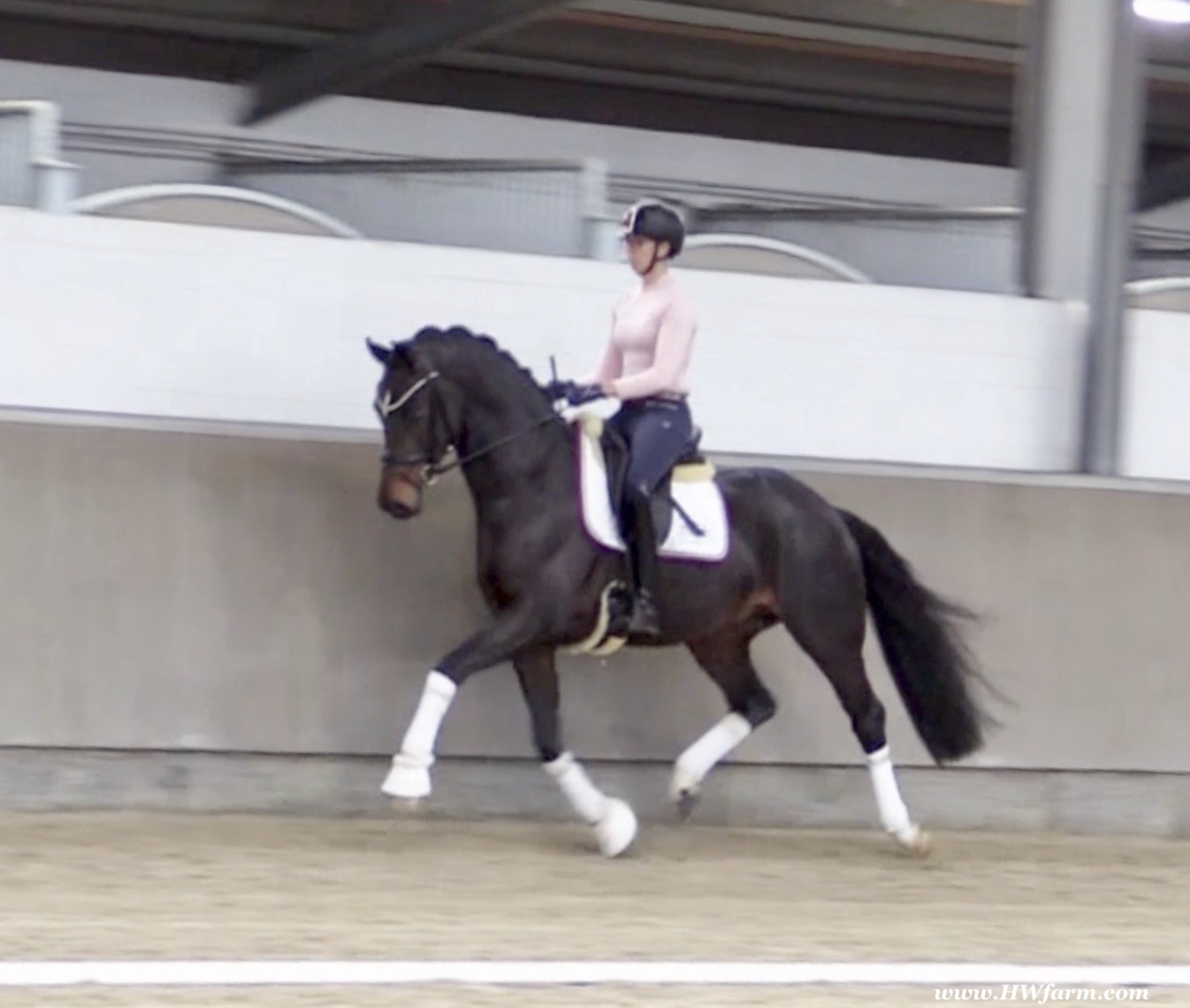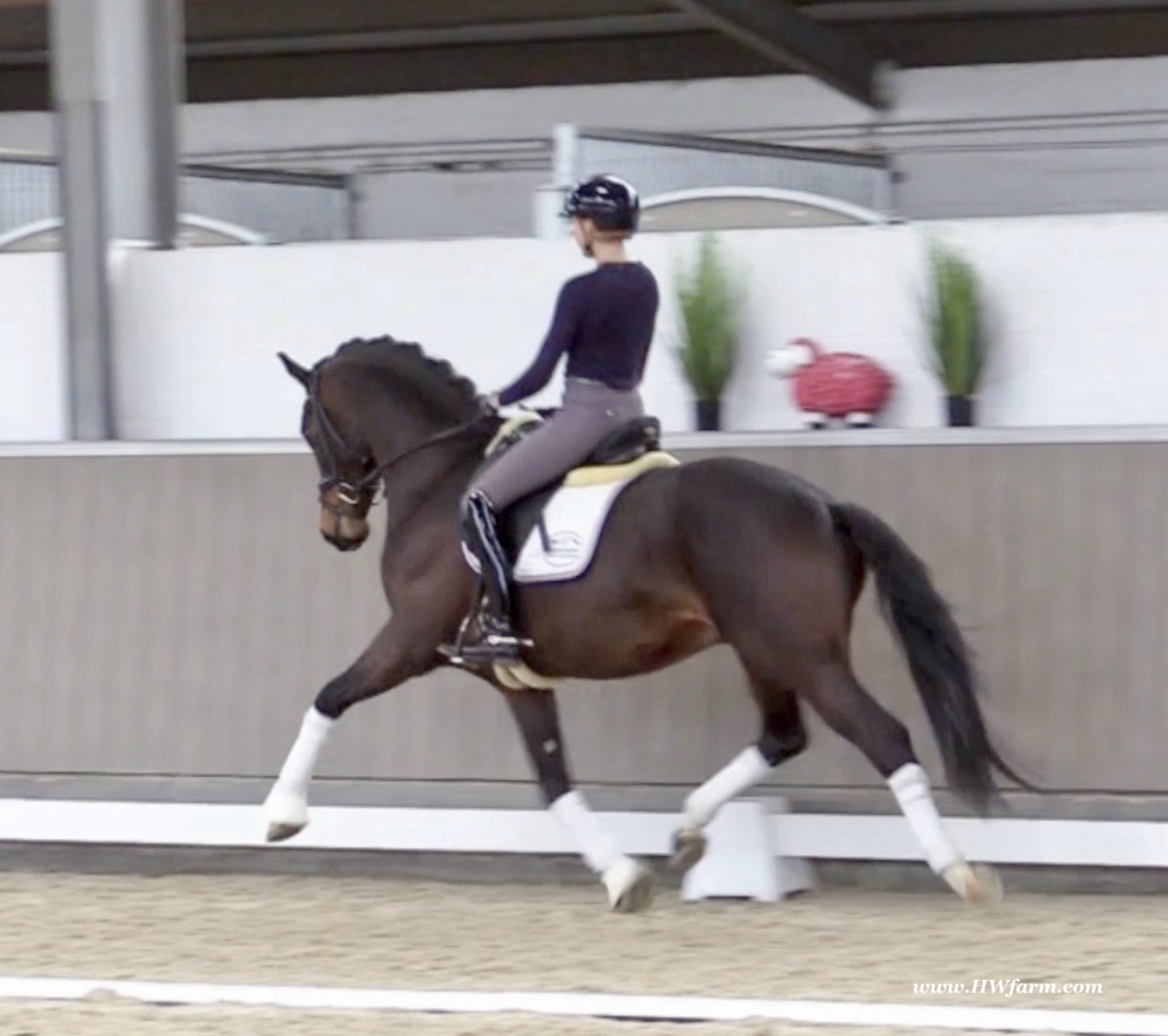 Valentin HW, bay Westphalian gelding, by Valverde/Fürstenball, born in 2019, standing approximately 164 cm or 16 and 3/4 hands. Valentin HW is sired by the famous Valverde: Valverde NRW added to his collection of titles last year with his third triumph at the Westphalian Championships. With his trainer Eva Möller, he received a 9.0 for each of his three gaits and the overall impression! At the German Championships, he convincingly won the qualifier for the final (9.0) and also received high individual scores in the final: for the "super energetic trot, which is incredibly powerful, dynamic and uphill" and for the walk "with fantastic rhythm and stretch" each a 9.0. Commentator Dr. Dietrich Plewa also praised Valverde's "canter with three clear beats and flying changes with a clear jump through the body and a lot of expression" and attested to Valverde's "outstanding talent". He finished fourth with an overall score of 8.5 against very strong competition. He was then selected to represent Germany at the World Championships for young dressage horses, however, this championship could not take place due to the coronavirus pandemic. Valverdestarted his career in 2016 as Westphalian Champion Stallion and the following year completed his stallion performance test in Denmark as the third best dressage stallion with a total score of 9.23 (10 for walk, character and conformation). Valverde then won the gold medal at the Westphalian Championships and the silver medal at the German Championships for four-year-olds. In 2019, he was once again Westphalian Champion (overall 9.22, walk 10), he narrowly missed the medal places and came fourth at the World Championships for young dressage horses and won the German Championships with an overall score of 9.3. Valverde produced numerous show winners and coveted auction foals from his first crops of foals. Victor Hugo was auctioned for 36,500 Euros in Vechta. Valuable became top price of the 3rd Helgstrand-Schockemöhle Online Auction, selling for 79,000 Euros. His sire Vitalis was Champion Foal in the Netherlands in 2007, Reserve Champion of the NRW licensing in 2009, winner of the dressage index of his stallion performance test in 2010, placed at the World Championships and Pavo Cup final in 2012, Champion in the USA and again qualified for the World Championships with a record number of points in 2013 and victorious in the International Small Tour at only seven years old in 2014. He came back to Germany and, in 2016, ridden by Isabel Freese, he won the Burg Cup Final in Frankfurt and the "Stallion of the year" competition at Inter I level at the World Championships in Ermelo/NED. His dam St.Pr.St. Amicella was successful up to Inter I. His dam's sire Ampère, KWPN Champion Stallion and champion of his stallion performance test, has produced over 60 stallions approved for breeding in the Netherlands and in Germany, including the Grand Prix winner Abegglen FH NRW/Victoria Max-Theurer/AUT, the Louisdor Prize finalist Aperol/Emma Kanerva/FIN, First Ampère, who came sixth at the World Championships for young dressage horses and our KWPN Champion Stallion, Franklin. He has produced over 50 state premium mares, including the Westphalian Champion Mare Anky. Numerous auction top prices have also been recorded. His grand-dam St.Pr.St. First Fina is the half-sister of Enrico (by Ehrentusch), who was successful in Grand Prix, and of further successful dressage horses. She produced the licensed stallion Mister Diamond (by Sir Donnerhall I). First Final, Reserve Champion of the Oldenburg licensing in 2005, who appears in the third generation, combines the dressage World Champion Fürst Heinrich and the legendary stallion Argentinus in his pedigree. He was successful up to advanced (S) level. The half-blood stallion Laomedon, Delphi, who was successful in Grand Prix, and Der Clou, who won his stallion performance test, complete his pedigree in the most excellent way. Valentin HW's dam sire is the stunning Fürstenball, who produces world-class horses, from foal shows to the Olympic arena. Fürstenball's offspring are always among the best. Hardly any stallion can offer such continuity in hereditary performance. He has produced 90 licensed stallions, around 170 premium mares and over 80 horses successful at advanced (S) level, led by Heiline's Danciera/Carina Cassøe Krüth/DEN, placed fourth by team and seventh individually at the Olympics, as well as five German Champions, amongst them Feine Bella, who was also unbeatable in the Westphalian Championships and at her mare show, and numerous fantastic auction horses, such as Fürst Bayram OLD/Frederic Wandres, 1.7 million Euro price sensation of the P.S.I. Auction 2021, reigning Oldenburg Regional Champion and eleventh at the German Championships for young dressage horses. Torveslettens Fifty-Fifty/Ekaterina Podlytkina/RUS, Friesen Ball/Andrea Timpe/GER, Filigrano Marone/Thomas Wagner/GER, placed eleventh in the Louisdor Prize final, Four Seasons FRH/Alexa Westendarp/GER, double European Young Riders Championship gold medallist, and First Class/Maike Mende/GER, winner of the Oldenburg Derby Dressage Cup, have already established themselves at Grand Prix level. Frau Holle was silver medallist at the German Young Riders Championship with Jana Schrödter and competed in the Burg Cup final. ZINQ Farlana FH won the bronze medal at the German Junior Championships with Lucie-Anouk Baumgürtel and won the International Tour in Le Mans/FRA. Fürst Sinclair/Elke Philipp/GER was placed fourth at the para-equestrian dressage World Championships in Tryon/USA and at the European Championships in Rotterdam/NED. Fürstenball has produced 90 licensed stallions, including Fürsten-Look/Isabel Freese/NOR: our Champion Stallion and German Champion, who came third in the Burg Cup, Fürst Zonik PS: our Champion Stallion, Fürst Fabrice: Champion Stallion placed third at the Regional Championships, Follow Me OLD: Oldenburg Champion Stallion, 