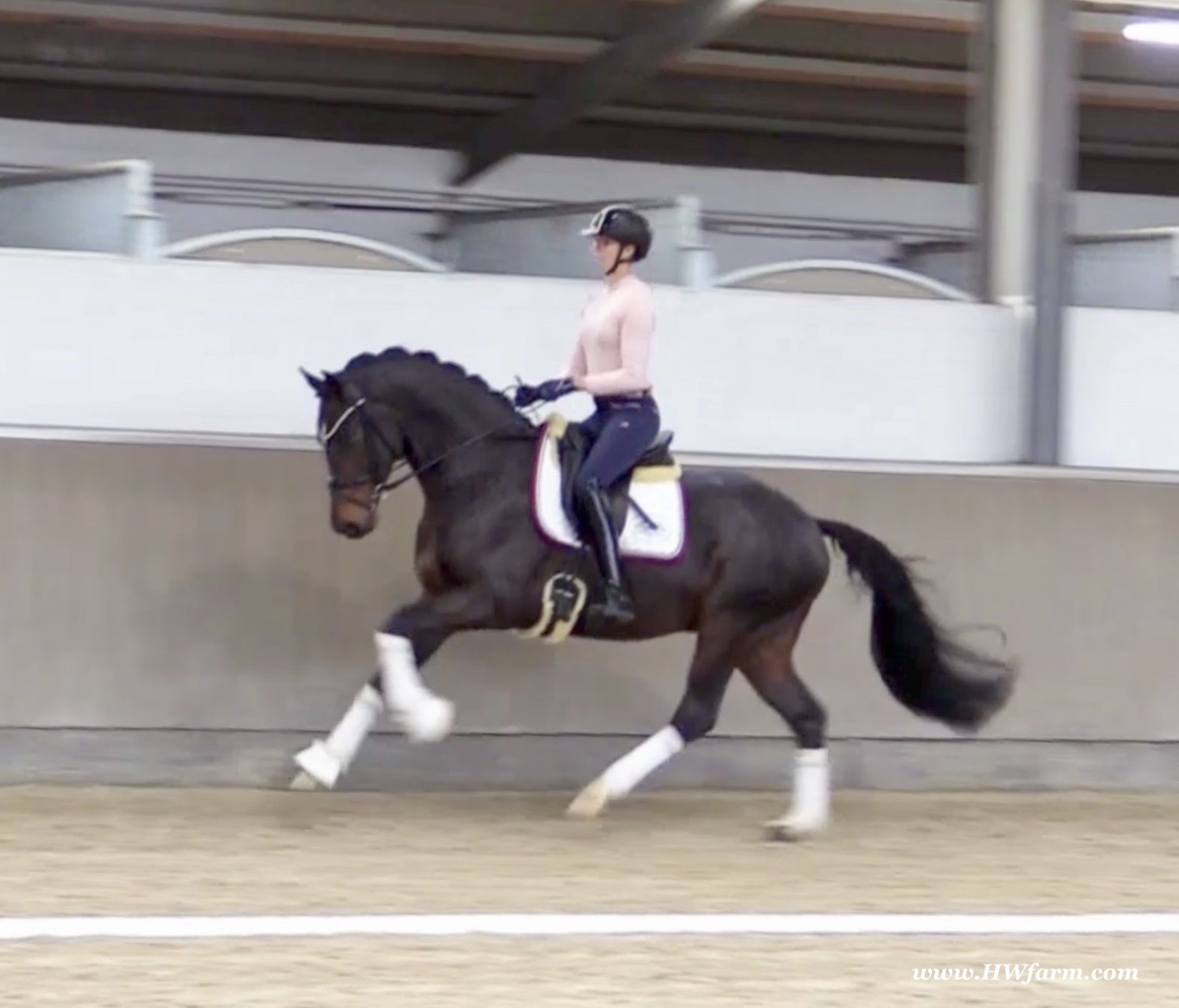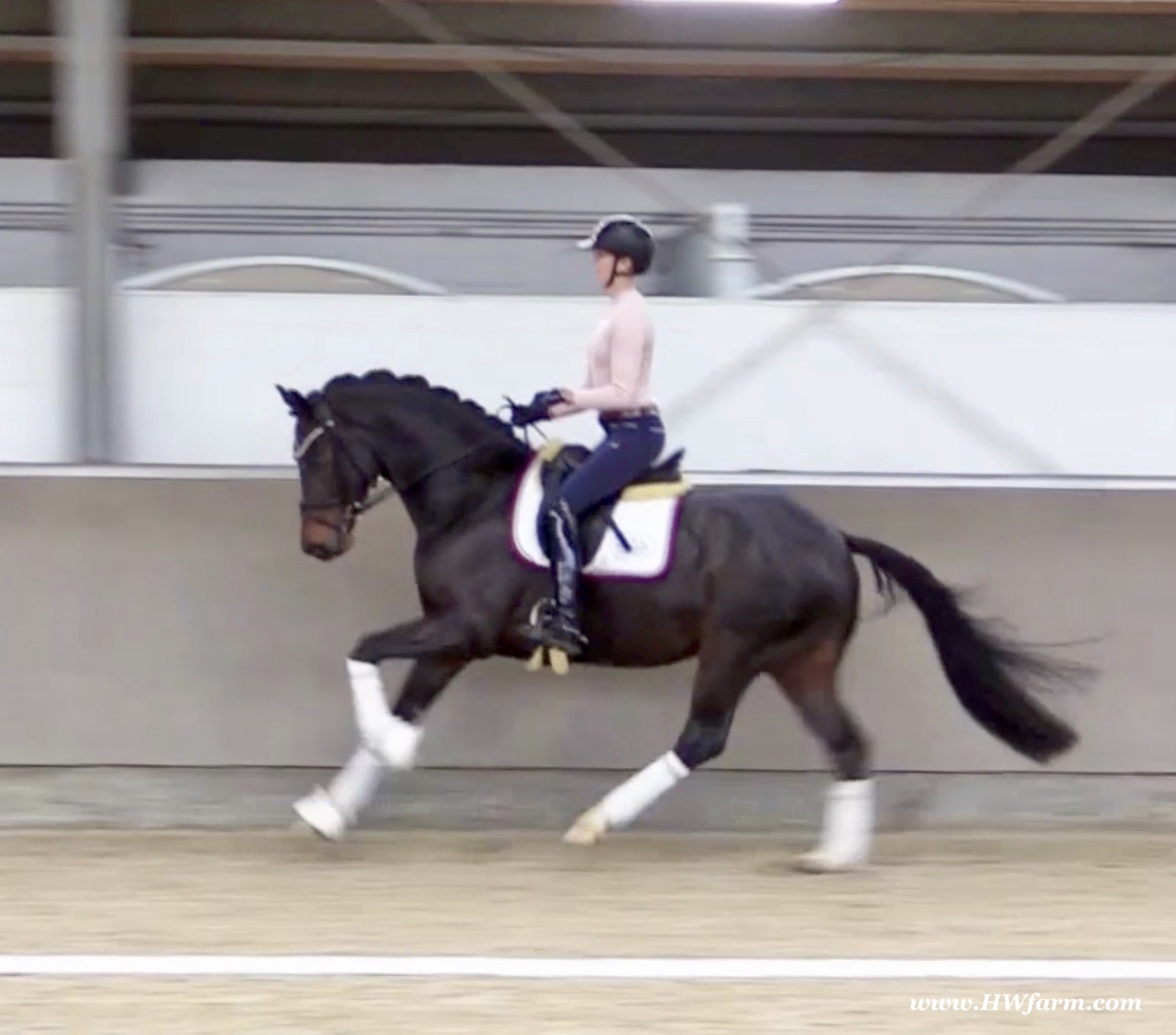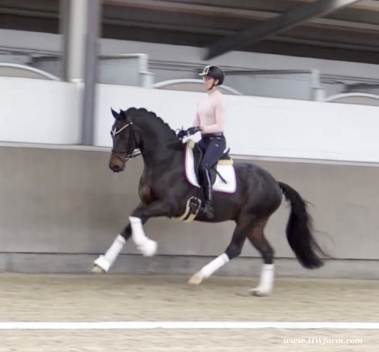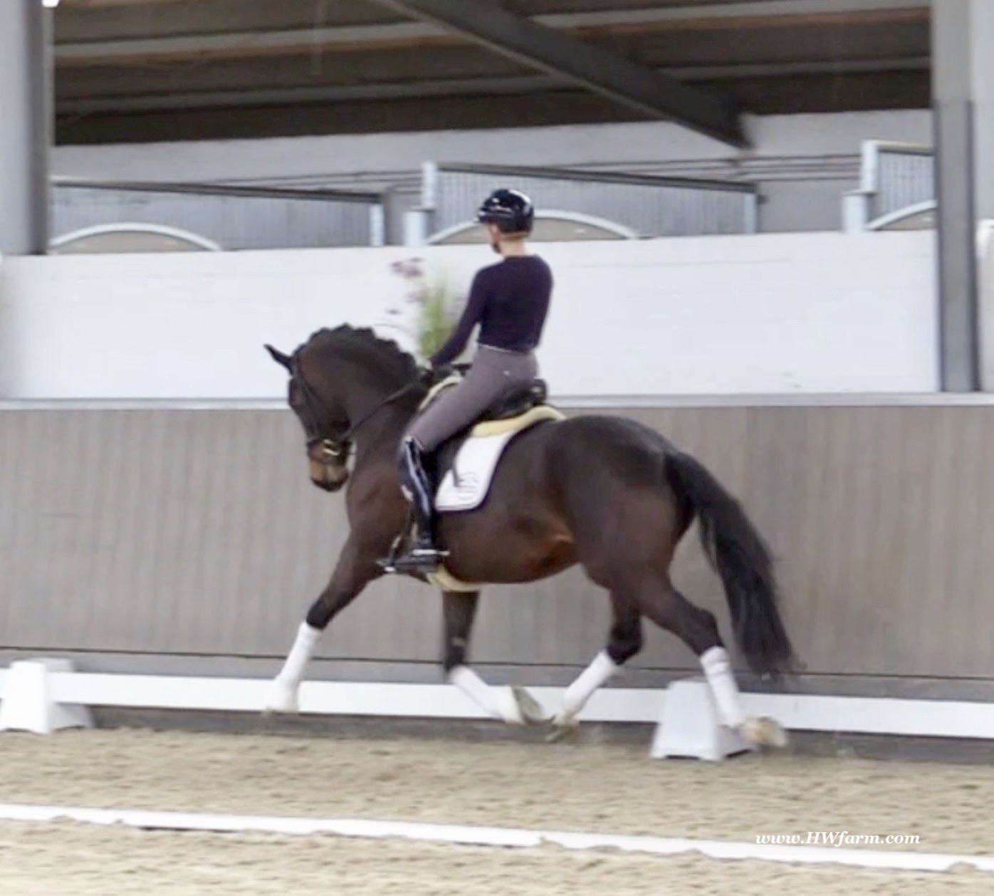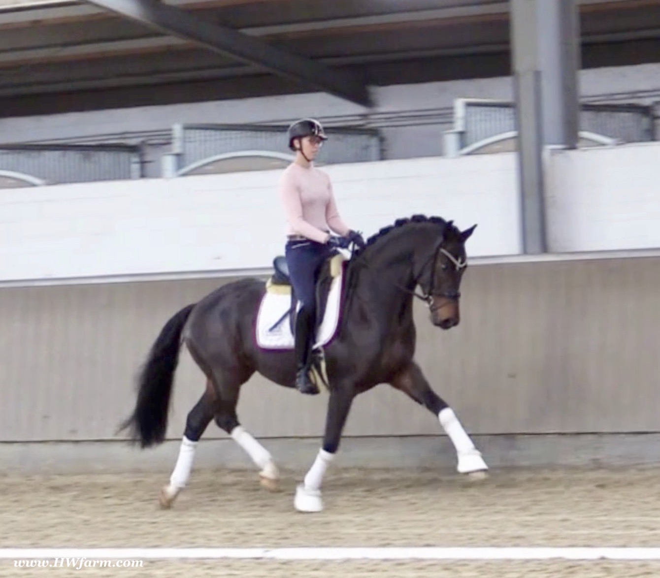 Valentin HW, bay Westphalian gelding, by Valverde/Fürstenball, born in 2019, standing approximately 164 cm or 16 and 3/4 hands. Valentin HW is sired by the famous Valverde: Valverde NRW added to his collection of titles last year with his third triumph at the Westphalian Championships. With his trainer Eva Möller, he received a 9.0 for each of his three gaits and the overall impression! At the German Championships, he convincingly won the qualifier for the final (9.0) and also received high individual scores in the final: for the "super energetic trot, which is incredibly powerful, dynamic and uphill" and for the walk "with fantastic rhythm and stretch" each a 9.0. Commentator Dr. Dietrich Plewa also praised Valverde's "canter with three clear beats and flying changes with a clear jump through the body and a lot of expression" and attested to Valverde's "outstanding talent". He finished fourth with an overall score of 8.5 against very strong competition. He was then selected to represent Germany at the World Championships for young dressage horses, however, this championship could not take place due to the coronavirus pandemic. Valverdestarted his career in 2016 as Westphalian Champion Stallion and the following year completed his stallion performance test in Denmark as the third best dressage stallion with a total score of 9.23 (10 for walk, character and conformation). Valverde then won the gold medal at the Westphalian Championships and the silver medal at the German Championships for four-year-olds. In 2019, he was once again Westphalian Champion (overall 9.22, walk 10), he narrowly missed the medal places and came fourth at the World Championships for young dressage horses and won the German Championships with an overall score of 9.3. Valverde produced numerous show winners and coveted auction foals from his first crops of foals. Victor Hugo was auctioned for 36,500 Euros in Vechta. Valuable became top price of the 3rd Helgstrand-Schockemöhle Online Auction, selling for 79,000 Euros. His sire Vitalis was Champion Foal in the Netherlands in 2007, Reserve Champion of the NRW licensing in 2009, winner of the dressage index of his stallion performance test in 2010, placed at the World Championships and Pavo Cup final in 2012, Champion in the USA and again qualified for the World Championships with a record number of points in 2013 and victorious in the International Small Tour at only seven years old in 2014. He came back to Germany and, in 2016, ridden by Isabel Freese, he won the Burg Cup Final in Frankfurt and the "Stallion of the year" competition at Inter I level at the World Championships in Ermelo/NED. His dam St.Pr.St. Amicella was successful up to Inter I. His dam's sire Ampère, KWPN Champion Stallion and champion of his stallion performance test, has produced over 60 stallions approved for breeding in the Netherlands and in Germany, including the Grand Prix winner Abegglen FH NRW/Victoria Max-Theurer/AUT, the Louisdor Prize finalist Aperol/Emma Kanerva/FIN, First Ampère, who came sixth at the World Championships for young dressage horses and our KWPN Champion Stallion, Franklin. He has produced over 50 state premium mares, including the Westphalian Champion Mare Anky. Numerous auction top prices have also been recorded. His grand-dam St.Pr.St. First Fina is the half-sister of Enrico (by Ehrentusch), who was successful in Grand Prix, and of further successful dressage horses. She produced the licensed stallion Mister Diamond (by Sir Donnerhall I). First Final, Reserve Champion of the Oldenburg licensing in 2005, who appears in the third generation, combines the dressage World Champion Fürst Heinrich and the legendary stallion Argentinus in his pedigree. He was successful up to advanced (S) level. The half-blood stallion Laomedon, Delphi, who was successful in Grand Prix, and Der Clou, who won his stallion performance test, complete his pedigree in the most excellent way. Valentin HW's dam sire is the stunning Fürstenball, who produces world-class horses, from foal shows to the Olympic arena. Fürstenball's offspring are always among the best. Hardly any stallion can offer such continuity in hereditary performance. He has produced 90 licensed stallions, around 170 premium mares and over 80 horses successful at advanced (S) level, led by Heiline's Danciera/Carina Cassøe Krüth/DEN, placed fourth by team and seventh individually at the Olympics, as well as five German Champions, amongst them Feine Bella, who was also unbeatable in the Westphalian Championships and at her mare show, and numerous fantastic auction horses, such as Fürst Bayram OLD/Frederic Wandres, 1.7 million Euro price sensation of the P.S.I. Auction 2021, reigning Oldenburg Regional Champion and eleventh at the German Championships for young dressage horses. Torveslettens Fifty-Fifty/Ekaterina Podlytkina/RUS, Friesen Ball/Andrea Timpe/GER, Filigrano Marone/Thomas Wagner/GER, placed eleventh in the Louisdor Prize final, Four Seasons FRH/Alexa Westendarp/GER, double European Young Riders Championship gold medallist, and First Class/Maike Mende/GER, winner of the Oldenburg Derby Dressage Cup, have already established themselves at Grand Prix level. Frau Holle was silver medallist at the German Young Riders Championship with Jana Schrödter and competed in the Burg Cup final. ZINQ Farlana FH won the bronze medal at the German Junior Championships with Lucie-Anouk Baumgürtel and won the International Tour in Le Mans/FRA. Fürst Sinclair/Elke Philipp/GER was placed fourth at the para-equestrian dressage World Championships in Tryon/USA and at the European Championships in Rotterdam/NED. Fürstenball has produced 90 licensed stallions, including Fürsten-Look/Isabel Freese/NOR: our Champion Stallion and German Champion, who came third in the Burg Cup, Fürst Zonik PS: our Champion Stallion, Fürst Fabrice: Champion Stallion placed third at the Regional Championships, Follow Me OLD: Oldenburg Champion Stallion, 