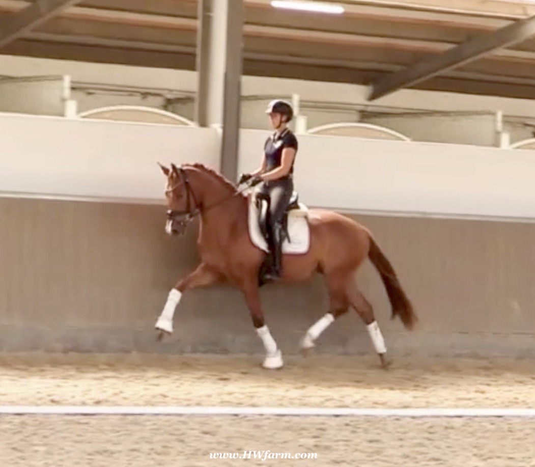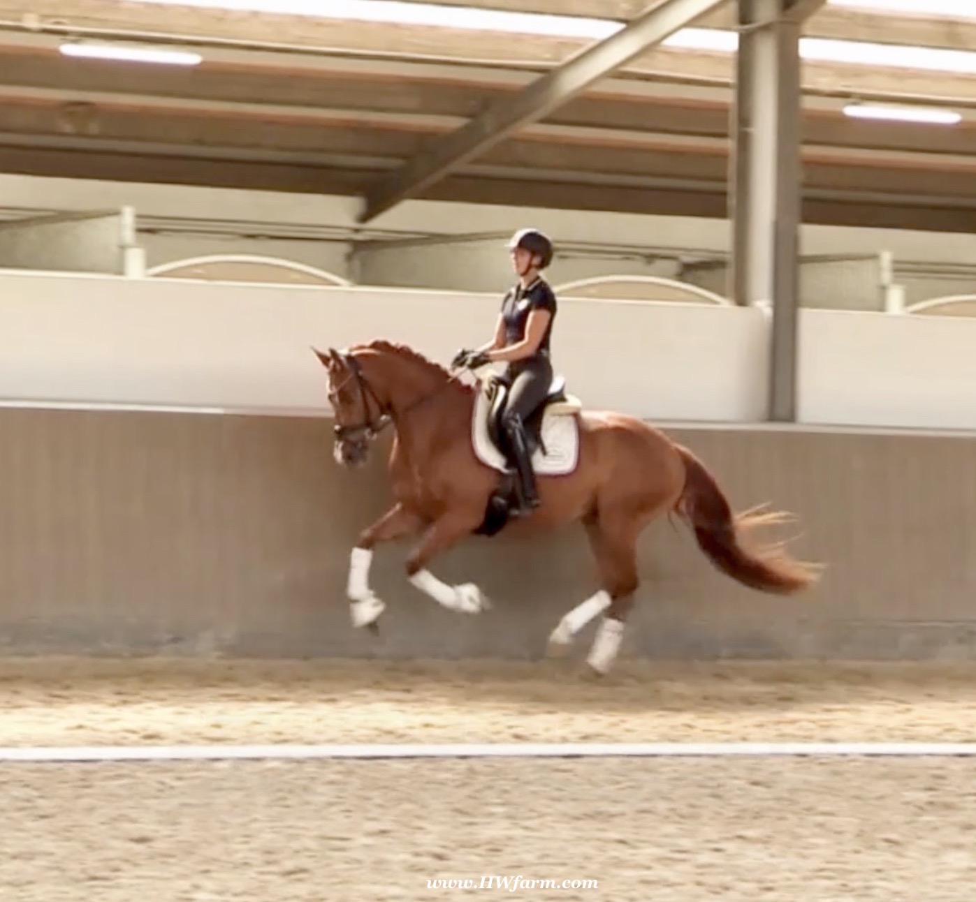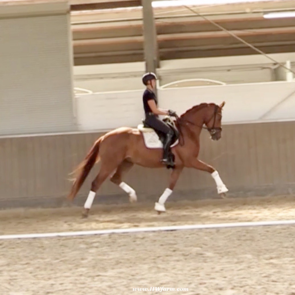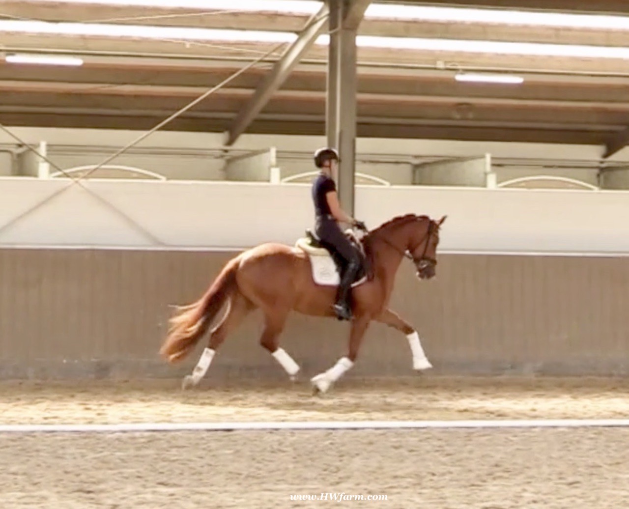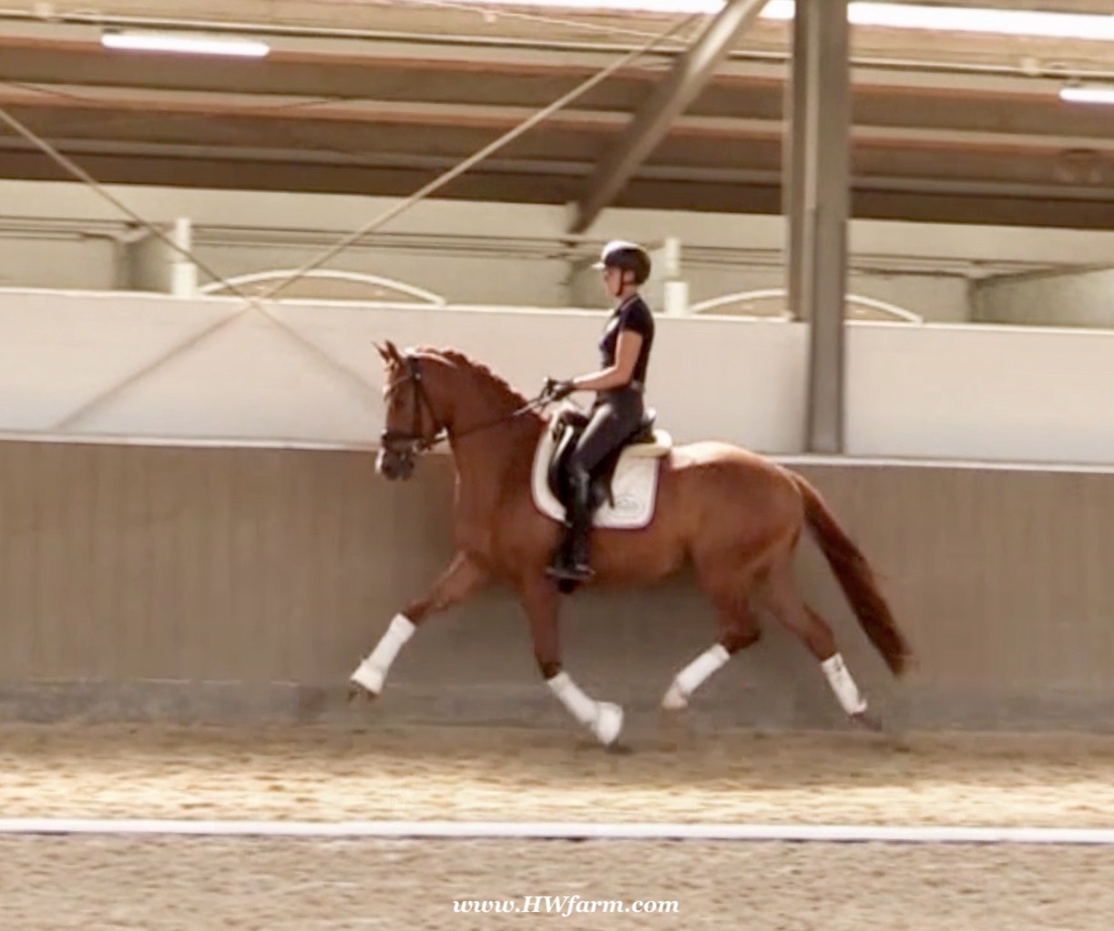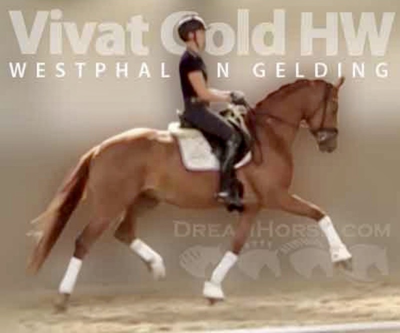 Vivat Gold HW, chestnut Westphalian gelding by Vivat Rex/Riccio, born in 2020, standing approximately 165 cm or 16.1 hands. Like father, like son, Vivat Gold HW seems to be a near clone to his famous sire Vivat Rex. Vivat Rex is definitely a king, uniquely modeled, he dances into the hearts of the observers. Top quality with great potential. His quality of movement is inspiring and admirable. Father Vivaldi was reserve champion at the performance test in the Netherlands and won the Pavo Cup for five-year-olds in 2007. He was ridden by Hans Peter Minderhoud/NED to victory in the KNHS/KWPN stallion series in 2008 and 2009, receiving a 10.0 for his trot. The sire Krack C is considered a foundation stallion in the Netherlands. The two-time Pavo Cup winner from 1996 and 1997 took eighth place in the individual classification at the 2002 World Equestrian Games in Jerez/ESP under Anky van Grunsven/NED. Vivaldi comes from the Utopia line, the most successful Dutch mare family. Elite mare Symphonie, mother of Vivat Rex, descends from Samarant, one of Sandro Hit x Brentano II, was Hanoverian Vice State Champion and finalist at the Bundeschampionat riding horses. In 2006 he qualified for the Bundeschampionat for 5-year-old dressage horses. In 2008 he was sold to Denmark and presented internationally by Andreas Helgstrand-DEN, among others. Granddam Sandy, also an elite mare, descends from the great Rubinstein. Rubinstein is a son of the Westphalian Romadour II son Rosenkavalier, who himself was a stallion performance test winner and is now one of the most important Westphalian sires. He was bred from what is probably the most important dressage dynasty in the world. The mother Antine is full sister of the international top dressage horses Ahlerich 2/Dr. Reiner Klimke and Amon/Annemarie Sanders-Keyzer (NL Her full sister Adone gave the multi-Olymionist Rembrandt 24/Nicole Uphoff. Rubinstein can now look back on a tailor-made career. Winner in the "Optimum" of material horses in Münster 1990, I a- Winner of the main premium in Oldenburg, Vice Bundeschampion of the German dressage horse in Verden in 1992, multiple Oldenburg dressage champion, serial winner in dressage classes at S level and multiple Grand Prix winners. In the meantime, Rubinstein I and Nicole Uphoff can look back to international victories in the dressage arena. Vivat Rex comes from the dam line of Große Liebe: Grand Prix successful horses Pikko del Cerro with Lisa Wilcox and licensing champion Boreas by Bordeaux is with Christina Vinios USA. Vivat Gold HW's dam is by the impressive stallion RICCIO, whom was the premium stallion at the NRW main licensing in Münster-Handorf in 2003. He completed his 30-day assessment test with grades well above the average. Scores of 9.0 and better were given for temperament, willingness to perform and constitution. The sporting career of RICCIO, who has meanwhile been successful in difficult dressage tests, went extremely well. In 2004, the RICCIONE son was Vice Bundeschampion of three-year-old riding horse stallions. In 2006 he represented the German colors in the final of the World Championships for five-year-old dressage horses in Verden. He qualified twice for the Bundeschampionat for five- and six-year-old dressage horses. Due to its successes, RICCIO carries the suffix "NRW" in tournament sports. He produced 19 state premium mares and five licensed sons. Among other things, RICOHELLO, licensed in 2011, descends from him. He presented numerous award-winning foals. His offspring also enrich auction and show venues and the field of participants in the German Foal Championships. His daughters shine with top results in mare tests. In 2011 a daughter was among the top ten at the German Mare Championships. In 2008 a daughter marched in the final ring of the elite show in the Rhineland. One of his sons was licensed for Oldenburg in 2008. In 2007 a RICCIO daughter was the first reserve champion in Bern, and another daughter won the Eastern Switzerland Foal Championships. 355 offspring are registered as tournament horses and are highly successful up to advanced level, in which two of them have already been victorious. RICCIO's breeding value for dressage is 129, according to the FN he is one of the top 5% dressage sires in Germany. RICCIO's father is RICCIONE, who himself was highly successful in sport up to advanced level. He is also the father of numerous successful dressage horses, as well as the father of the premium stallion RICCINOS, who also works at the state stud, 22 other licensed sons and 32 state premium mares. Mother is the state premium mare Fidelia As. In addition to RICCIO, she produced ten other successful sport horses with total lifetime winnings of more than 4,800 euros. Among them the mare Grande Coeur As by GRANDILOT, who was successful up to medium level in the course. She herself can refer to a highly successful offspring that has earned more than 8,000 euros in sport. Among other things, her daughter L`Amour As is victorious up to advanced level show jumping. Another daughter who is successful up to medium level jumping is Damira As, who also has Samara As, who placed highly in advanced level dressage, as a daughter. Fidelia As can be traced back to the legendary Warendorfer FLORESTAN I. 92 licensed sons, 237 state premium mares, 2,136 offspring registered in the sport, of which 191 reached the advanced level in the arena with lifetime winnings of more than 2.1 million euros and a dressage breeding value of 140 are just a few of the important cornerstones of this exceptional stallion, the was third in the WBFSH ranking of the best dressage horse sires in the world in 2014. Granddam Desi AS was successful in medium level jumpers herself. She can be traced back to the versatile sire Democraat. Numerous other horses that are successful in sport emerge from the dam line. Vivat Gold HW is of true International quality, his super ride ability and talent, combined with his excellent tr