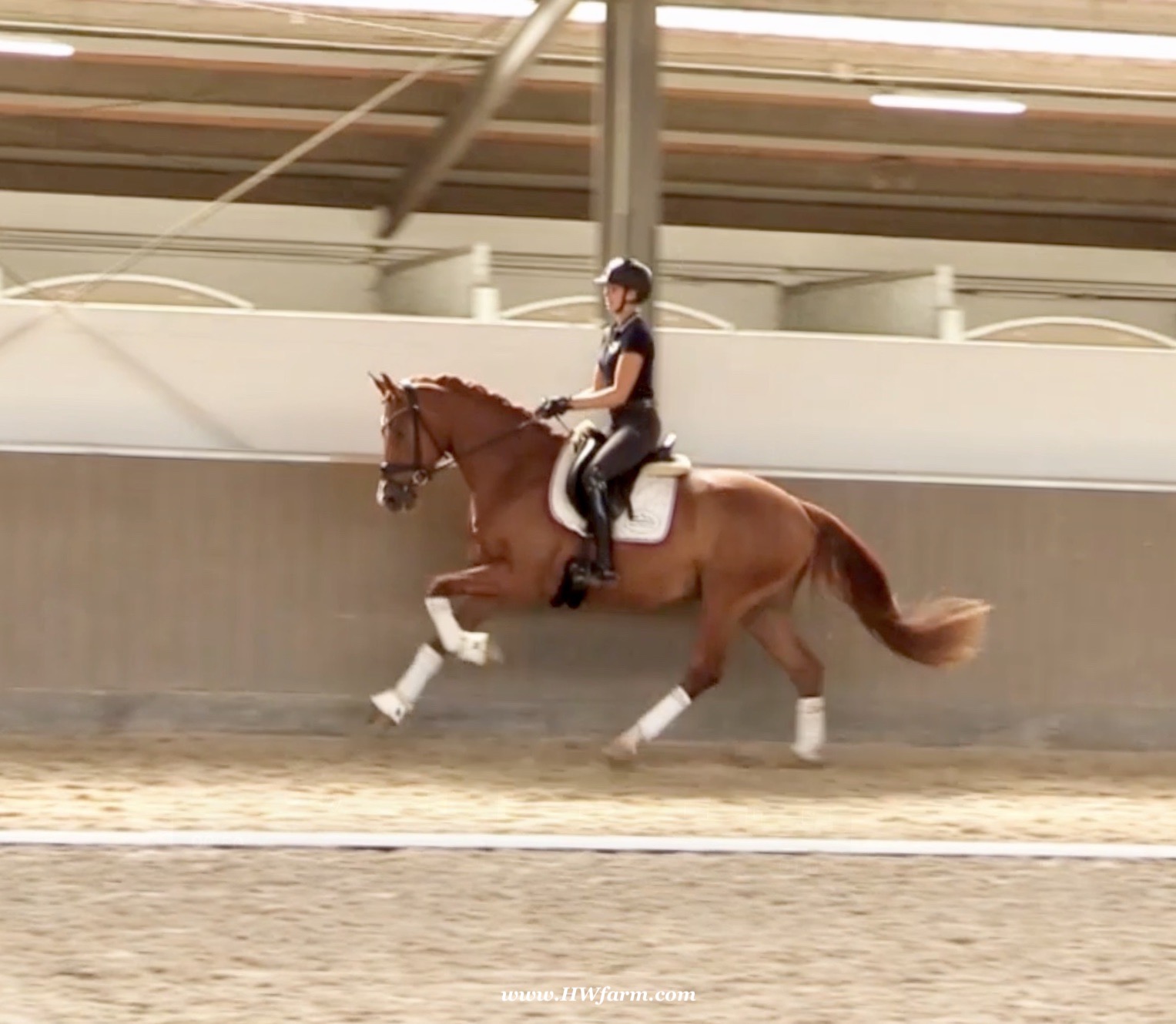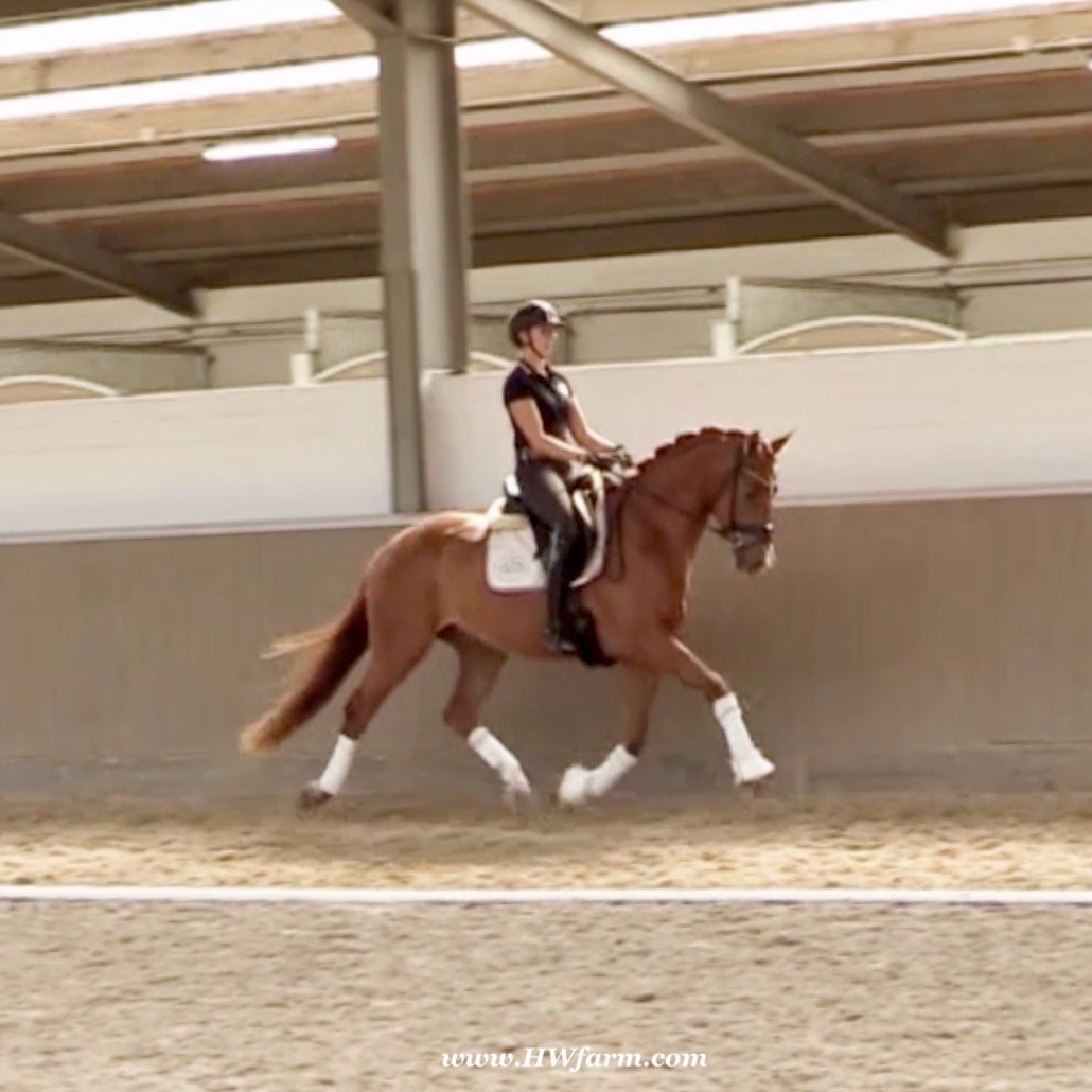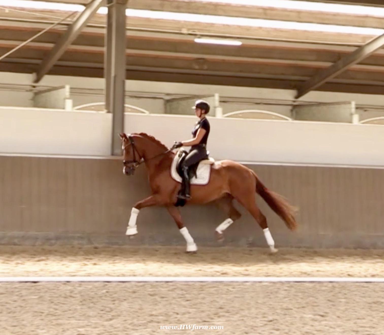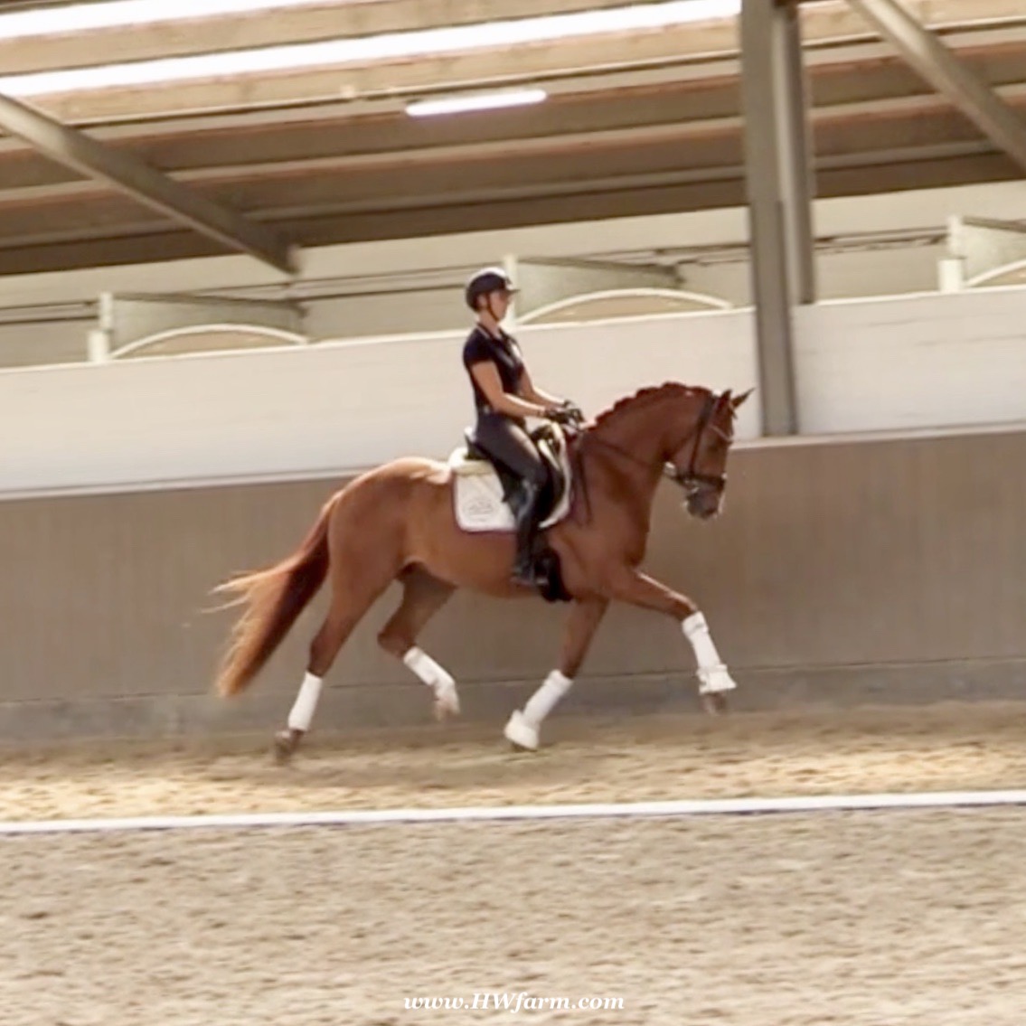 Vivat Gold HW, chestnut Westphalian gelding by Vivat Rex/Riccio, born in 2020, standing approximately 165 cm or 16.1 hands. Like father, like son, Vivat Gold HW seems to be a near clone to his famous sire Vivat Rex. Vivat Rex is definitely a king, uniquely modeled, he dances into the hearts of the observers. Top quality with great potential. His quality of movement is inspiring and admirable. Father Vivaldi was reserve champion at the performance test in the Netherlands and won the Pavo Cup for five-year-olds in 2007. He was ridden by Hans Peter Minderhoud/NED to victory in the KNHS/KWPN stallion series in 2008 and 2009, receiving a 10.0 for his trot. The sire Krack C is considered a foundation stallion in the Netherlands. The two-time Pavo Cup winner from 1996 and 1997 took eighth place in the individual classification at the 2002 World Equestrian Games in Jerez/ESP under Anky van Grunsven/NED. Vivaldi comes from the Utopia line, the most successful Dutch mare family. Elite mare Symphonie, mother of Vivat Rex, descends from Samarant, one of Sandro Hit x Brentano II, was Hanoverian Vice State Champion and finalist at the Bundeschampionat riding horses. In 2006 he qualified for the Bundeschampionat for 5-year-old dressage horses. In 2008 he was sold to Denmark and presented internationally by Andreas Helgstrand-DEN, among others. Granddam Sandy, also an elite mare, descends from the great Rubinstein. Rubinstein is a son of the Westphalian Romadour II son Rosenkavalier, who himself was a stallion performance test winner and is now one of the most important Westphalian sires. He was bred from what is probably the most important dressage dynasty in the world. The mother Antine is full sister of the international top dressage horses Ahlerich 2/Dr. Reiner Klimke and Amon/Annemarie Sanders-Keyzer (NL Her full sister Adone gave the multi-Olymionist Rembrandt 24/Nicole Uphoff. Rubinstein can now look back on a tailor-made career. Winner in the "Optimum" of material horses in Münster 1990, I a- Winner of the main premium in Oldenburg, Vice Bundeschampion of the German dressage horse in Verden in 1992, multiple Oldenburg dressage champion, serial winner in dressage classes at S level and multiple Grand Prix winners. In the meantime, Rubinstein I and Nicole Uphoff can look back to international victories in the dressage arena. Vivat Rex comes from the dam line of Große Liebe: Grand Prix successful horses Pikko del Cerro with Lisa Wilcox and licensing champion Boreas by Bordeaux is with Christina Vinios USA. Vivat Gold HW's dam is by the impressive stallion RICCIO, whom was the premium stallion at the NRW main licensing in Münster-Handorf in 2003. He completed his 30-day assessment test with grades well above the average. Scores of 9.0 and better were given for temperament, willingness to perform and constitution. The sporting career of RICCIO, who has meanwhile been successful in difficult dressage tests, went extremely well. In 2004, the RICCIONE son was Vice Bundeschampion of three-year-old riding horse stallions. In 2006 he represented the German colors in the final of the World Championships for five-year-old dressage horses in Verden. He qualified twice for the Bundeschampionat for five- and six-year-old dressage horses. Due to its successes, RICCIO carries the suffix "NRW" in tournament sports. He produced 19 state premium mares and five licensed sons. Among other things, RICOHELLO, licensed in 2011, descends from him. He presented numerous award-winning foals. His offspring also enrich auction and show venues and the field of participants in the German Foal Championships. His daughters shine with top results in mare tests. In 2011 a daughter was among the top ten at the German Mare Championships. In 2008 a daughter marched in the final ring of the elite show in the Rhineland. One of his sons was licensed for Oldenburg in 2008. In 2007 a RICCIO daughter was the first reserve champion in Bern, and another daughter won the Eastern Switzerland Foal Championships. 355 offspring are registered as tournament horses and are highly successful up to advanced level, in which two of them have already been victorious. RICCIO's breeding value for dressage is 129, according to the FN he is one of the top 5% dressage sires in Germany. RICCIO's father is RICCIONE, who himself was highly successful in sport up to advanced level. He is also the father of numerous successful dressage horses, as well as the father of the premium stallion RICCINOS, who also works at the state stud, 22 other licensed sons and 32 state premium mares. Mother is the state premium mare Fidelia As. In addition to RICCIO, she produced ten other successful sport horses with total lifetime winnings of more than 4,800 euros. Among them the mare Grande Coeur As by GRANDILOT, who was successful up to medium level in the course. She herself can refer to a highly successful offspring that has earned more than 8,000 euros in sport. Among other things, her daughter L`Amour As is victorious up to advanced level show jumping. Another daughter who is successful up to medium level jumping is Damira As, who also has Samara As, who placed highly in advanced level dressage, as a daughter. Fidelia As can be traced back to the legendary Warendorfer FLORESTAN I. 92 licensed sons, 237 state premium mares, 2,136 offspring registered in the sport, of which 191 reached the advanced level in the arena with lifetime winnings of more than 2.1 million euros and a dressage breeding value of 140 are just a few of the important cornerstones of this exceptional stallion, the was third in the WBFSH ranking of the best dressage horse sires in the world in 2014. Granddam Desi AS was successful in medium level jumpers herself. She can be traced back to the versatile sire Democraat. Numerous other horses that are successful in sport emerge from the dam line. Vivat Gold HW is of true International quality, his super ride ability and talent, combined with his excellent tr